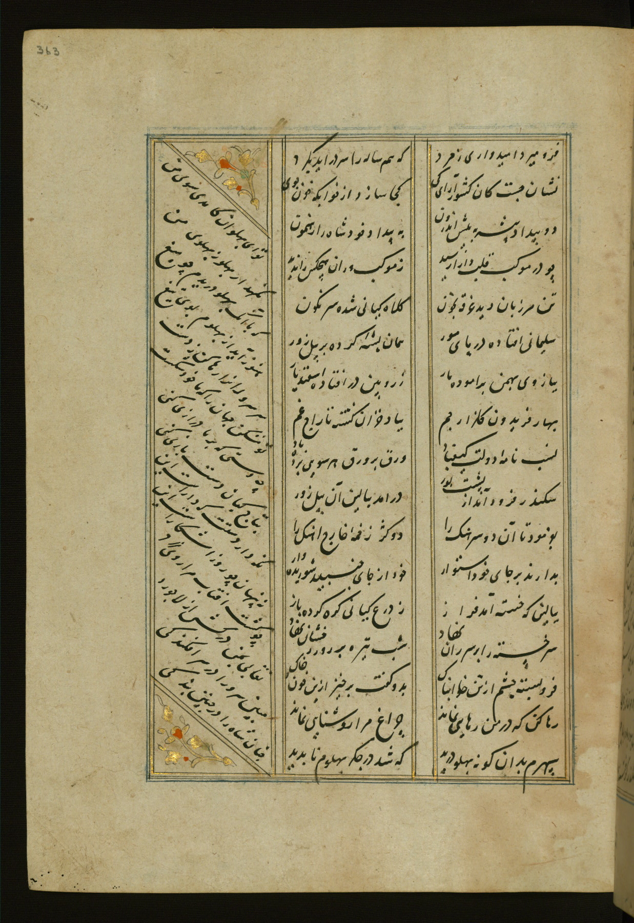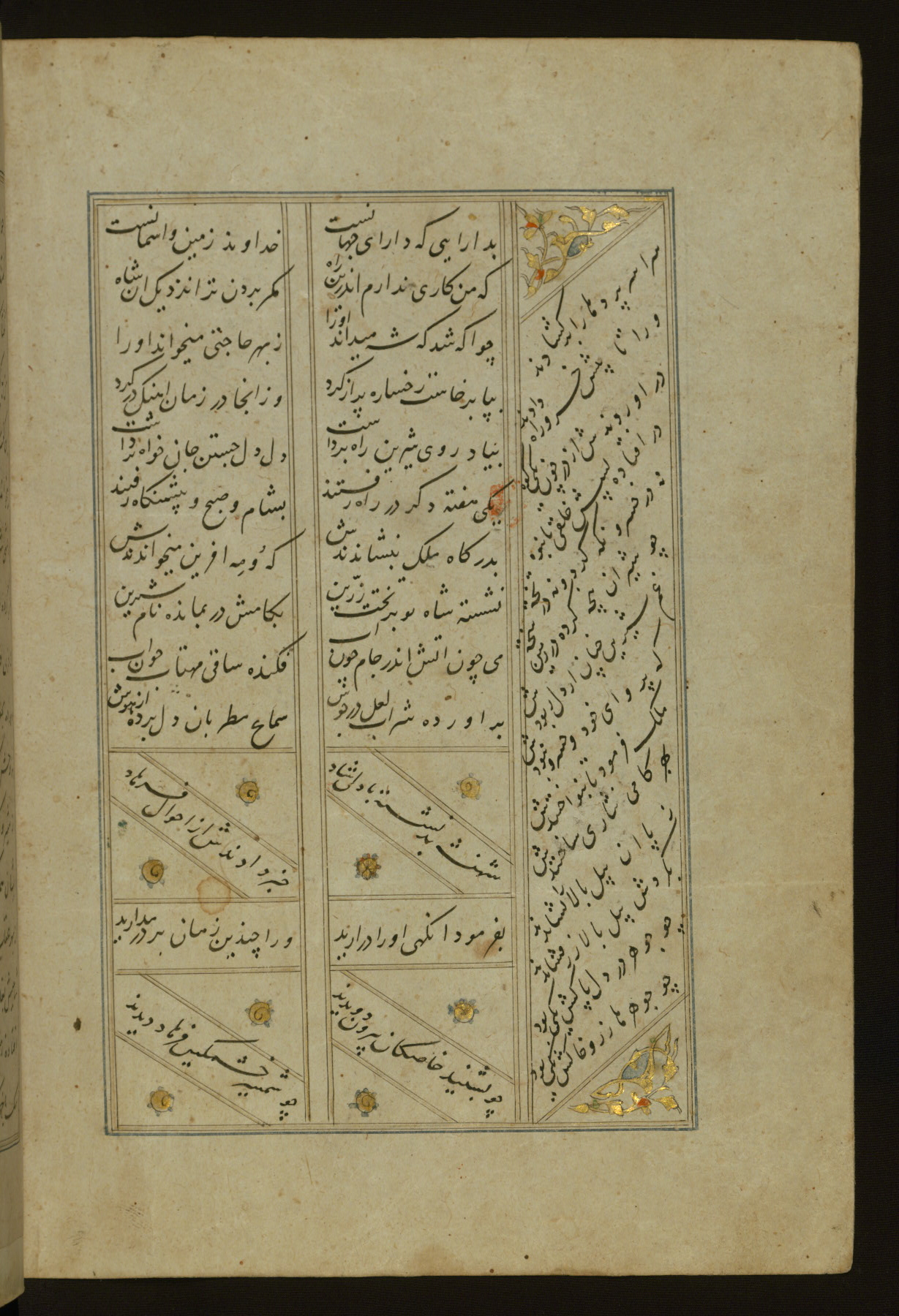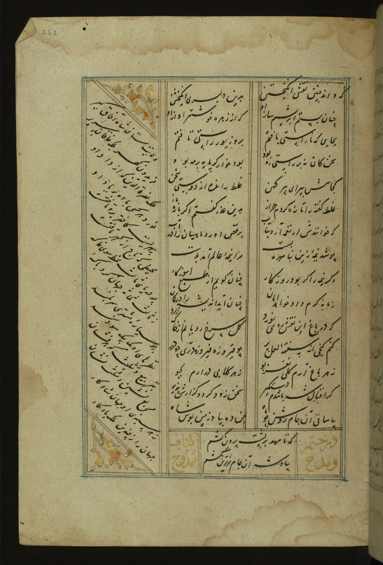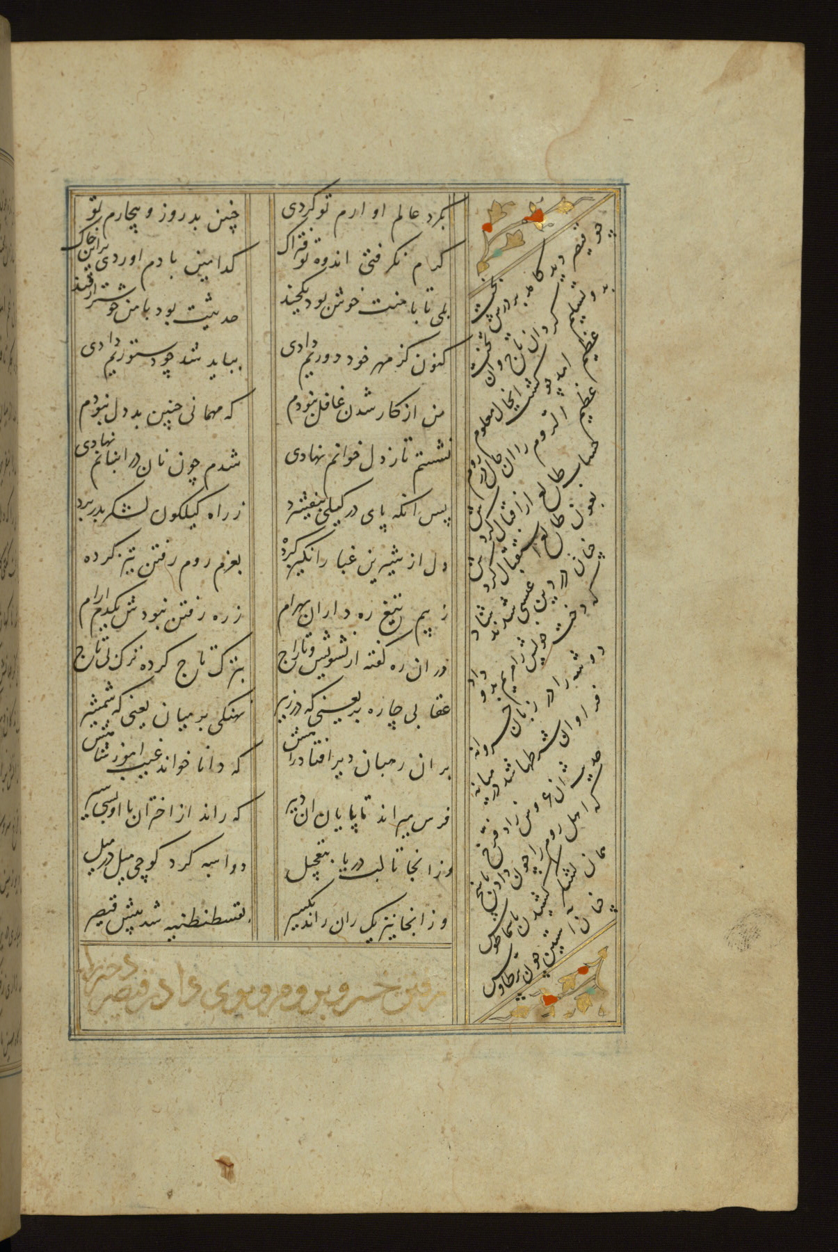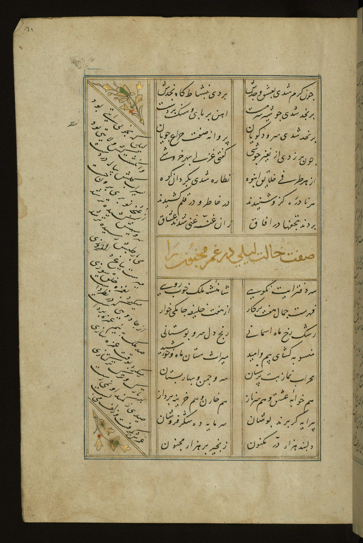 This copy of the Khamsah (quintet) of Niẓāmī Ganjavī (d. 605 AH / 1209 CE) was written by Abū Bakr Shāh ibn Ḥasan ibn ʿAlī al-Shahrastānī and illuminated by Jamāl al-Dīn ibn Muḥammad al-Ṣiddīqī al-Iṣfahānī between 892 AH / 1486 CE and 900 AH / 1494-5 CE. The manuscript opens with a double-page illuminated frontispiece with an inscription giving the title of the work and the name of the author (fols. 1b-2a). There are four illuminated titlepieces with the names of the individual poems and twenty-six repainted illustrations. According to evidence supplied by the colophons, the original binding was by the hand of Jamāl al-Dīn ibn Muḥammad al-Ṣiddīqī al-Iṣfahānī, as well. Unfortunately, it has not survived. The binding presently attached to the manuscript dates to the twelfth century AH / eighteenth CE.