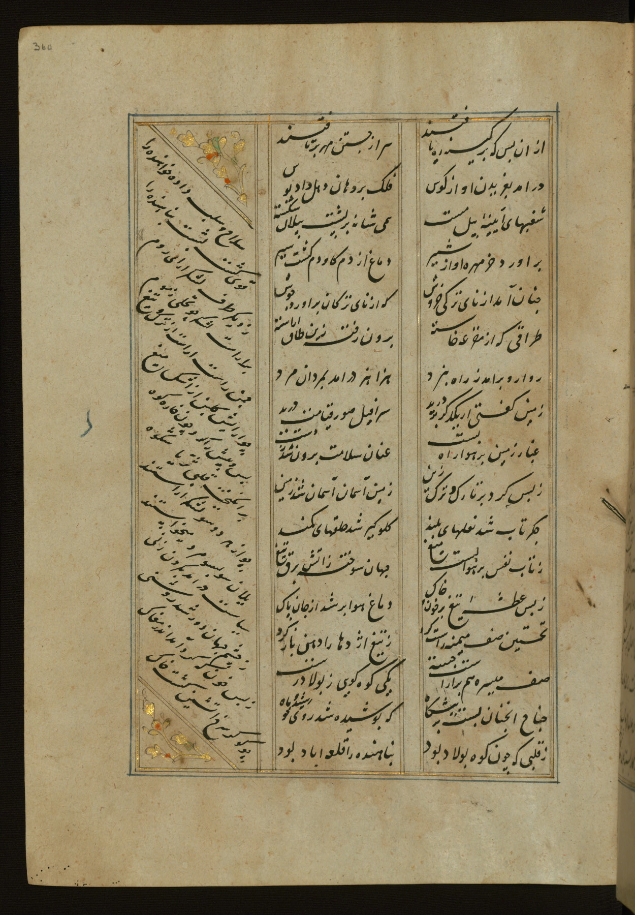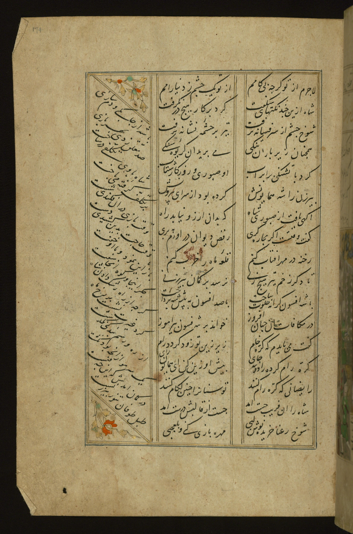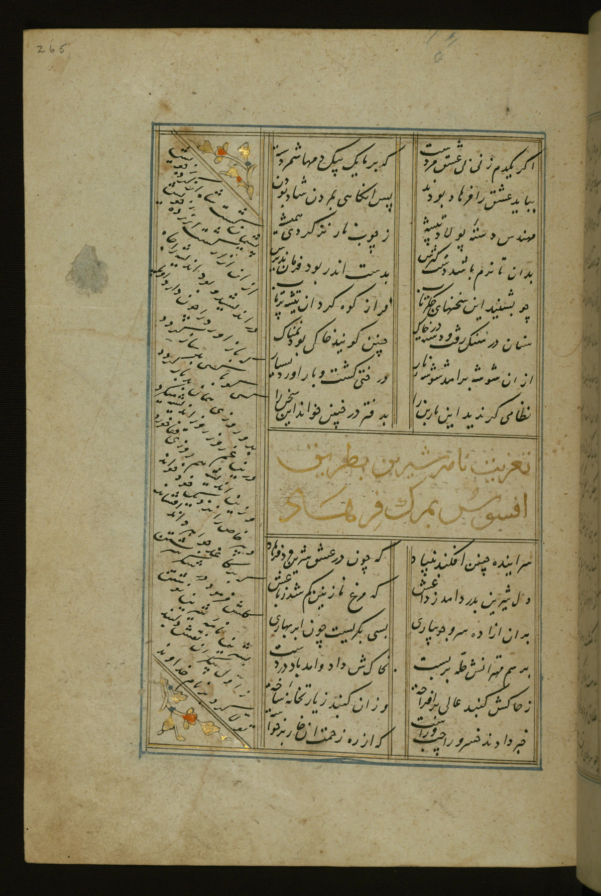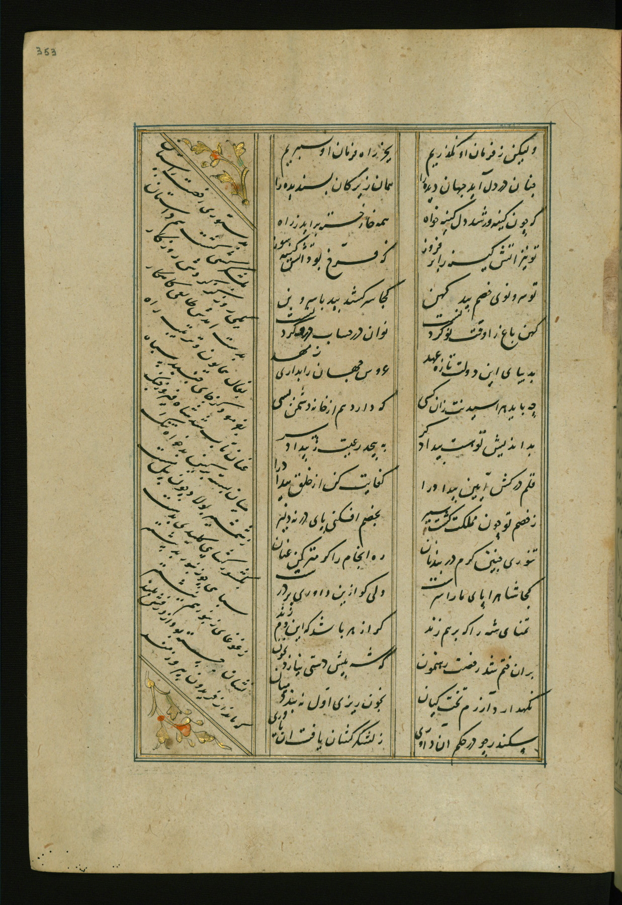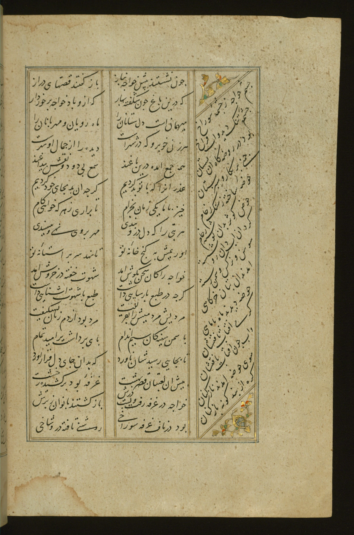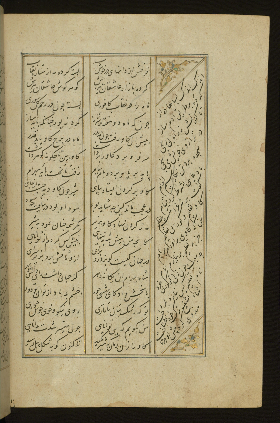 This copy of the Khamsah (quintet) of Niẓāmī Ganjavī (d. 605 AH / 1209 CE) was written by Abū Bakr Shāh ibn Ḥasan ibn ʿAlī al-Shahrastānī and illuminated by Jamāl al-Dīn ibn Muḥammad al-Ṣiddīqī al-Iṣfahānī between 892 AH / 1486 CE and 900 AH / 1494-5 CE. The manuscript opens with a double-page illuminated frontispiece with an inscription giving the title of the work and the name of the author (fols. 1b-2a). There are four illuminated titlepieces with the names of the individual poems and twenty-six repainted illustrations. According to evidence supplied by the colophons, the original binding was by the hand of Jamāl al-Dīn ibn Muḥammad al-Ṣiddīqī al-Iṣfahānī, as well. Unfortunately, it has not survived. The binding presently attached to the manuscript dates to the twelfth century AH / eighteenth CE.