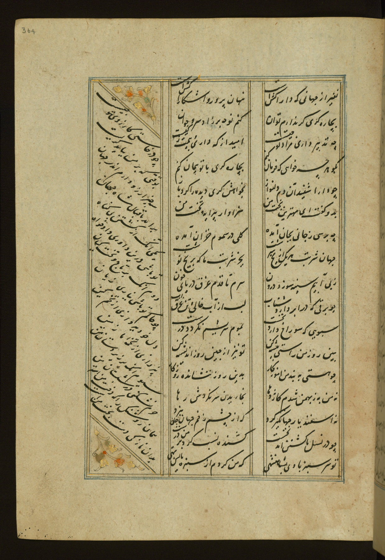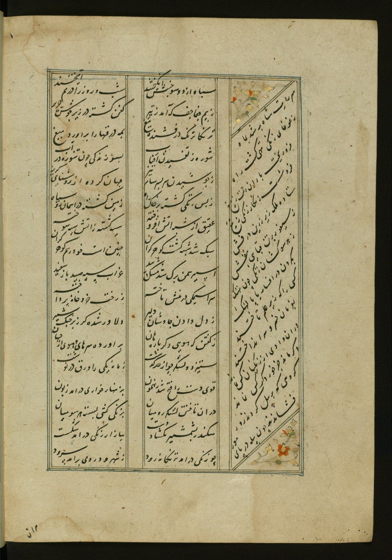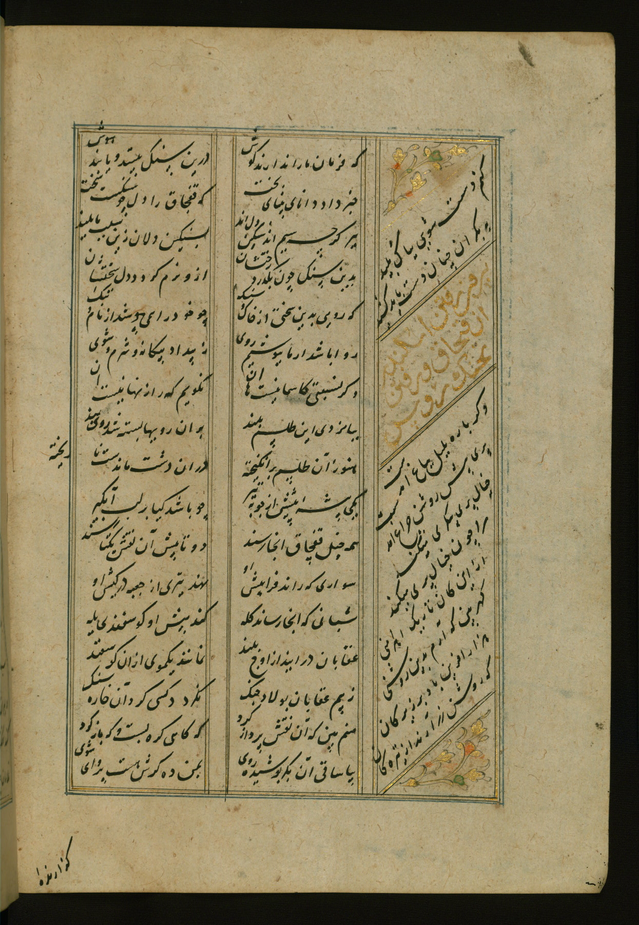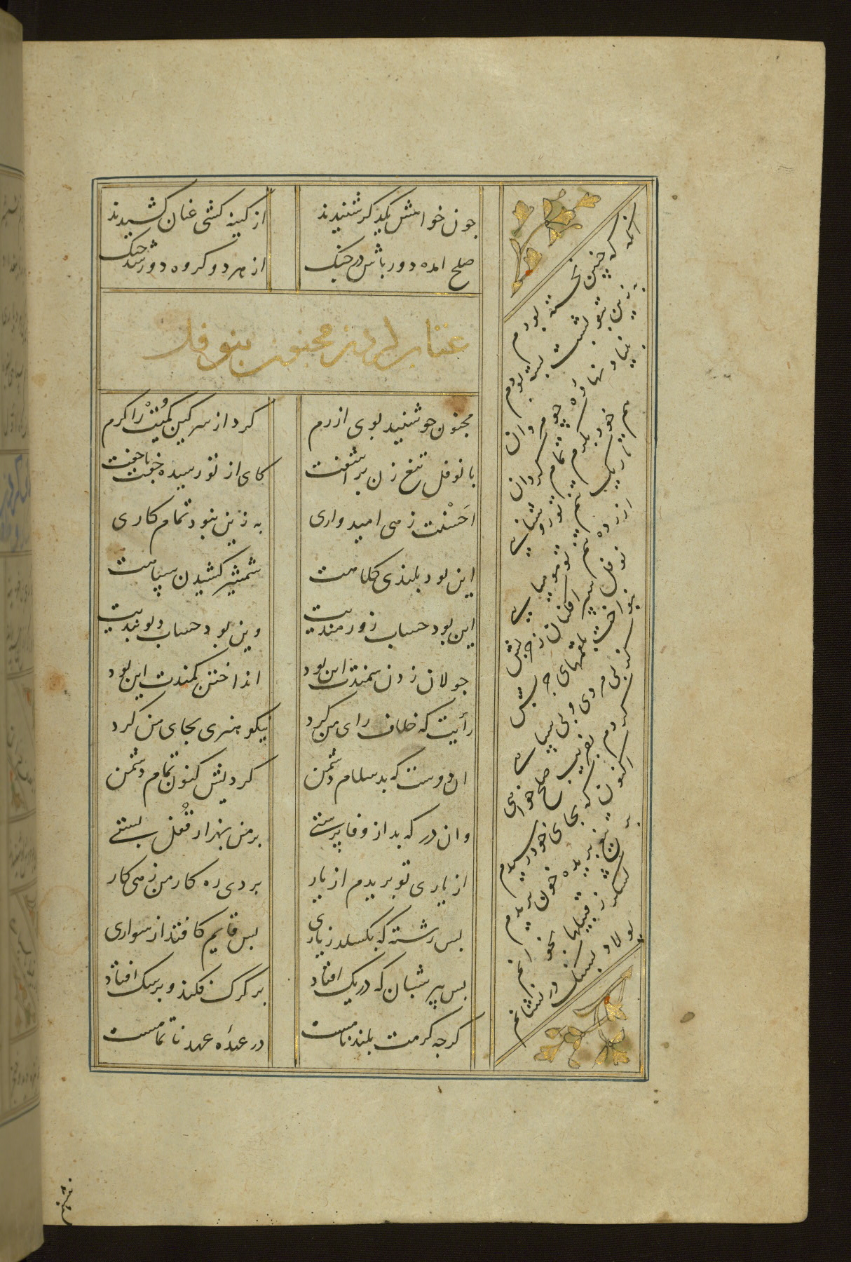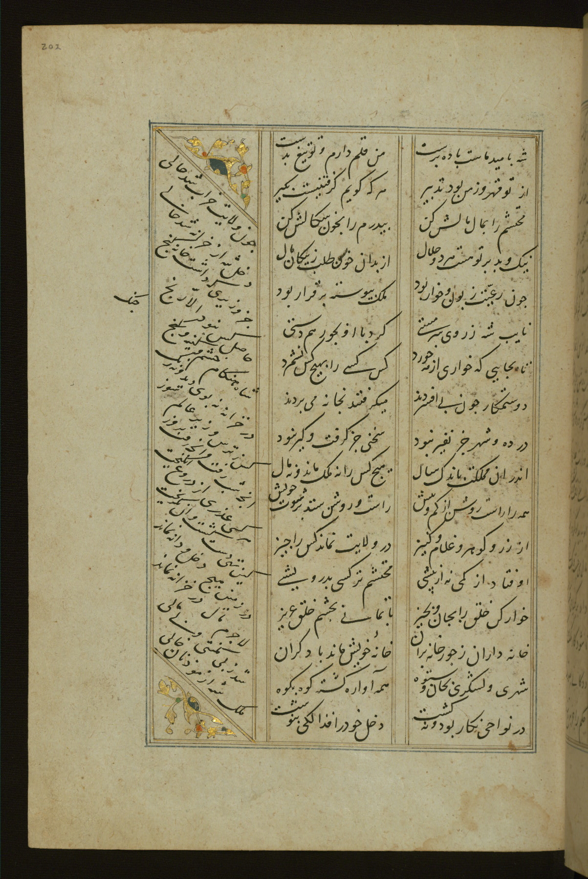This copy of the Khamsah (quintet) of Niẓāmī Ganjavī (d. 605 AH / 1209 CE) was written by Abū Bakr Shāh ibn Ḥasan ibn ʿAlī al-Shahrastānī and illuminated by Jamāl al-Dīn ibn Muḥammad al-Ṣiddīqī al-Iṣfahānī between 892 AH / 1486 CE and 900 AH / 1494-5 CE. The manuscript opens with a double-page illuminated frontispiece with an inscription giving the title of the work and the name of the author (fols. 1b-2a). There are four illuminated titlepieces with the names of the individual poems and twenty-six repainted illustrations. According to evidence supplied by the colophons, the original binding was by the hand of Jamāl al-Dīn ibn Muḥammad al-Ṣiddīqī al-Iṣfahānī, as well. Unfortunately, it has not survived. The binding presently attached to the manuscript dates to the twelfth century AH / eighteenth CE.