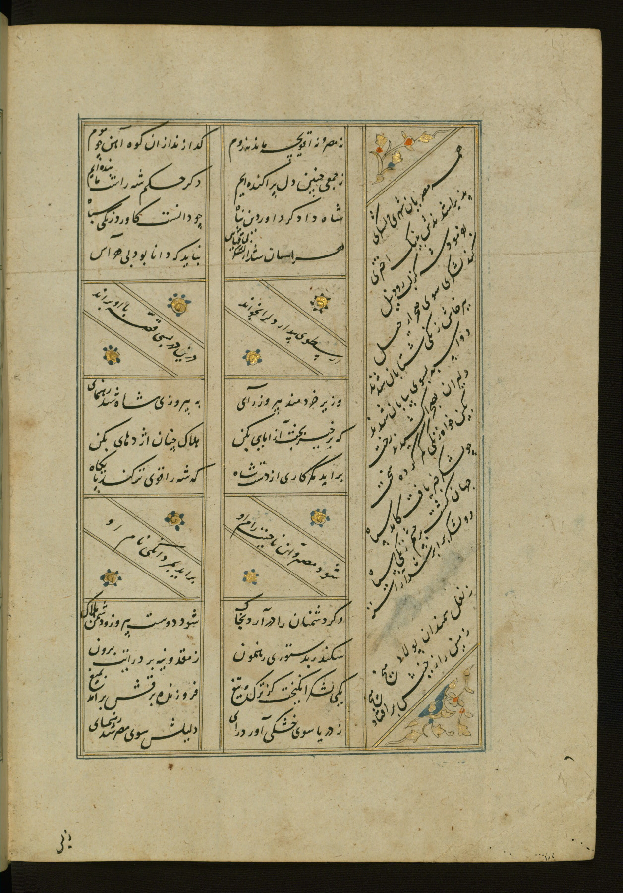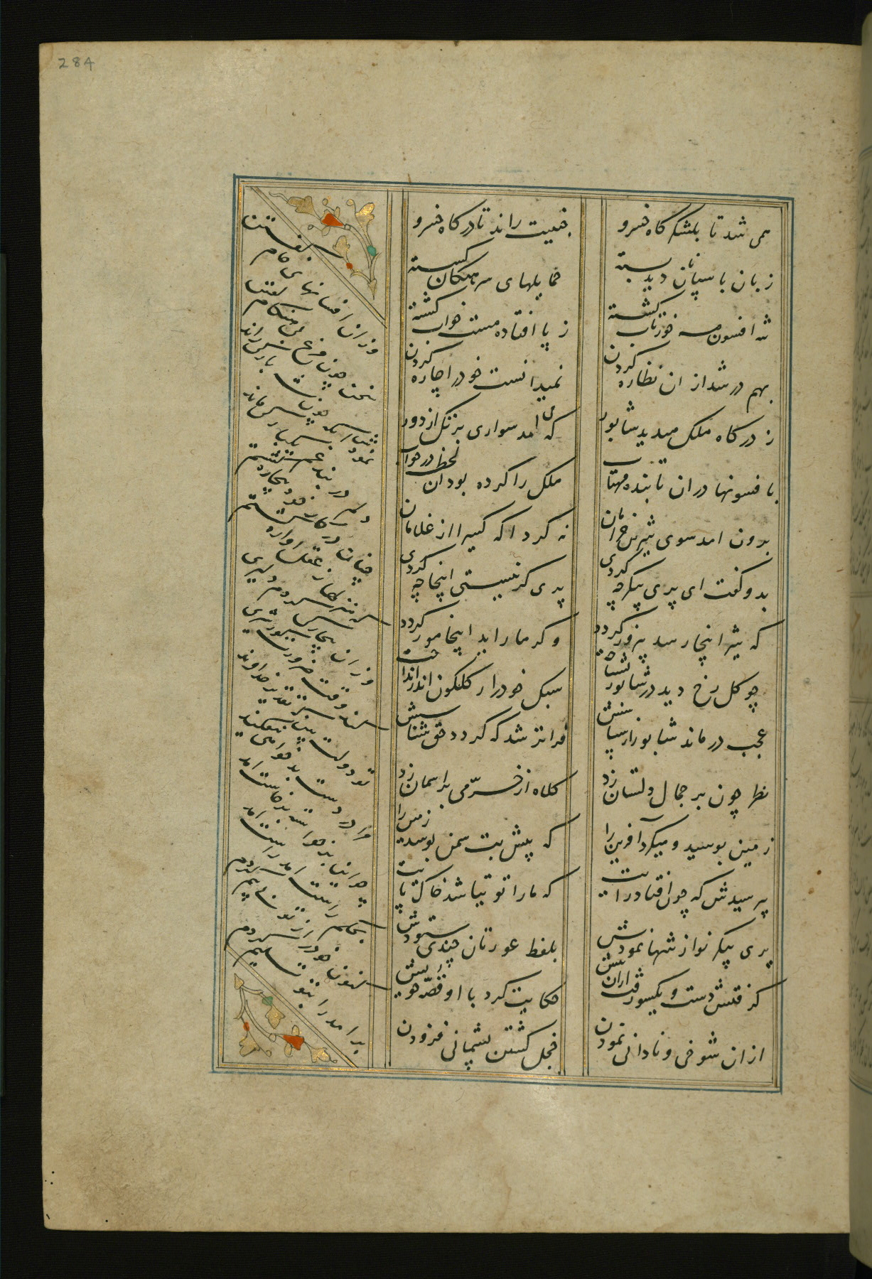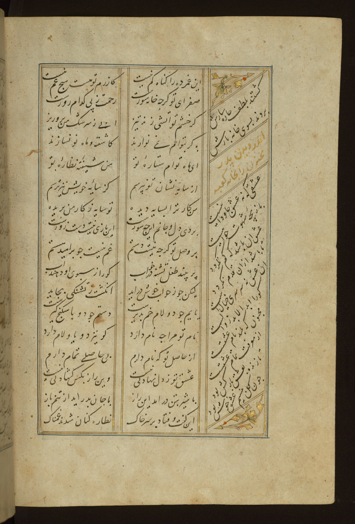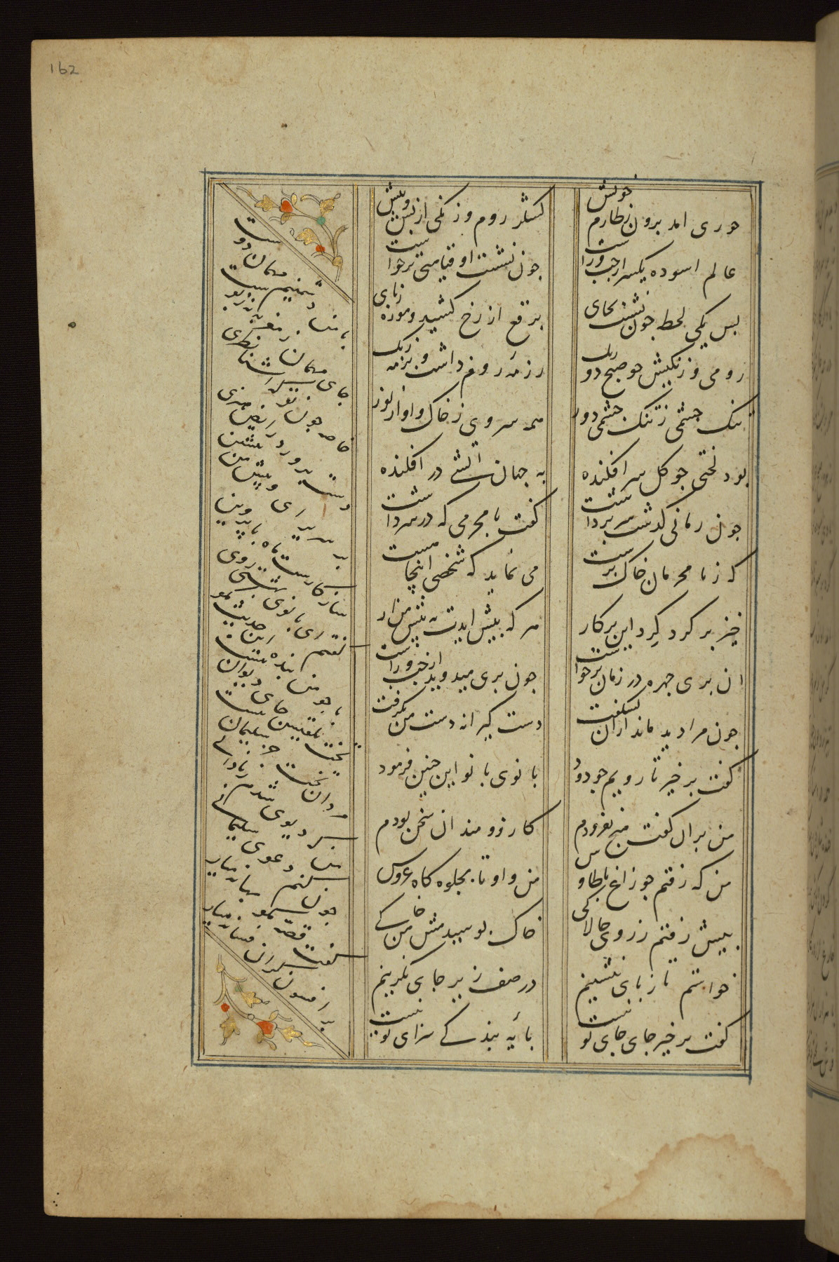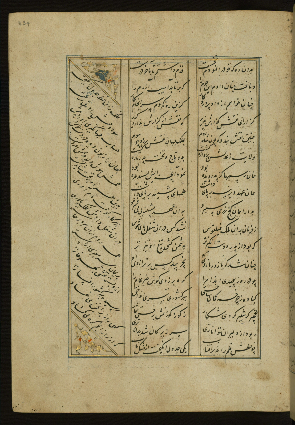 This copy of the Khamsah (quintet) of Niẓāmī Ganjavī (d. 605 AH / 1209 CE) was written by Abū Bakr Shāh ibn Ḥasan ibn ʿAlī al-Shahrastānī and illuminated by Jamāl al-Dīn ibn Muḥammad al-Ṣiddīqī al-Iṣfahānī between 892 AH / 1486 CE and 900 AH / 1494-5 CE. The manuscript opens with a double-page illuminated frontispiece with an inscription giving the title of the work and the name of the author (fols. 1b-2a). There are four illuminated titlepieces with the names of the individual poems and twenty-six repainted illustrations. According to evidence supplied by the colophons, the original binding was by the hand of Jamāl al-Dīn ibn Muḥammad al-Ṣiddīqī al-Iṣfahānī, as well. Unfortunately, it has not survived. The binding presently attached to the manuscript dates to the twelfth century AH / eighteenth CE.