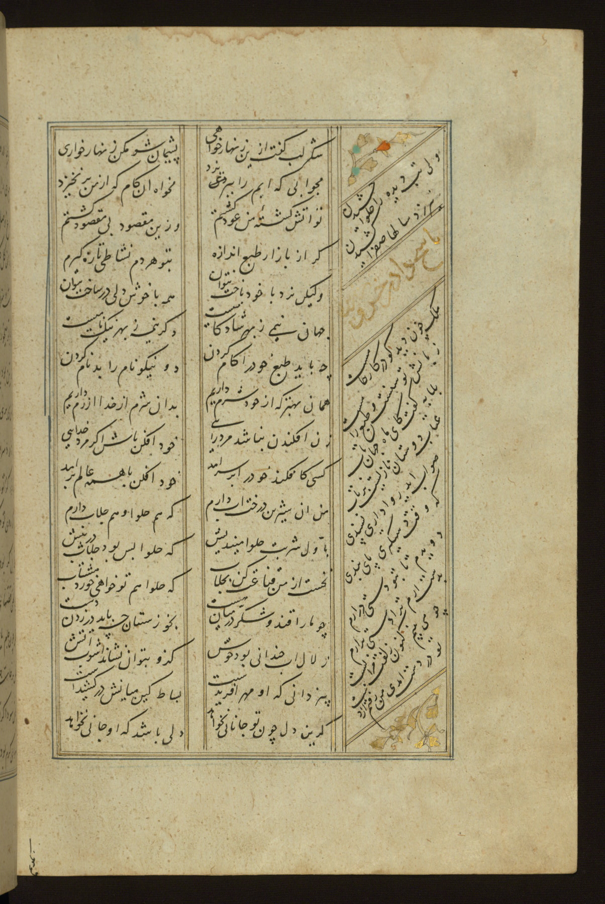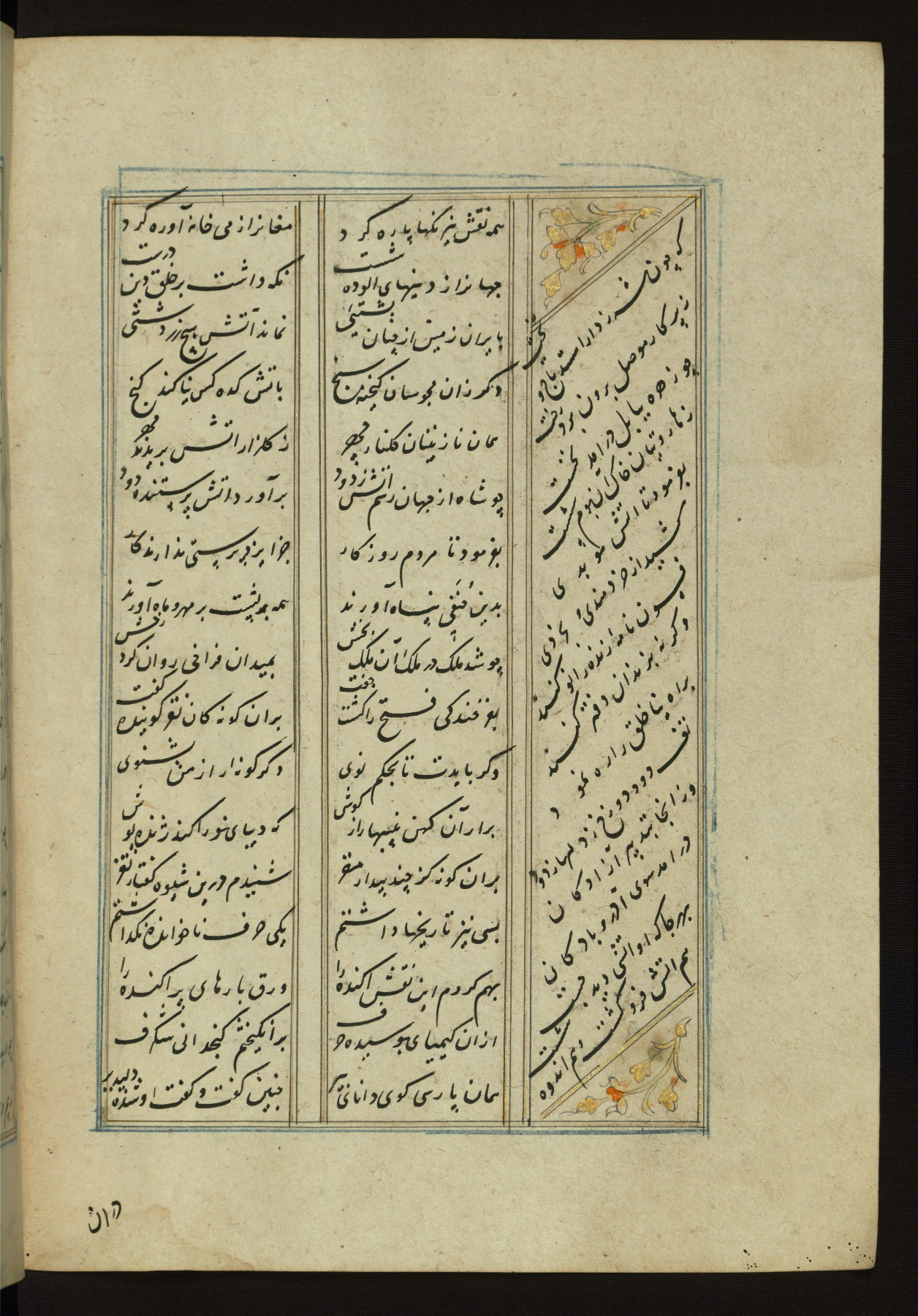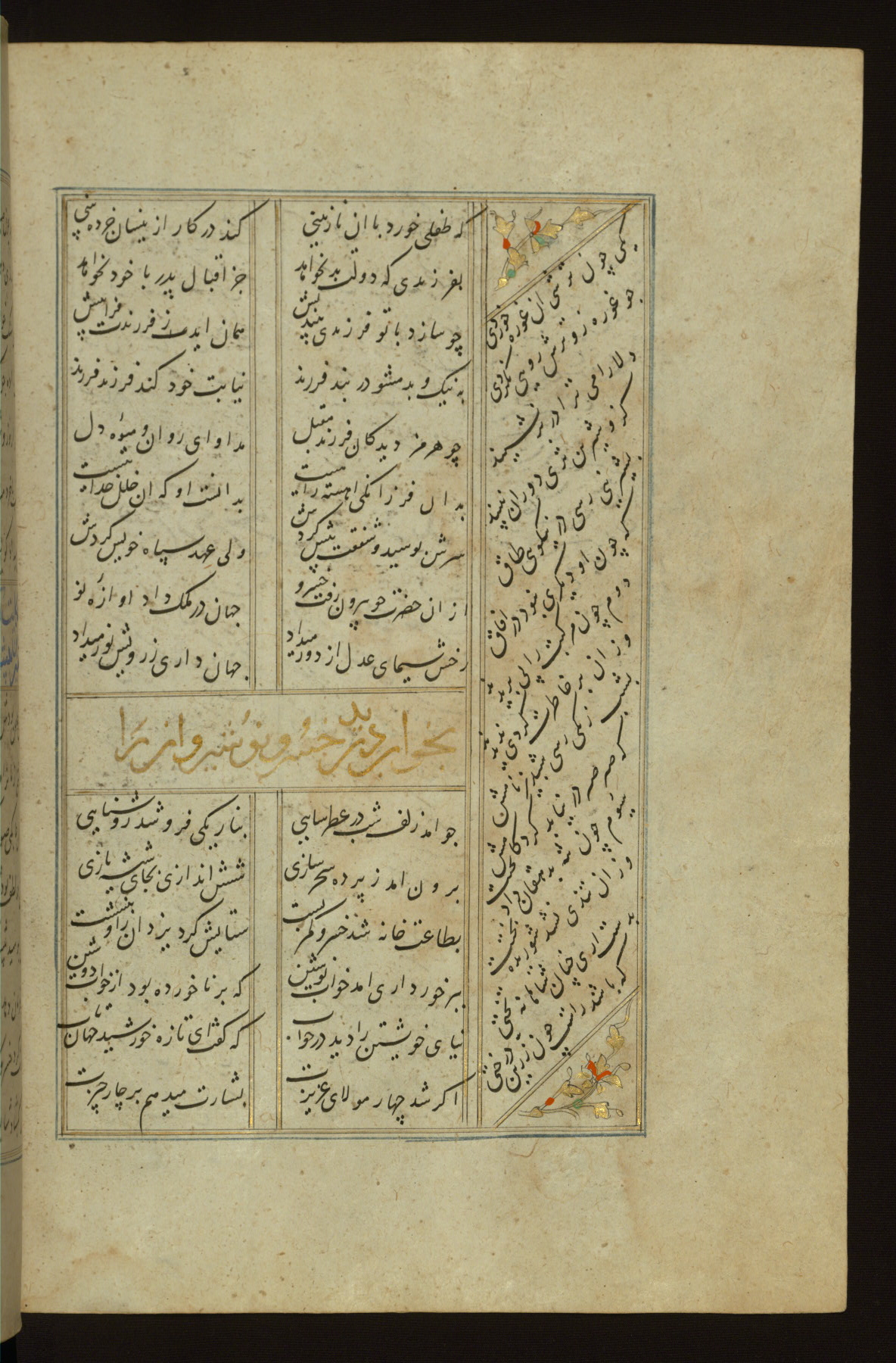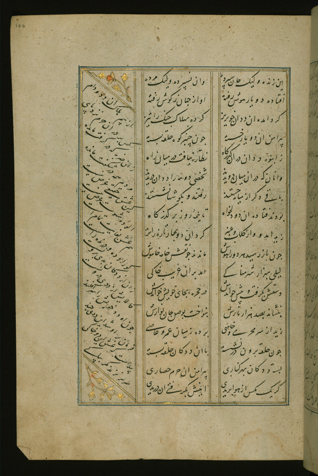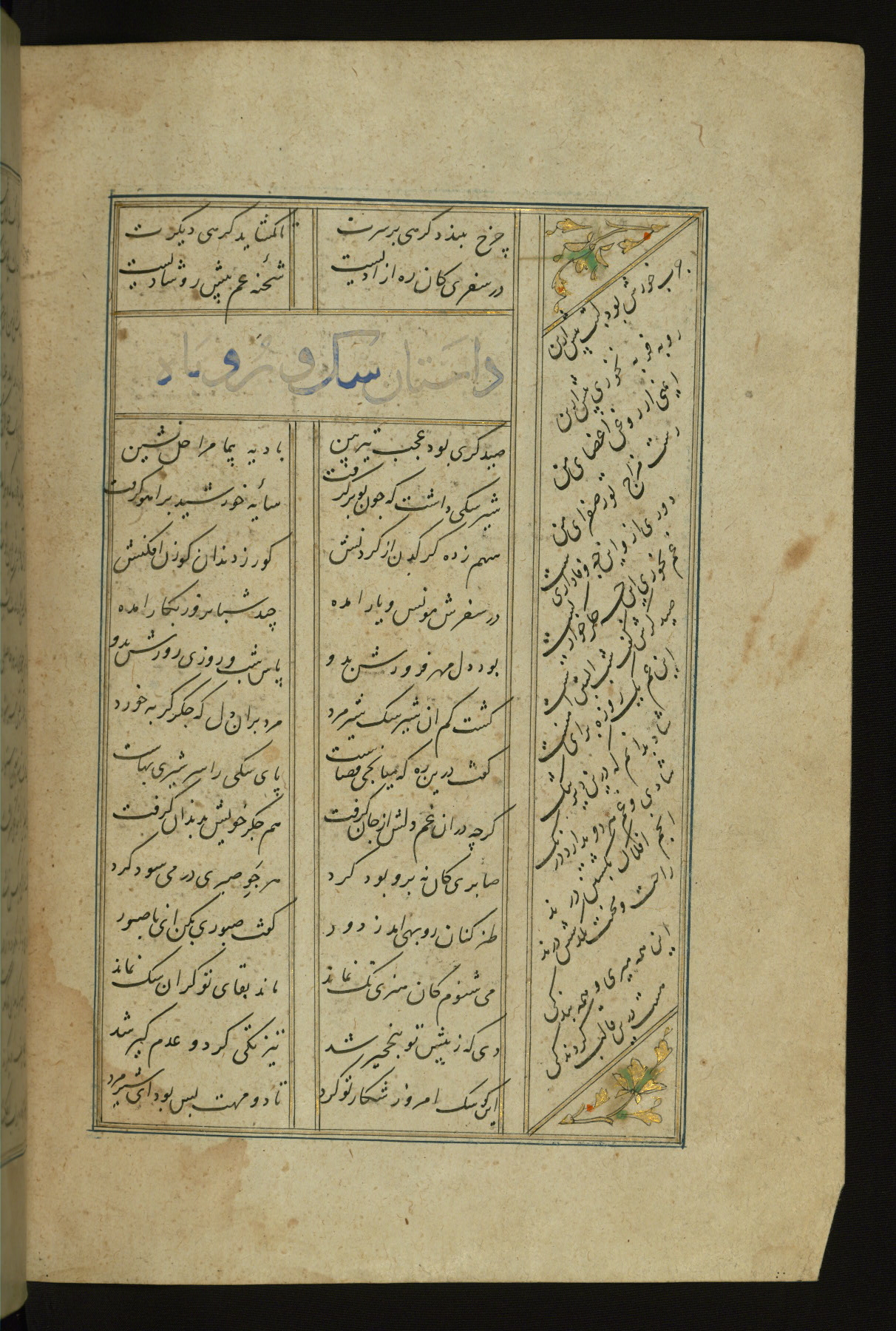 This copy of the Khamsah (quintet) of Niẓāmī Ganjavī (d. 605 AH / 1209 CE) was written by Abū Bakr Shāh ibn Ḥasan ibn ʿAlī al-Shahrastānī and illuminated by Jamāl al-Dīn ibn Muḥammad al-Ṣiddīqī al-Iṣfahānī between 892 AH / 1486 CE and 900 AH / 1494-5 CE. The manuscript opens with a double-page illuminated frontispiece with an inscription giving the title of the work and the name of the author (fols. 1b-2a). There are four illuminated titlepieces with the names of the individual poems and twenty-six repainted illustrations. According to evidence supplied by the colophons, the original binding was by the hand of Jamāl al-Dīn ibn Muḥammad al-Ṣiddīqī al-Iṣfahānī, as well. Unfortunately, it has not survived. The binding presently attached to the manuscript dates to the twelfth century AH / eighteenth CE.