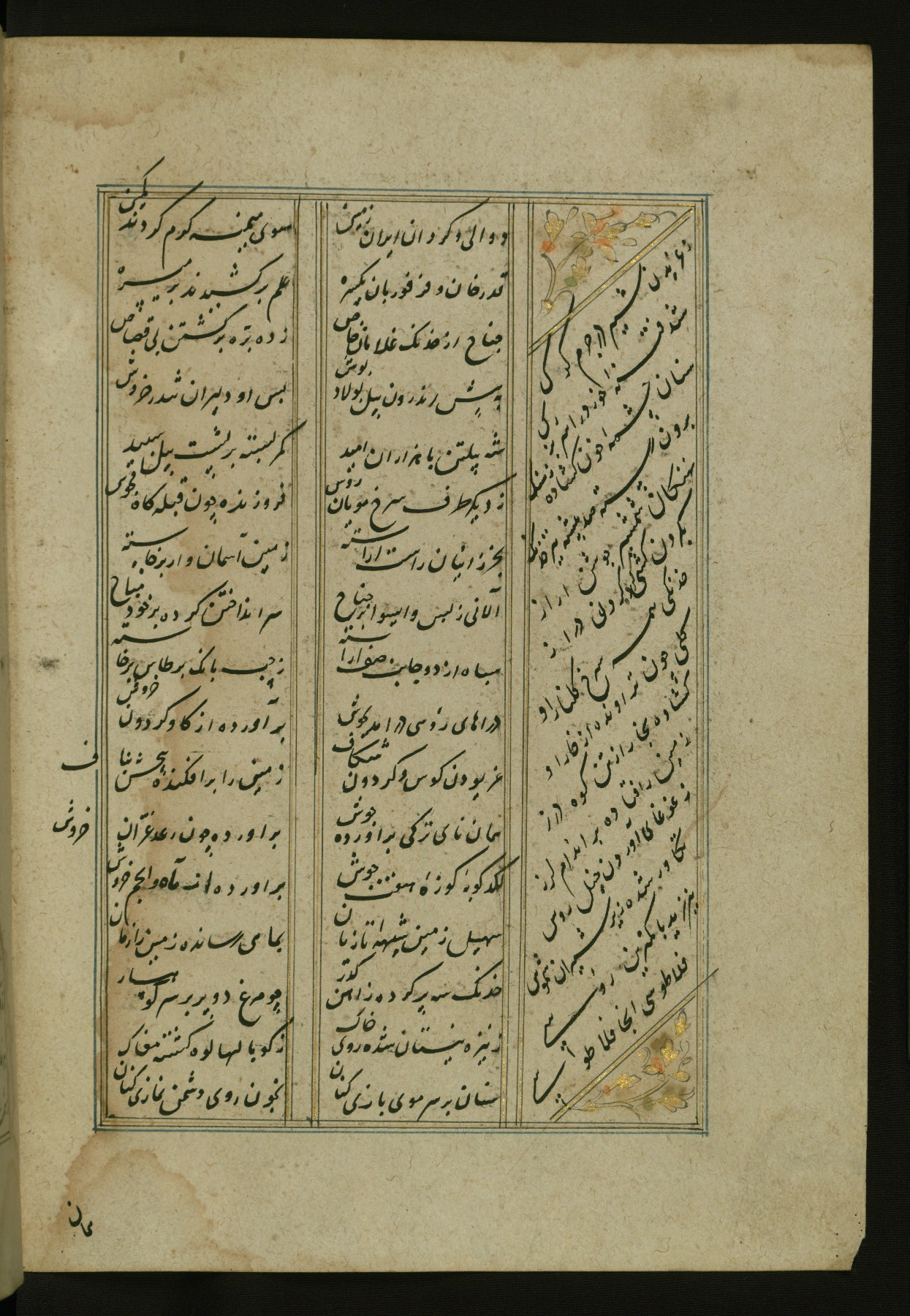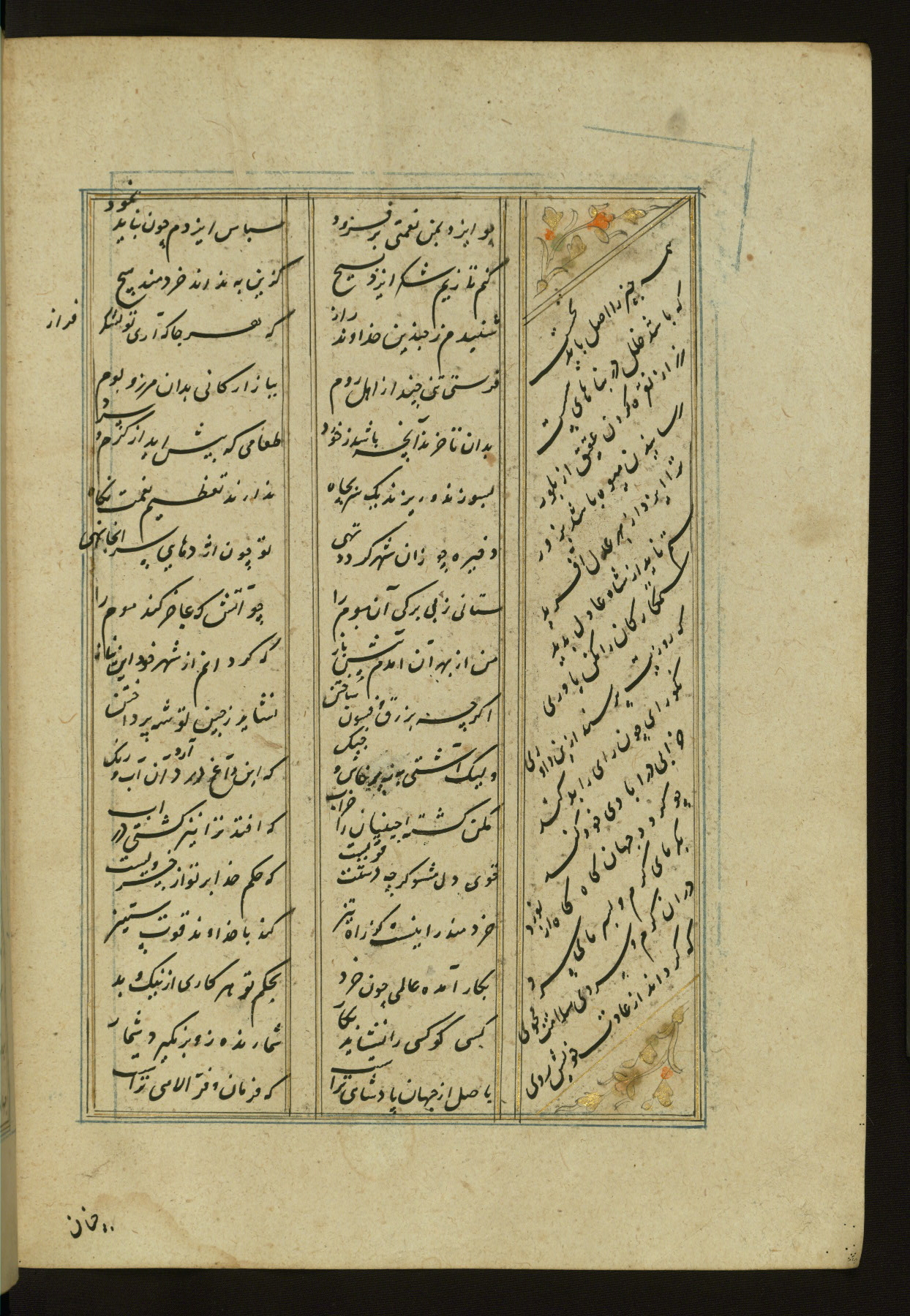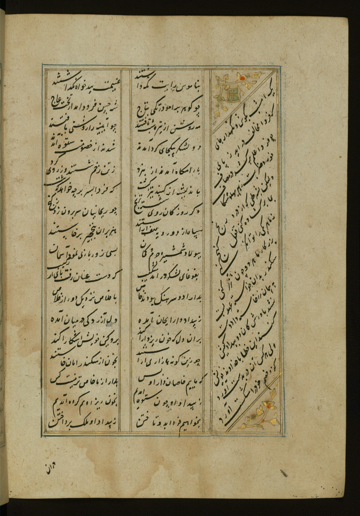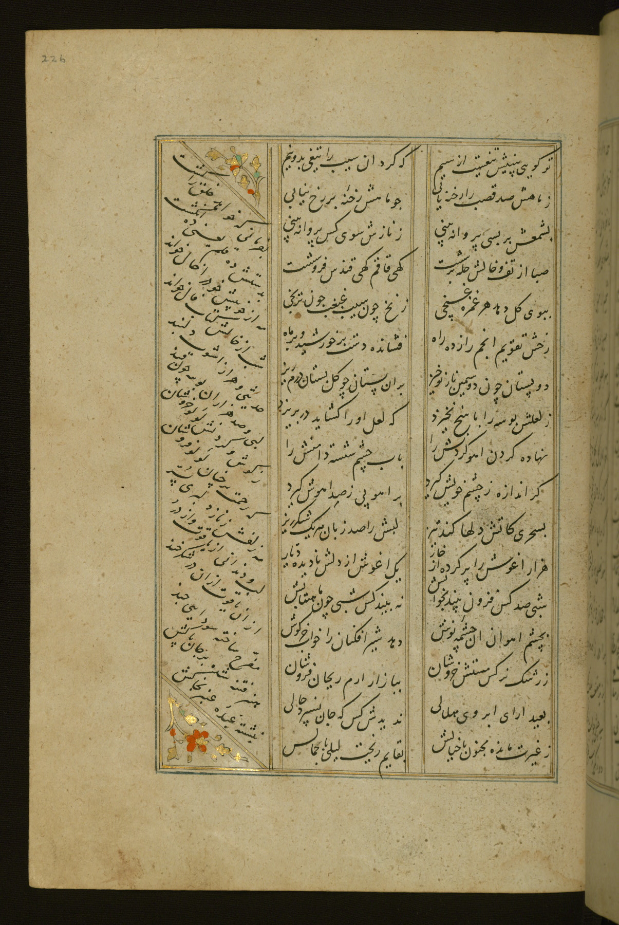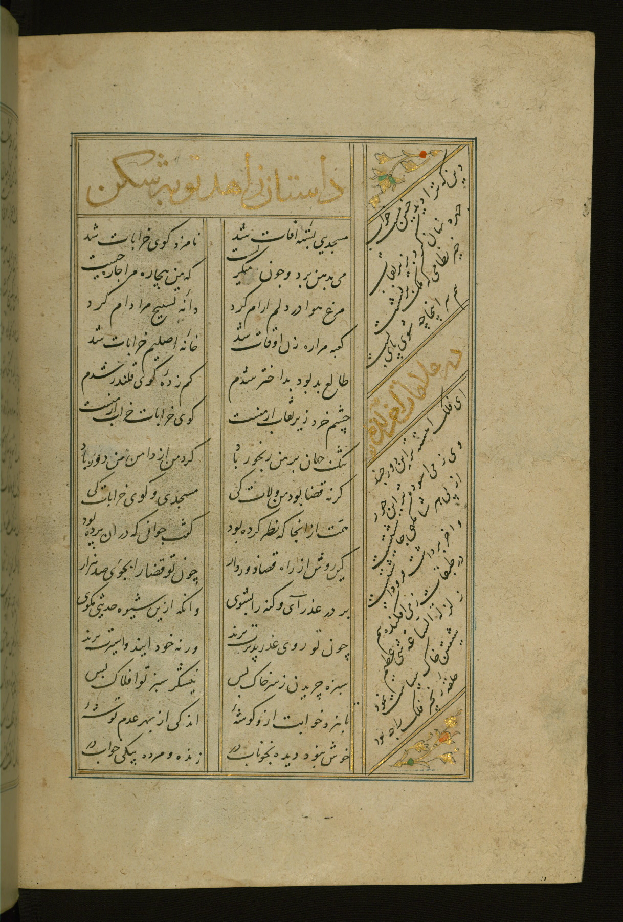 This copy of the Khamsah (quintet) of Niẓāmī Ganjavī (d. 605 AH / 1209 CE) was written by Abū Bakr Shāh ibn Ḥasan ibn ʿAlī al-Shahrastānī and illuminated by Jamāl al-Dīn ibn Muḥammad al-Ṣiddīqī al-Iṣfahānī between 892 AH / 1486 CE and 900 AH / 1494-5 CE. The manuscript opens with a double-page illuminated frontispiece with an inscription giving the title of the work and the name of the author (fols. 1b-2a). There are four illuminated titlepieces with the names of the individual poems and twenty-six repainted illustrations. According to evidence supplied by the colophons, the original binding was by the hand of Jamāl al-Dīn ibn Muḥammad al-Ṣiddīqī al-Iṣfahānī, as well. Unfortunately, it has not survived. The binding presently attached to the manuscript dates to the twelfth century AH / eighteenth CE.