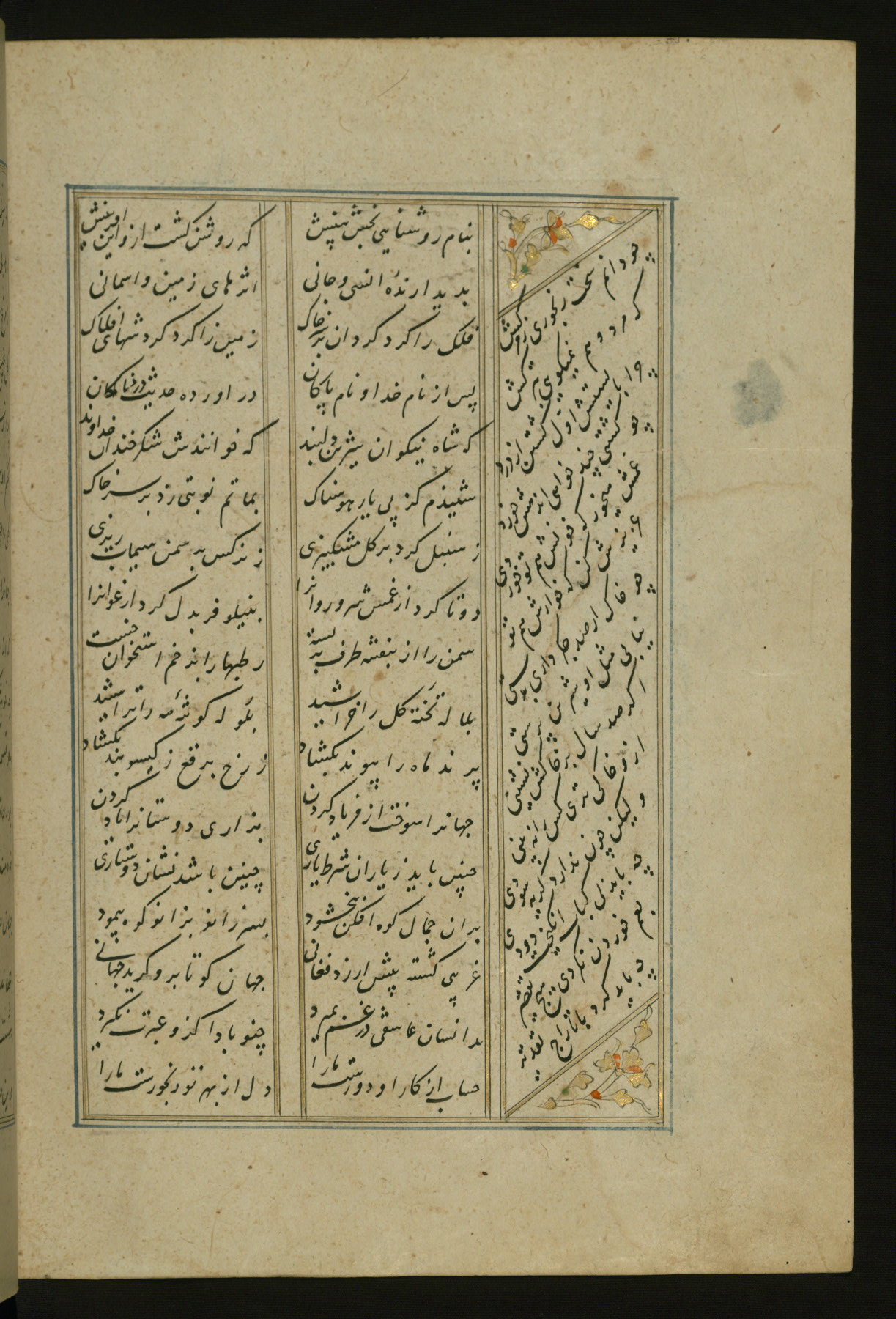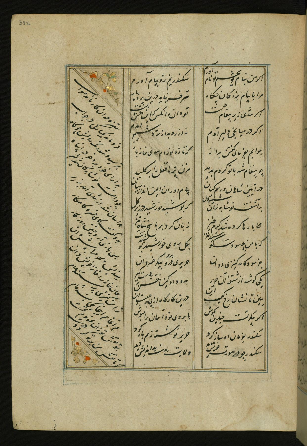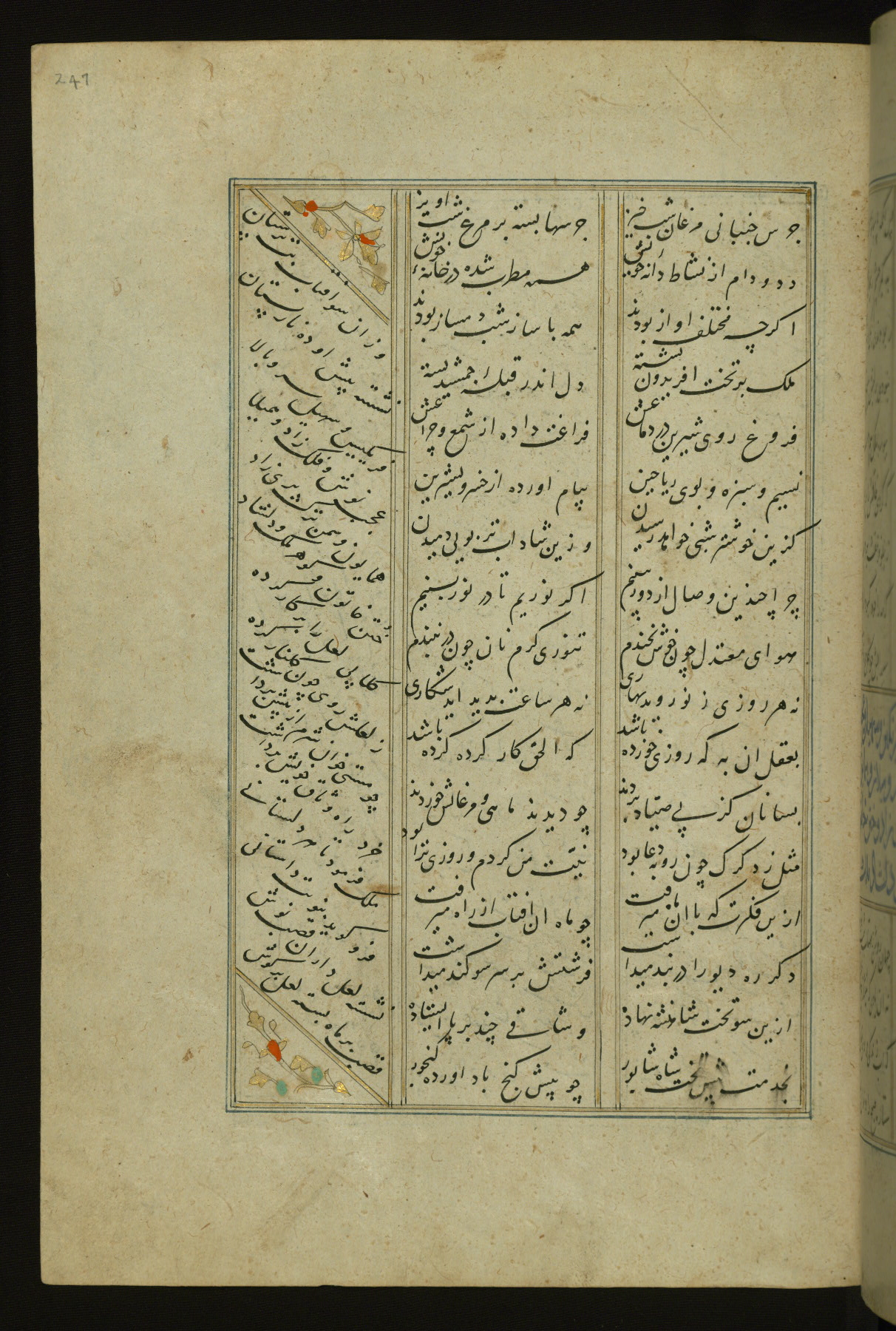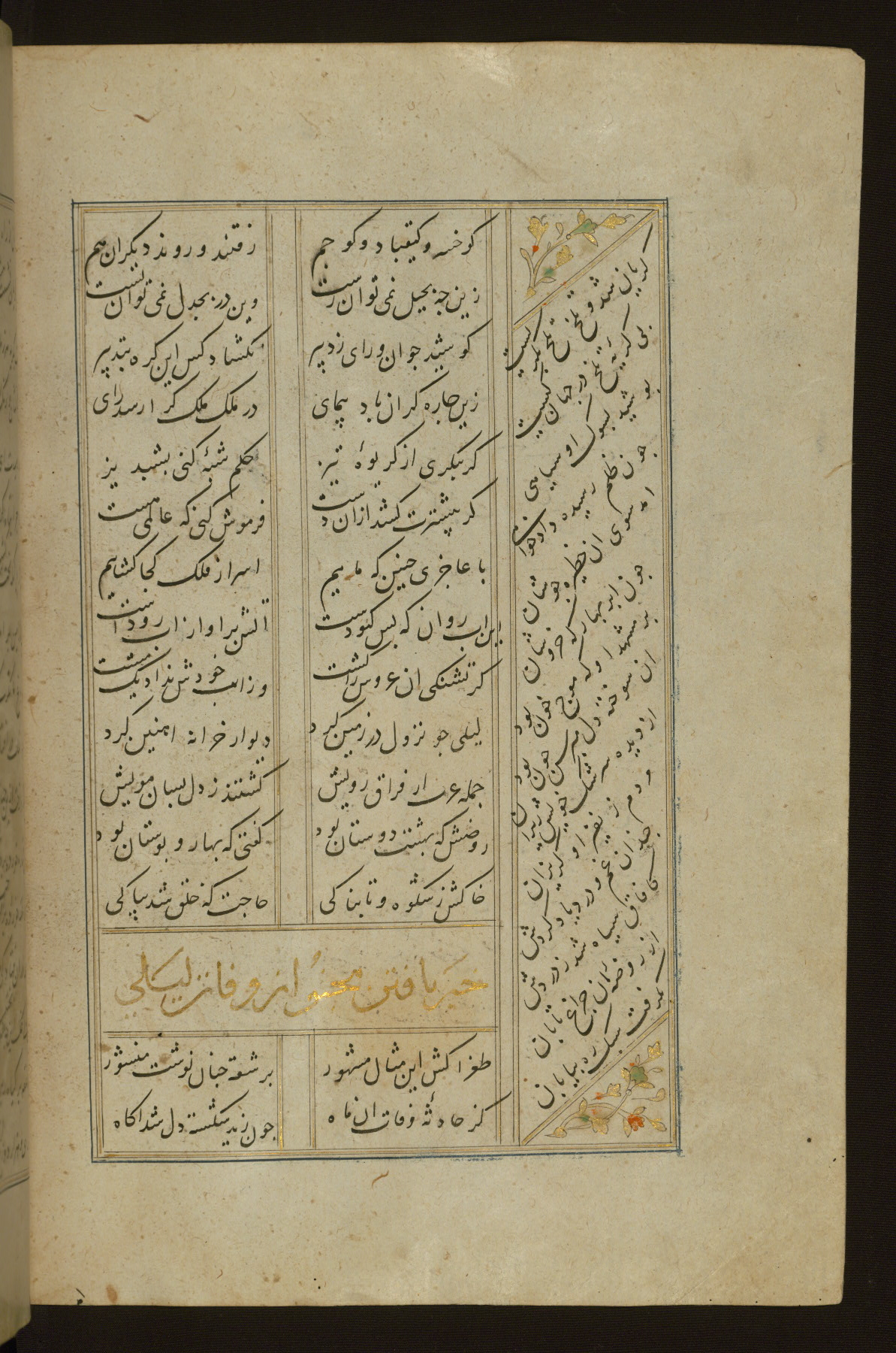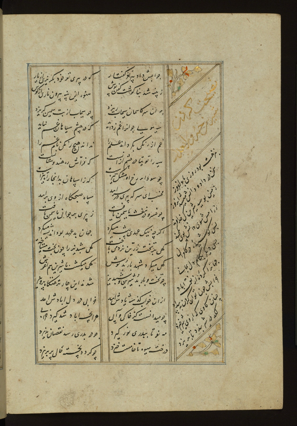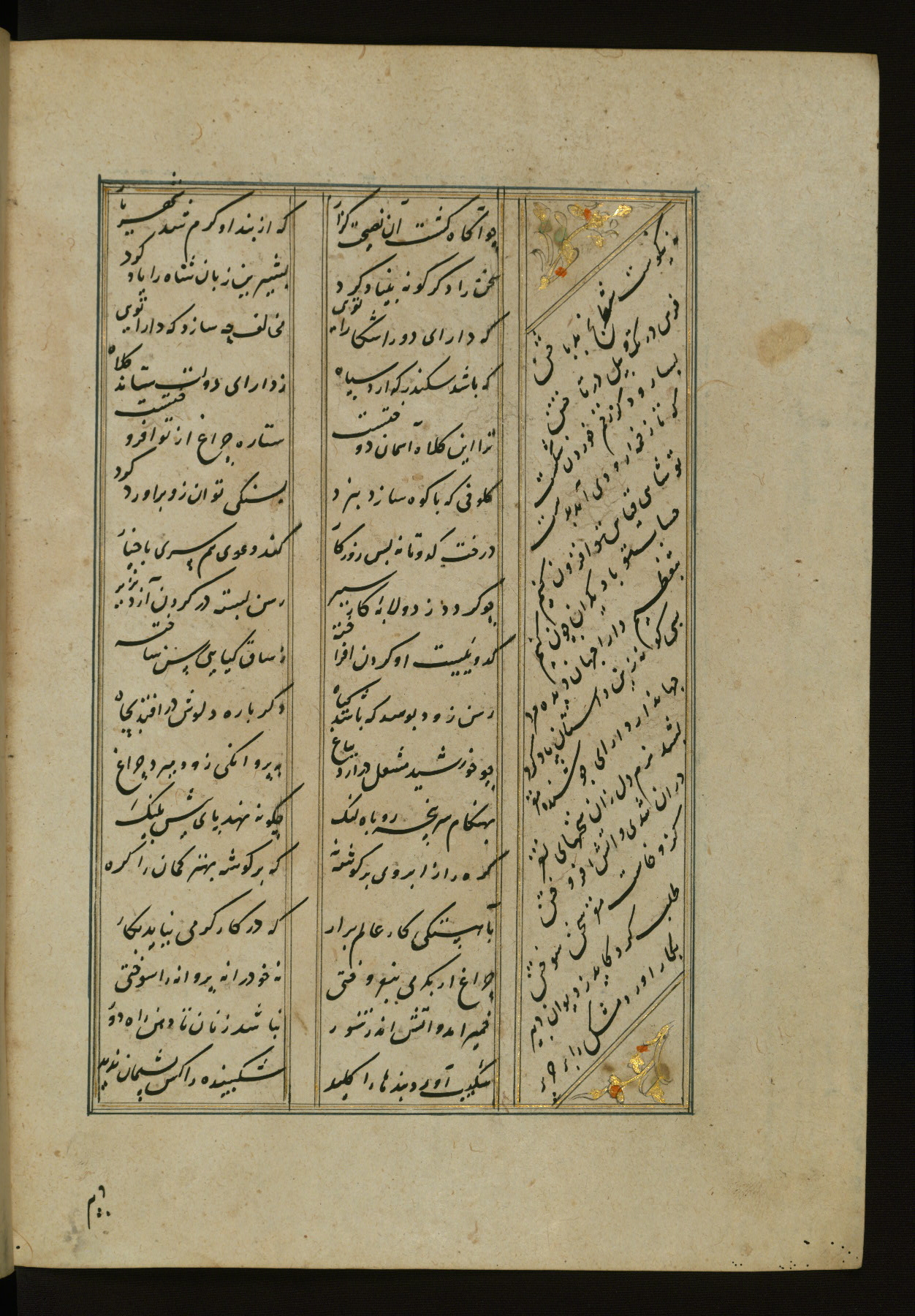 This copy of the Khamsah (quintet) of Niẓāmī Ganjavī (d. 605 AH / 1209 CE) was written by Abū Bakr Shāh ibn Ḥasan ibn ʿAlī al-Shahrastānī and illuminated by Jamāl al-Dīn ibn Muḥammad al-Ṣiddīqī al-Iṣfahānī between 892 AH / 1486 CE and 900 AH / 1494-5 CE. The manuscript opens with a double-page illuminated frontispiece with an inscription giving the title of the work and the name of the author (fols. 1b-2a). There are four illuminated titlepieces with the names of the individual poems and twenty-six repainted illustrations. According to evidence supplied by the colophons, the original binding was by the hand of Jamāl al-Dīn ibn Muḥammad al-Ṣiddīqī al-Iṣfahānī, as well. Unfortunately, it has not survived. The binding presently attached to the manuscript dates to the twelfth century AH / eighteenth CE.