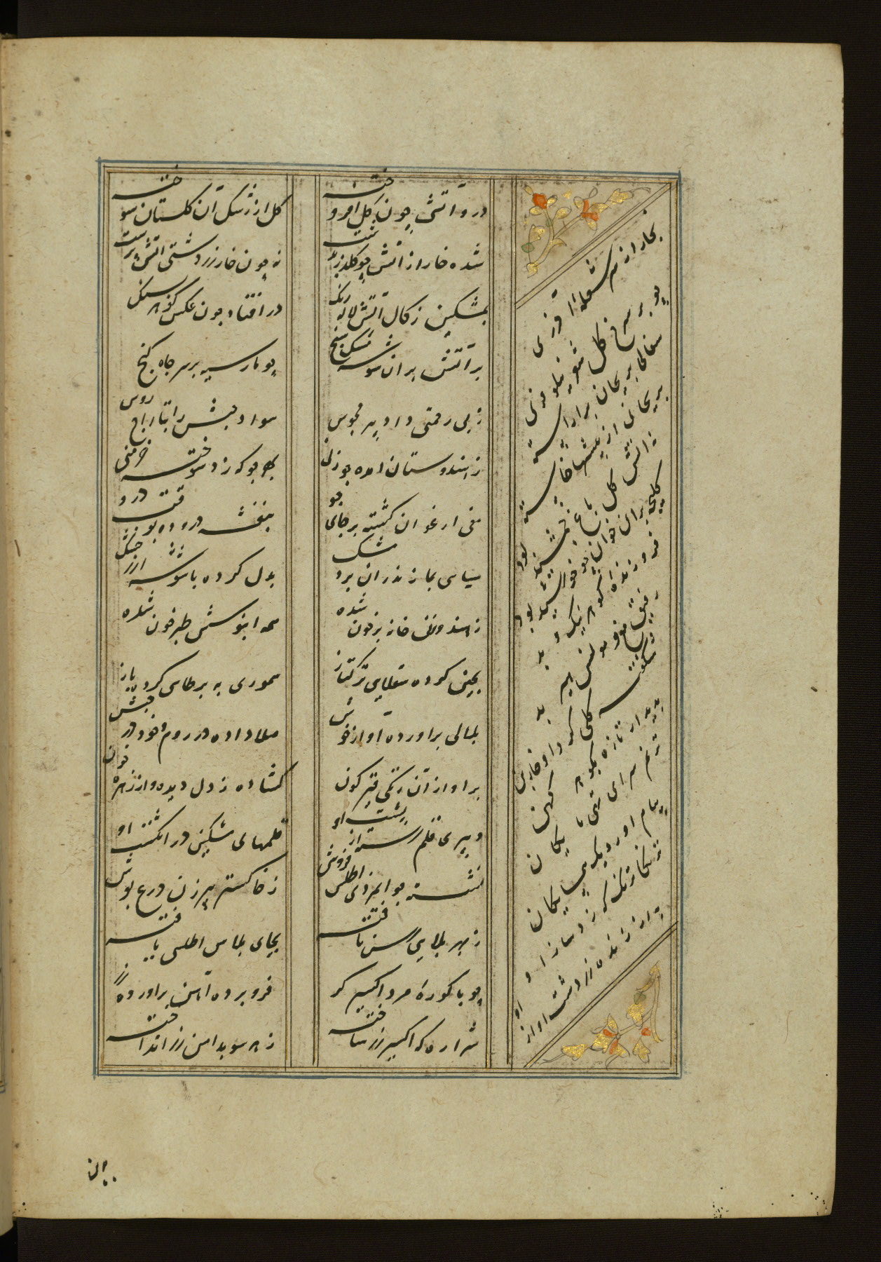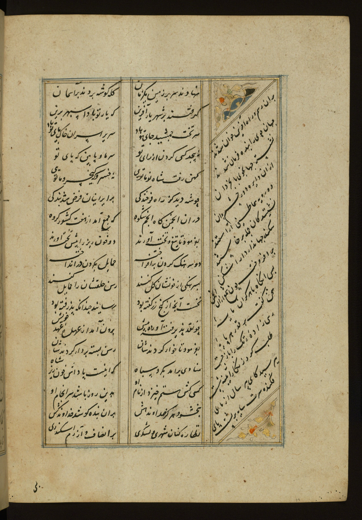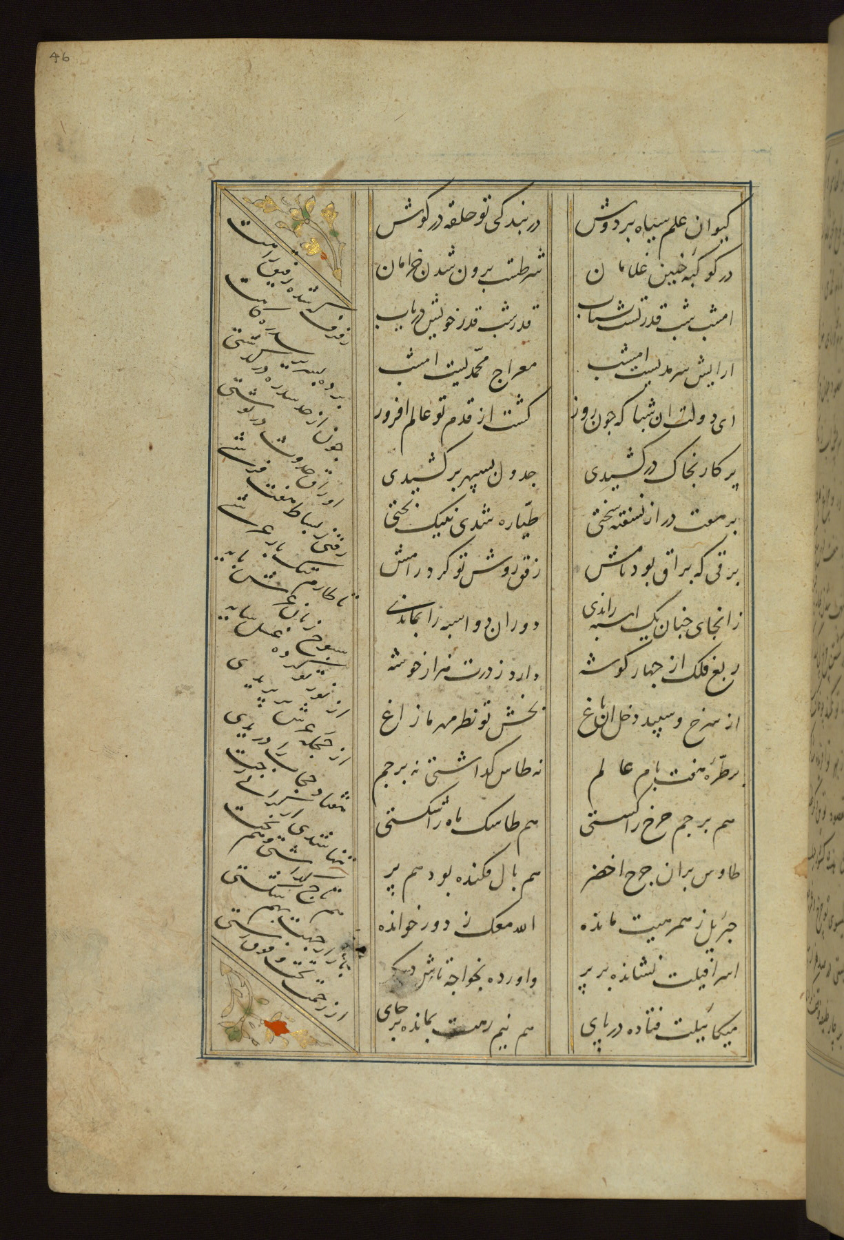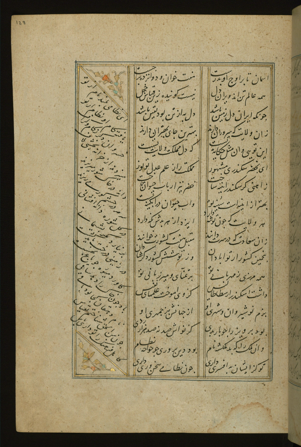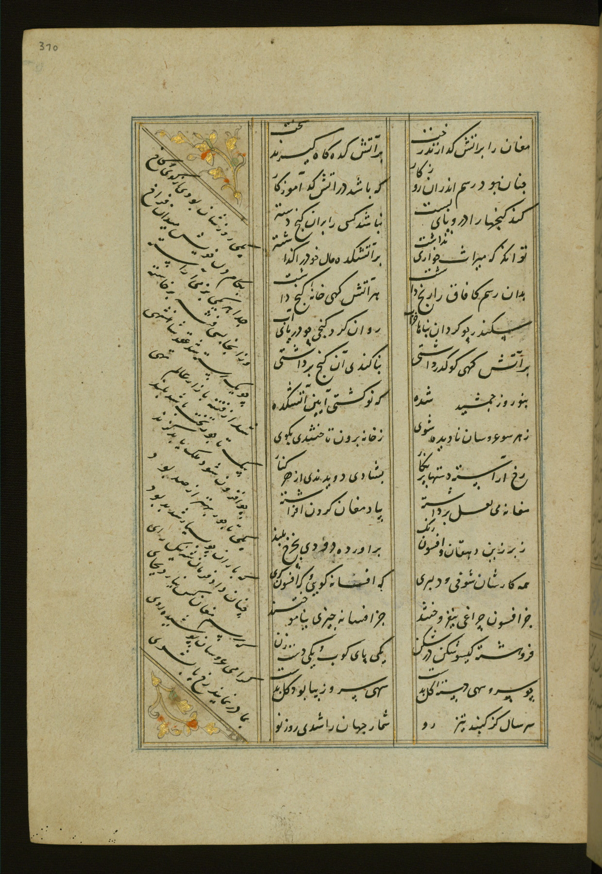 This copy of the Khamsah (quintet) of Niẓāmī Ganjavī (d. 605 AH / 1209 CE) was written by Abū Bakr Shāh ibn Ḥasan ibn ʿAlī al-Shahrastānī and illuminated by Jamāl al-Dīn ibn Muḥammad al-Ṣiddīqī al-Iṣfahānī between 892 AH / 1486 CE and 900 AH / 1494-5 CE. The manuscript opens with a double-page illuminated frontispiece with an inscription giving the title of the work and the name of the author (fols. 1b-2a). There are four illuminated titlepieces with the names of the individual poems and twenty-six repainted illustrations. According to evidence supplied by the colophons, the original binding was by the hand of Jamāl al-Dīn ibn Muḥammad al-Ṣiddīqī al-Iṣfahānī, as well. Unfortunately, it has not survived. The binding presently attached to the manuscript dates to the twelfth century AH / eighteenth CE.