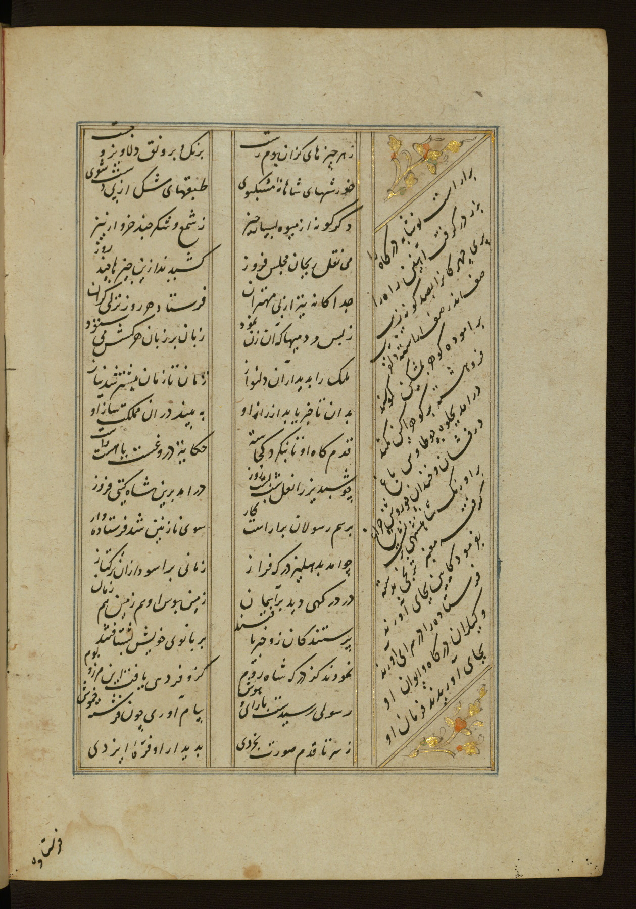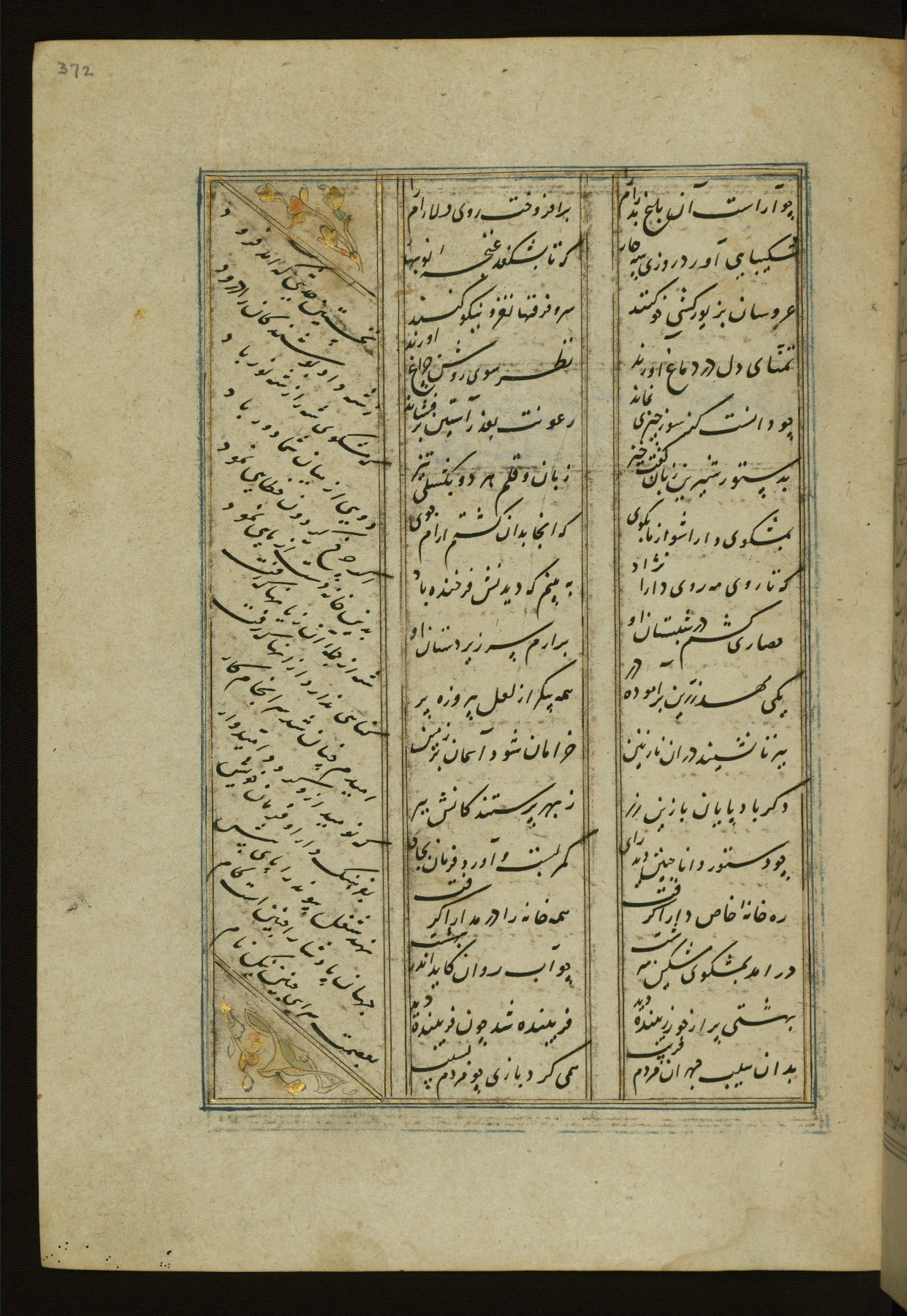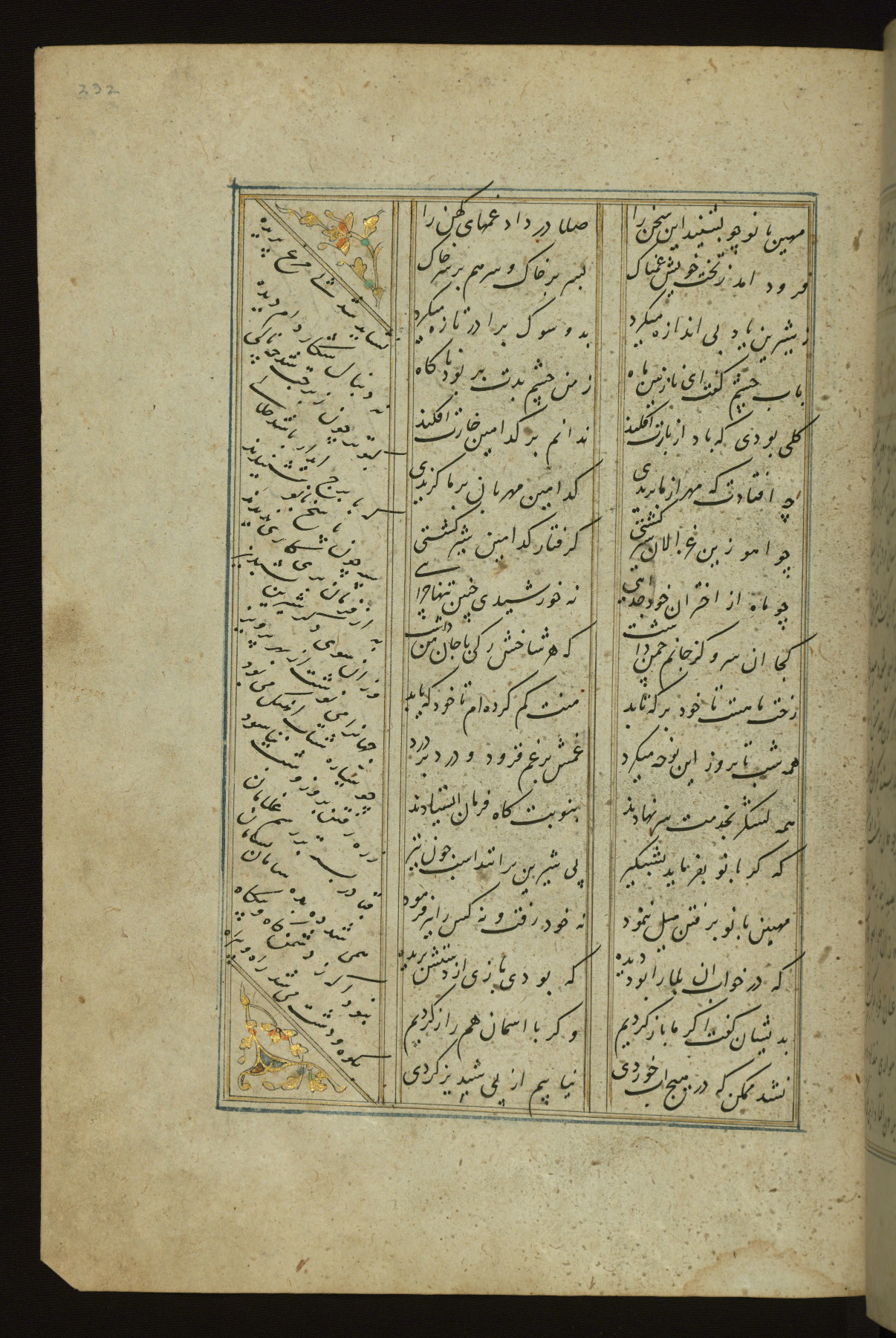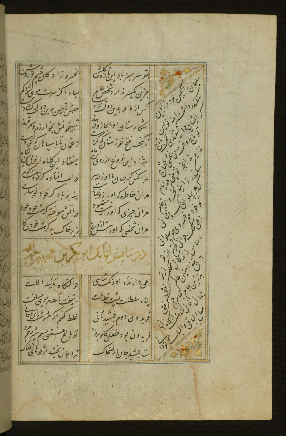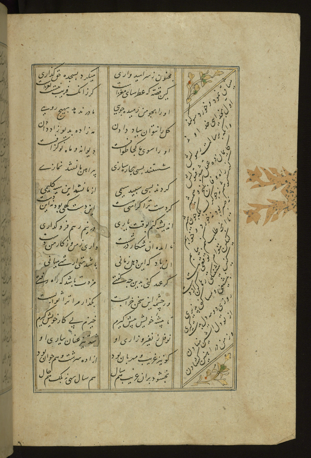 This copy of the Khamsah (quintet) of Niẓāmī Ganjavī (d. 605 AH / 1209 CE) was written by Abū Bakr Shāh ibn Ḥasan ibn ʿAlī al-Shahrastānī and illuminated by Jamāl al-Dīn ibn Muḥammad al-Ṣiddīqī al-Iṣfahānī between 892 AH / 1486 CE and 900 AH / 1494-5 CE. The manuscript opens with a double-page illuminated frontispiece with an inscription giving the title of the work and the name of the author (fols. 1b-2a). There are four illuminated titlepieces with the names of the individual poems and twenty-six repainted illustrations. According to evidence supplied by the colophons, the original binding was by the hand of Jamāl al-Dīn ibn Muḥammad al-Ṣiddīqī al-Iṣfahānī, as well. Unfortunately, it has not survived. The binding presently attached to the manuscript dates to the twelfth century AH / eighteenth CE.