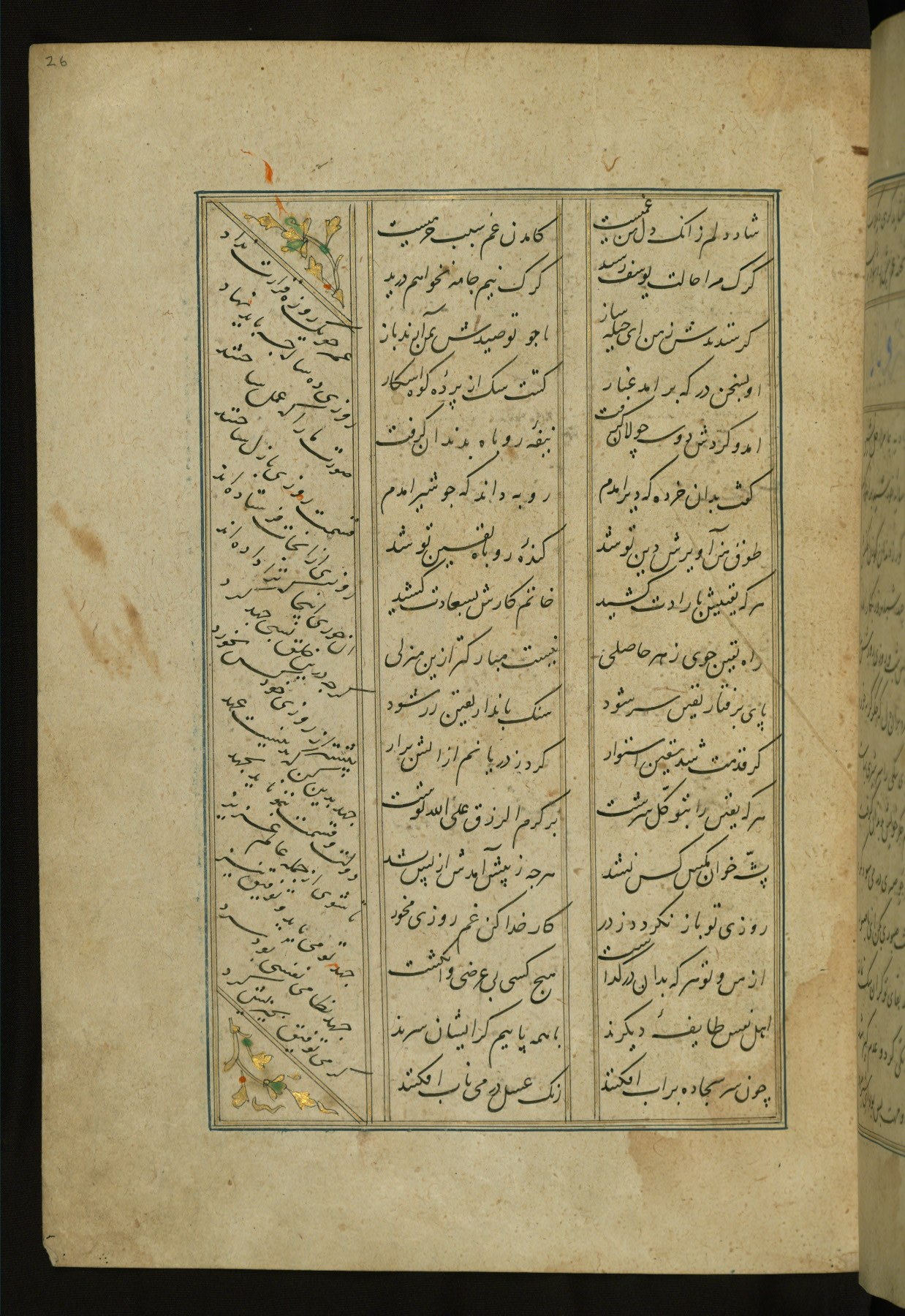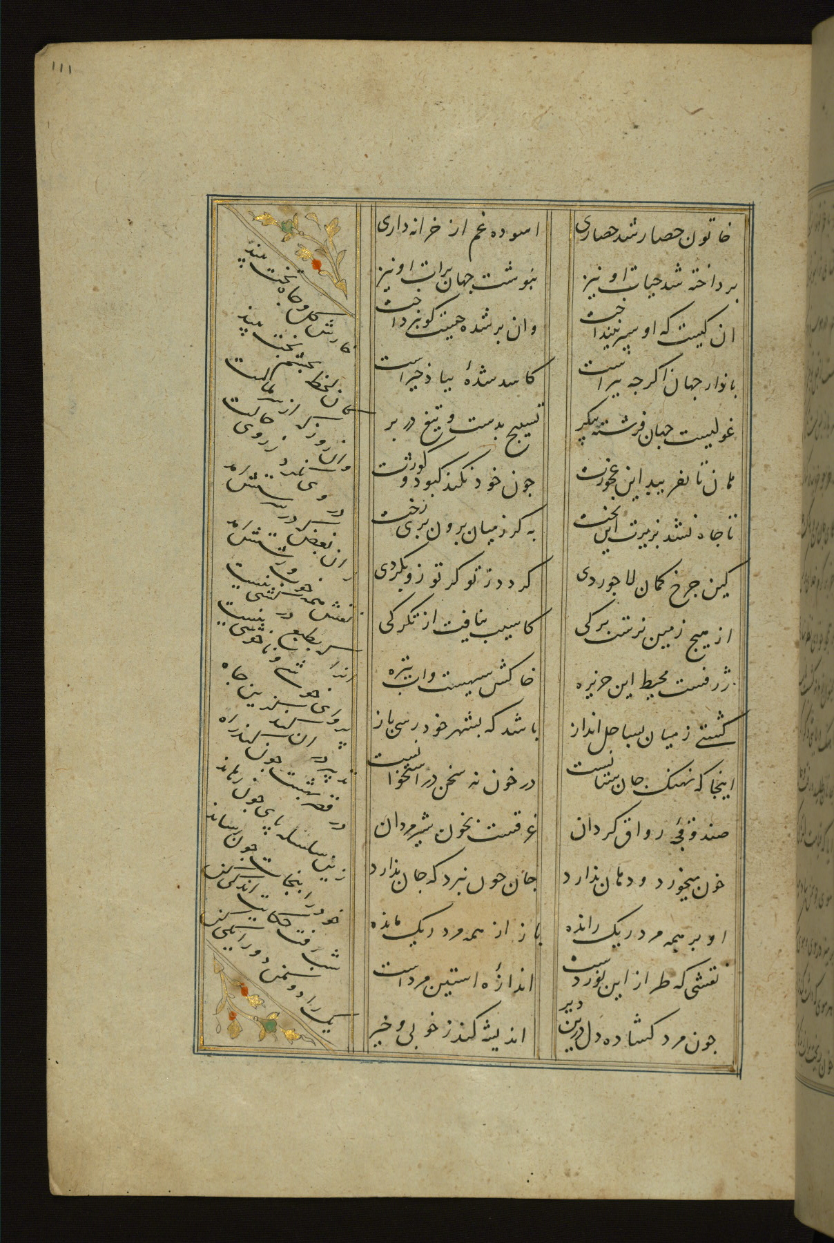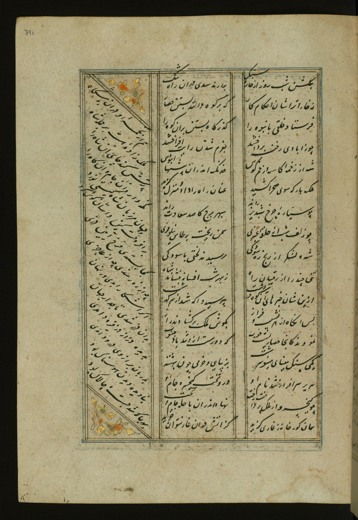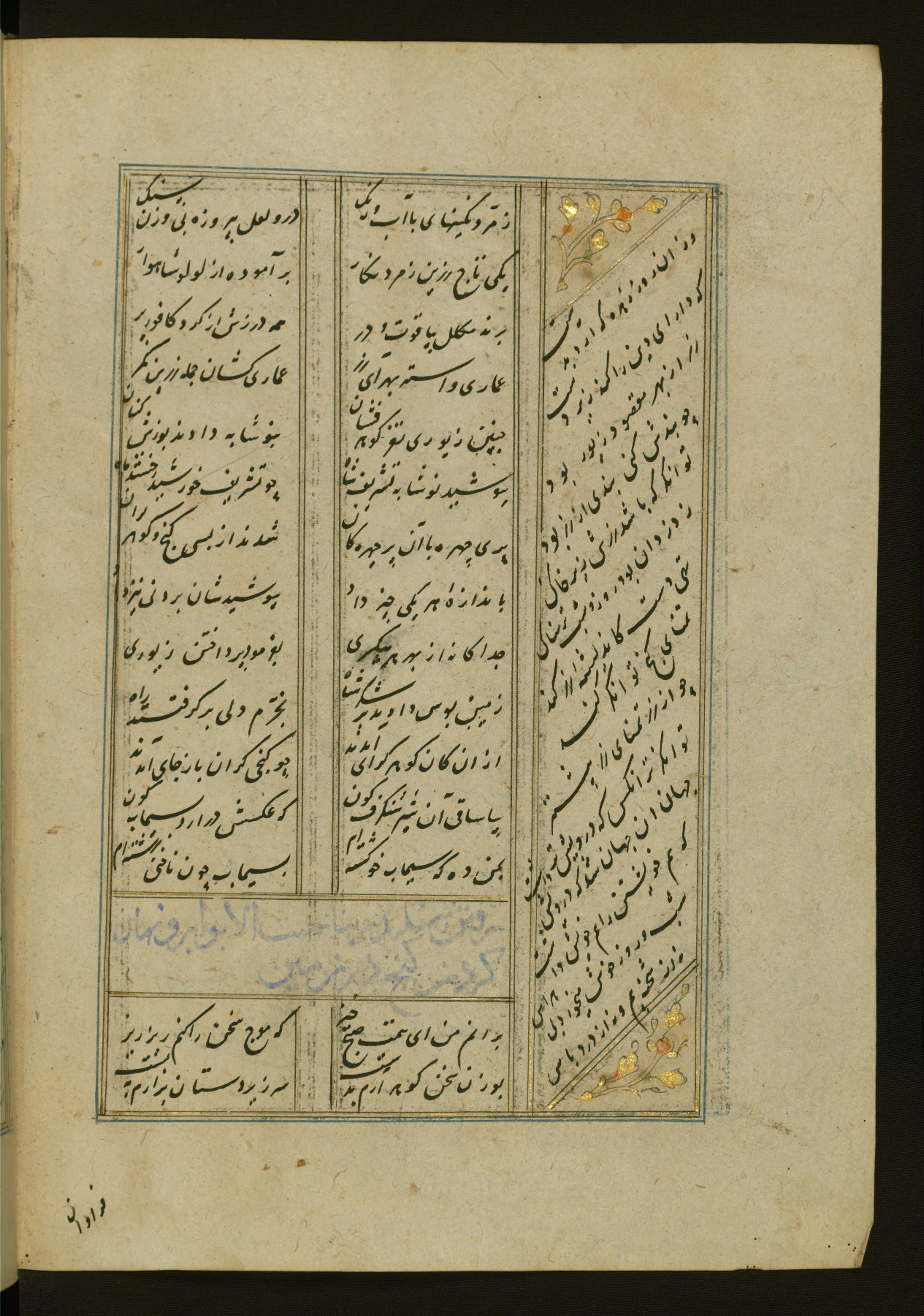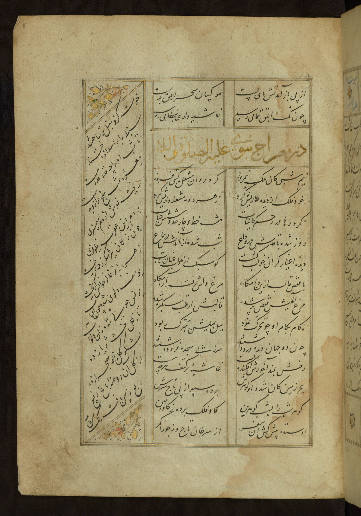 This copy of the Khamsah (quintet) of Niẓāmī Ganjavī (d. 605 AH / 1209 CE) was written by Abū Bakr Shāh ibn Ḥasan ibn ʿAlī al-Shahrastānī and illuminated by Jamāl al-Dīn ibn Muḥammad al-Ṣiddīqī al-Iṣfahānī between 892 AH / 1486 CE and 900 AH / 1494-5 CE. The manuscript opens with a double-page illuminated frontispiece with an inscription giving the title of the work and the name of the author (fols. 1b-2a). There are four illuminated titlepieces with the names of the individual poems and twenty-six repainted illustrations. According to evidence supplied by the colophons, the original binding was by the hand of Jamāl al-Dīn ibn Muḥammad al-Ṣiddīqī al-Iṣfahānī, as well. Unfortunately, it has not survived. The binding presently attached to the manuscript dates to the twelfth century AH / eighteenth CE.
