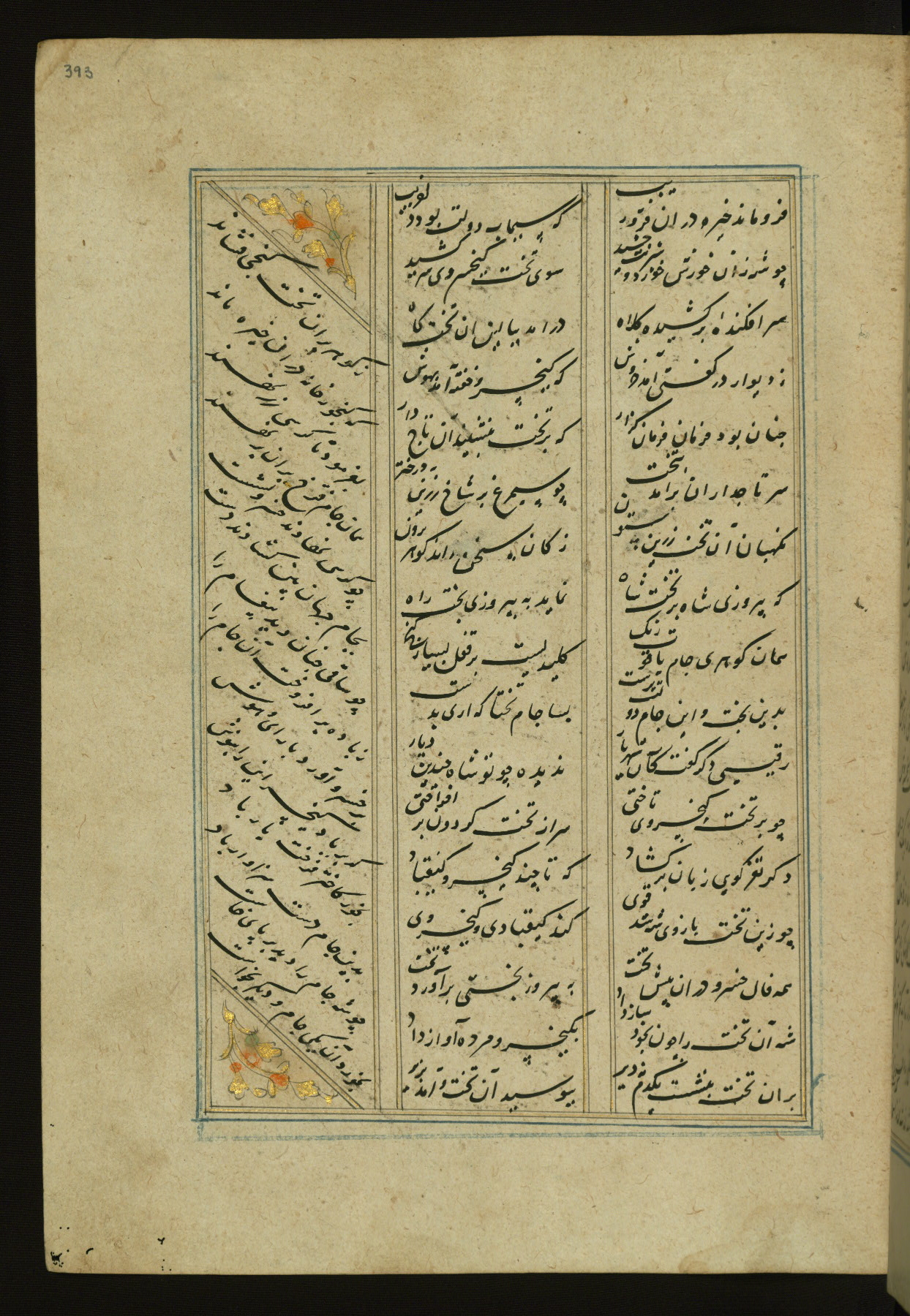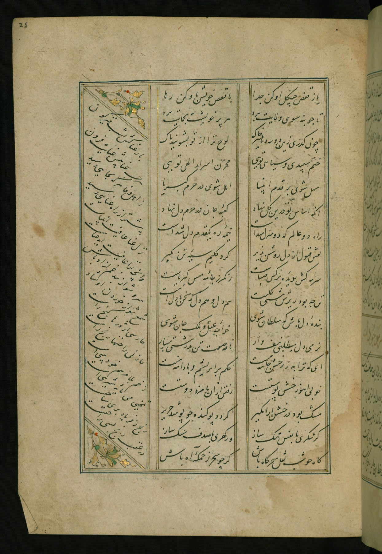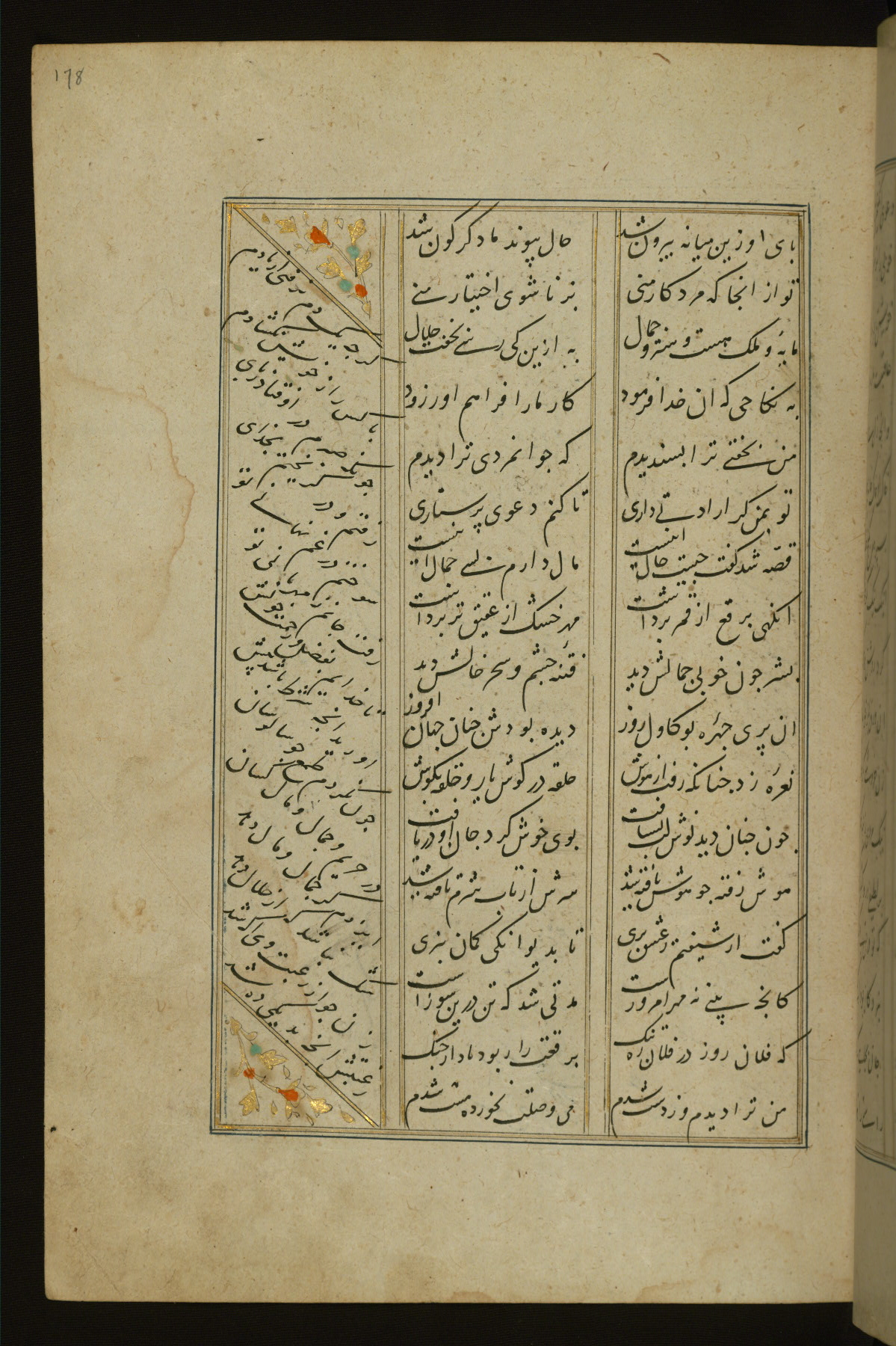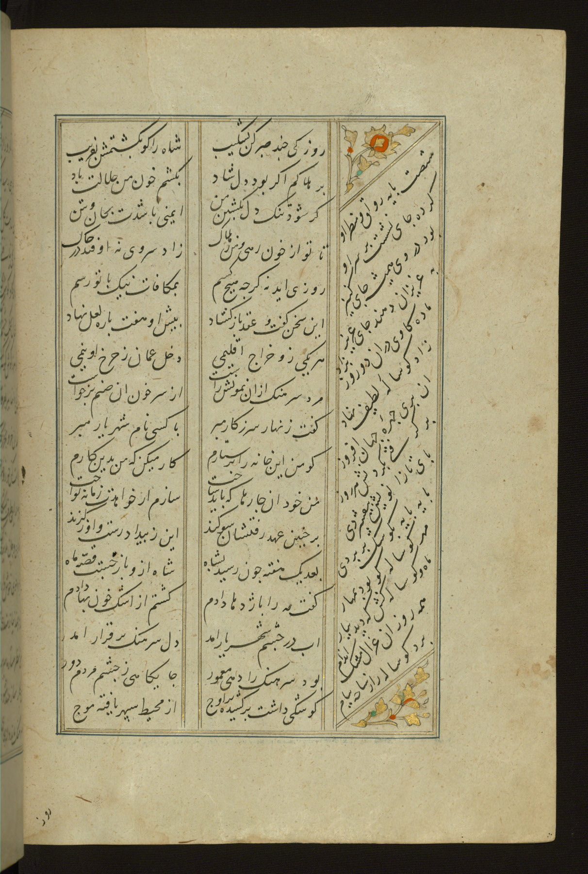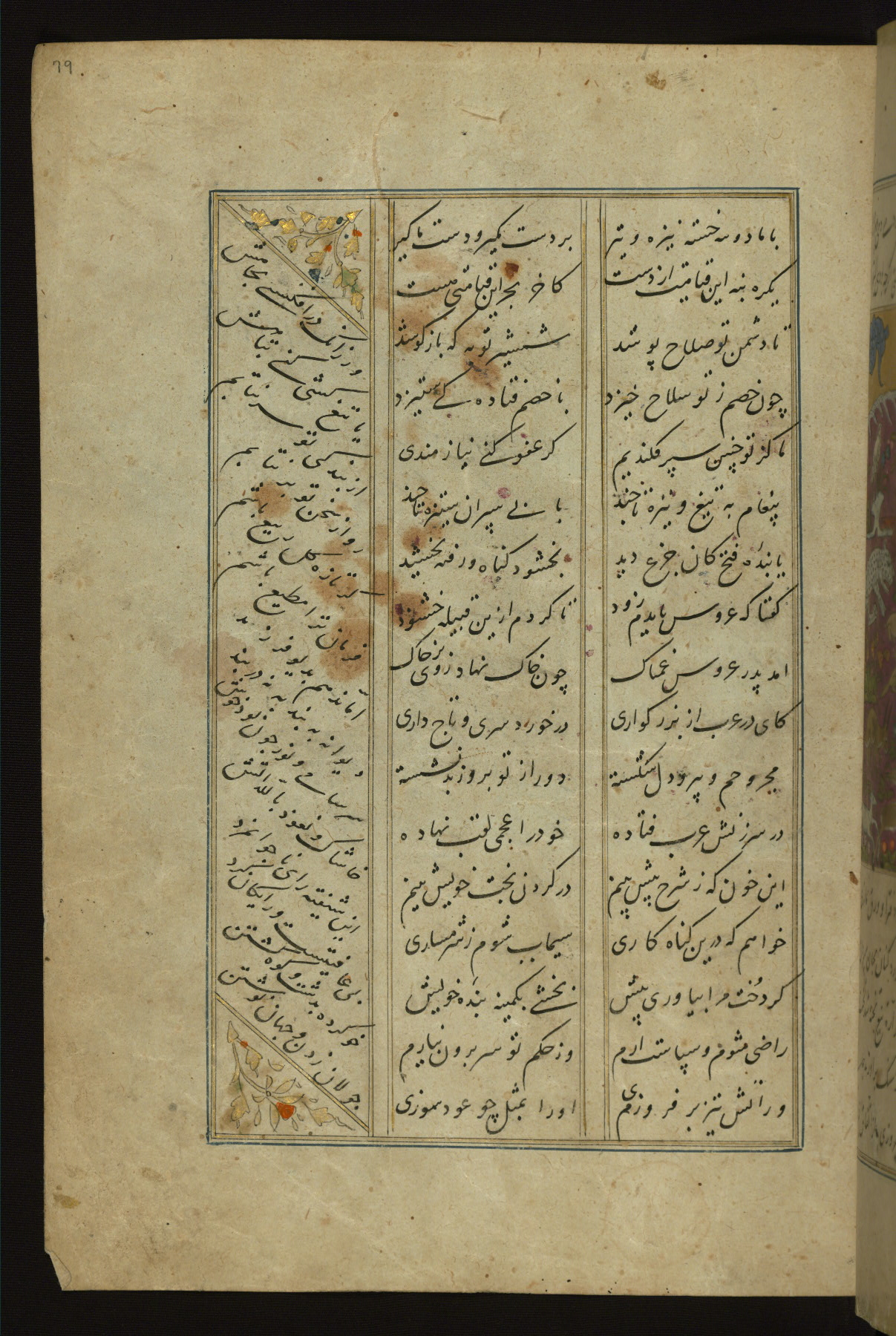 This copy of the Khamsah (quintet) of Niẓāmī Ganjavī (d. 605 AH / 1209 CE) was written by Abū Bakr Shāh ibn Ḥasan ibn ʿAlī al-Shahrastānī and illuminated by Jamāl al-Dīn ibn Muḥammad al-Ṣiddīqī al-Iṣfahānī between 892 AH / 1486 CE and 900 AH / 1494-5 CE. The manuscript opens with a double-page illuminated frontispiece with an inscription giving the title of the work and the name of the author (fols. 1b-2a). There are four illuminated titlepieces with the names of the individual poems and twenty-six repainted illustrations. According to evidence supplied by the colophons, the original binding was by the hand of Jamāl al-Dīn ibn Muḥammad al-Ṣiddīqī al-Iṣfahānī, as well. Unfortunately, it has not survived. The binding presently attached to the manuscript dates to the twelfth century AH / eighteenth CE.