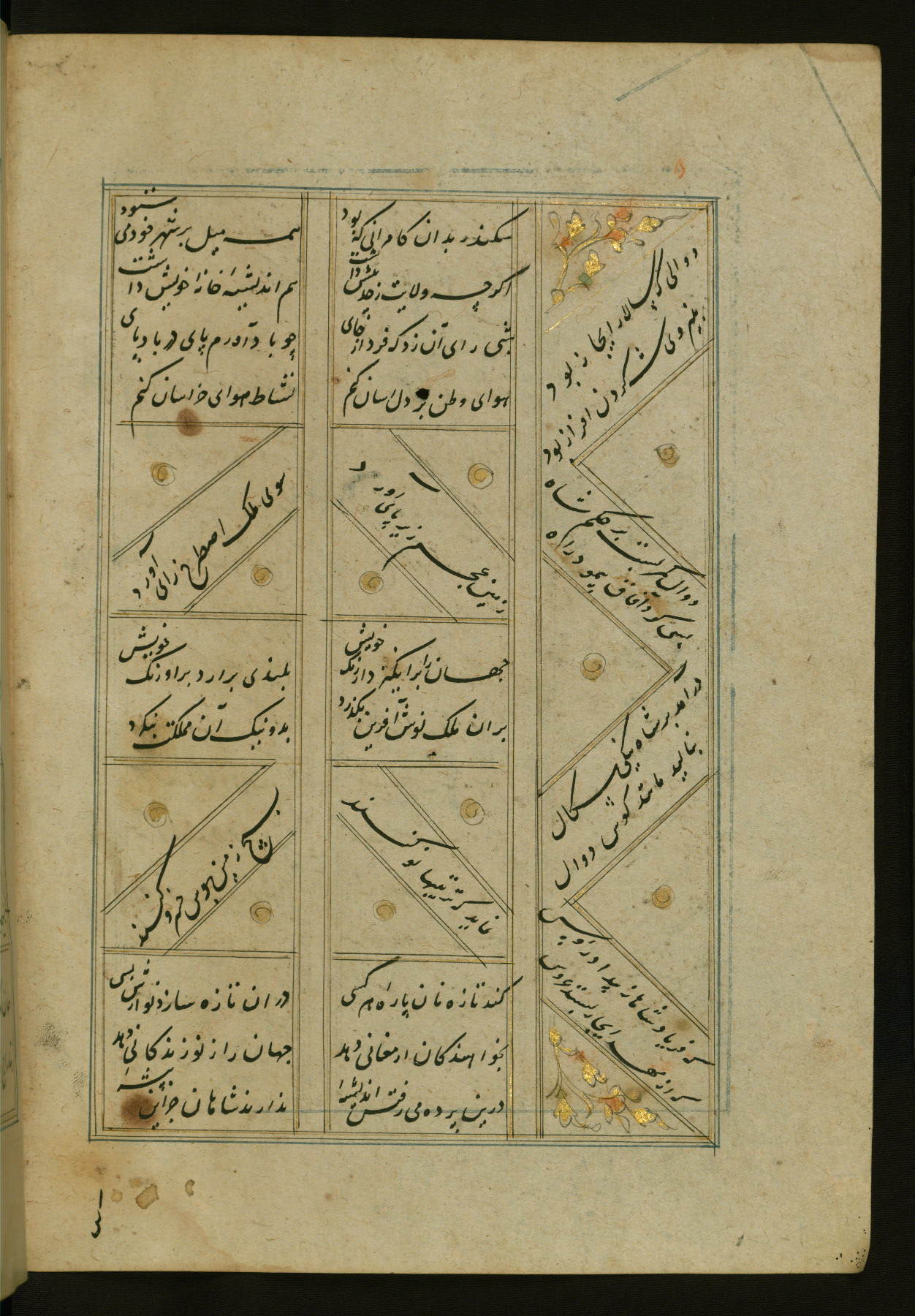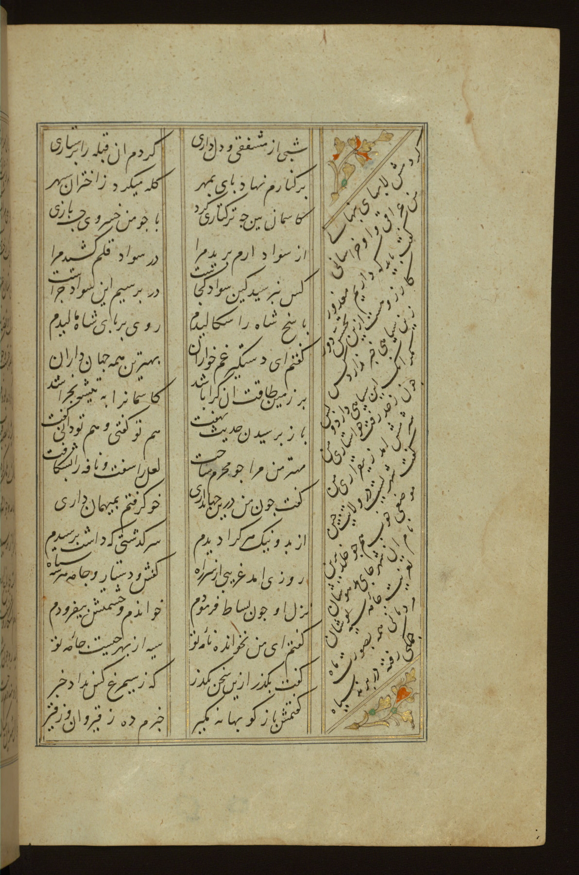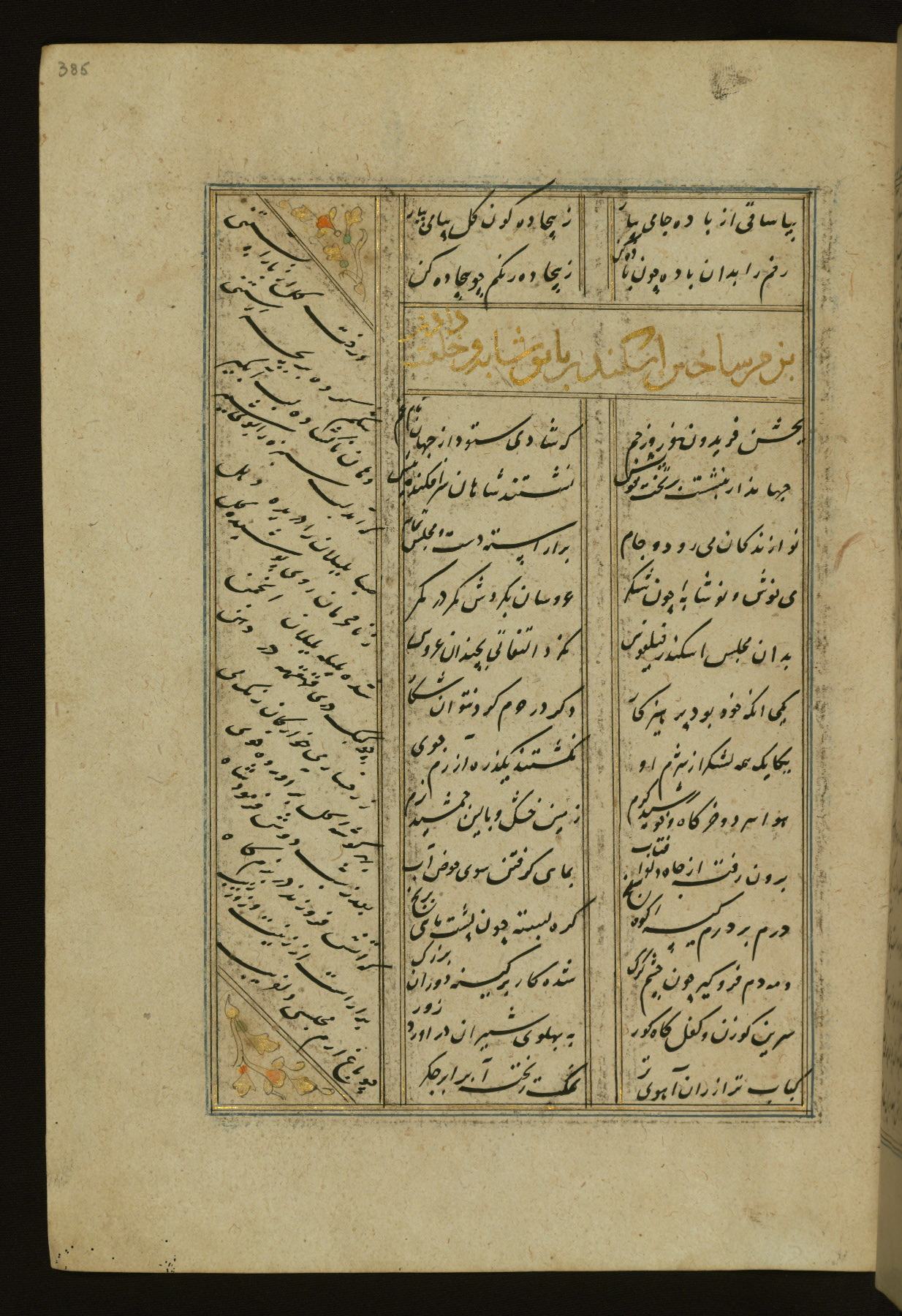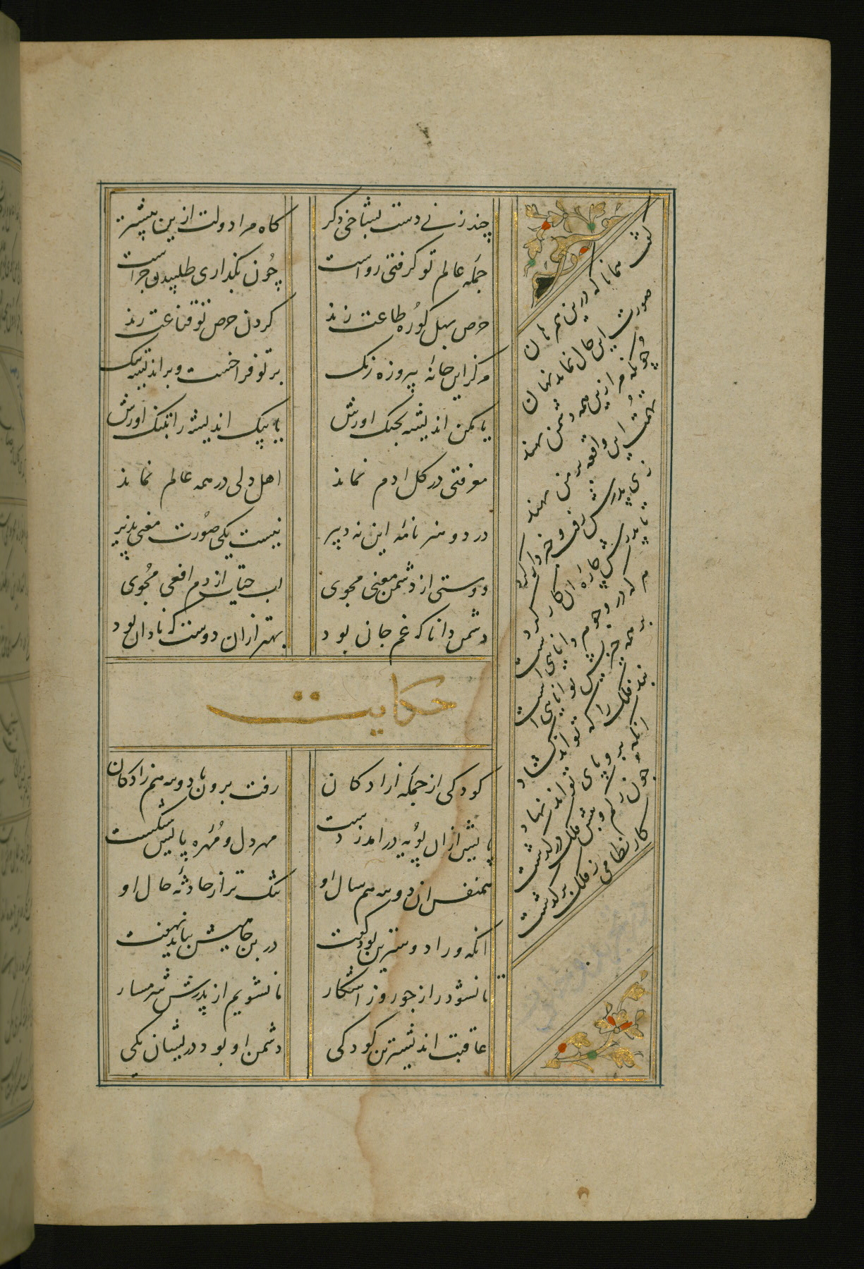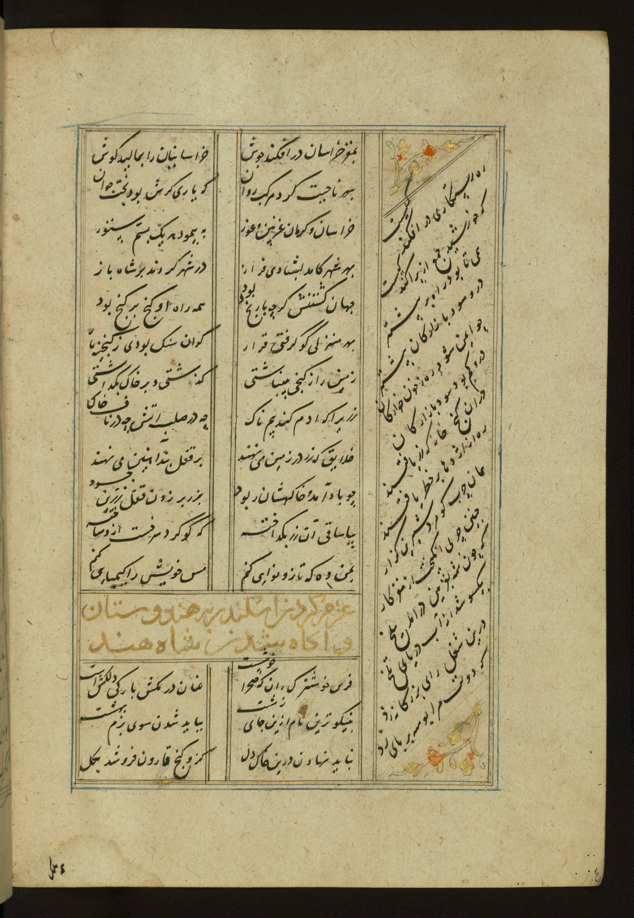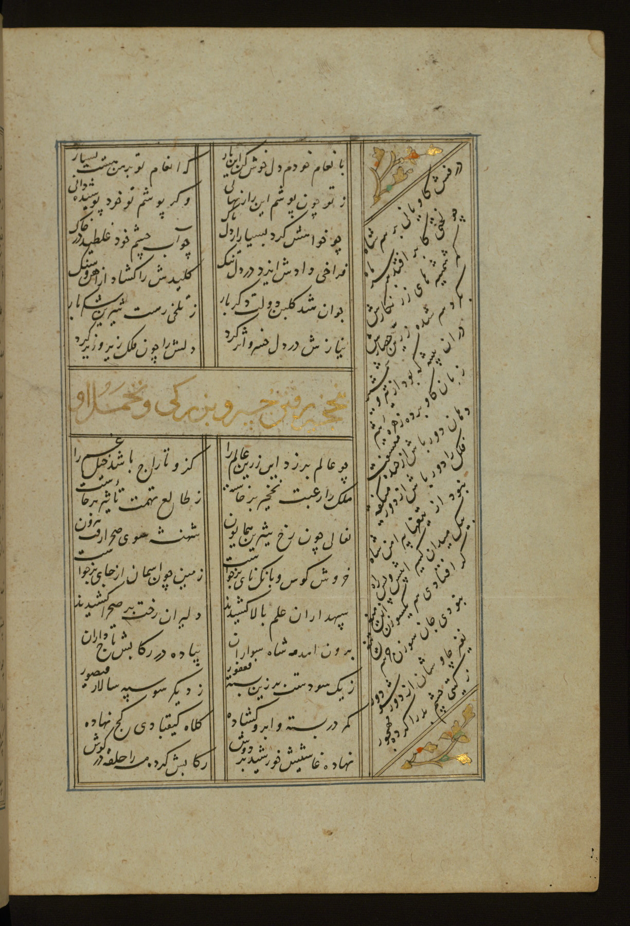 This copy of the Khamsah (quintet) of Niẓāmī Ganjavī (d. 605 AH / 1209 CE) was written by Abū Bakr Shāh ibn Ḥasan ibn ʿAlī al-Shahrastānī and illuminated by Jamāl al-Dīn ibn Muḥammad al-Ṣiddīqī al-Iṣfahānī between 892 AH / 1486 CE and 900 AH / 1494-5 CE. The manuscript opens with a double-page illuminated frontispiece with an inscription giving the title of the work and the name of the author (fols. 1b-2a). There are four illuminated titlepieces with the names of the individual poems and twenty-six repainted illustrations. According to evidence supplied by the colophons, the original binding was by the hand of Jamāl al-Dīn ibn Muḥammad al-Ṣiddīqī al-Iṣfahānī, as well. Unfortunately, it has not survived. The binding presently attached to the manuscript dates to the twelfth century AH / eighteenth CE.