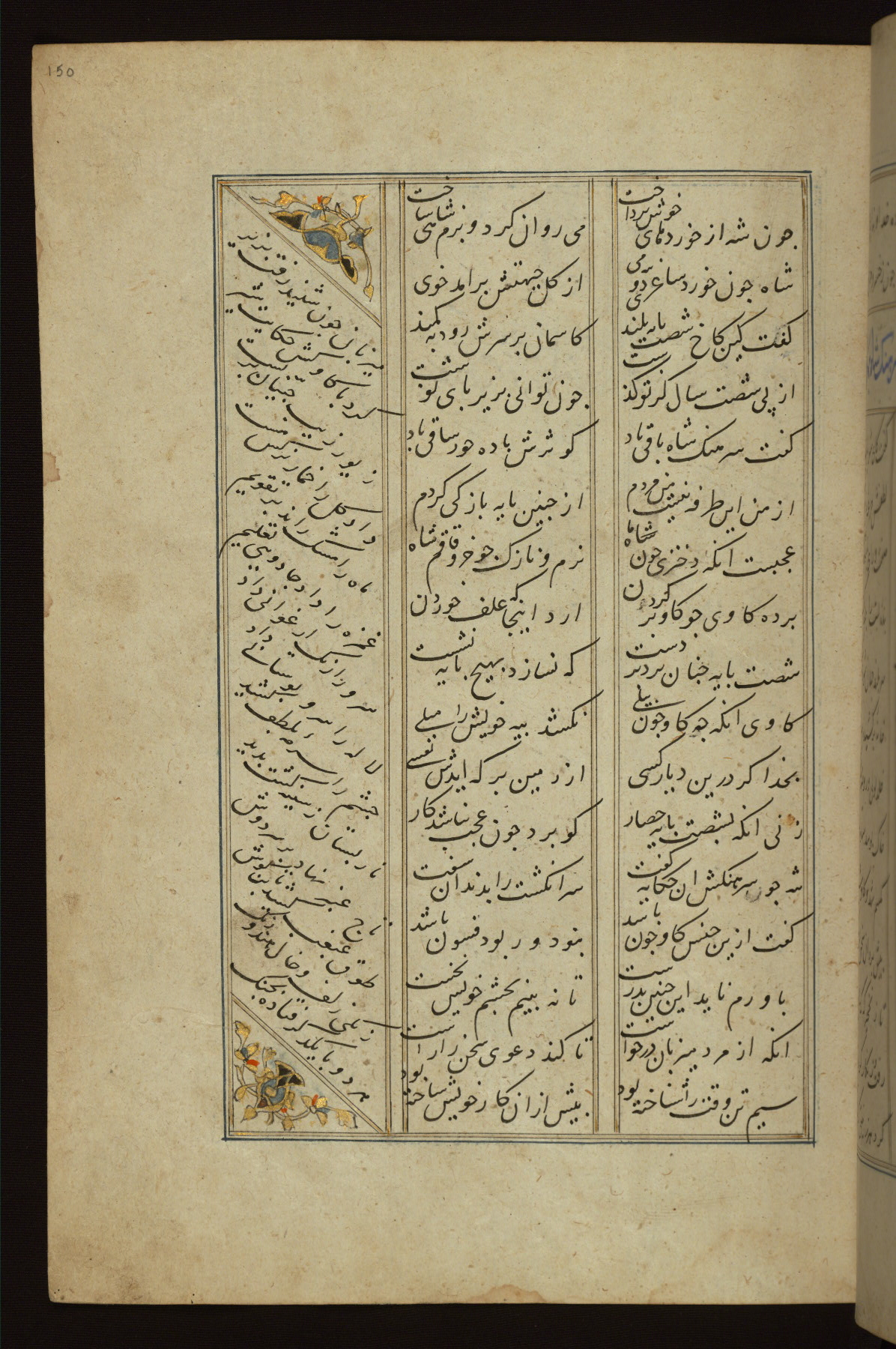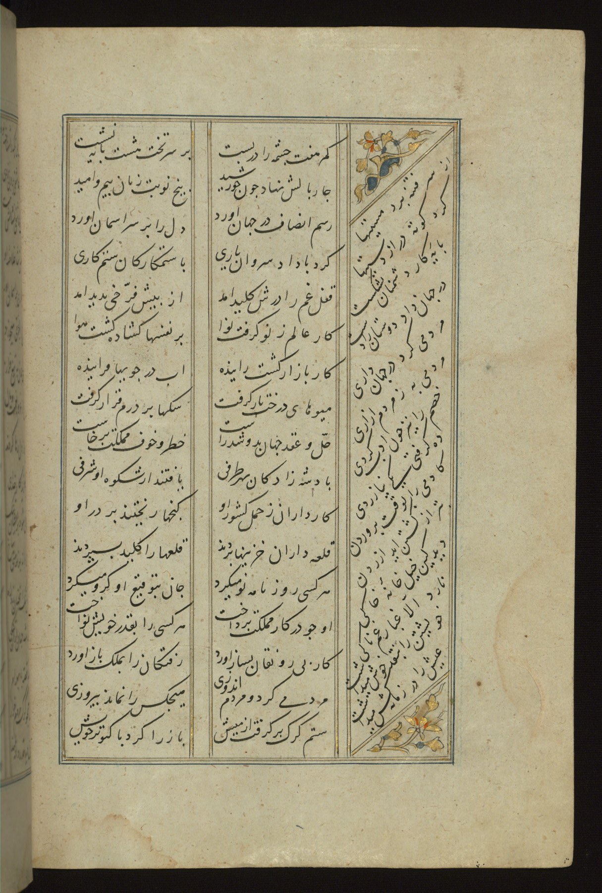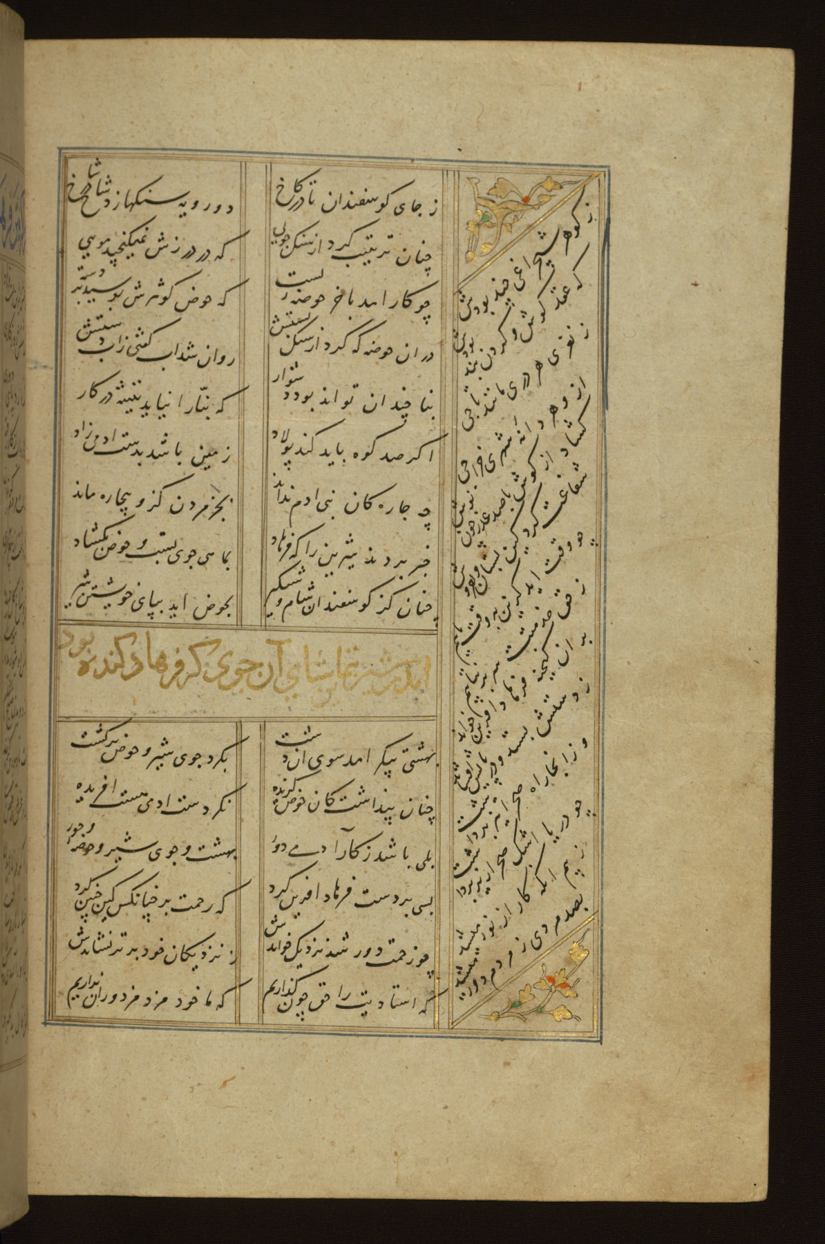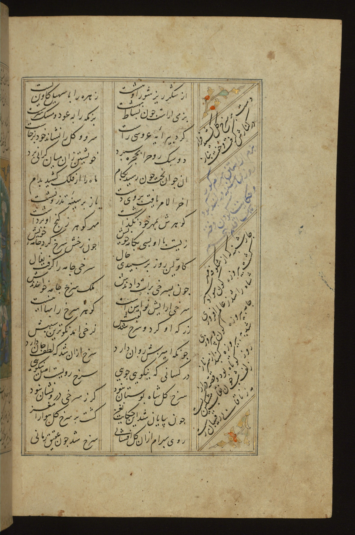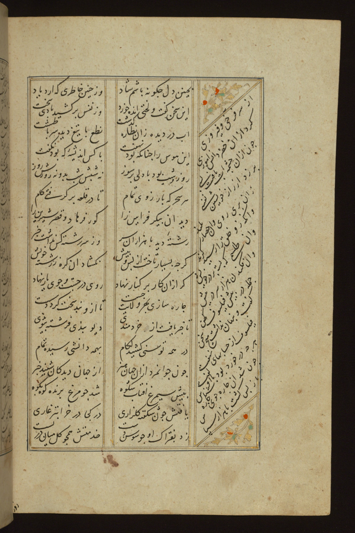 This copy of the Khamsah (quintet) of Niẓāmī Ganjavī (d. 605 AH / 1209 CE) was written by Abū Bakr Shāh ibn Ḥasan ibn ʿAlī al-Shahrastānī and illuminated by Jamāl al-Dīn ibn Muḥammad al-Ṣiddīqī al-Iṣfahānī between 892 AH / 1486 CE and 900 AH / 1494-5 CE. The manuscript opens with a double-page illuminated frontispiece with an inscription giving the title of the work and the name of the author (fols. 1b-2a). There are four illuminated titlepieces with the names of the individual poems and twenty-six repainted illustrations. According to evidence supplied by the colophons, the original binding was by the hand of Jamāl al-Dīn ibn Muḥammad al-Ṣiddīqī al-Iṣfahānī, as well. Unfortunately, it has not survived. The binding presently attached to the manuscript dates to the twelfth century AH / eighteenth CE.