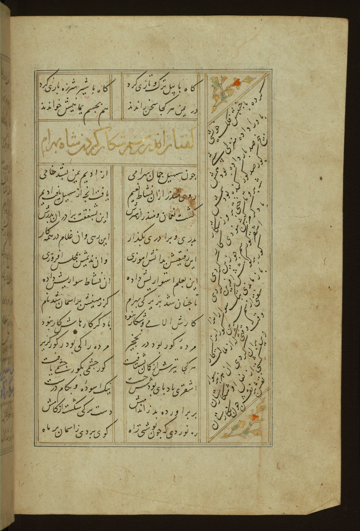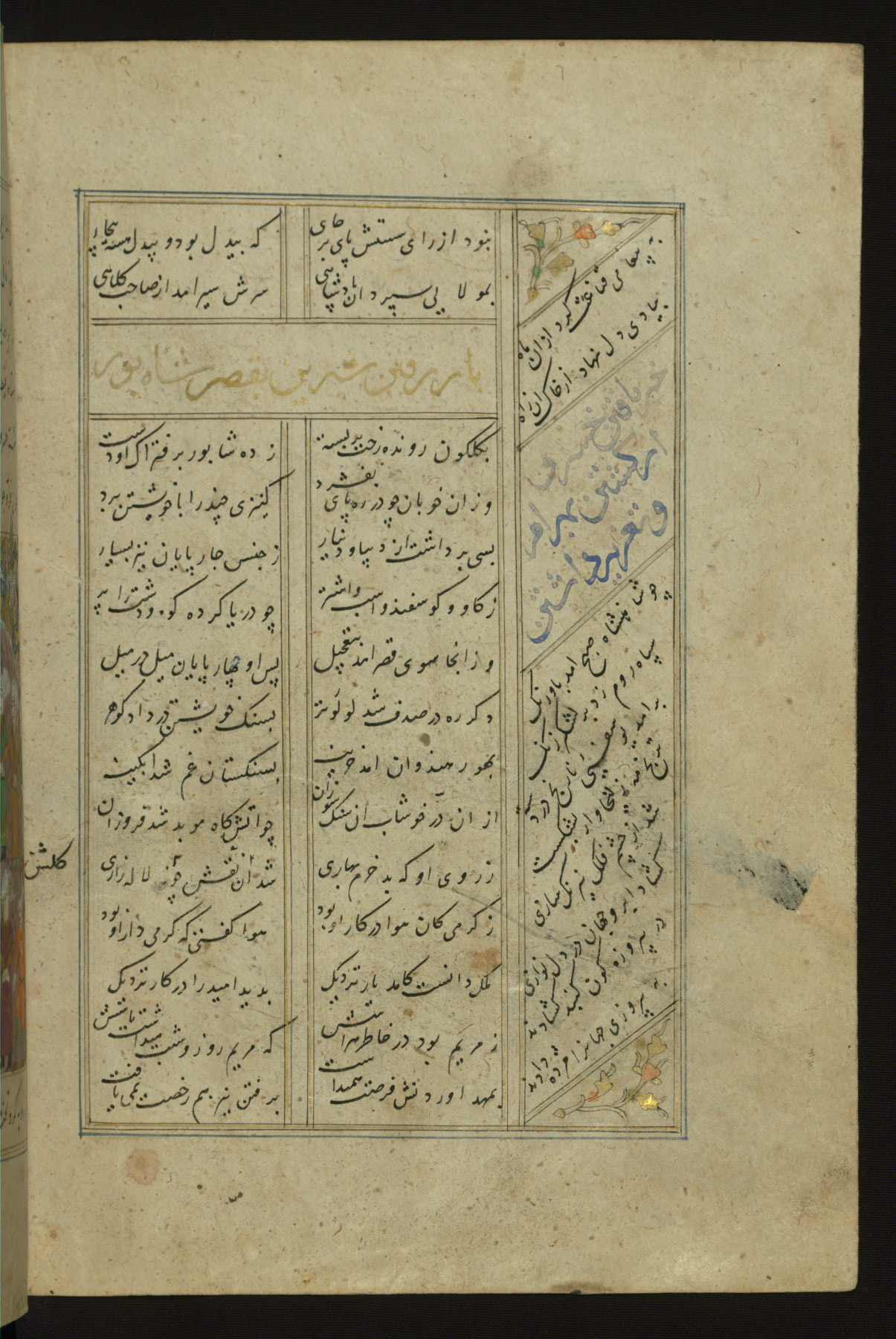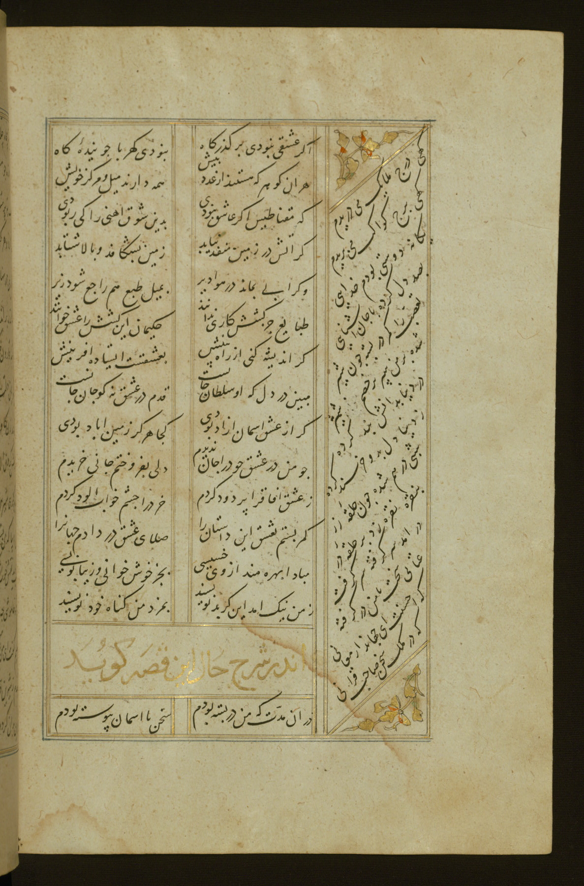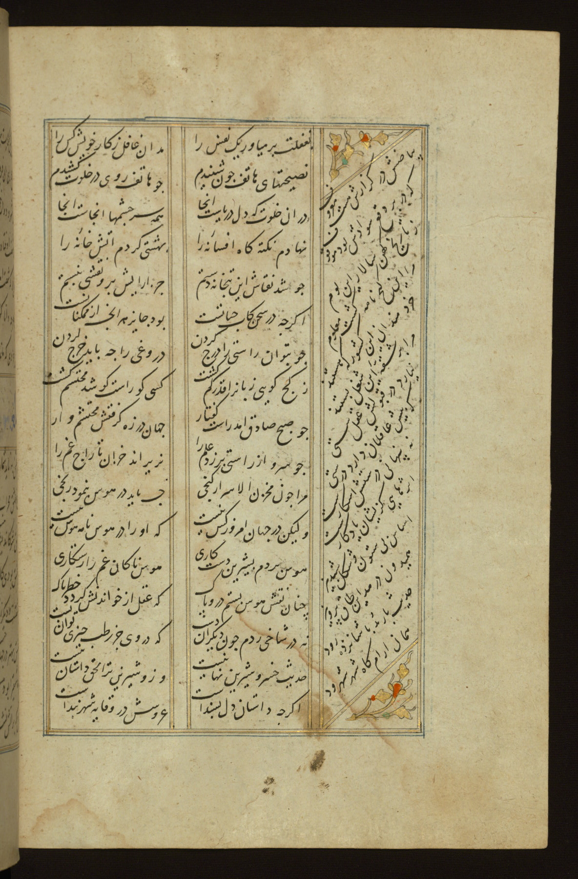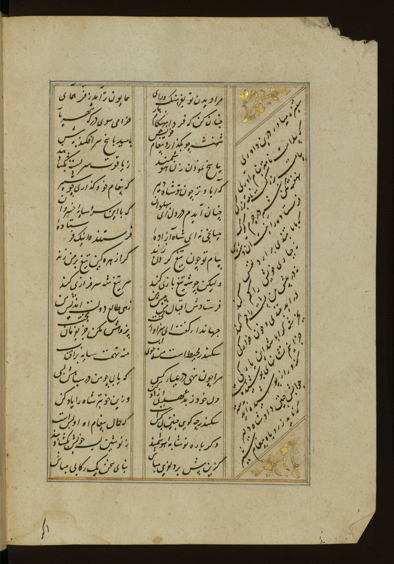 This copy of the Khamsah (quintet) of Niẓāmī Ganjavī (d. 605 AH / 1209 CE) was written by Abū Bakr Shāh ibn Ḥasan ibn ʿAlī al-Shahrastānī and illuminated by Jamāl al-Dīn ibn Muḥammad al-Ṣiddīqī al-Iṣfahānī between 892 AH / 1486 CE and 900 AH / 1494-5 CE. The manuscript opens with a double-page illuminated frontispiece with an inscription giving the title of the work and the name of the author (fols. 1b-2a). There are four illuminated titlepieces with the names of the individual poems and twenty-six repainted illustrations. According to evidence supplied by the colophons, the original binding was by the hand of Jamāl al-Dīn ibn Muḥammad al-Ṣiddīqī al-Iṣfahānī, as well. Unfortunately, it has not survived. The binding presently attached to the manuscript dates to the twelfth century AH / eighteenth CE.
