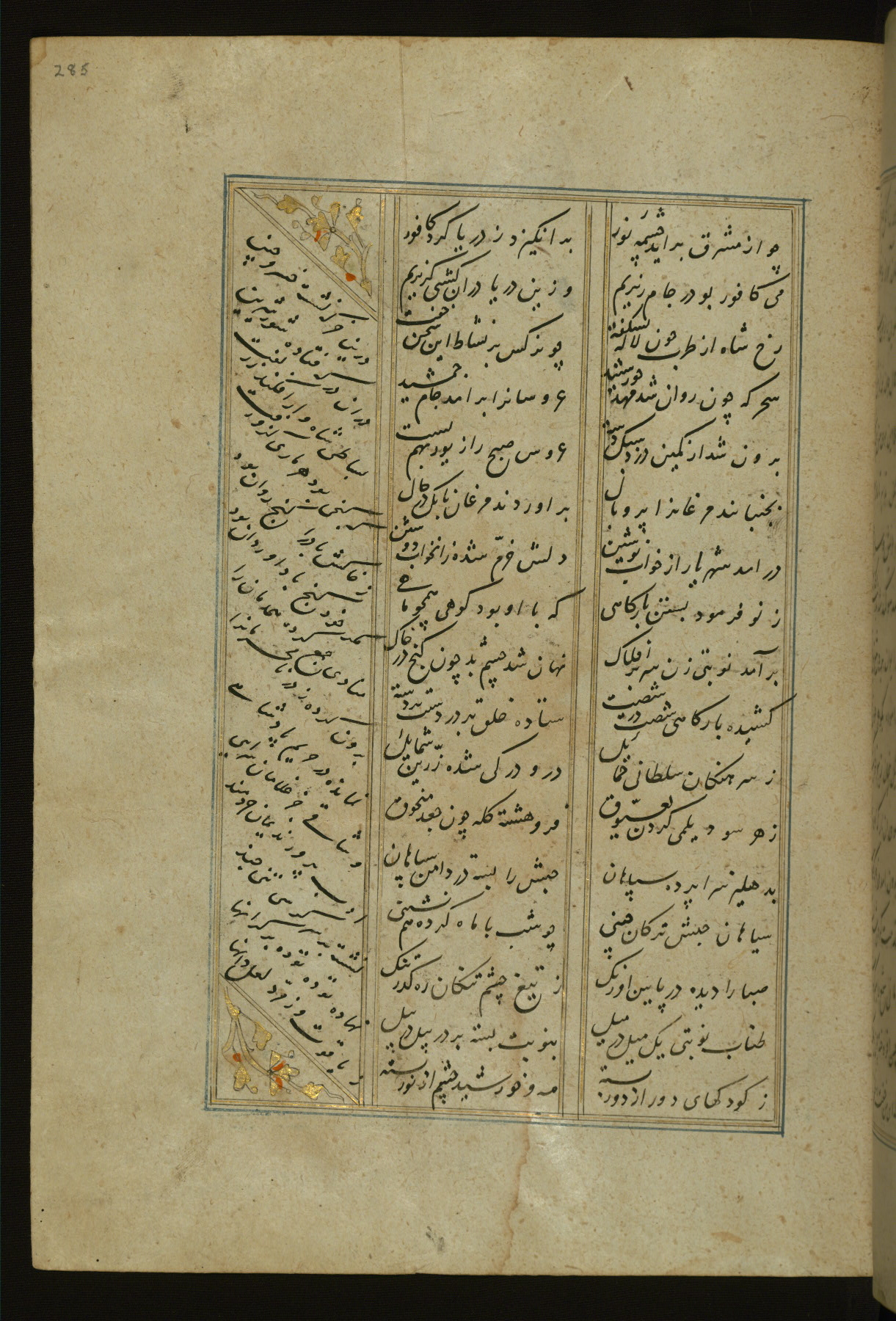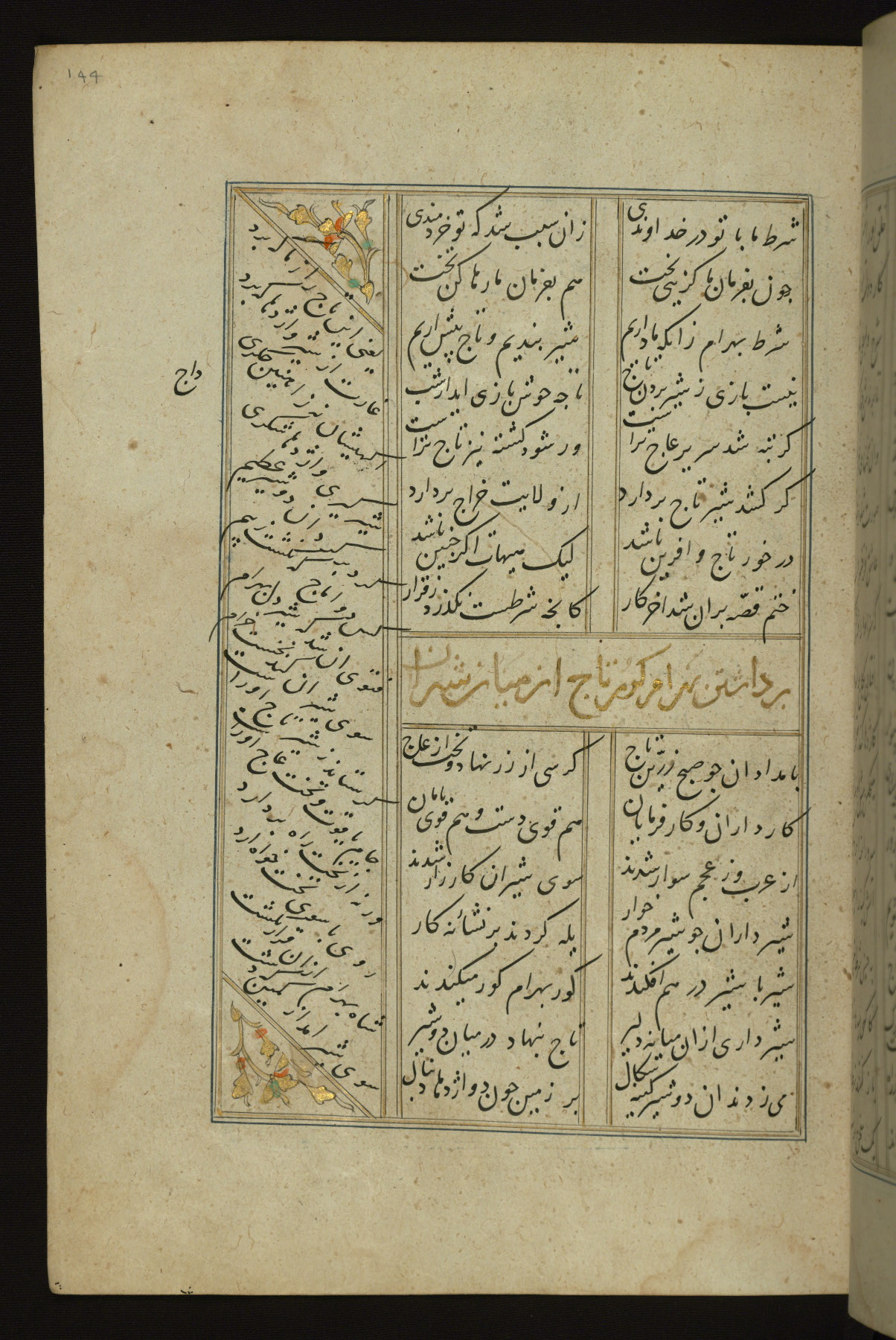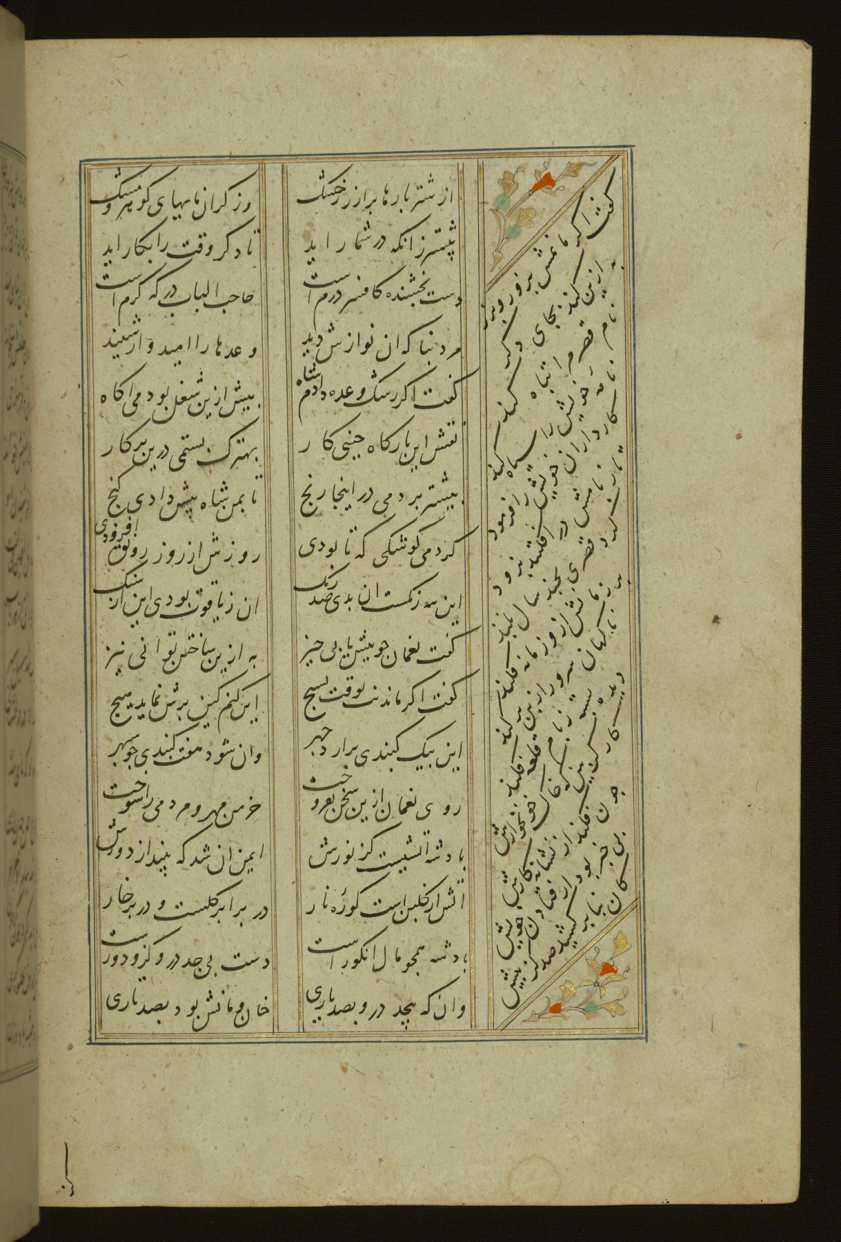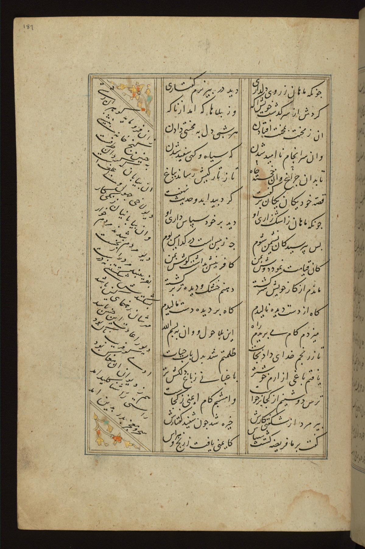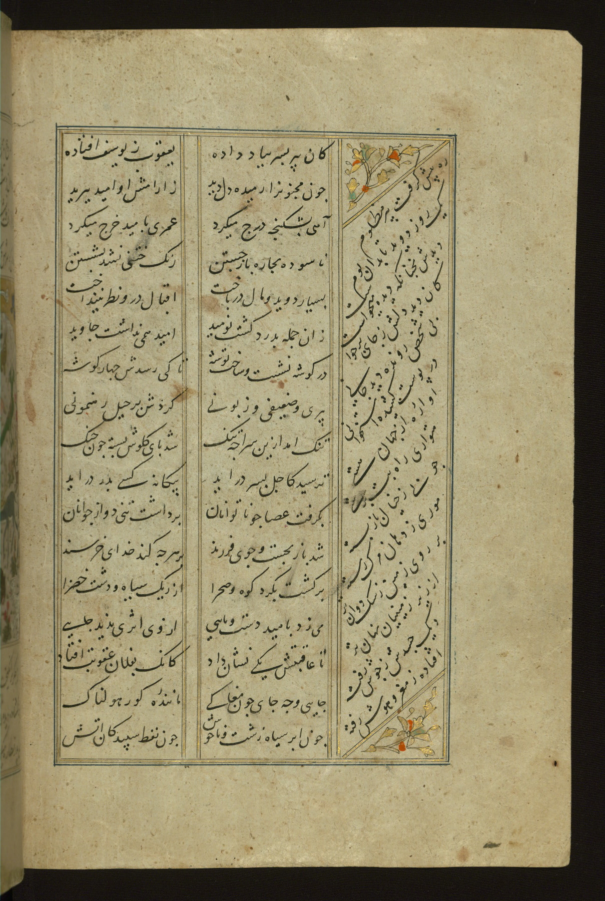 This copy of the Khamsah (quintet) of Niẓāmī Ganjavī (d. 605 AH / 1209 CE) was written by Abū Bakr Shāh ibn Ḥasan ibn ʿAlī al-Shahrastānī and illuminated by Jamāl al-Dīn ibn Muḥammad al-Ṣiddīqī al-Iṣfahānī between 892 AH / 1486 CE and 900 AH / 1494-5 CE. The manuscript opens with a double-page illuminated frontispiece with an inscription giving the title of the work and the name of the author (fols. 1b-2a). There are four illuminated titlepieces with the names of the individual poems and twenty-six repainted illustrations. According to evidence supplied by the colophons, the original binding was by the hand of Jamāl al-Dīn ibn Muḥammad al-Ṣiddīqī al-Iṣfahānī, as well. Unfortunately, it has not survived. The binding presently attached to the manuscript dates to the twelfth century AH / eighteenth CE.