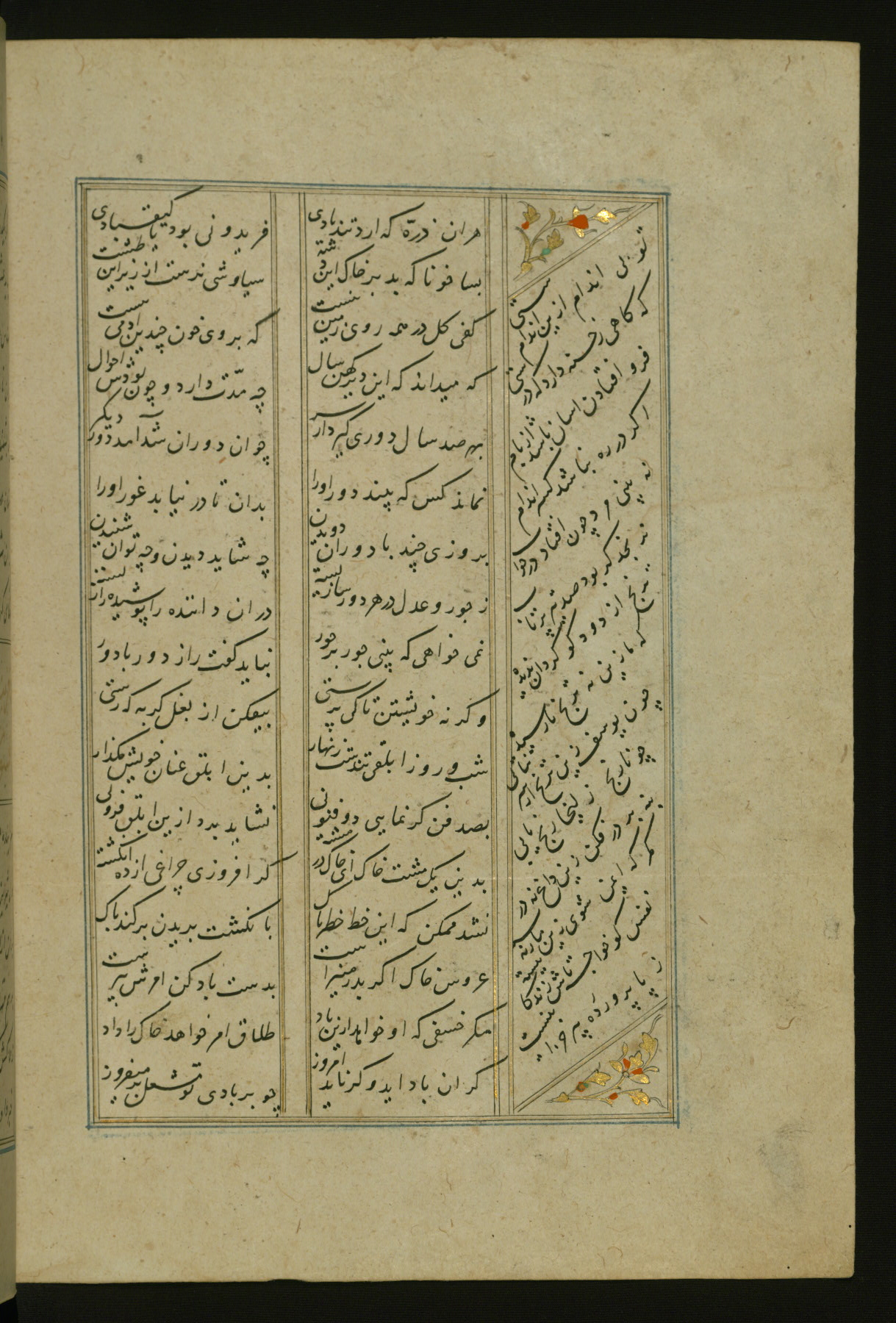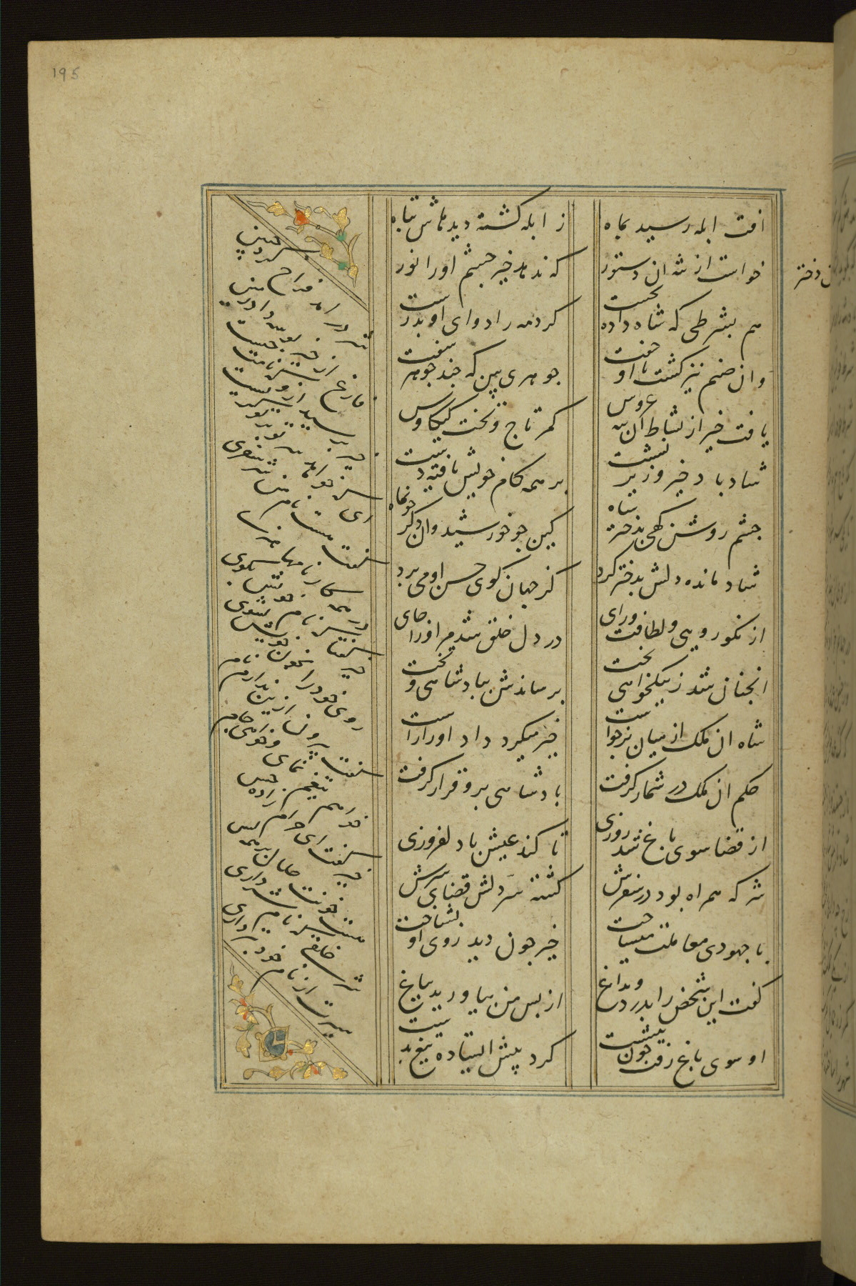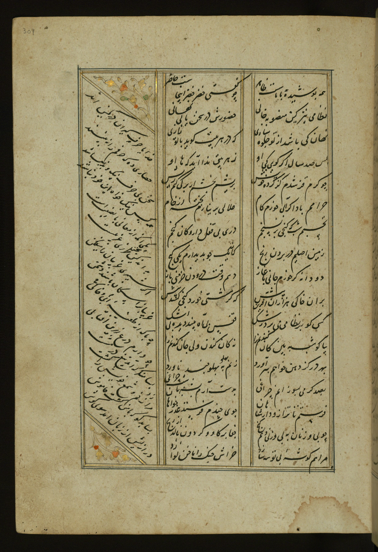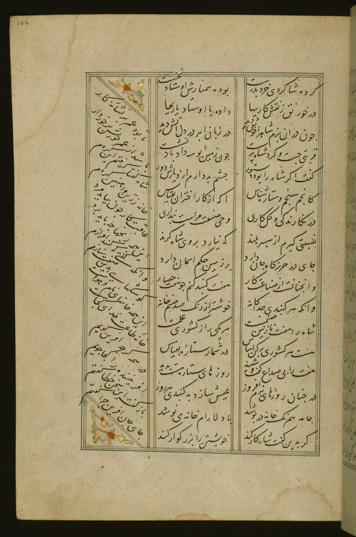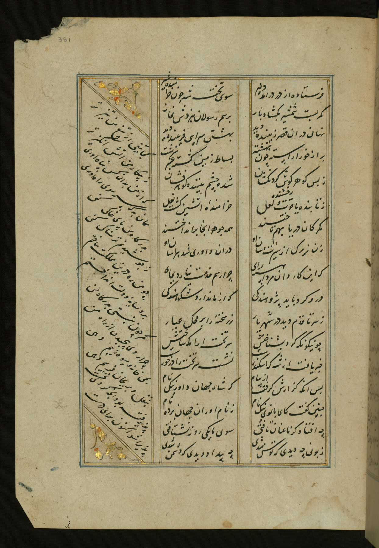 This copy of the Khamsah (quintet) of Niẓāmī Ganjavī (d. 605 AH / 1209 CE) was written by Abū Bakr Shāh ibn Ḥasan ibn ʿAlī al-Shahrastānī and illuminated by Jamāl al-Dīn ibn Muḥammad al-Ṣiddīqī al-Iṣfahānī between 892 AH / 1486 CE and 900 AH / 1494-5 CE. The manuscript opens with a double-page illuminated frontispiece with an inscription giving the title of the work and the name of the author (fols. 1b-2a). There are four illuminated titlepieces with the names of the individual poems and twenty-six repainted illustrations. According to evidence supplied by the colophons, the original binding was by the hand of Jamāl al-Dīn ibn Muḥammad al-Ṣiddīqī al-Iṣfahānī, as well. Unfortunately, it has not survived. The binding presently attached to the manuscript dates to the twelfth century AH / eighteenth CE.
