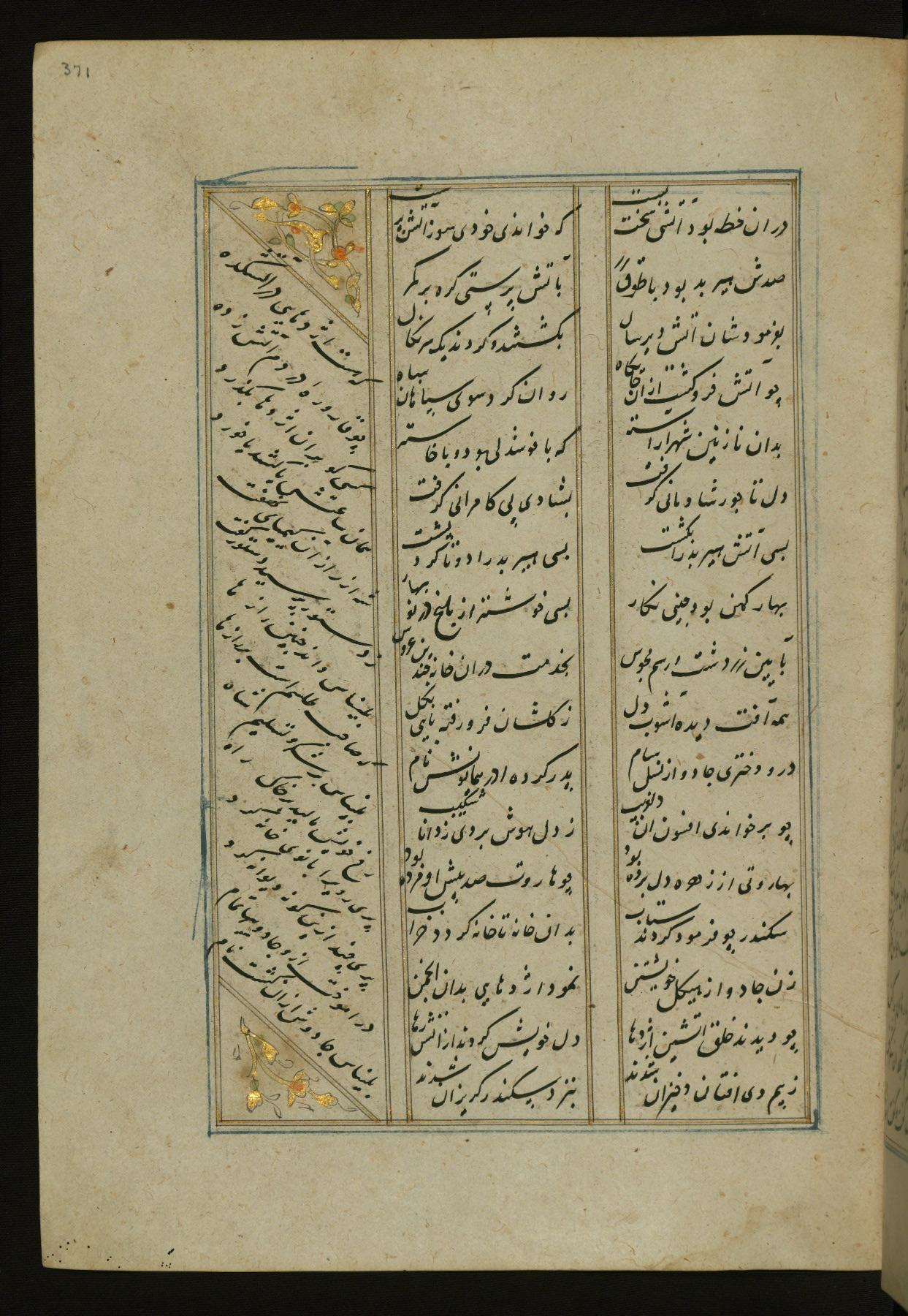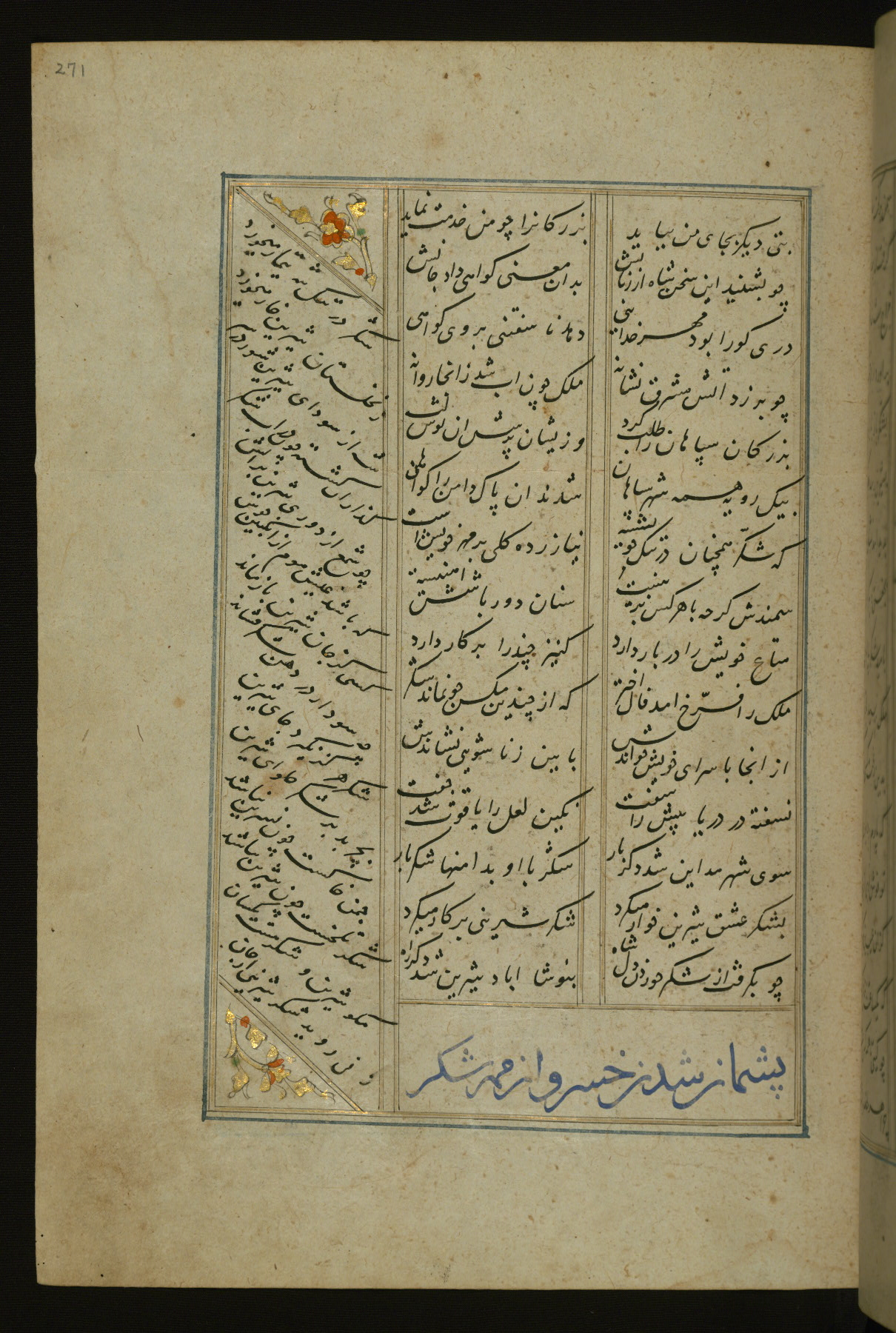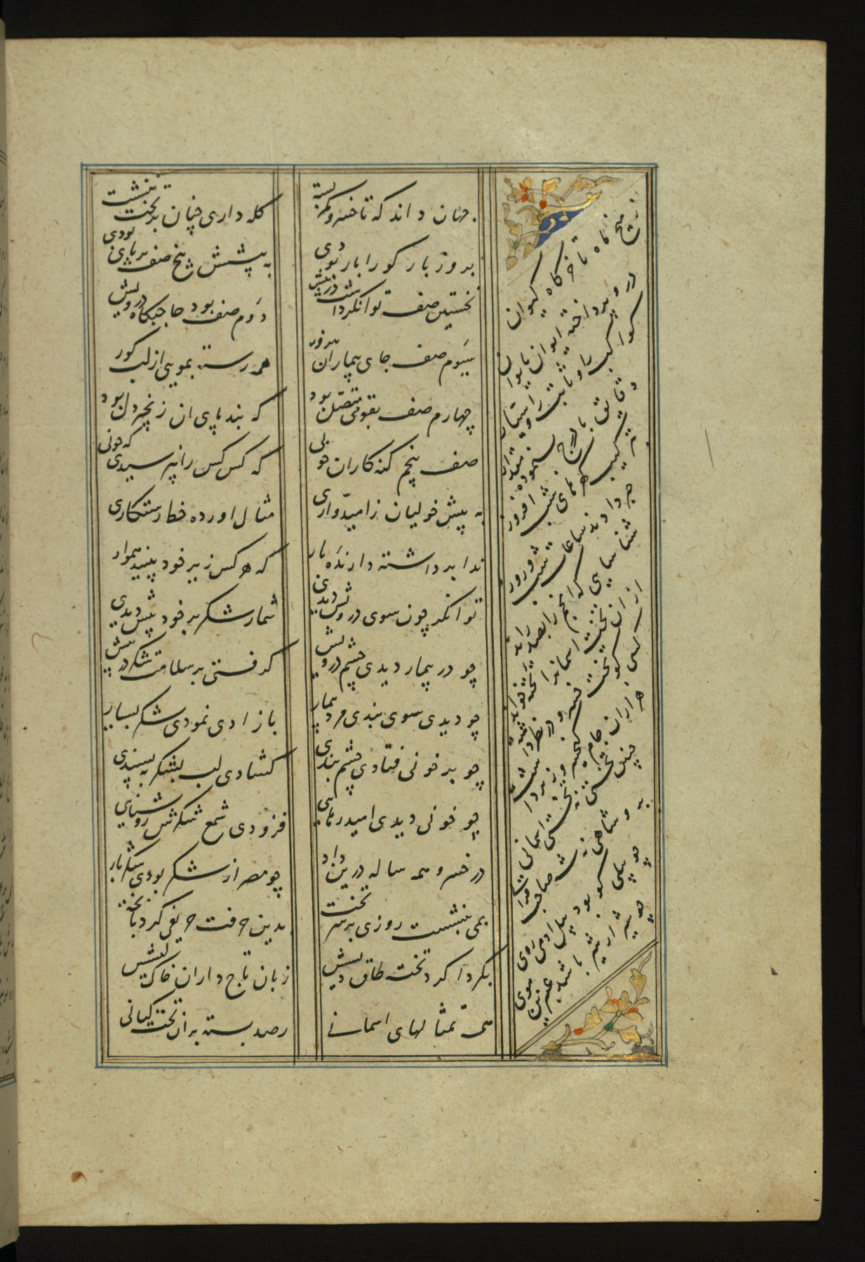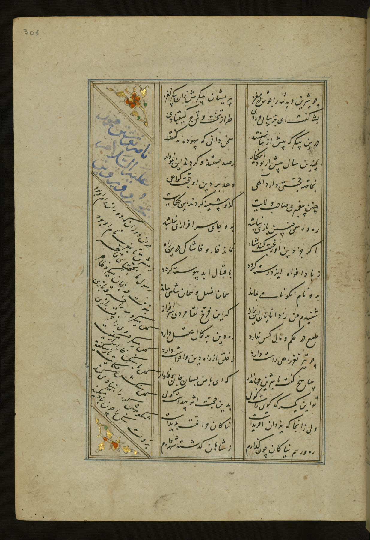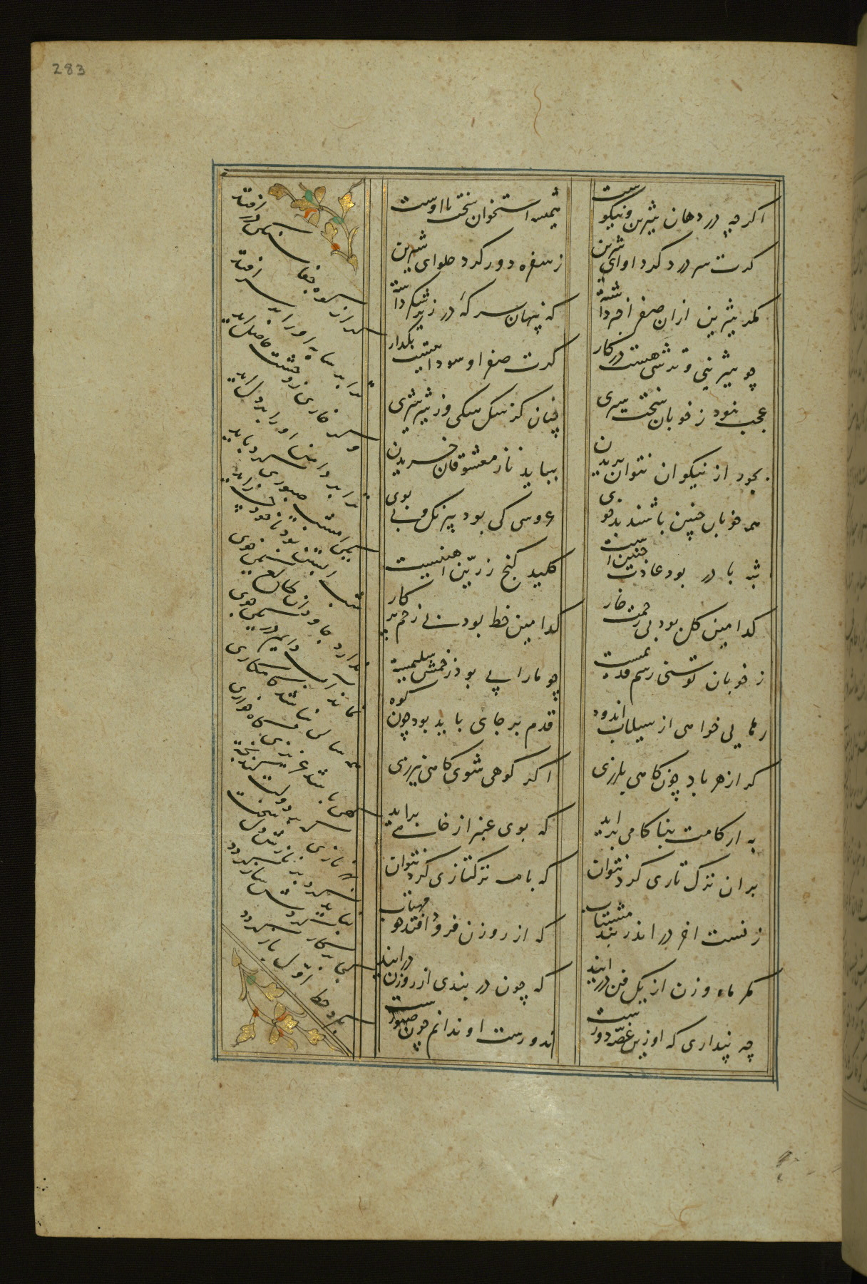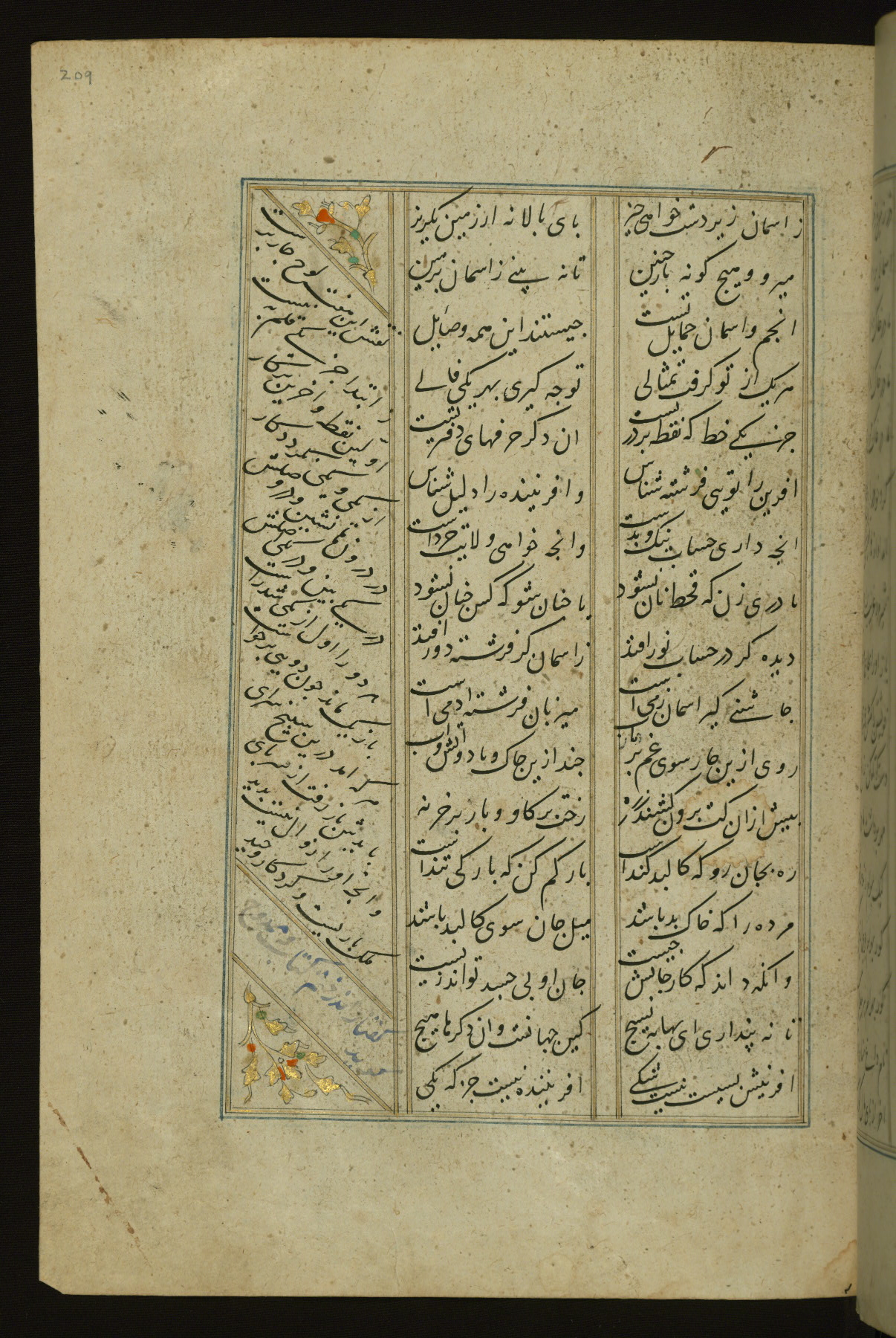 This copy of the Khamsah (quintet) of Niẓāmī Ganjavī (d. 605 AH / 1209 CE) was written by Abū Bakr Shāh ibn Ḥasan ibn ʿAlī al-Shahrastānī and illuminated by Jamāl al-Dīn ibn Muḥammad al-Ṣiddīqī al-Iṣfahānī between 892 AH / 1486 CE and 900 AH / 1494-5 CE. The manuscript opens with a double-page illuminated frontispiece with an inscription giving the title of the work and the name of the author (fols. 1b-2a). There are four illuminated titlepieces with the names of the individual poems and twenty-six repainted illustrations. According to evidence supplied by the colophons, the original binding was by the hand of Jamāl al-Dīn ibn Muḥammad al-Ṣiddīqī al-Iṣfahānī, as well. Unfortunately, it has not survived. The binding presently attached to the manuscript dates to the twelfth century AH / eighteenth CE.