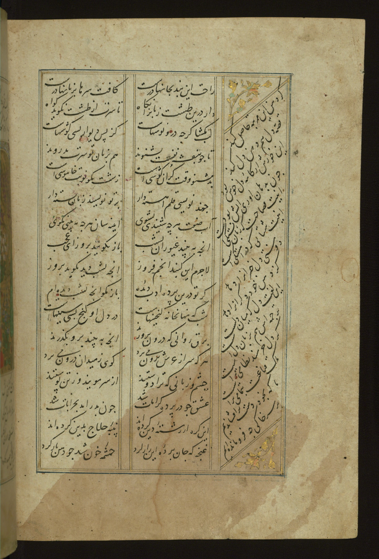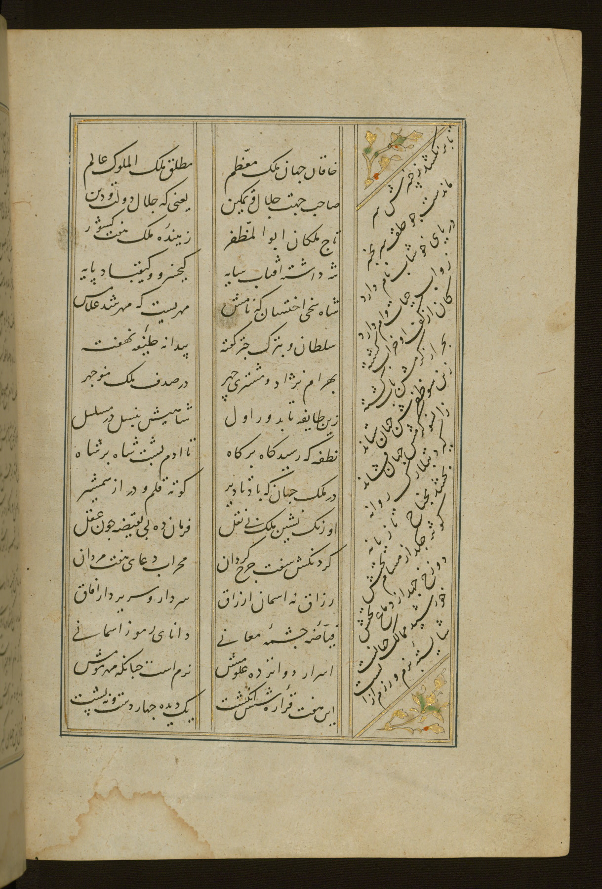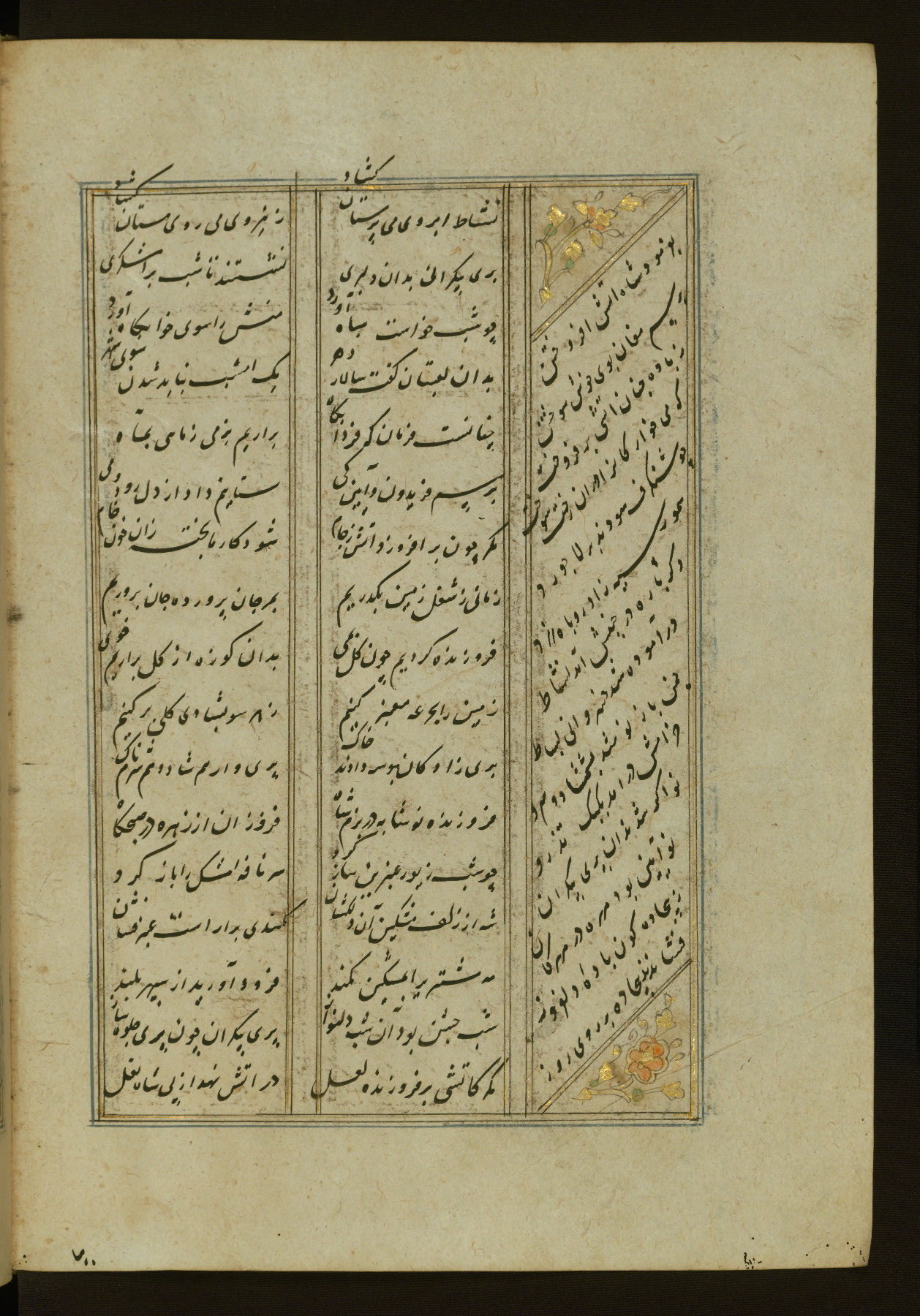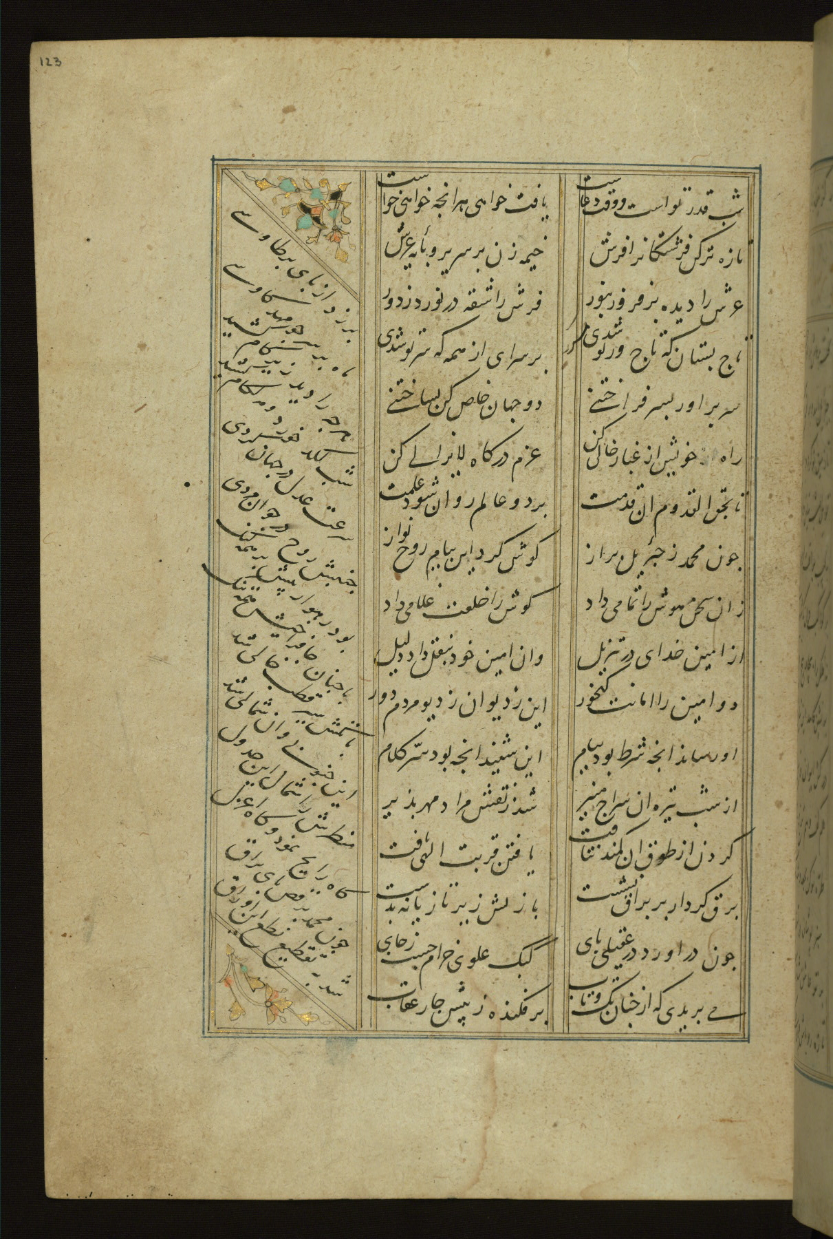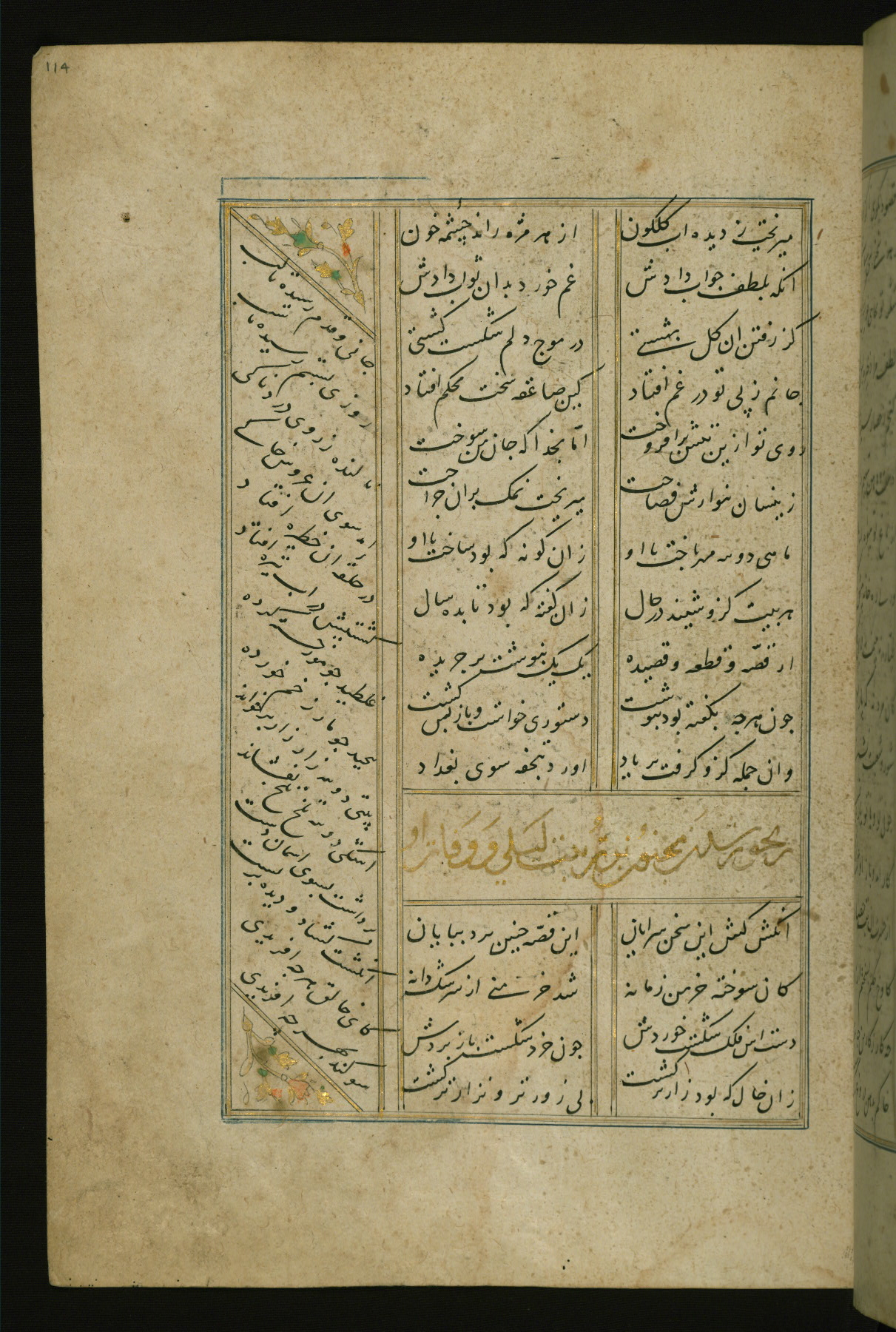 This copy of the Khamsah (quintet) of Niẓāmī Ganjavī (d. 605 AH / 1209 CE) was written by Abū Bakr Shāh ibn Ḥasan ibn ʿAlī al-Shahrastānī and illuminated by Jamāl al-Dīn ibn Muḥammad al-Ṣiddīqī al-Iṣfahānī between 892 AH / 1486 CE and 900 AH / 1494-5 CE. The manuscript opens with a double-page illuminated frontispiece with an inscription giving the title of the work and the name of the author (fols. 1b-2a). There are four illuminated titlepieces with the names of the individual poems and twenty-six repainted illustrations. According to evidence supplied by the colophons, the original binding was by the hand of Jamāl al-Dīn ibn Muḥammad al-Ṣiddīqī al-Iṣfahānī, as well. Unfortunately, it has not survived. The binding presently attached to the manuscript dates to the twelfth century AH / eighteenth CE.