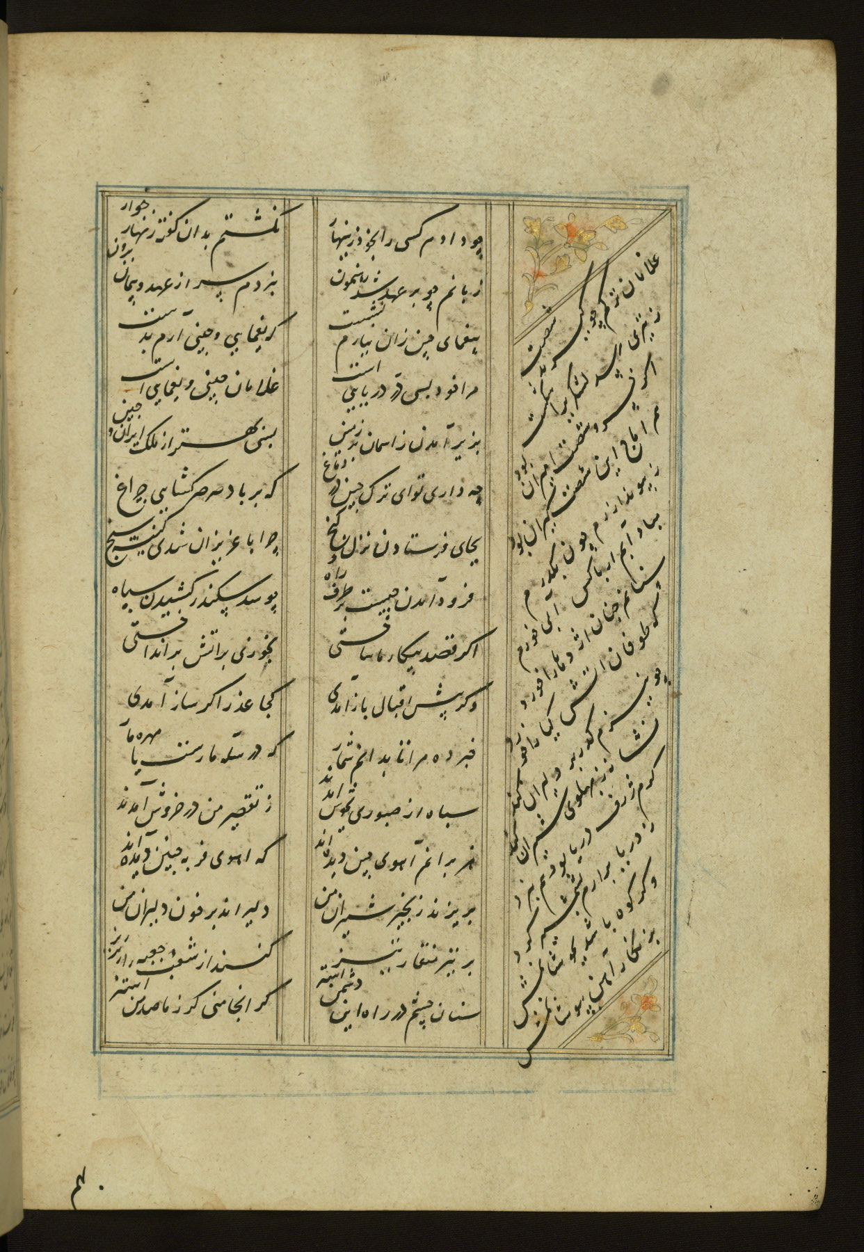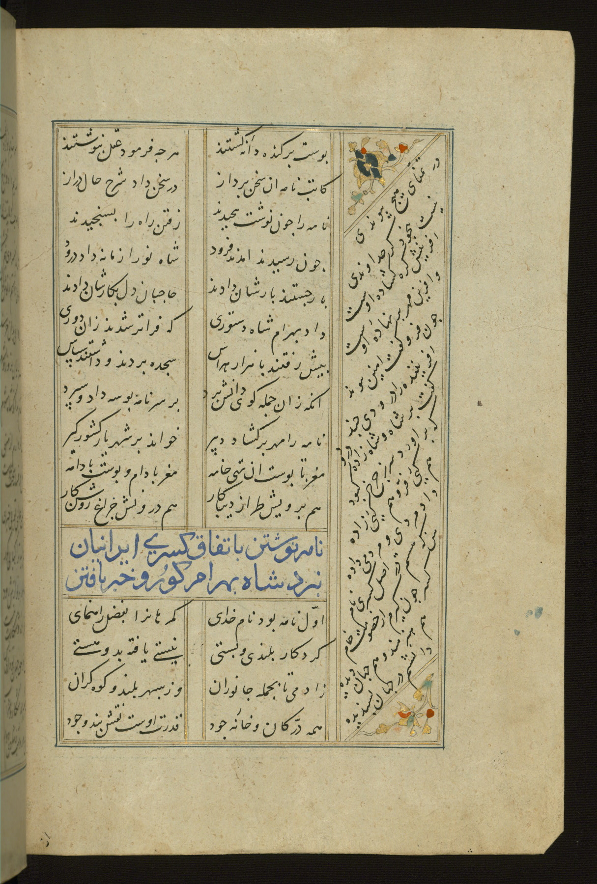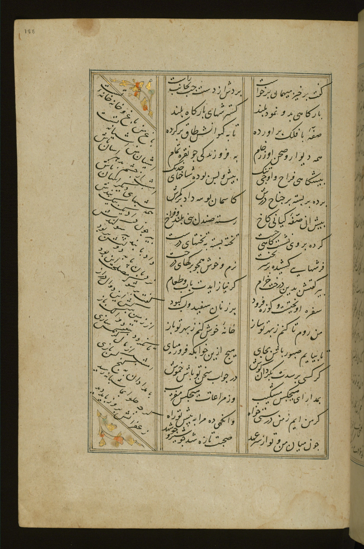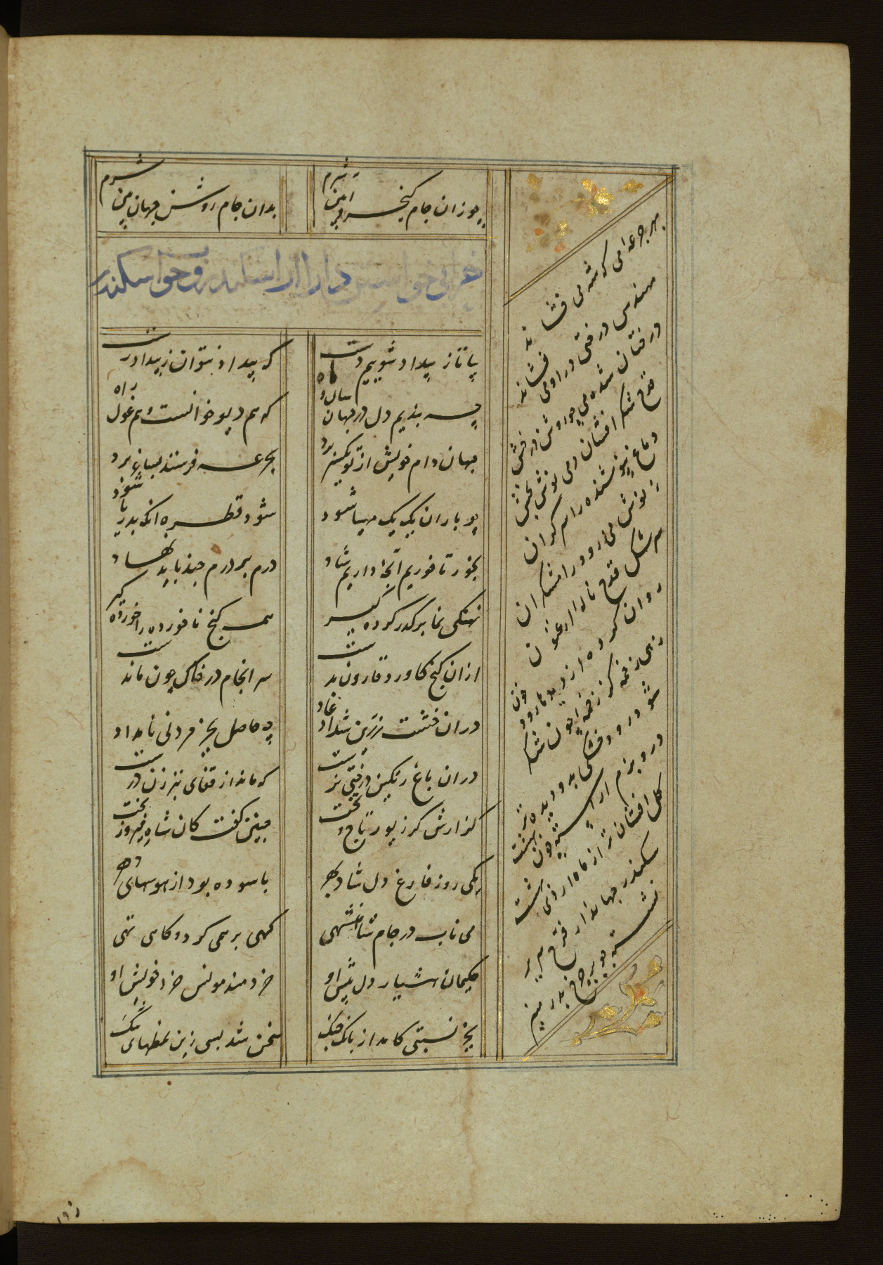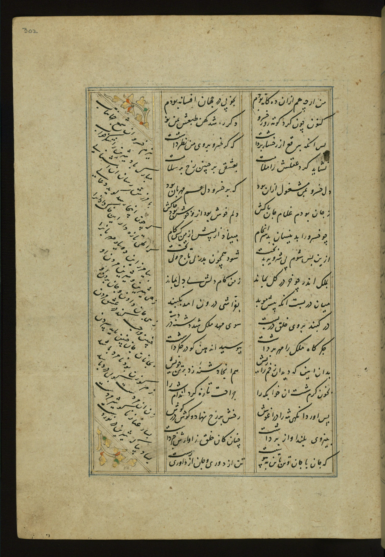 This copy of the Khamsah (quintet) of Niẓāmī Ganjavī (d. 605 AH / 1209 CE) was written by Abū Bakr Shāh ibn Ḥasan ibn ʿAlī al-Shahrastānī and illuminated by Jamāl al-Dīn ibn Muḥammad al-Ṣiddīqī al-Iṣfahānī between 892 AH / 1486 CE and 900 AH / 1494-5 CE. The manuscript opens with a double-page illuminated frontispiece with an inscription giving the title of the work and the name of the author (fols. 1b-2a). There are four illuminated titlepieces with the names of the individual poems and twenty-six repainted illustrations. According to evidence supplied by the colophons, the original binding was by the hand of Jamāl al-Dīn ibn Muḥammad al-Ṣiddīqī al-Iṣfahānī, as well. Unfortunately, it has not survived. The binding presently attached to the manuscript dates to the twelfth century AH / eighteenth CE.