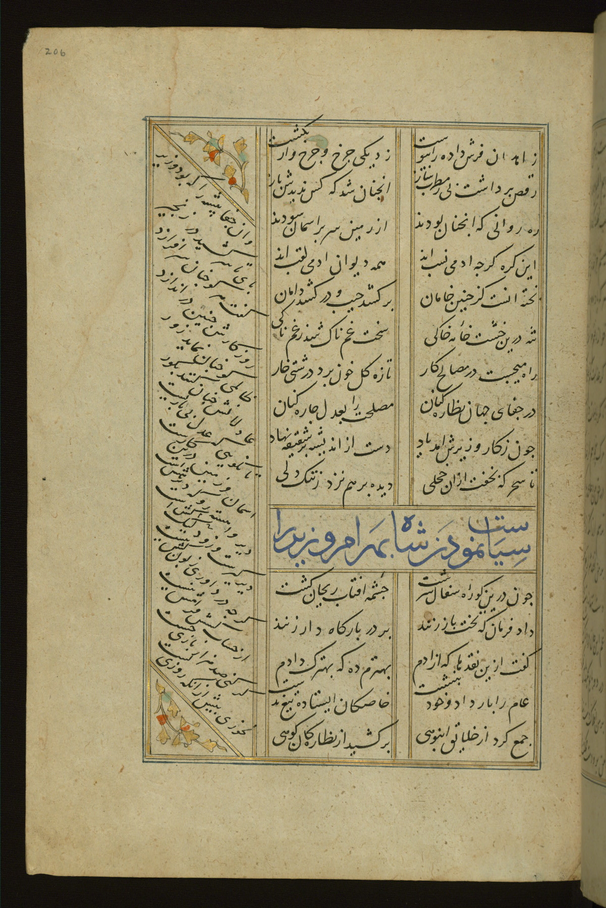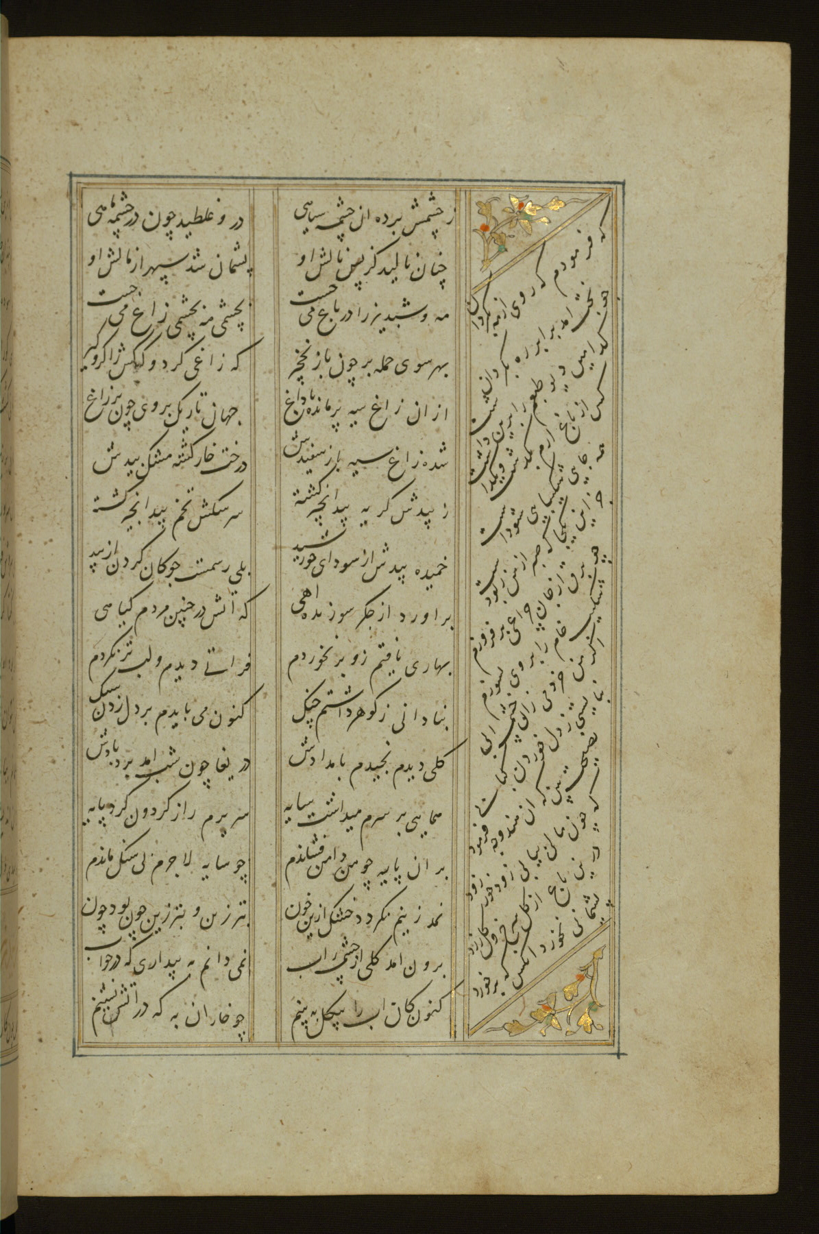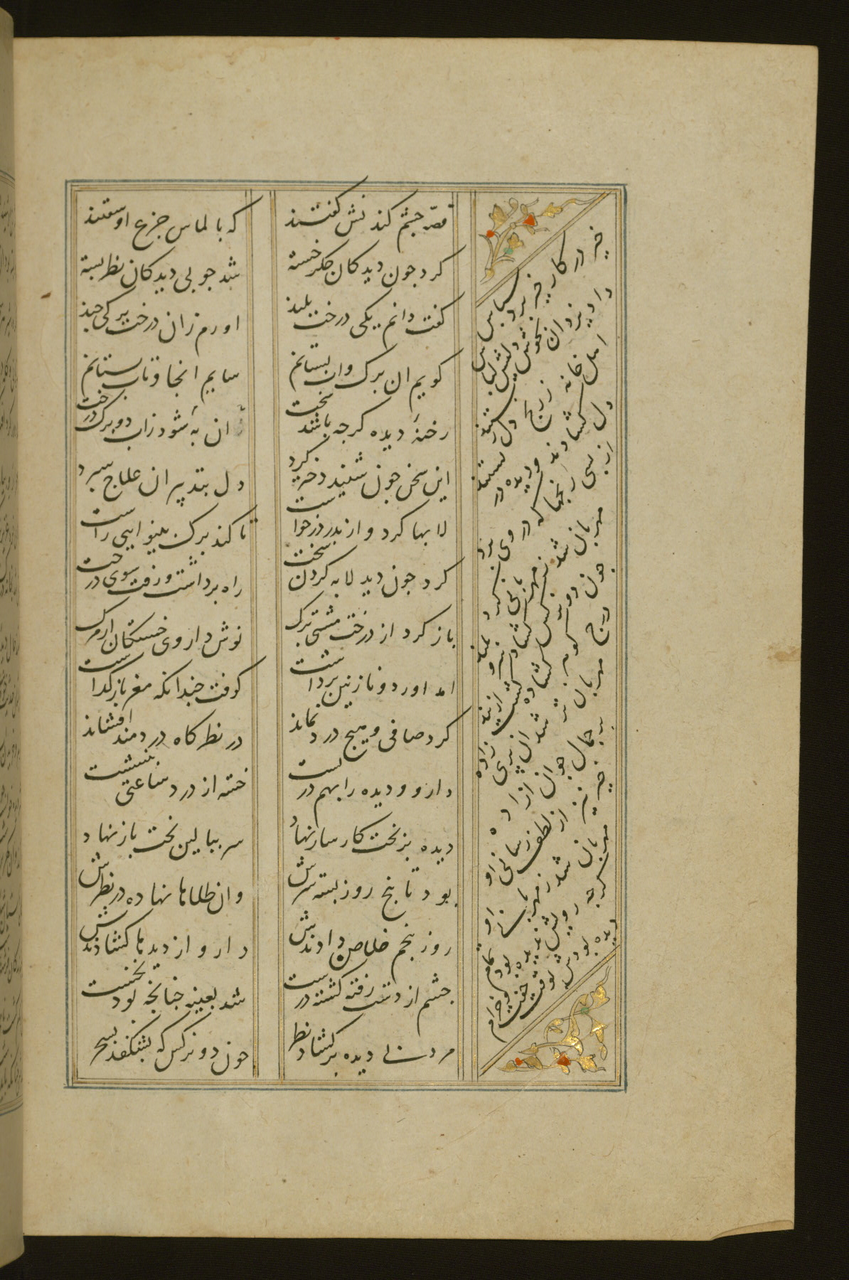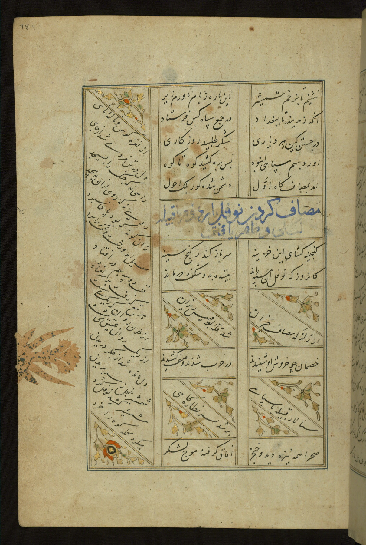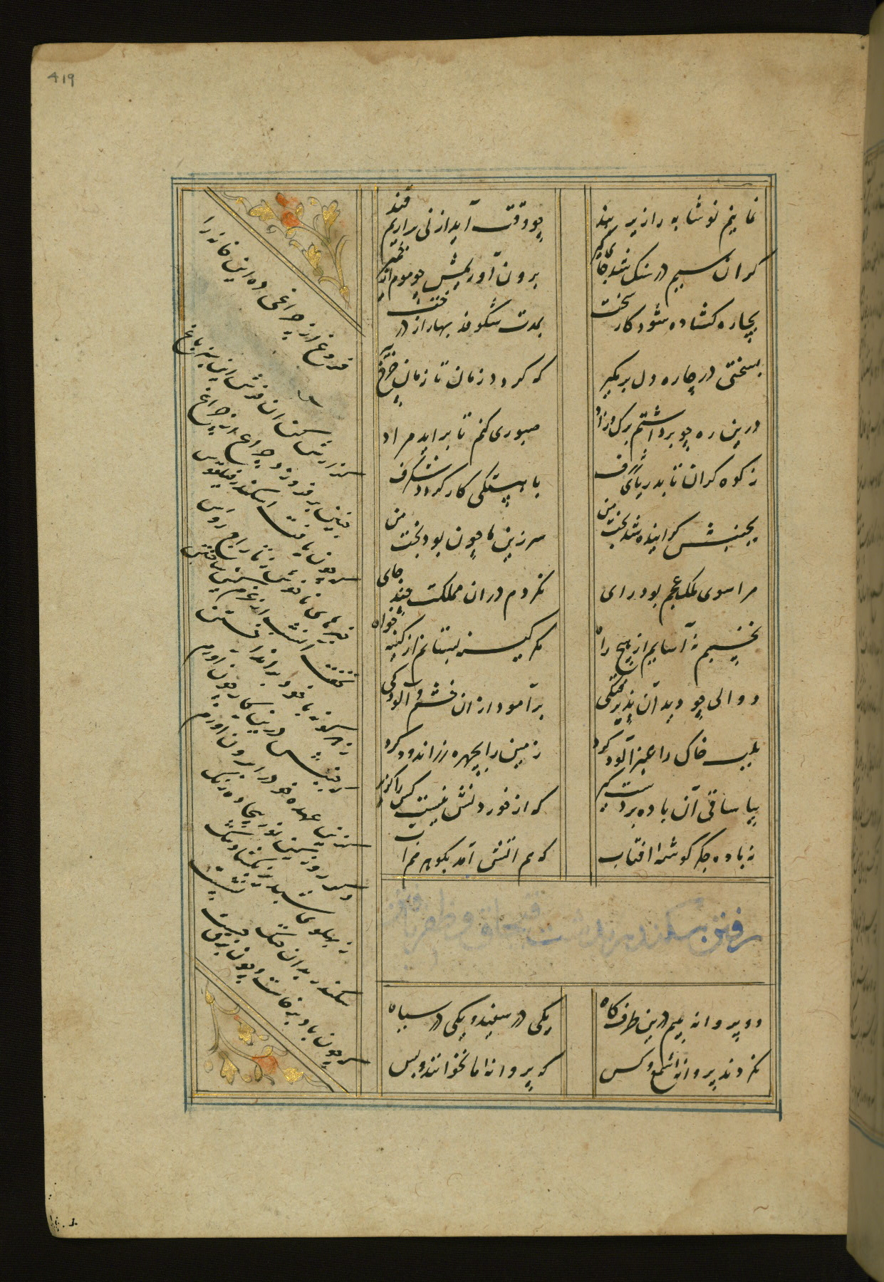 This copy of the Khamsah (quintet) of Niẓāmī Ganjavī (d. 605 AH / 1209 CE) was written by Abū Bakr Shāh ibn Ḥasan ibn ʿAlī al-Shahrastānī and illuminated by Jamāl al-Dīn ibn Muḥammad al-Ṣiddīqī al-Iṣfahānī between 892 AH / 1486 CE and 900 AH / 1494-5 CE. The manuscript opens with a double-page illuminated frontispiece with an inscription giving the title of the work and the name of the author (fols. 1b-2a). There are four illuminated titlepieces with the names of the individual poems and twenty-six repainted illustrations. According to evidence supplied by the colophons, the original binding was by the hand of Jamāl al-Dīn ibn Muḥammad al-Ṣiddīqī al-Iṣfahānī, as well. Unfortunately, it has not survived. The binding presently attached to the manuscript dates to the twelfth century AH / eighteenth CE.