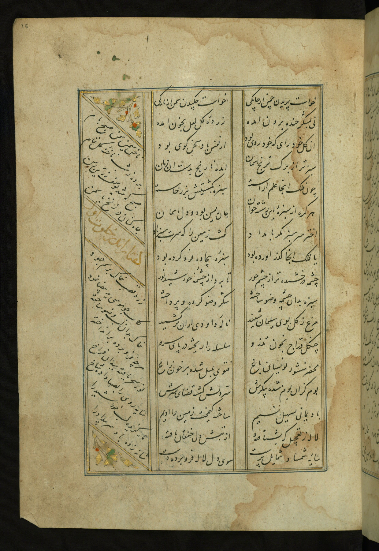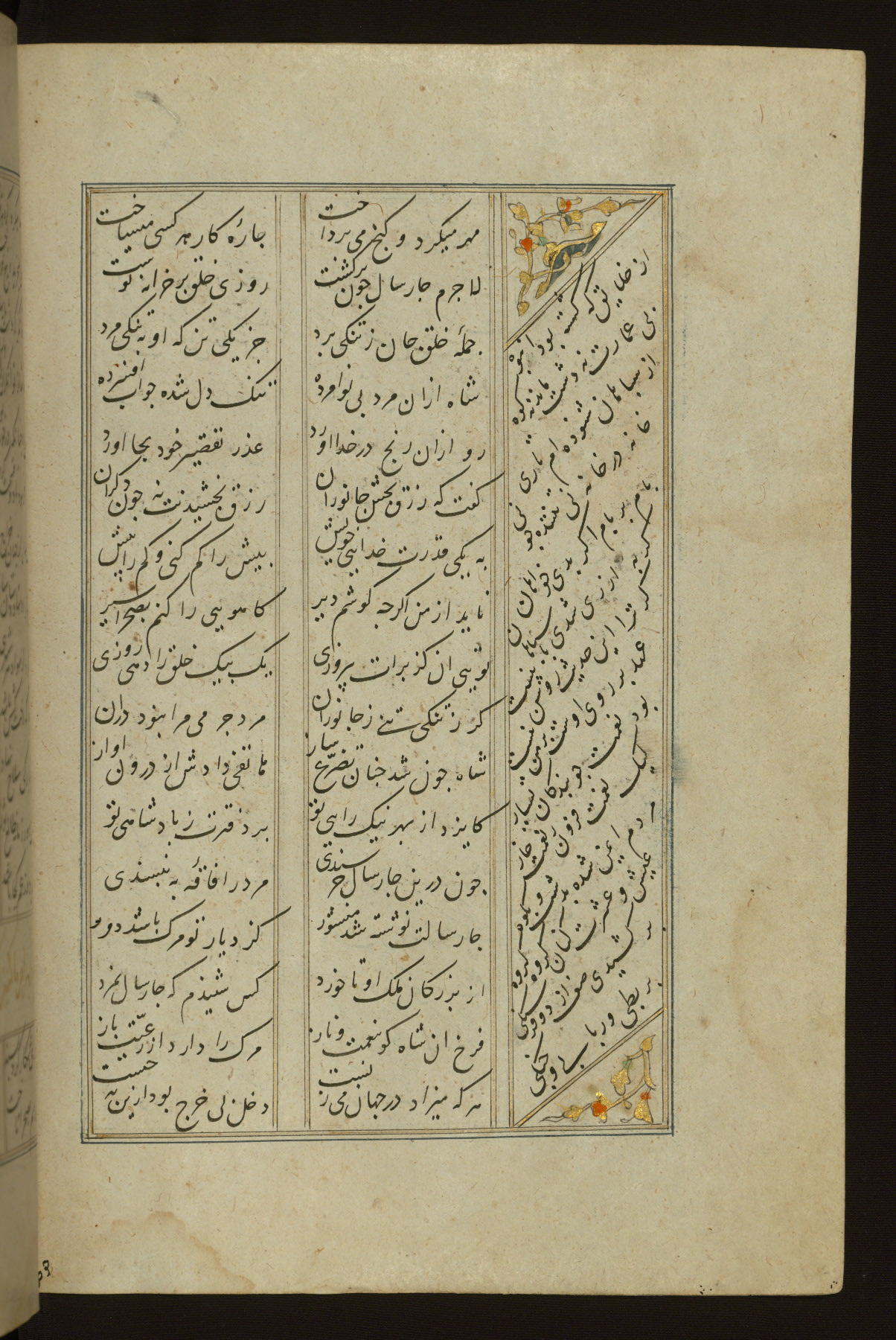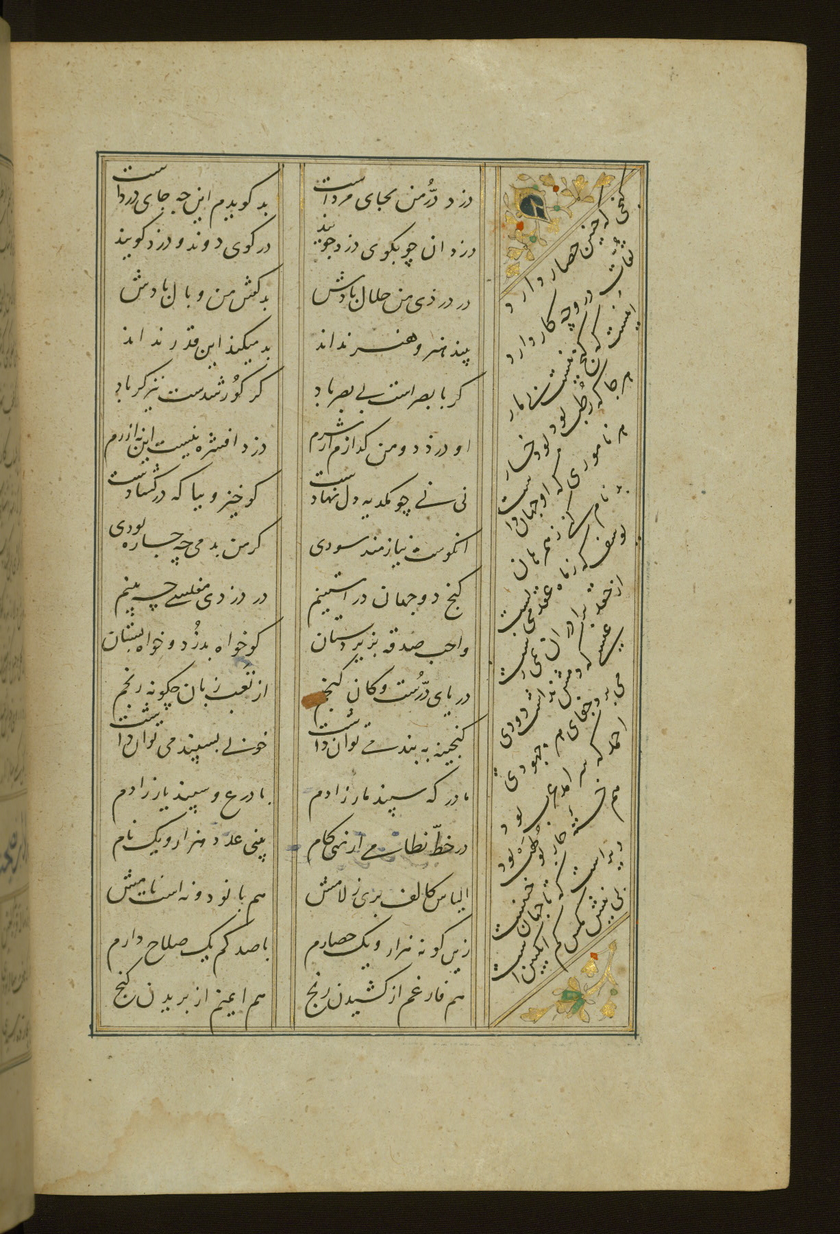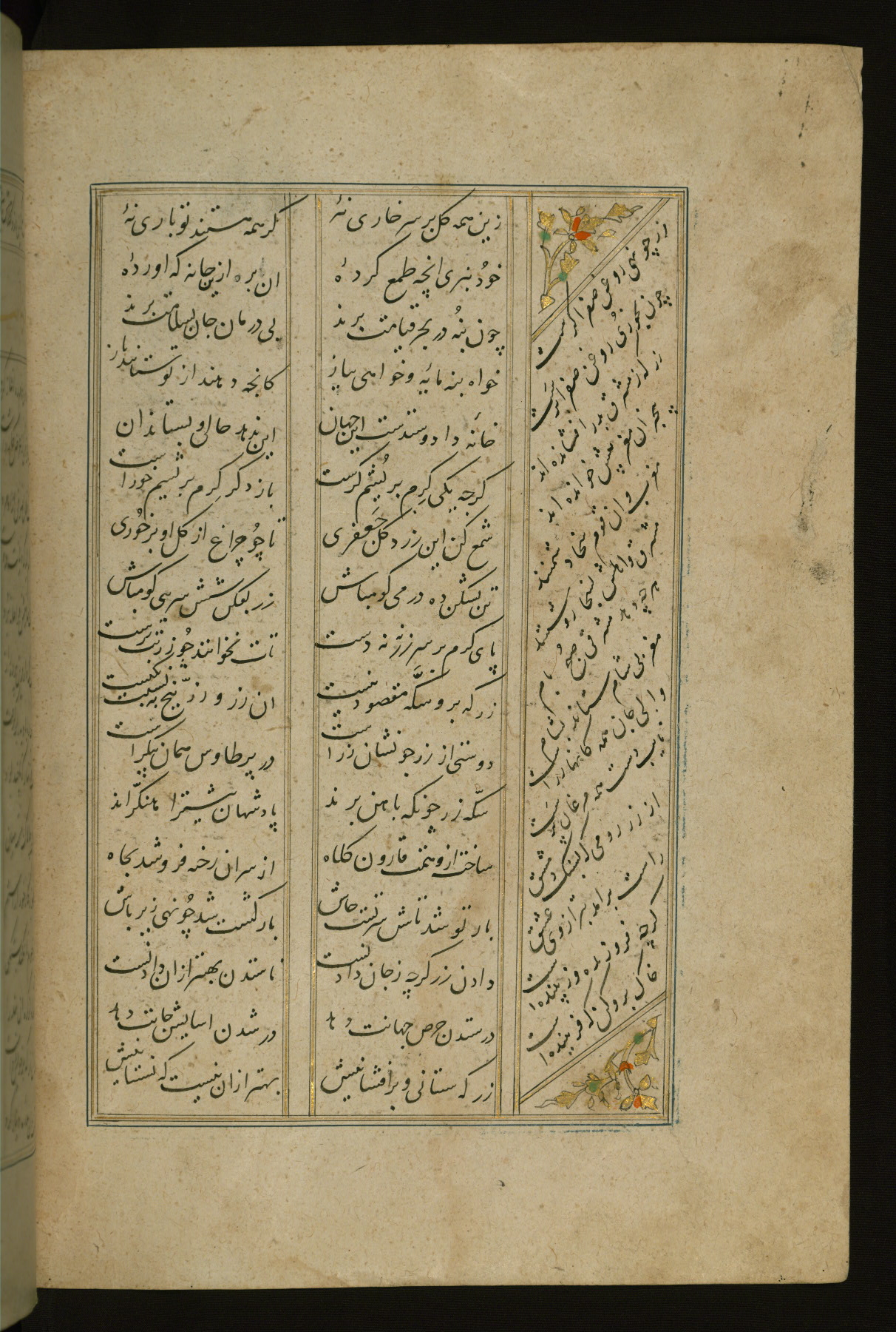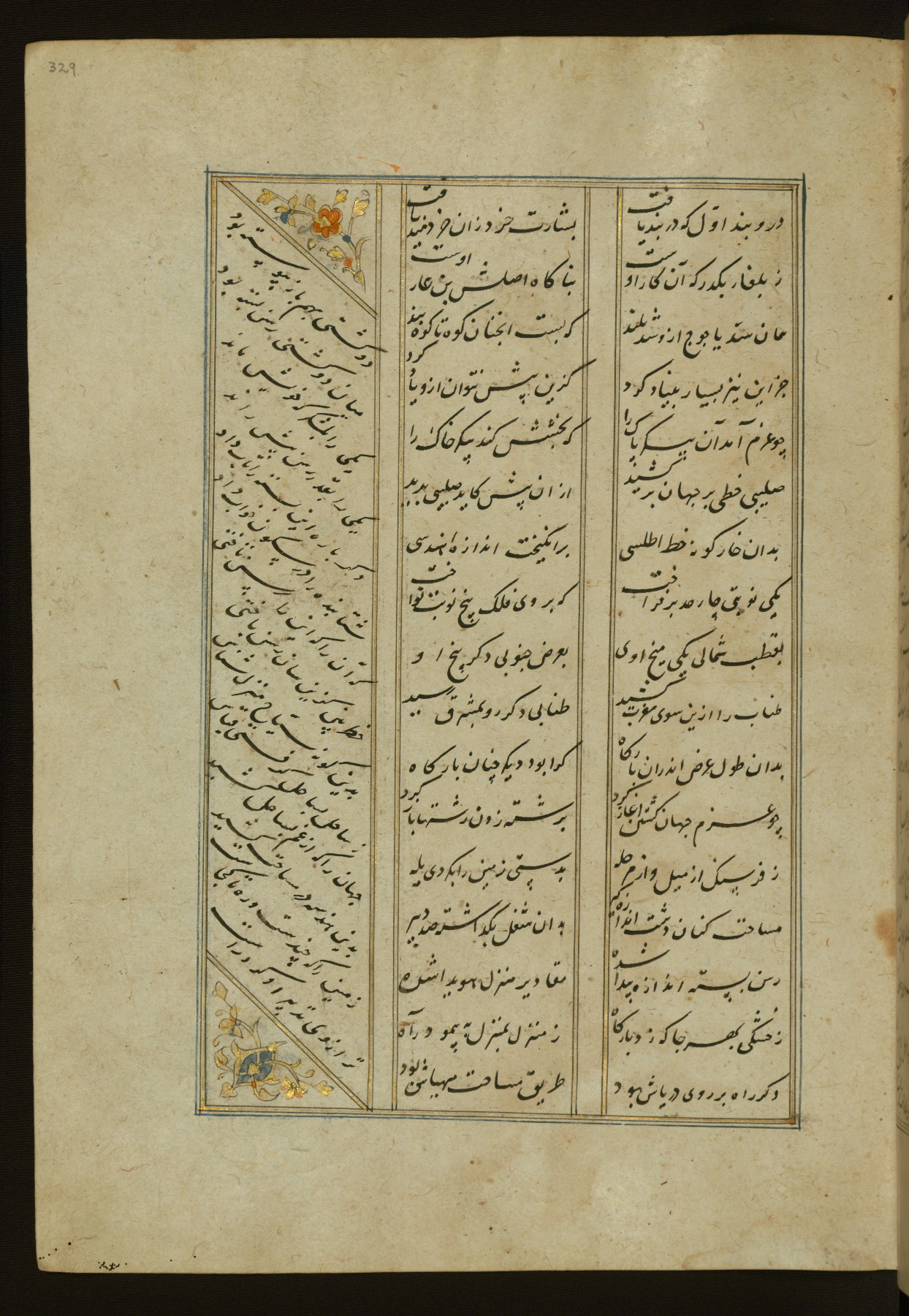 This copy of the Khamsah (quintet) of Niẓāmī Ganjavī (d. 605 AH / 1209 CE) was written by Abū Bakr Shāh ibn Ḥasan ibn ʿAlī al-Shahrastānī and illuminated by Jamāl al-Dīn ibn Muḥammad al-Ṣiddīqī al-Iṣfahānī between 892 AH / 1486 CE and 900 AH / 1494-5 CE. The manuscript opens with a double-page illuminated frontispiece with an inscription giving the title of the work and the name of the author (fols. 1b-2a). There are four illuminated titlepieces with the names of the individual poems and twenty-six repainted illustrations. According to evidence supplied by the colophons, the original binding was by the hand of Jamāl al-Dīn ibn Muḥammad al-Ṣiddīqī al-Iṣfahānī, as well. Unfortunately, it has not survived. The binding presently attached to the manuscript dates to the twelfth century AH / eighteenth CE.
