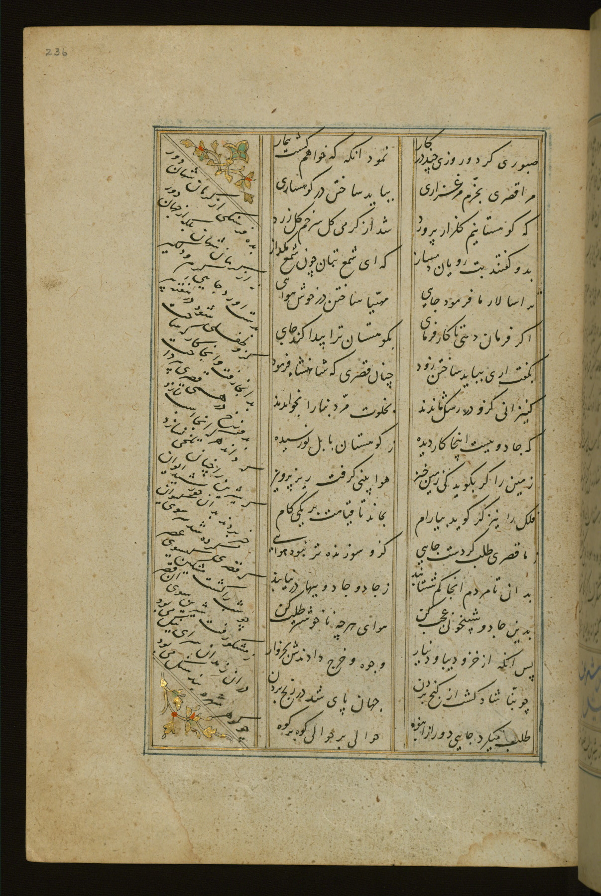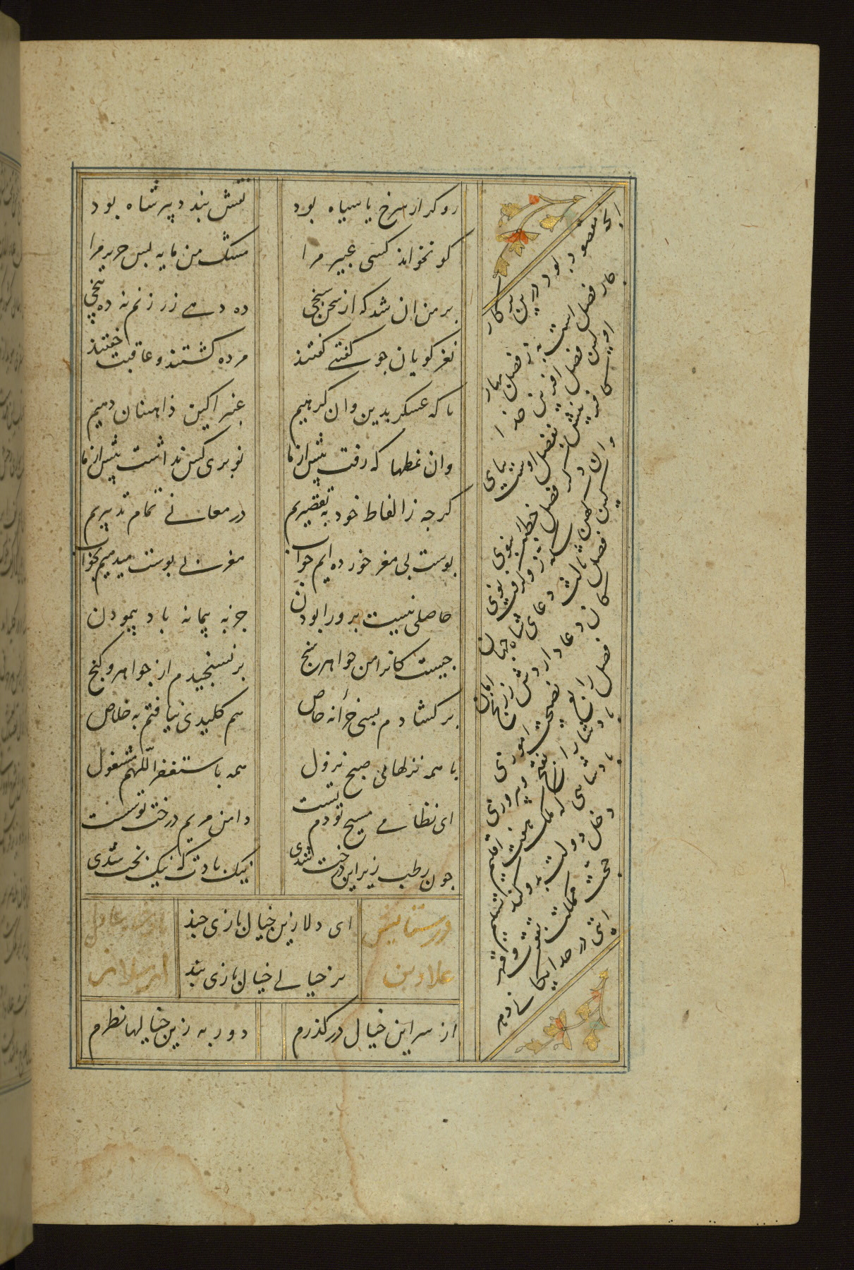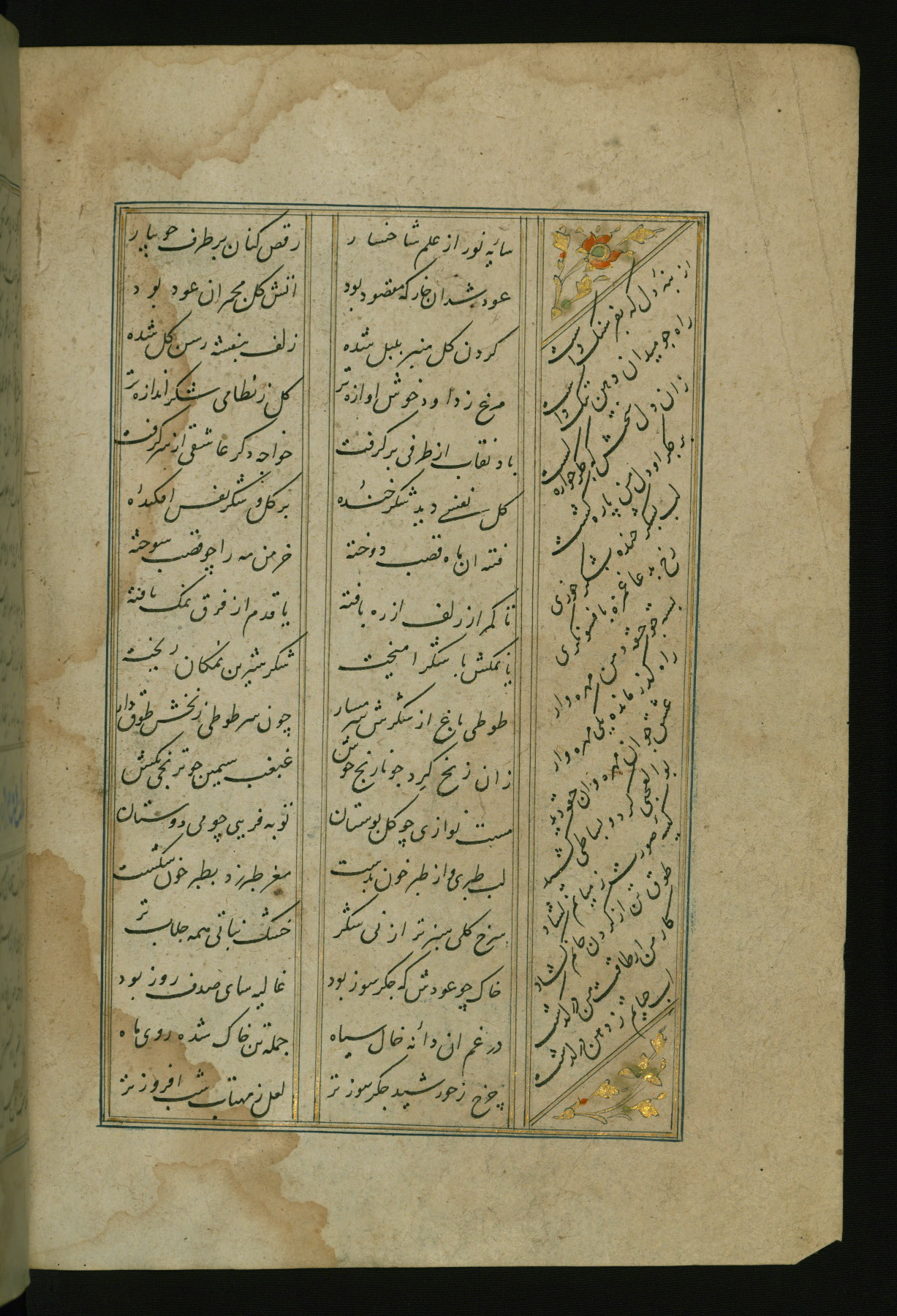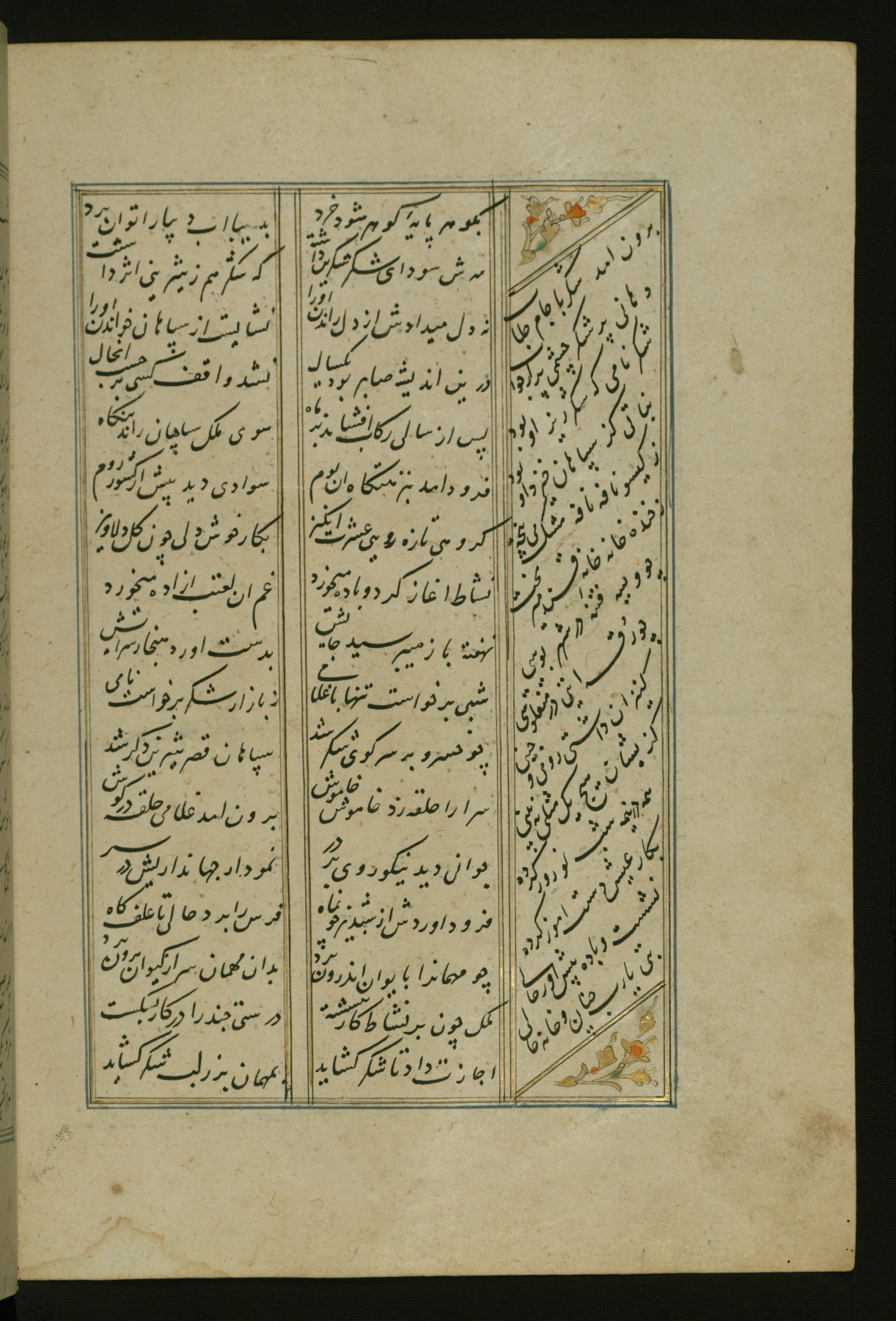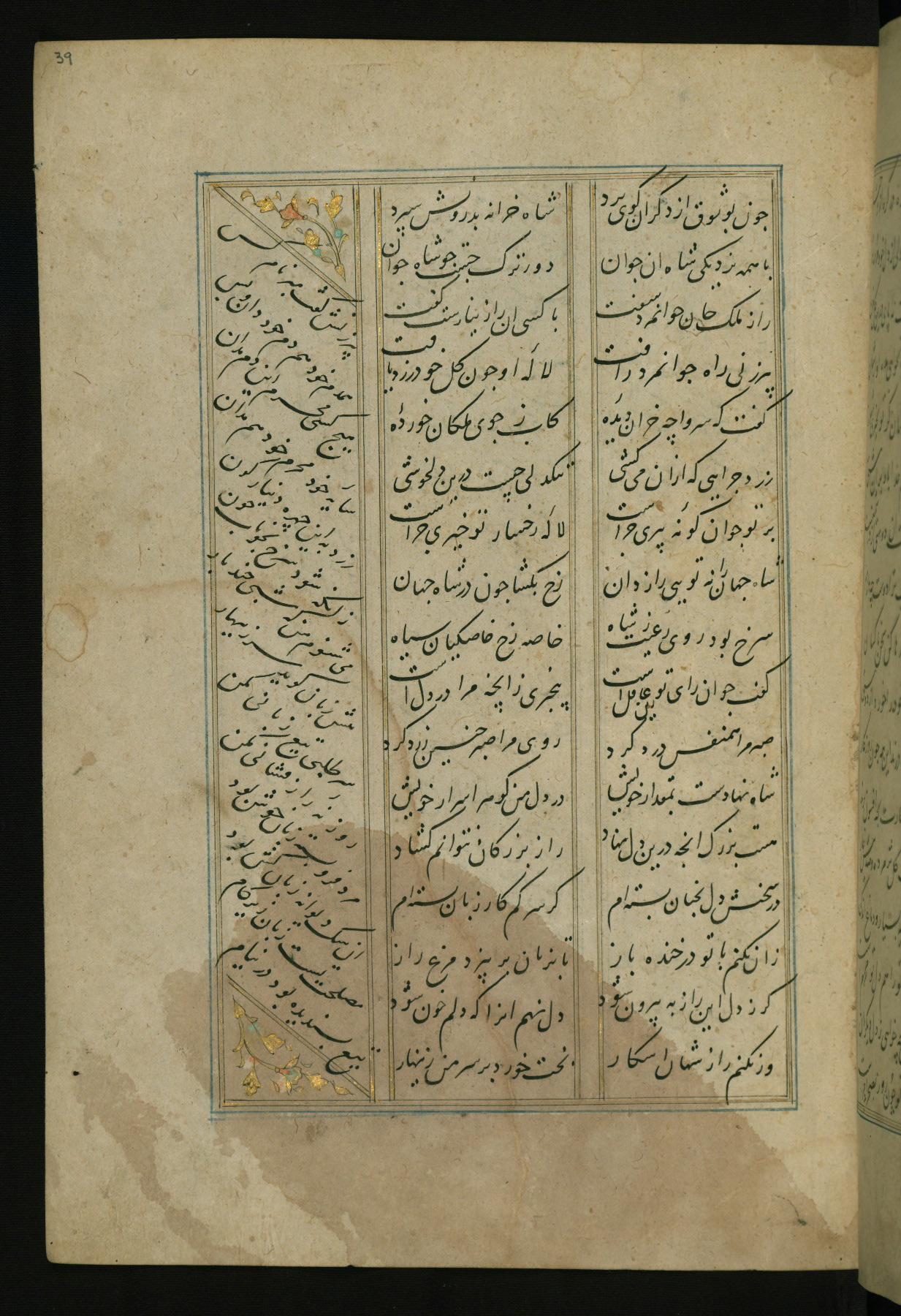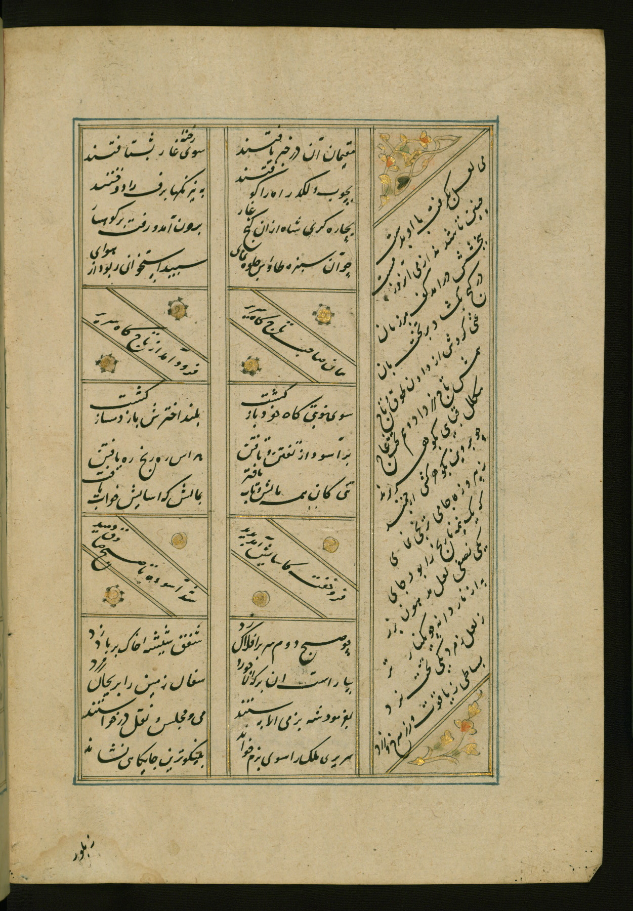 This copy of the Khamsah (quintet) of Niẓāmī Ganjavī (d. 605 AH / 1209 CE) was written by Abū Bakr Shāh ibn Ḥasan ibn ʿAlī al-Shahrastānī and illuminated by Jamāl al-Dīn ibn Muḥammad al-Ṣiddīqī al-Iṣfahānī between 892 AH / 1486 CE and 900 AH / 1494-5 CE. The manuscript opens with a double-page illuminated frontispiece with an inscription giving the title of the work and the name of the author (fols. 1b-2a). There are four illuminated titlepieces with the names of the individual poems and twenty-six repainted illustrations. According to evidence supplied by the colophons, the original binding was by the hand of Jamāl al-Dīn ibn Muḥammad al-Ṣiddīqī al-Iṣfahānī, as well. Unfortunately, it has not survived. The binding presently attached to the manuscript dates to the twelfth century AH / eighteenth CE.