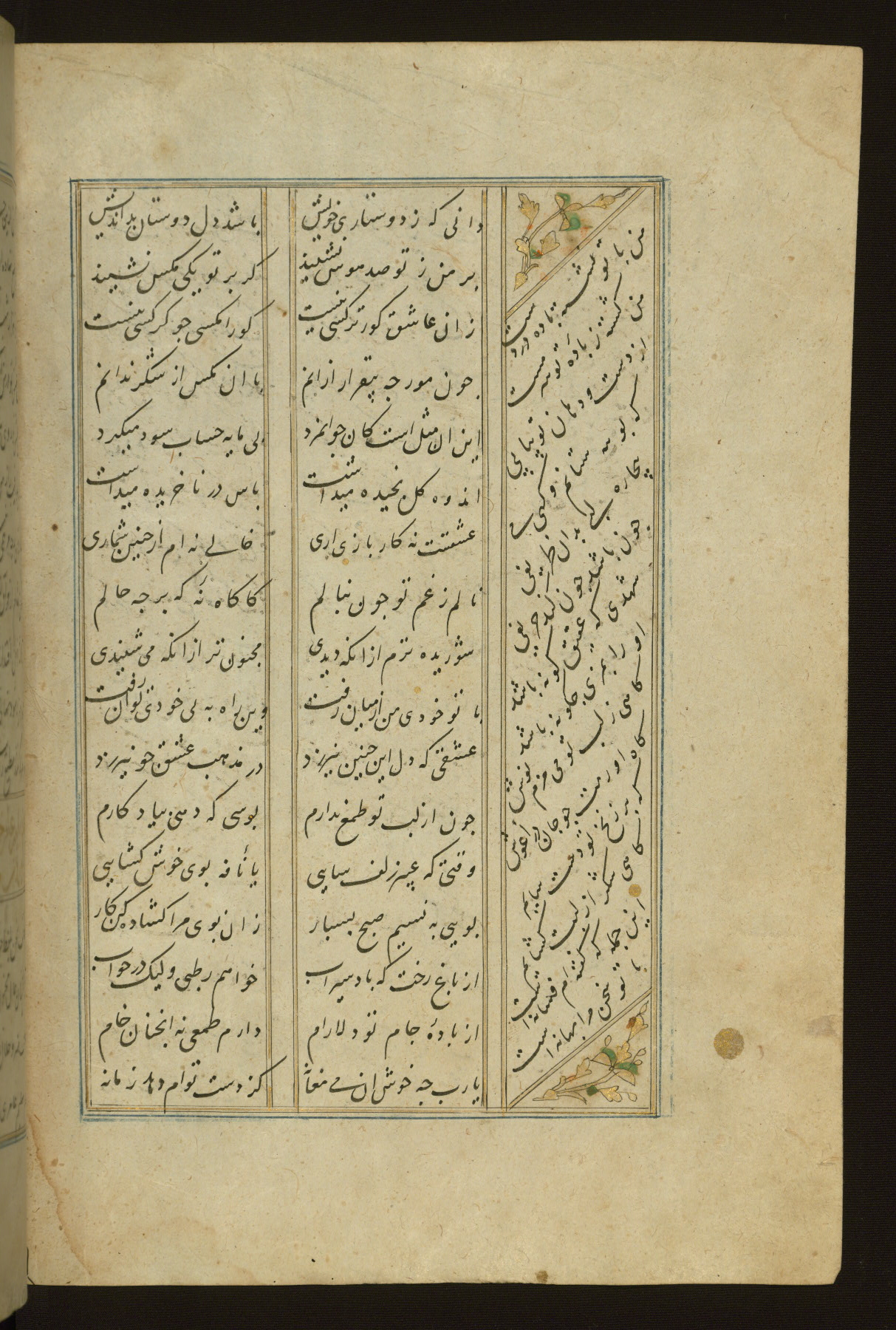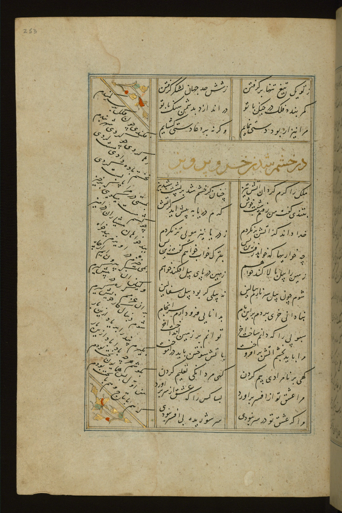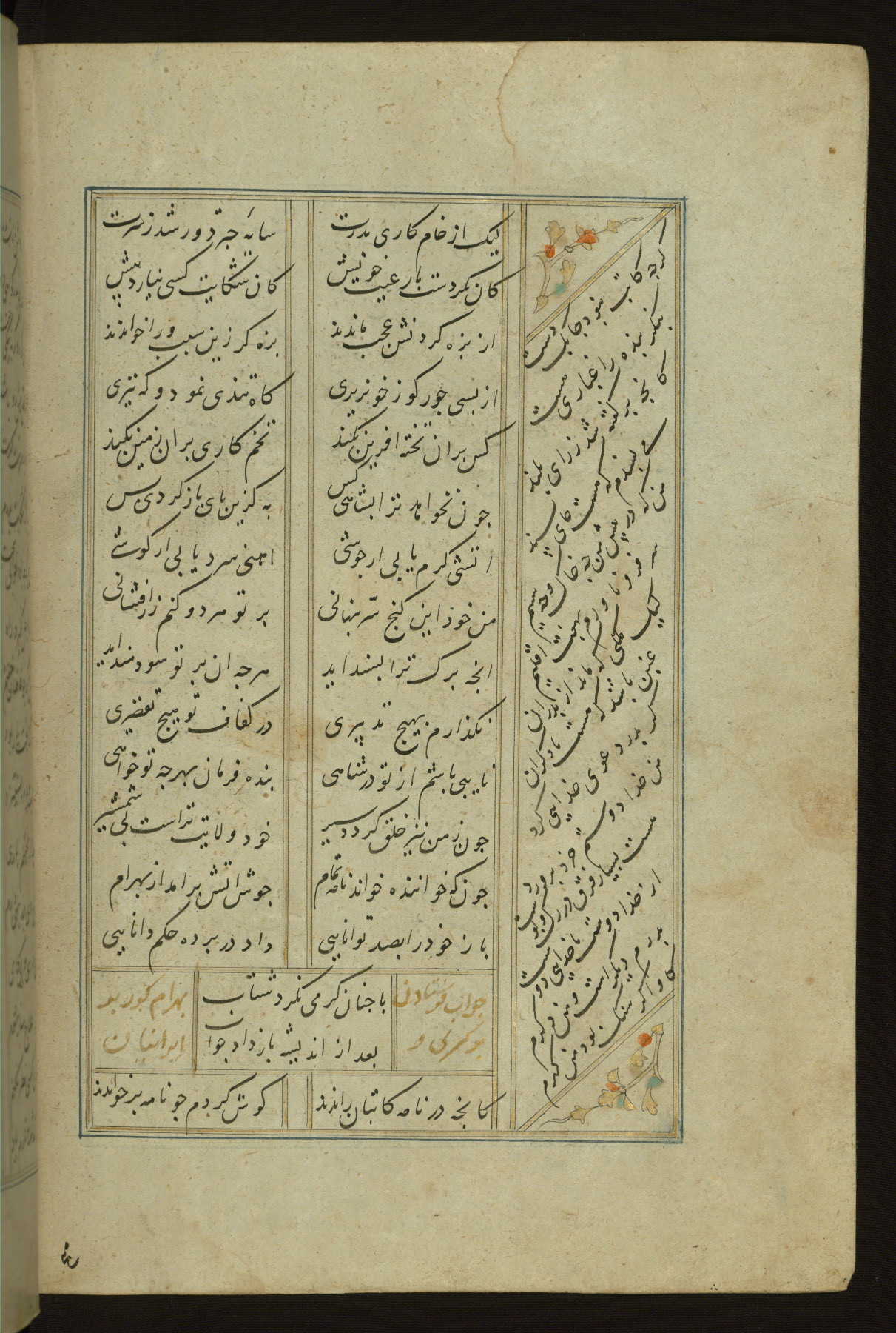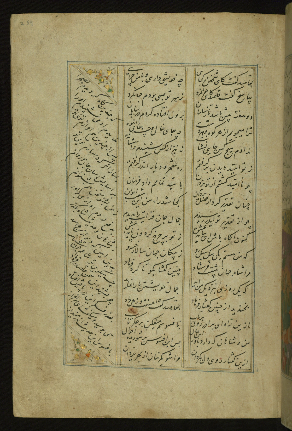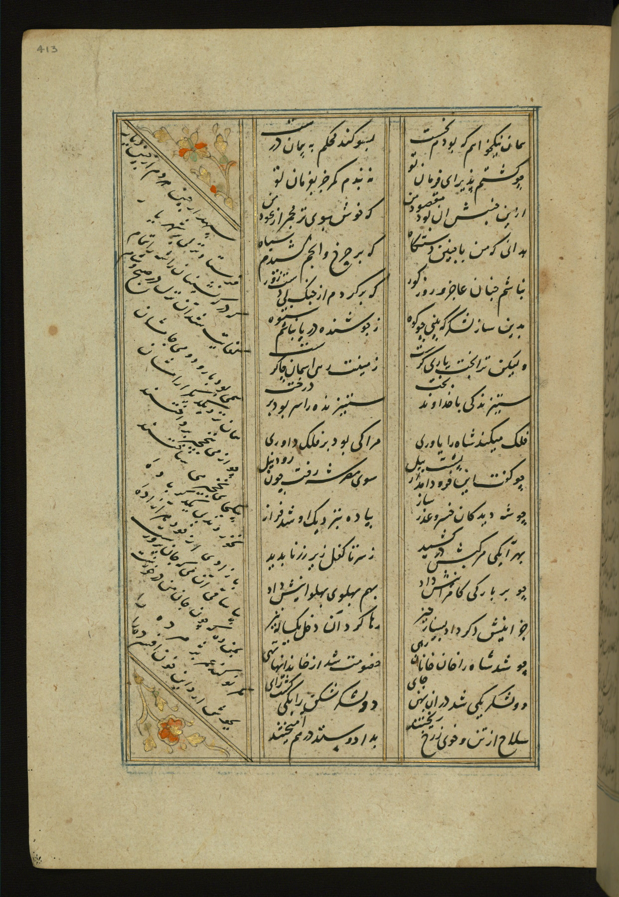 This copy of the Khamsah (quintet) of Niẓāmī Ganjavī (d. 605 AH / 1209 CE) was written by Abū Bakr Shāh ibn Ḥasan ibn ʿAlī al-Shahrastānī and illuminated by Jamāl al-Dīn ibn Muḥammad al-Ṣiddīqī al-Iṣfahānī between 892 AH / 1486 CE and 900 AH / 1494-5 CE. The manuscript opens with a double-page illuminated frontispiece with an inscription giving the title of the work and the name of the author (fols. 1b-2a). There are four illuminated titlepieces with the names of the individual poems and twenty-six repainted illustrations. According to evidence supplied by the colophons, the original binding was by the hand of Jamāl al-Dīn ibn Muḥammad al-Ṣiddīqī al-Iṣfahānī, as well. Unfortunately, it has not survived. The binding presently attached to the manuscript dates to the twelfth century AH / eighteenth CE.