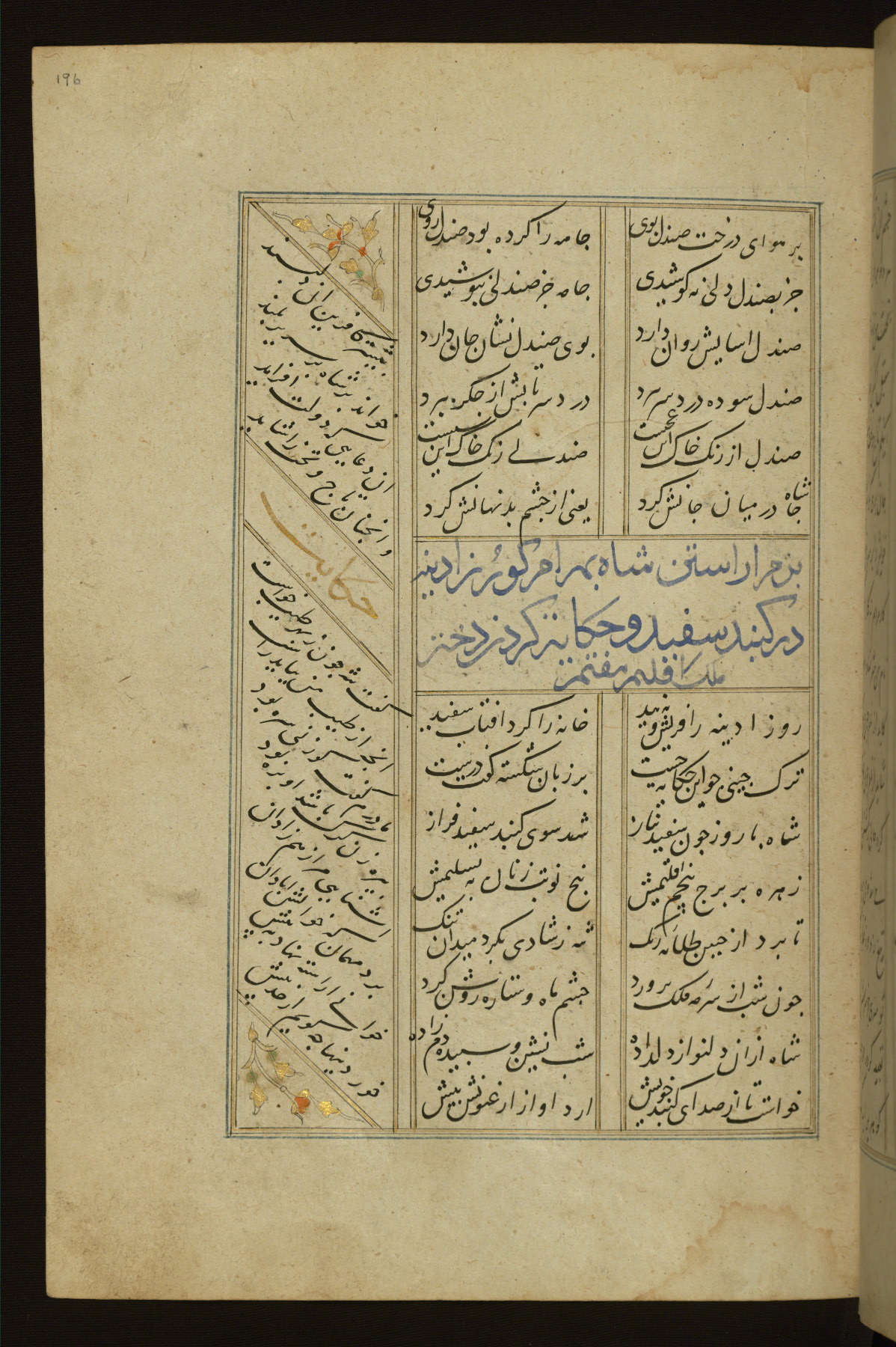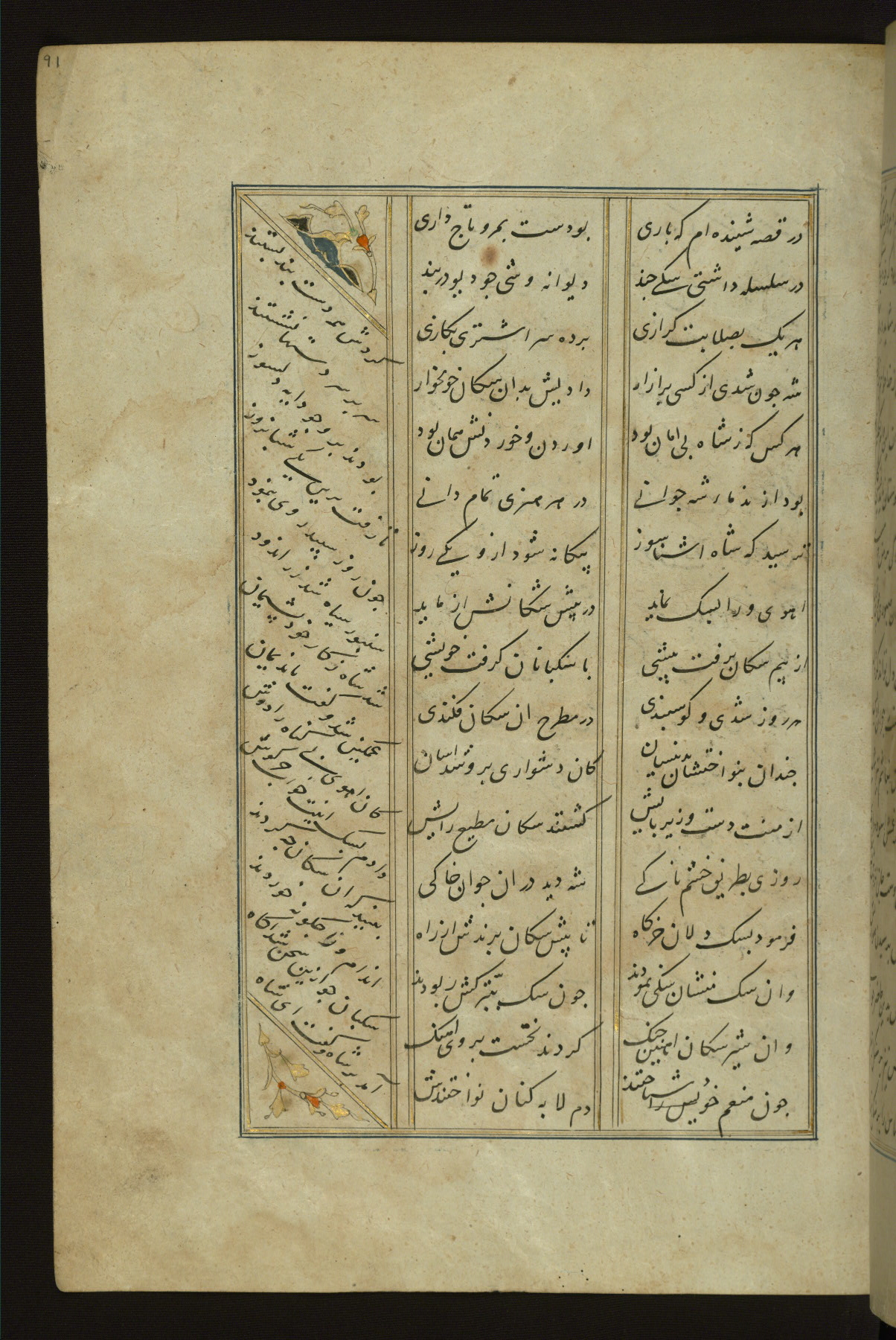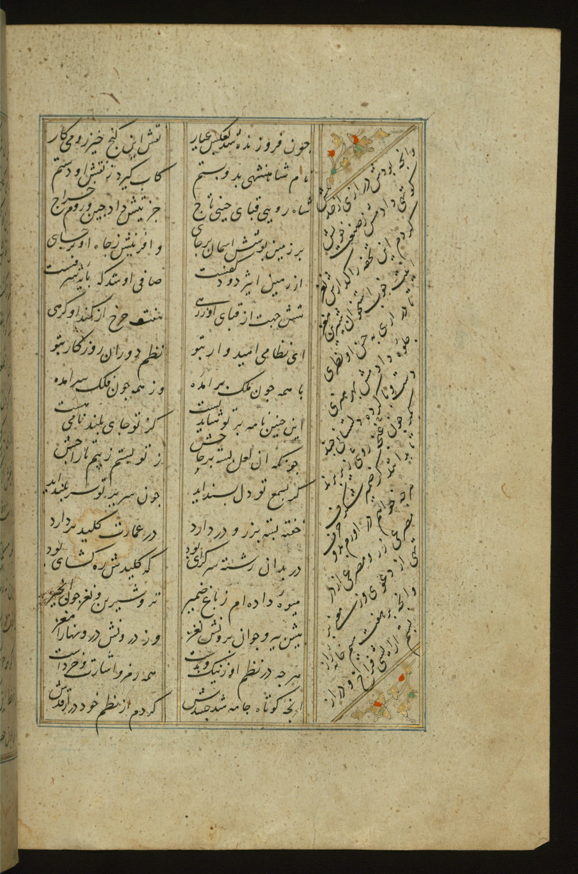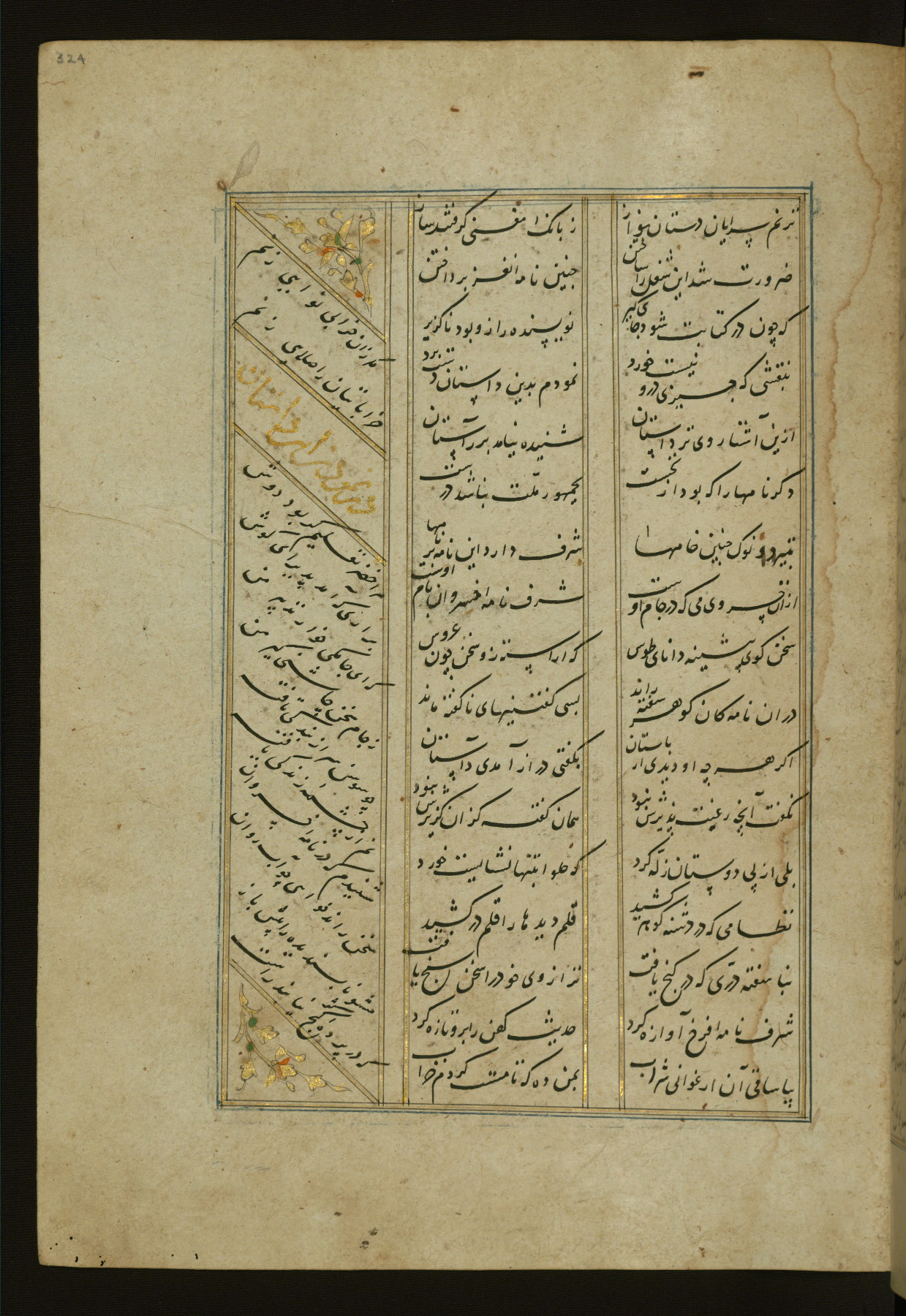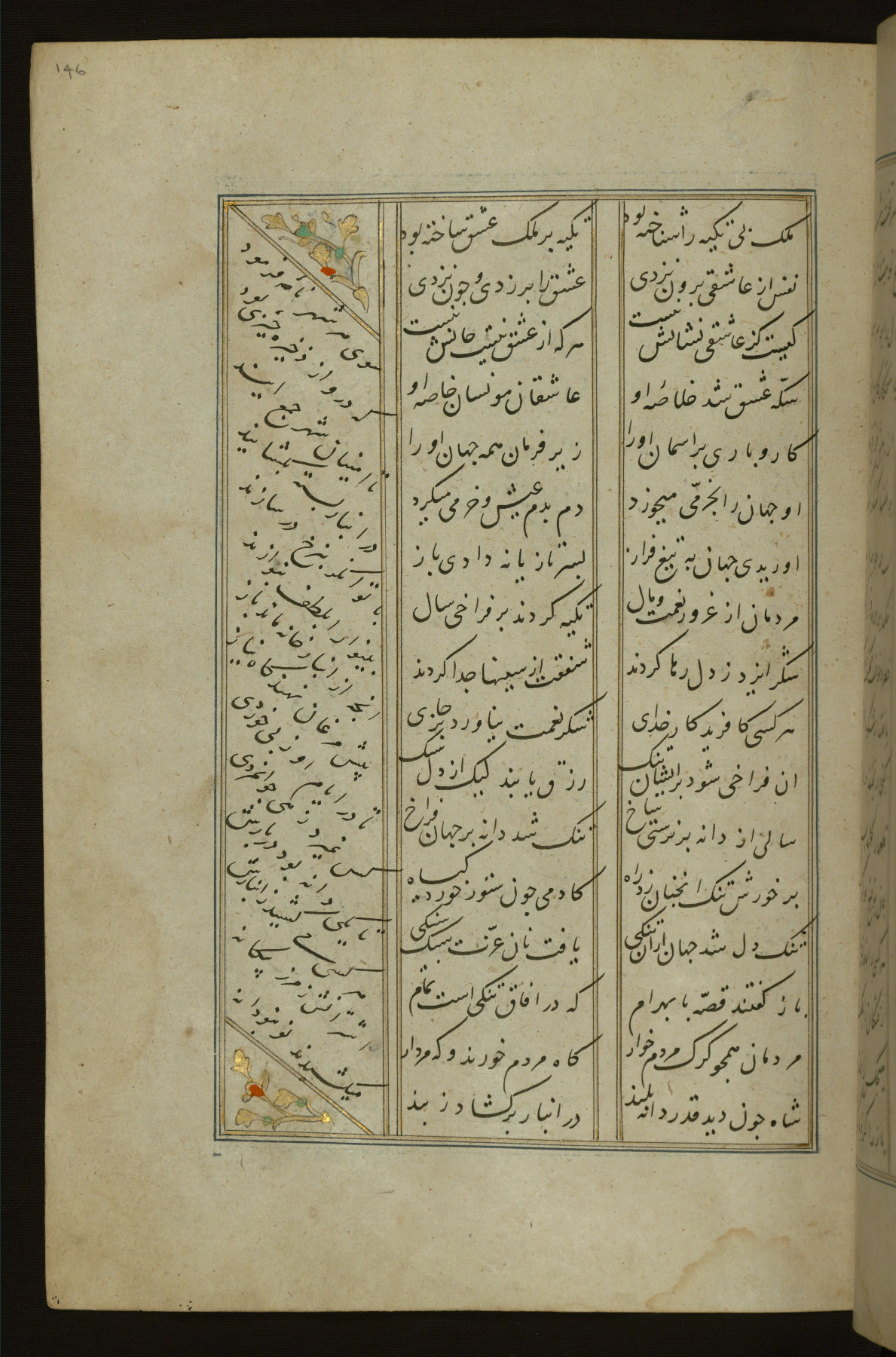 This copy of the Khamsah (quintet) of Niẓāmī Ganjavī (d. 605 AH / 1209 CE) was written by Abū Bakr Shāh ibn Ḥasan ibn ʿAlī al-Shahrastānī and illuminated by Jamāl al-Dīn ibn Muḥammad al-Ṣiddīqī al-Iṣfahānī between 892 AH / 1486 CE and 900 AH / 1494-5 CE. The manuscript opens with a double-page illuminated frontispiece with an inscription giving the title of the work and the name of the author (fols. 1b-2a). There are four illuminated titlepieces with the names of the individual poems and twenty-six repainted illustrations. According to evidence supplied by the colophons, the original binding was by the hand of Jamāl al-Dīn ibn Muḥammad al-Ṣiddīqī al-Iṣfahānī, as well. Unfortunately, it has not survived. The binding presently attached to the manuscript dates to the twelfth century AH / eighteenth CE.