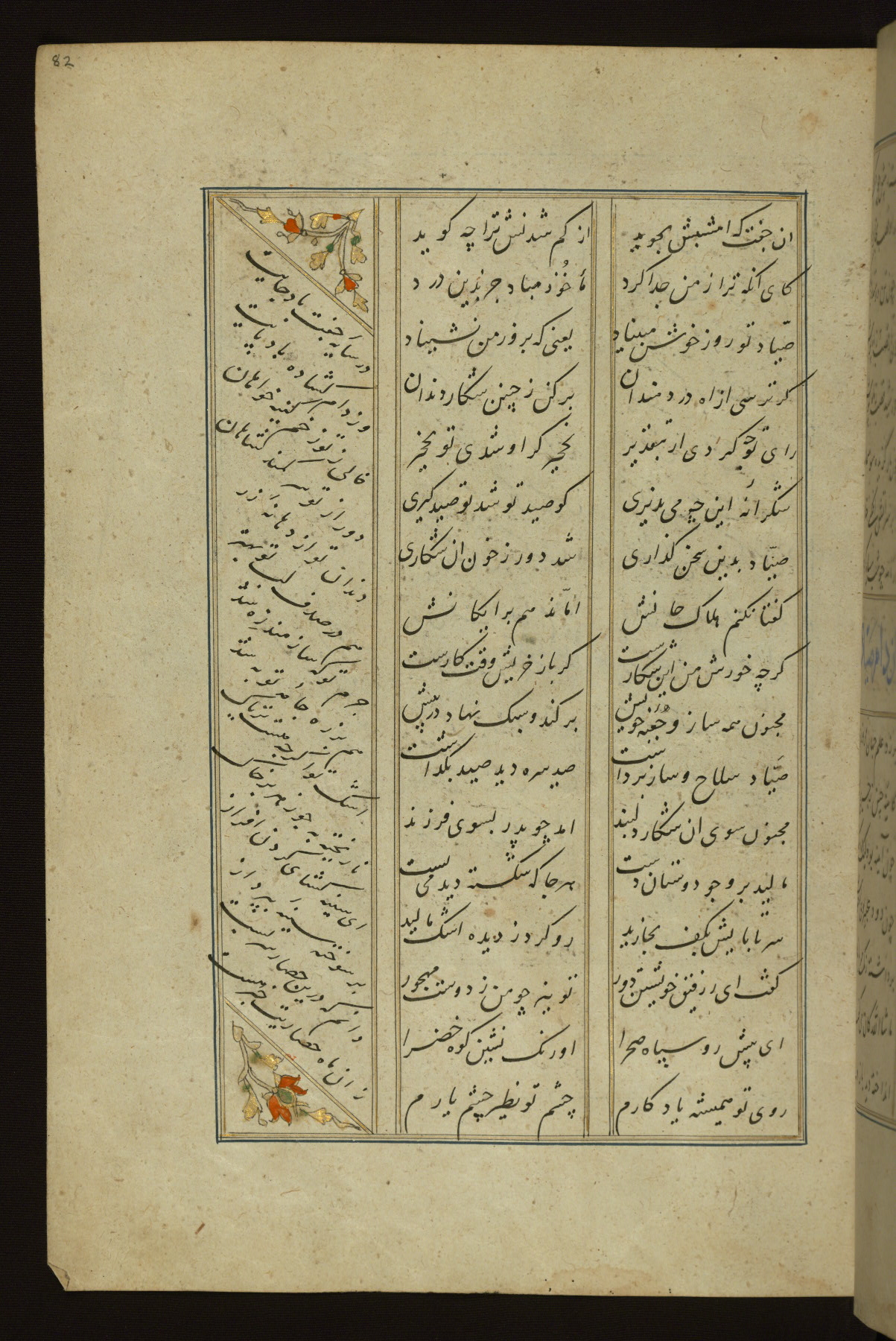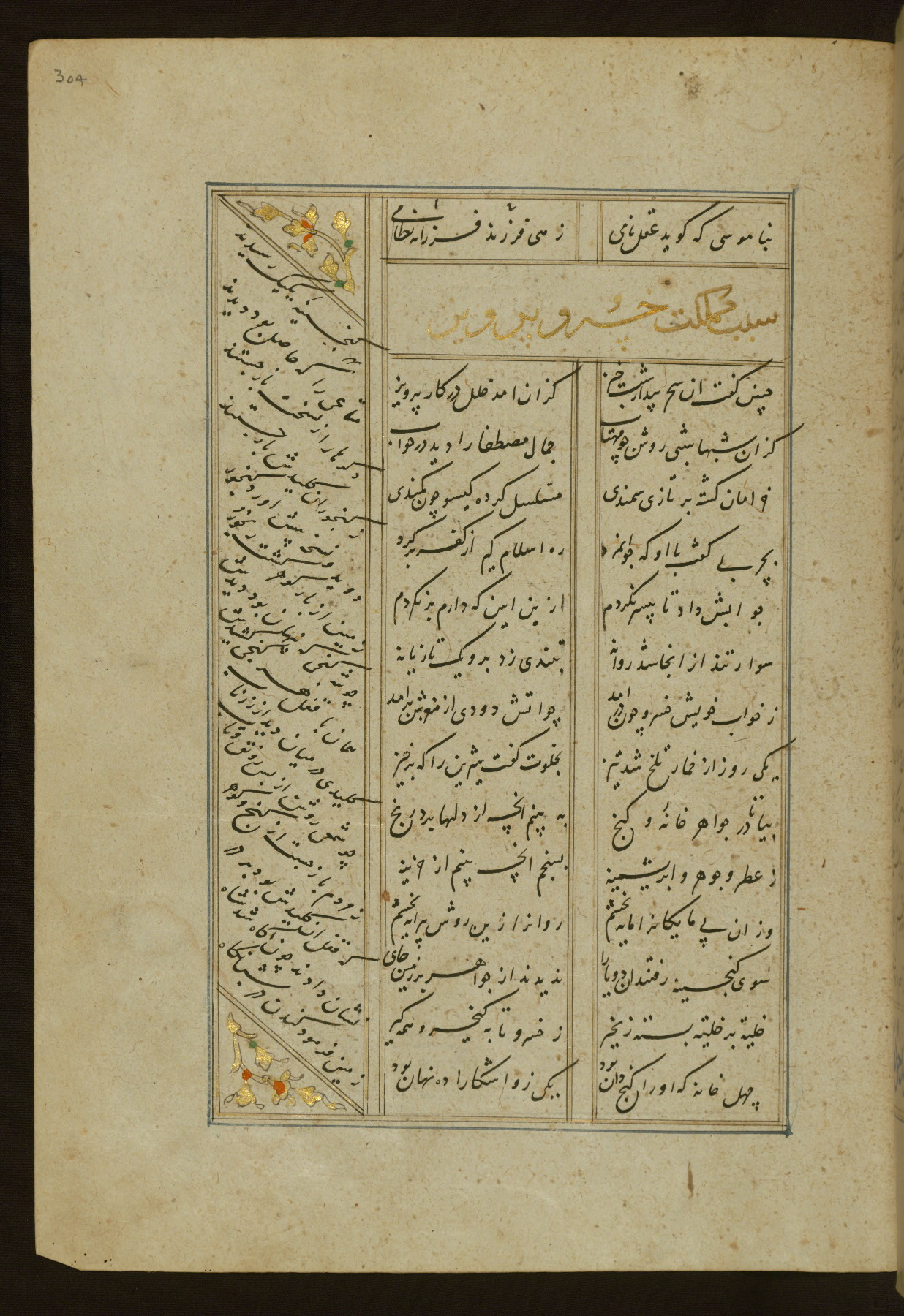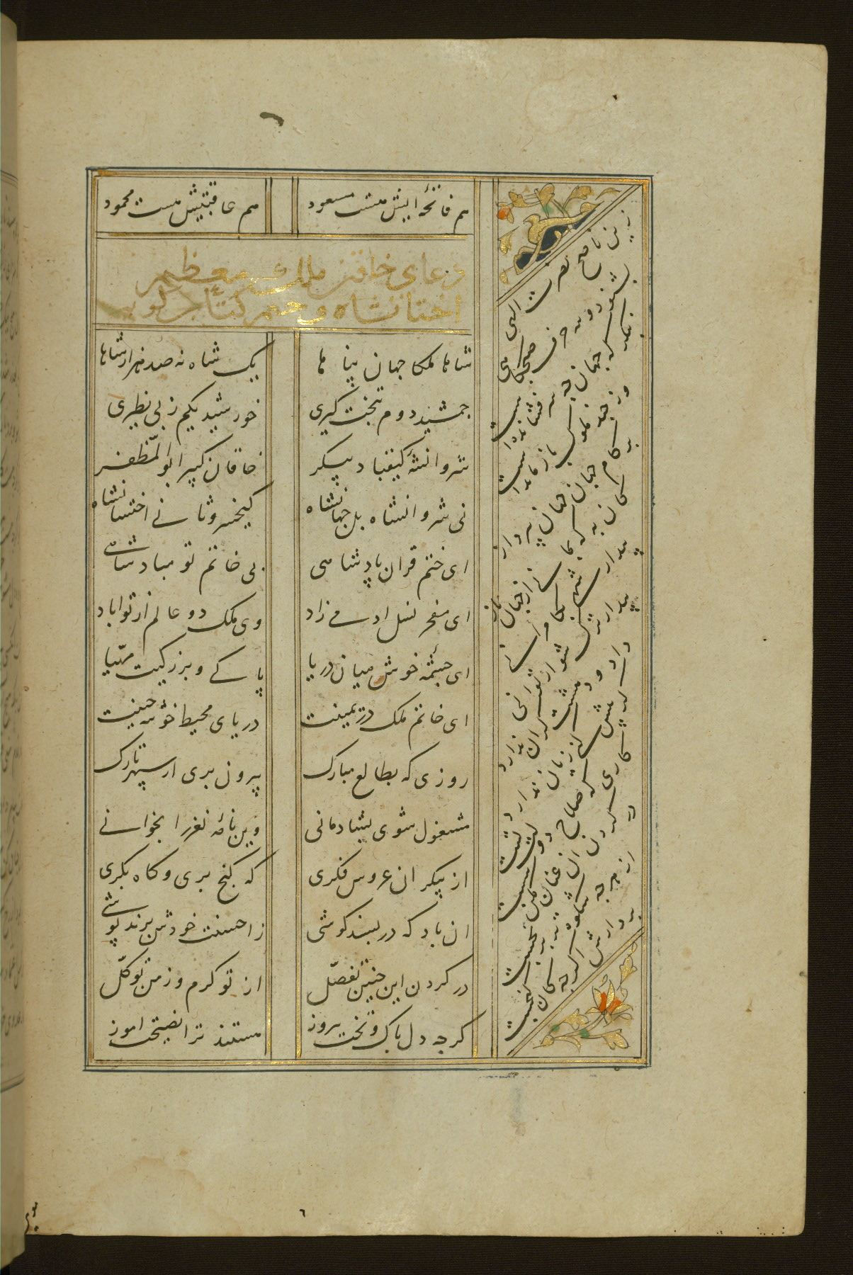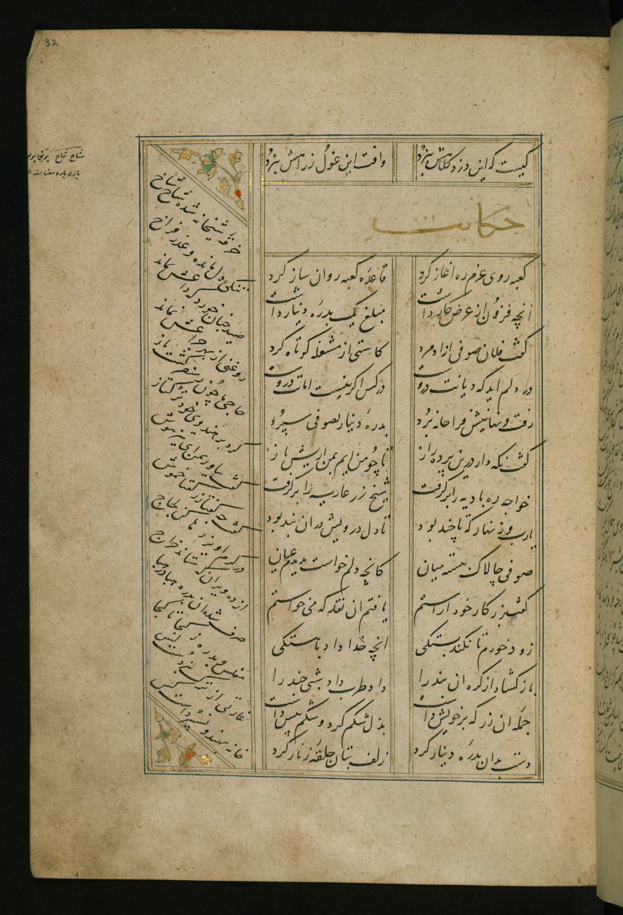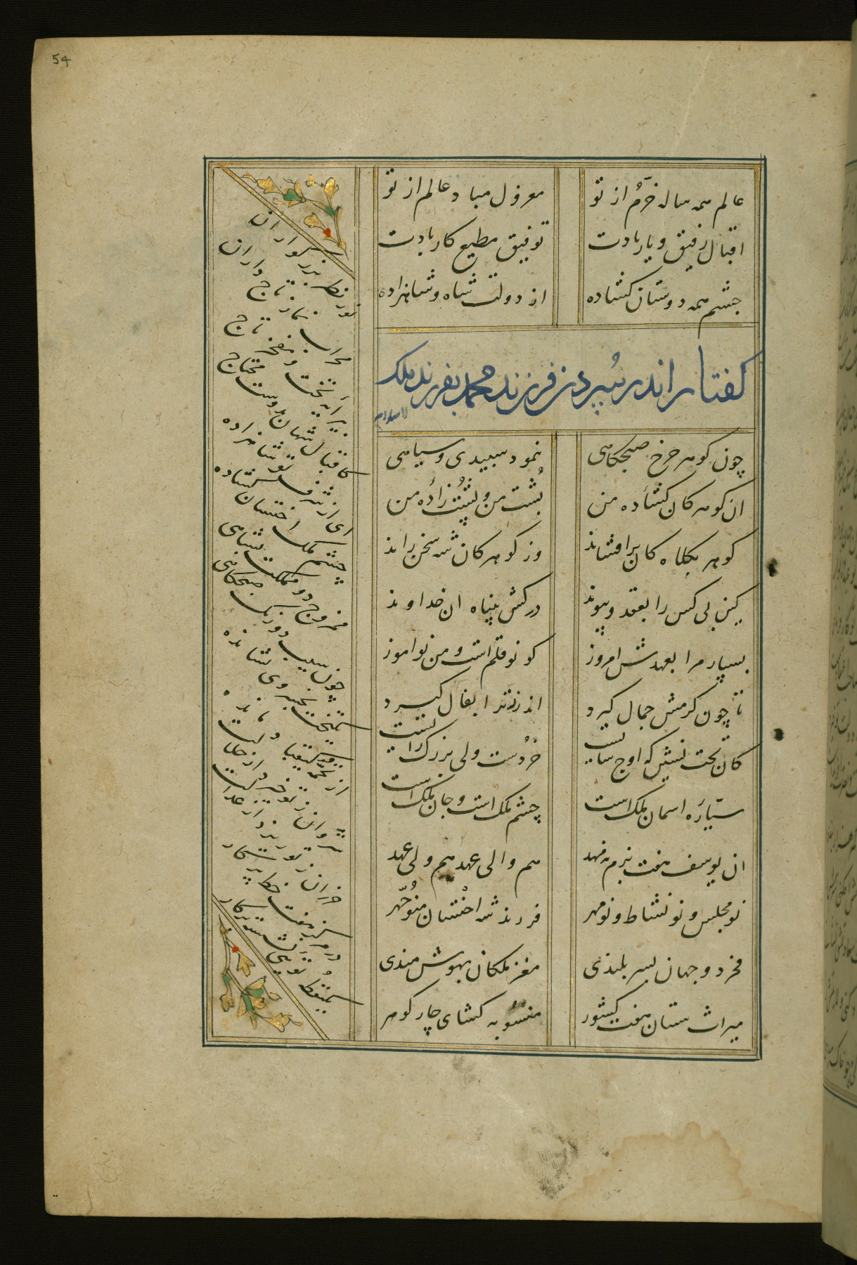 This copy of the Khamsah (quintet) of Niẓāmī Ganjavī (d. 605 AH / 1209 CE) was written by Abū Bakr Shāh ibn Ḥasan ibn ʿAlī al-Shahrastānī and illuminated by Jamāl al-Dīn ibn Muḥammad al-Ṣiddīqī al-Iṣfahānī between 892 AH / 1486 CE and 900 AH / 1494-5 CE. The manuscript opens with a double-page illuminated frontispiece with an inscription giving the title of the work and the name of the author (fols. 1b-2a). There are four illuminated titlepieces with the names of the individual poems and twenty-six repainted illustrations. According to evidence supplied by the colophons, the original binding was by the hand of Jamāl al-Dīn ibn Muḥammad al-Ṣiddīqī al-Iṣfahānī, as well. Unfortunately, it has not survived. The binding presently attached to the manuscript dates to the twelfth century AH / eighteenth CE.