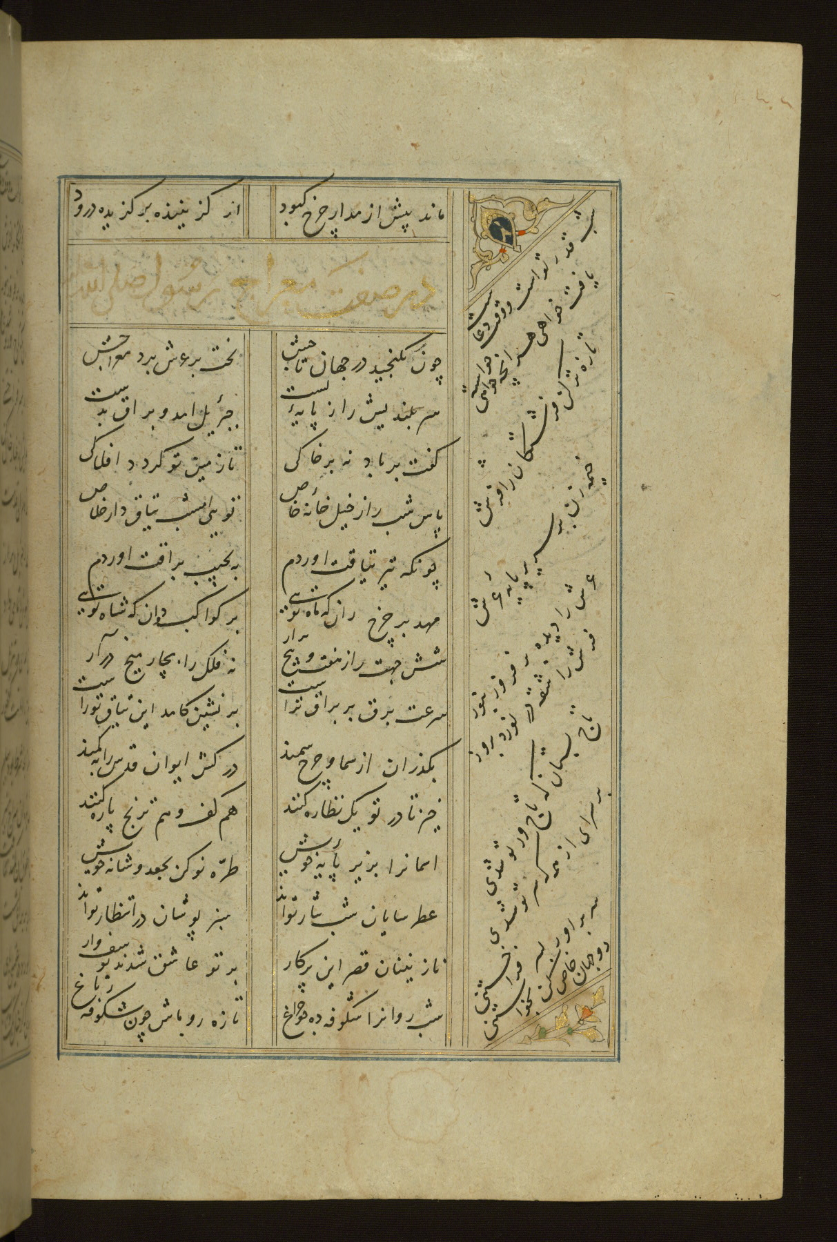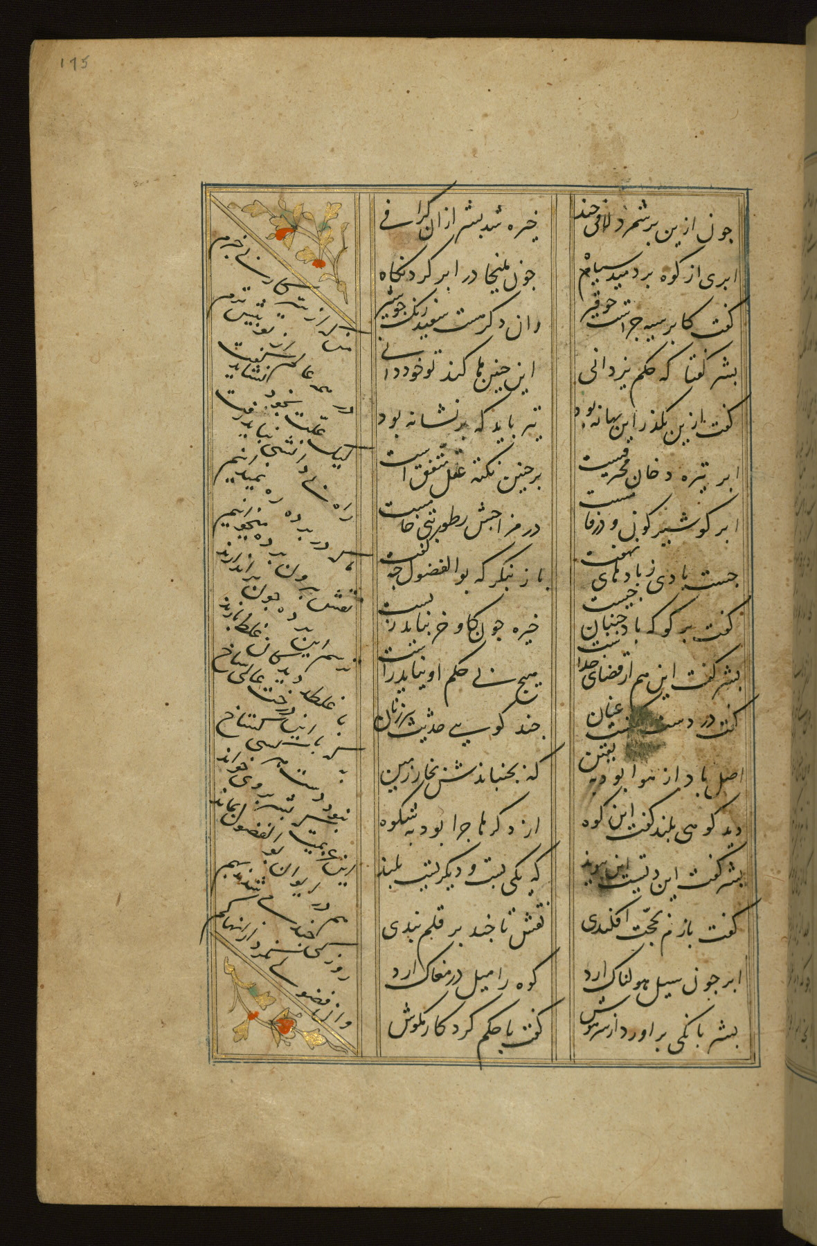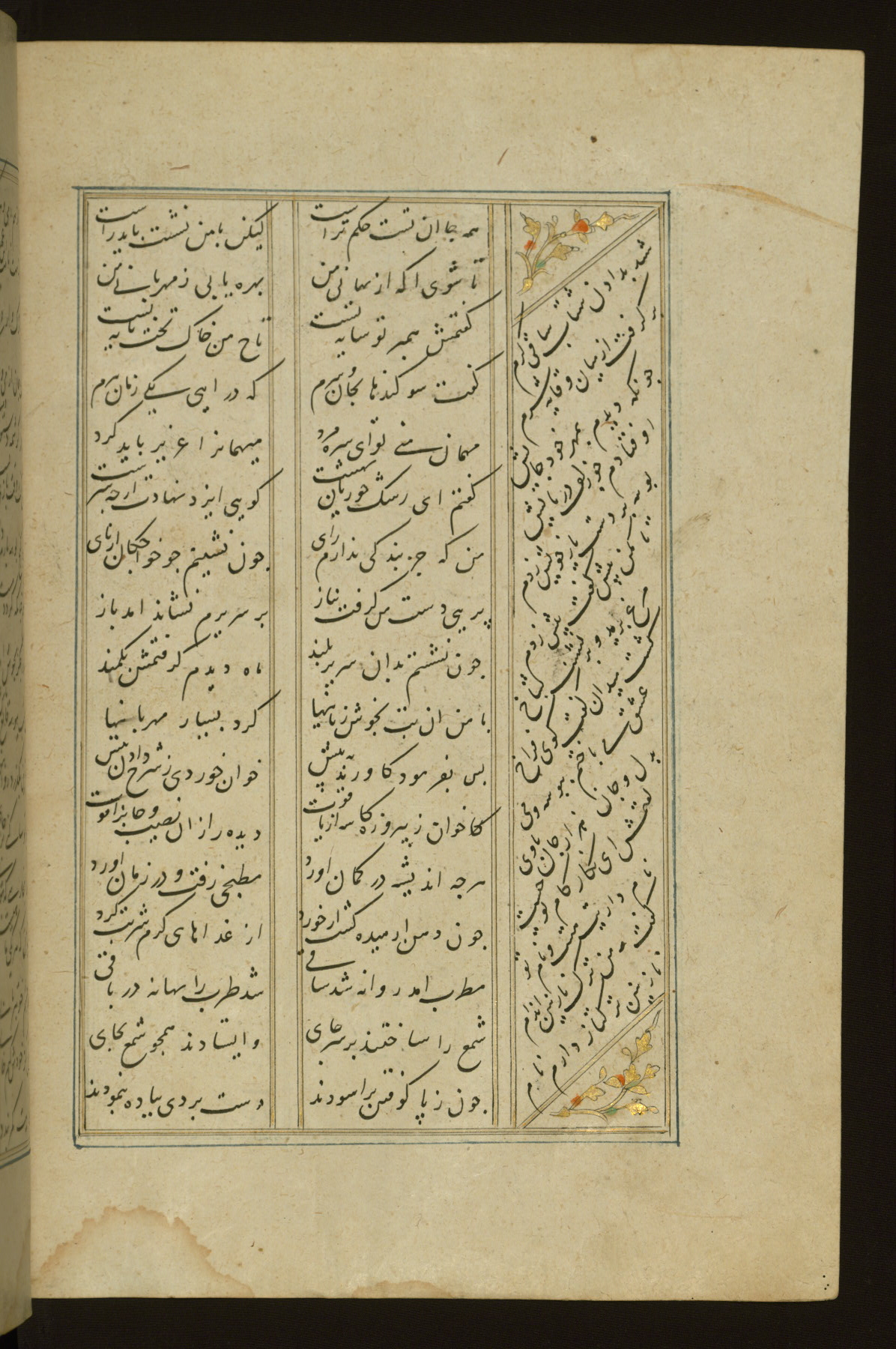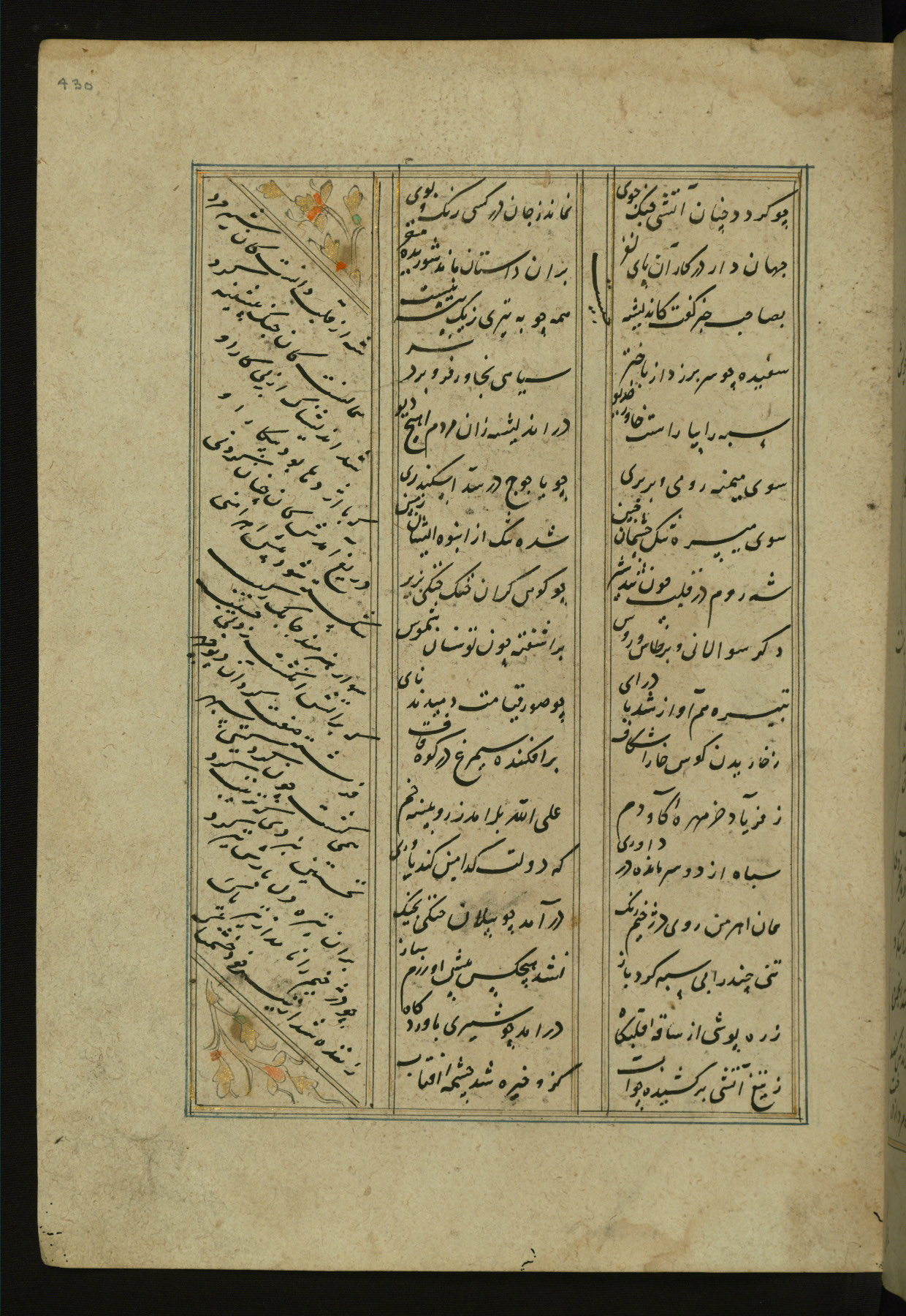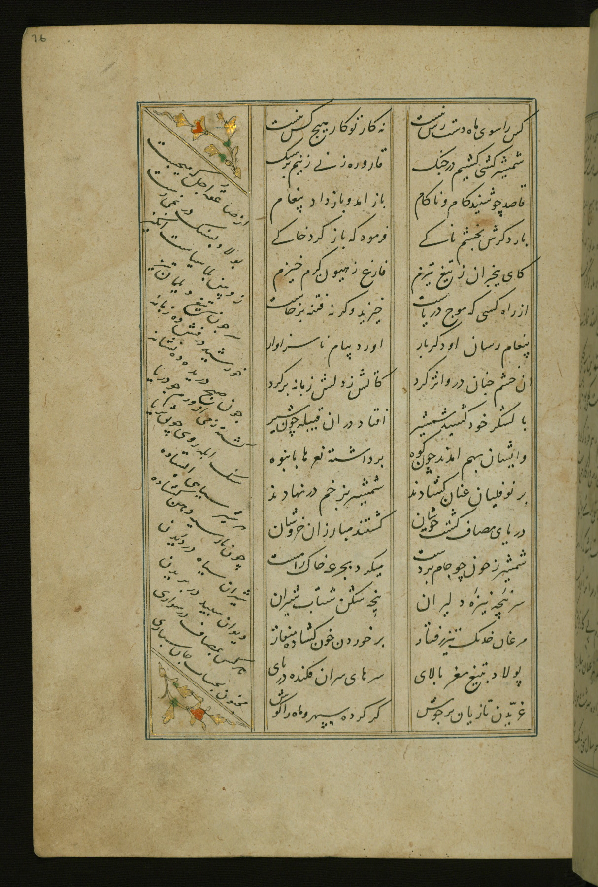 This copy of the Khamsah (quintet) of Niẓāmī Ganjavī (d. 605 AH / 1209 CE) was written by Abū Bakr Shāh ibn Ḥasan ibn ʿAlī al-Shahrastānī and illuminated by Jamāl al-Dīn ibn Muḥammad al-Ṣiddīqī al-Iṣfahānī between 892 AH / 1486 CE and 900 AH / 1494-5 CE. The manuscript opens with a double-page illuminated frontispiece with an inscription giving the title of the work and the name of the author (fols. 1b-2a). There are four illuminated titlepieces with the names of the individual poems and twenty-six repainted illustrations. According to evidence supplied by the colophons, the original binding was by the hand of Jamāl al-Dīn ibn Muḥammad al-Ṣiddīqī al-Iṣfahānī, as well. Unfortunately, it has not survived. The binding presently attached to the manuscript dates to the twelfth century AH / eighteenth CE.