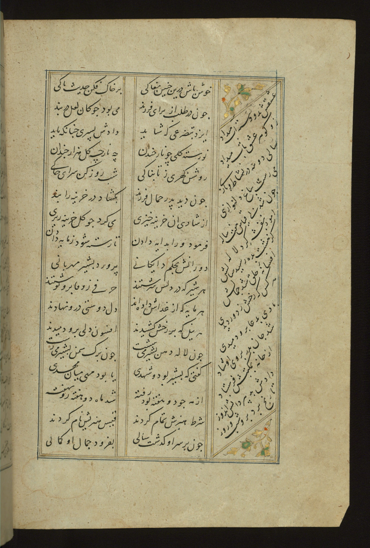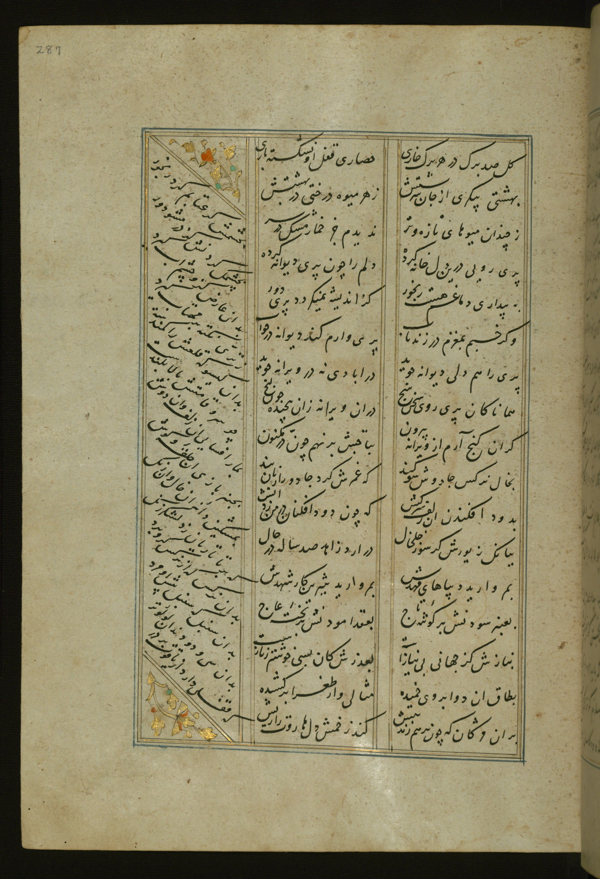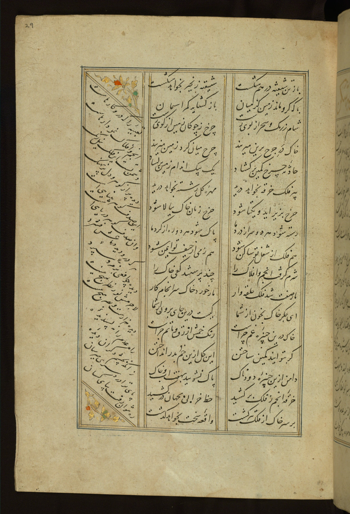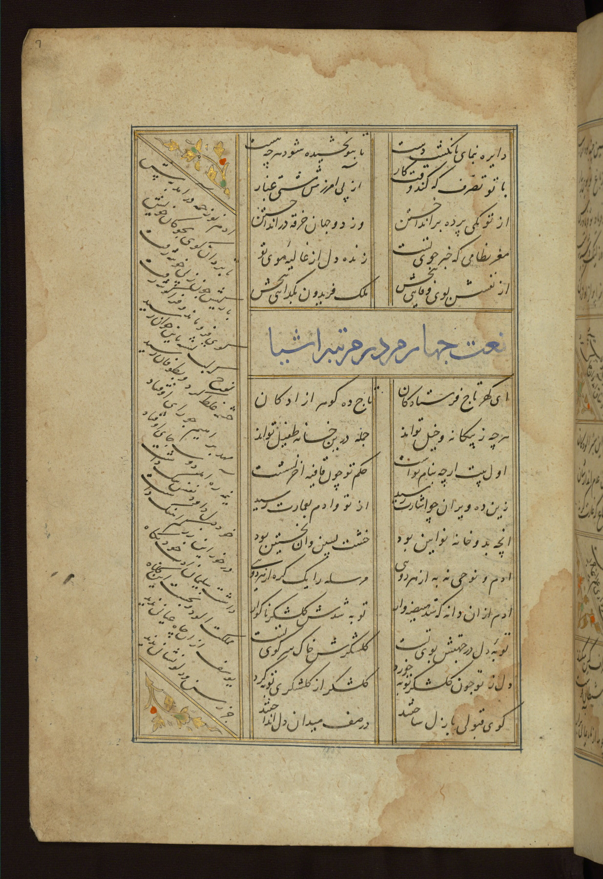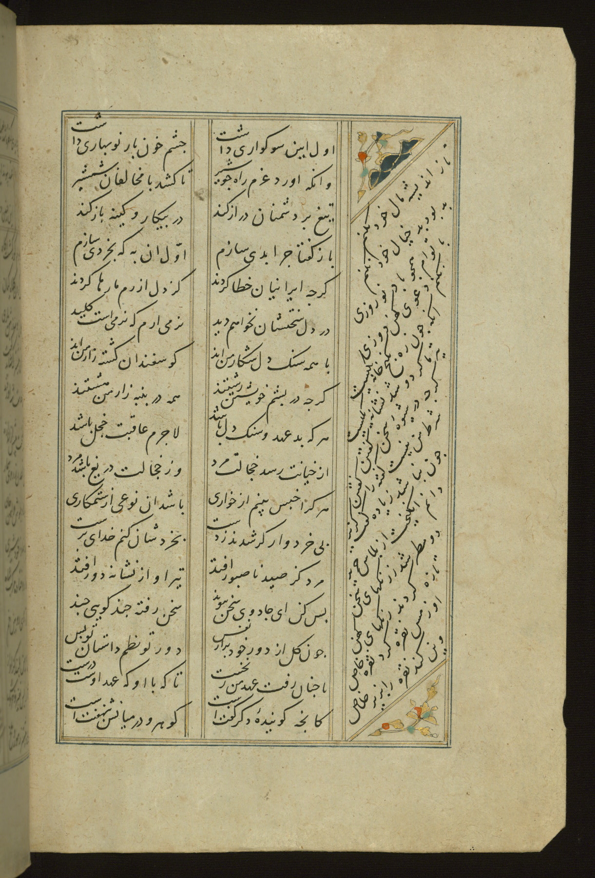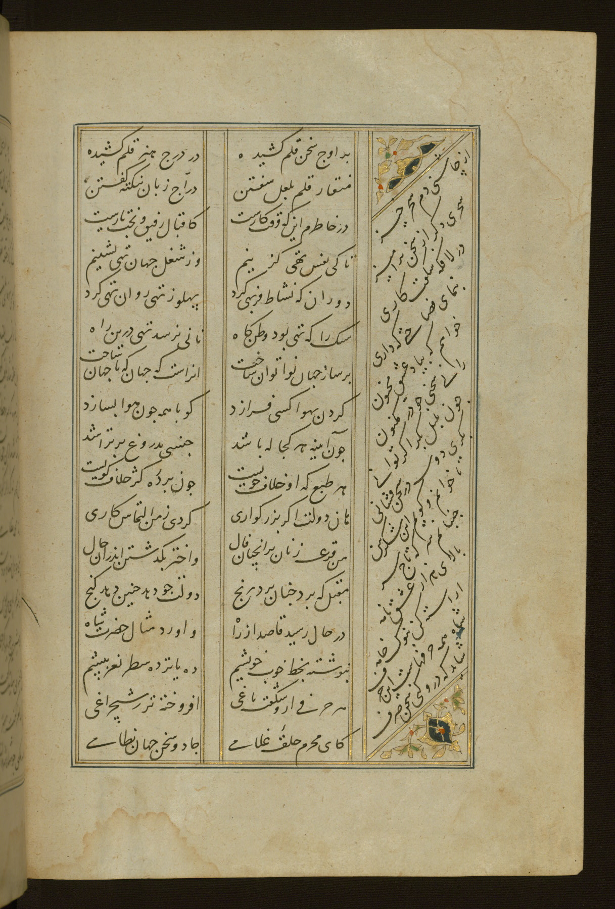 This copy of the Khamsah (quintet) of Niẓāmī Ganjavī (d. 605 AH / 1209 CE) was written by Abū Bakr Shāh ibn Ḥasan ibn ʿAlī al-Shahrastānī and illuminated by Jamāl al-Dīn ibn Muḥammad al-Ṣiddīqī al-Iṣfahānī between 892 AH / 1486 CE and 900 AH / 1494-5 CE. The manuscript opens with a double-page illuminated frontispiece with an inscription giving the title of the work and the name of the author (fols. 1b-2a). There are four illuminated titlepieces with the names of the individual poems and twenty-six repainted illustrations. According to evidence supplied by the colophons, the original binding was by the hand of Jamāl al-Dīn ibn Muḥammad al-Ṣiddīqī al-Iṣfahānī, as well. Unfortunately, it has not survived. The binding presently attached to the manuscript dates to the twelfth century AH / eighteenth CE.