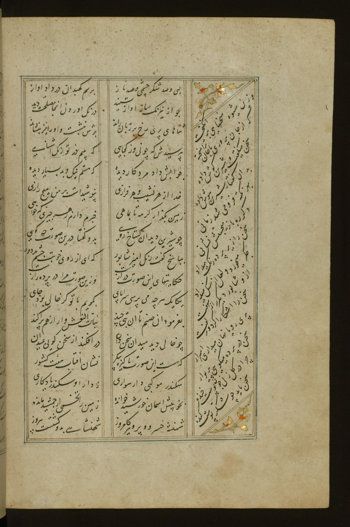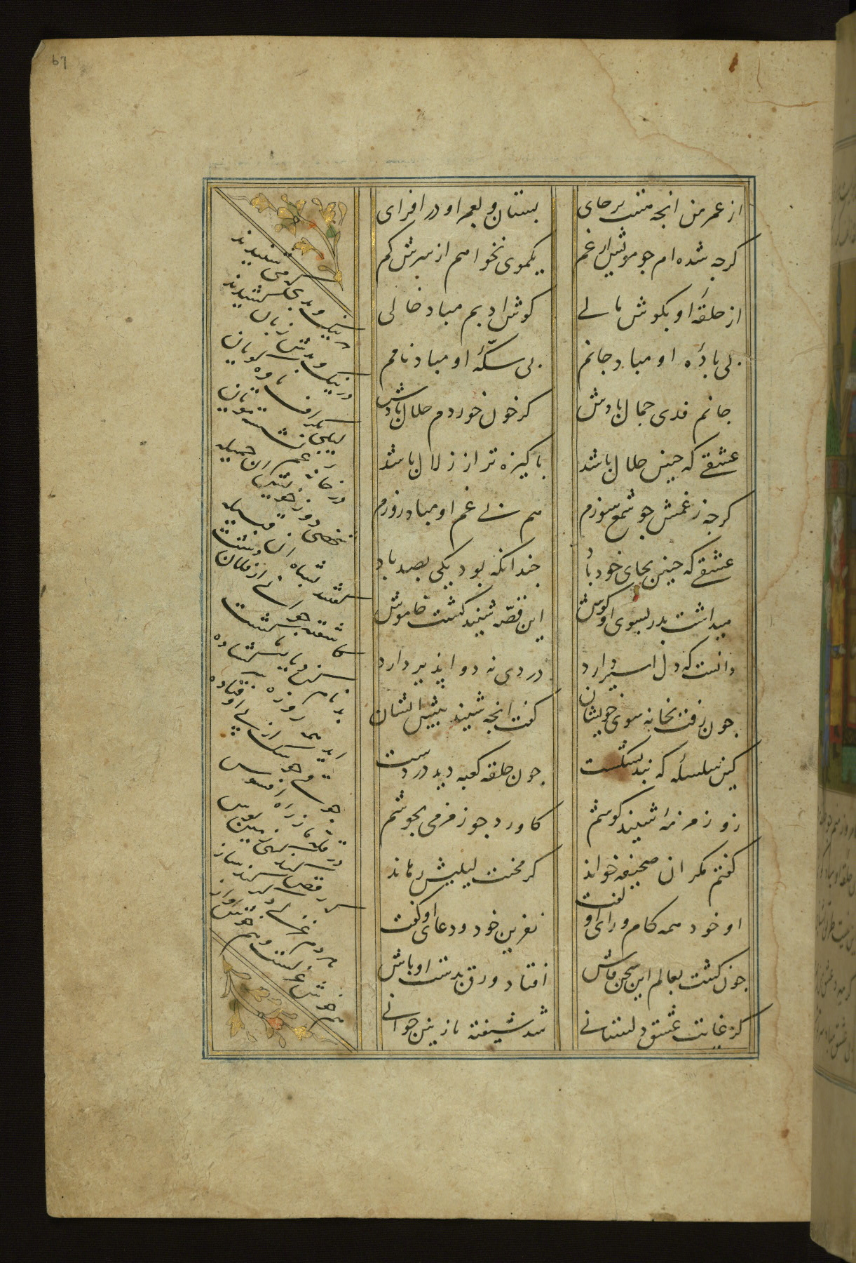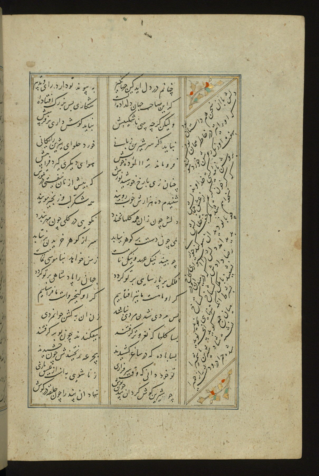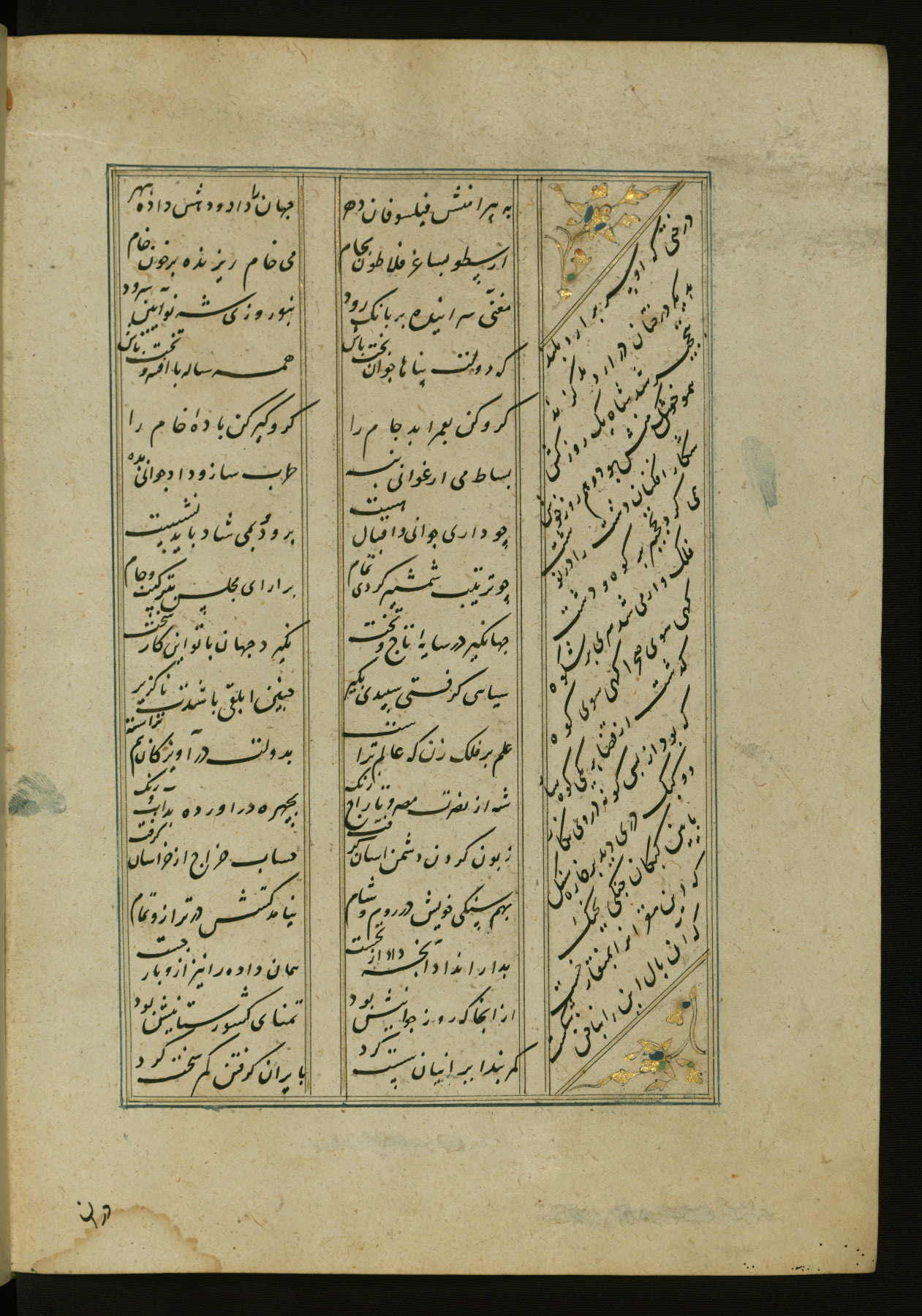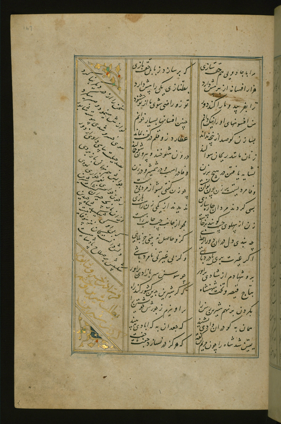 This copy of the Khamsah (quintet) of Niẓāmī Ganjavī (d. 605 AH / 1209 CE) was written by Abū Bakr Shāh ibn Ḥasan ibn ʿAlī al-Shahrastānī and illuminated by Jamāl al-Dīn ibn Muḥammad al-Ṣiddīqī al-Iṣfahānī between 892 AH / 1486 CE and 900 AH / 1494-5 CE. The manuscript opens with a double-page illuminated frontispiece with an inscription giving the title of the work and the name of the author (fols. 1b-2a). There are four illuminated titlepieces with the names of the individual poems and twenty-six repainted illustrations. According to evidence supplied by the colophons, the original binding was by the hand of Jamāl al-Dīn ibn Muḥammad al-Ṣiddīqī al-Iṣfahānī, as well. Unfortunately, it has not survived. The binding presently attached to the manuscript dates to the twelfth century AH / eighteenth CE.