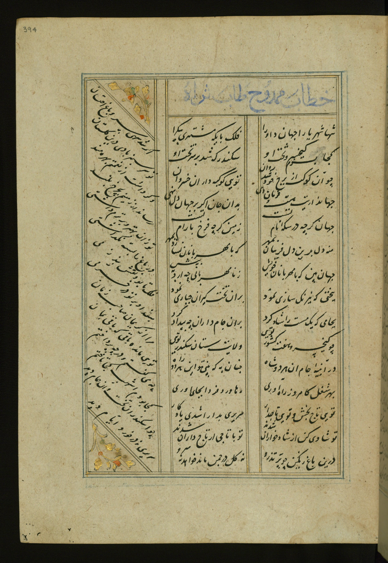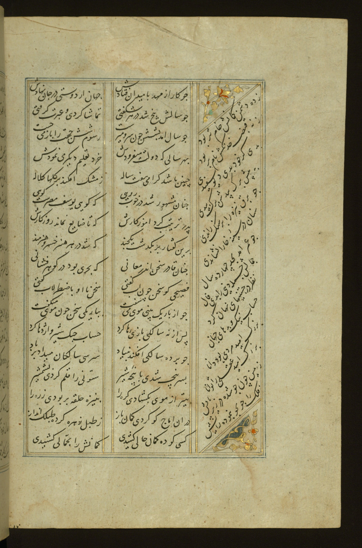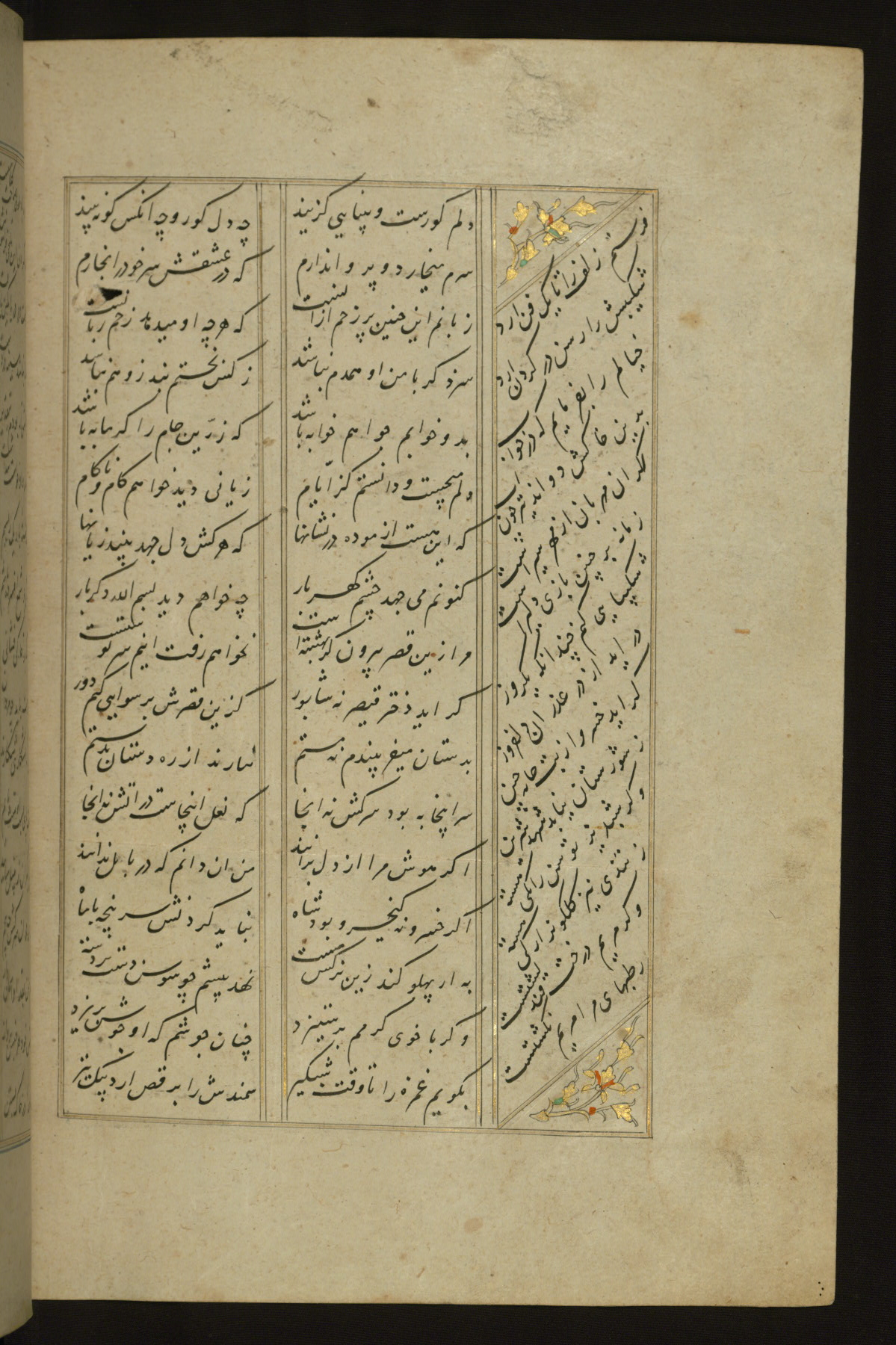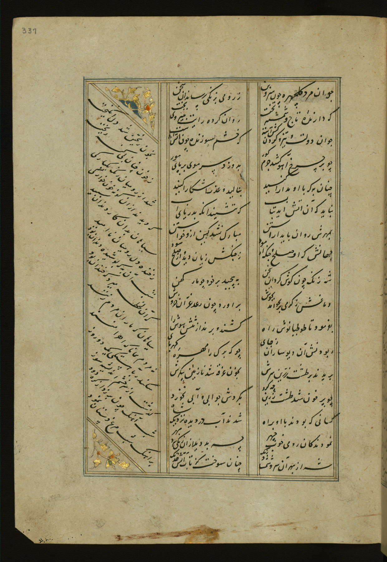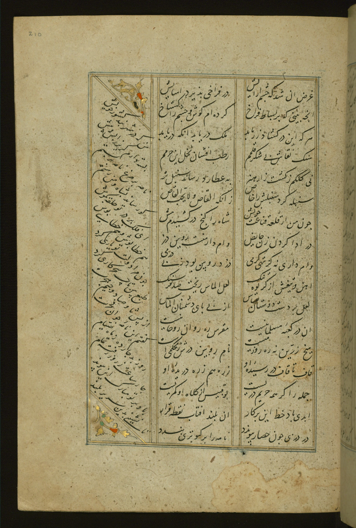 This copy of the Khamsah (quintet) of Niẓāmī Ganjavī (d. 605 AH / 1209 CE) was written by Abū Bakr Shāh ibn Ḥasan ibn ʿAlī al-Shahrastānī and illuminated by Jamāl al-Dīn ibn Muḥammad al-Ṣiddīqī al-Iṣfahānī between 892 AH / 1486 CE and 900 AH / 1494-5 CE. The manuscript opens with a double-page illuminated frontispiece with an inscription giving the title of the work and the name of the author (fols. 1b-2a). There are four illuminated titlepieces with the names of the individual poems and twenty-six repainted illustrations. According to evidence supplied by the colophons, the original binding was by the hand of Jamāl al-Dīn ibn Muḥammad al-Ṣiddīqī al-Iṣfahānī, as well. Unfortunately, it has not survived. The binding presently attached to the manuscript dates to the twelfth century AH / eighteenth CE.