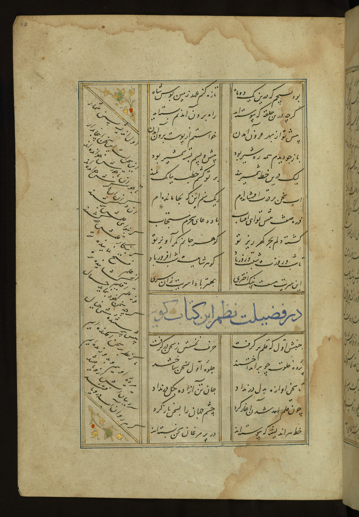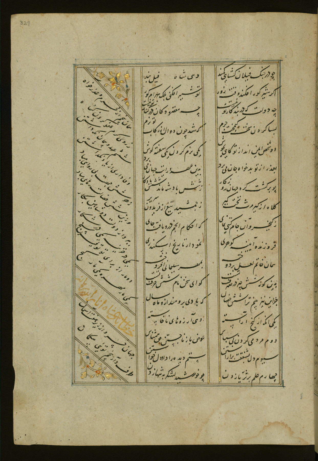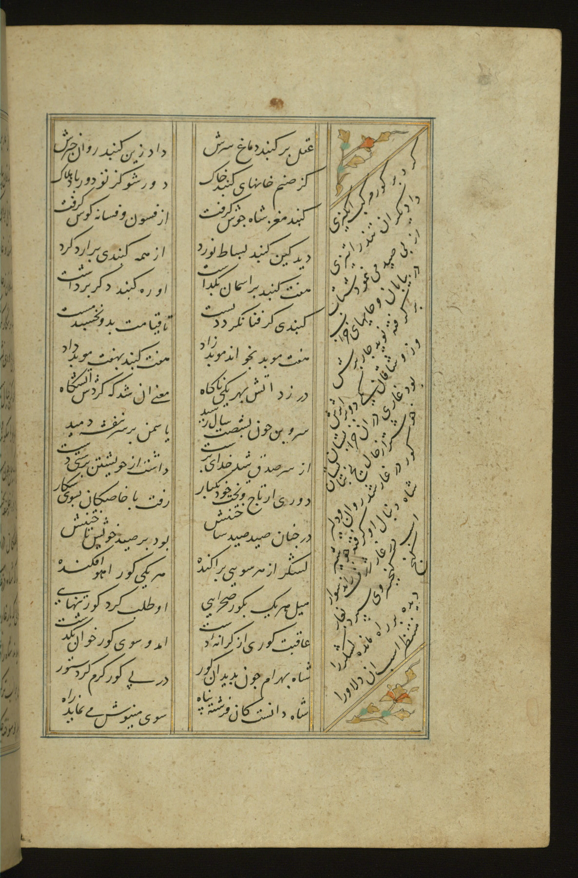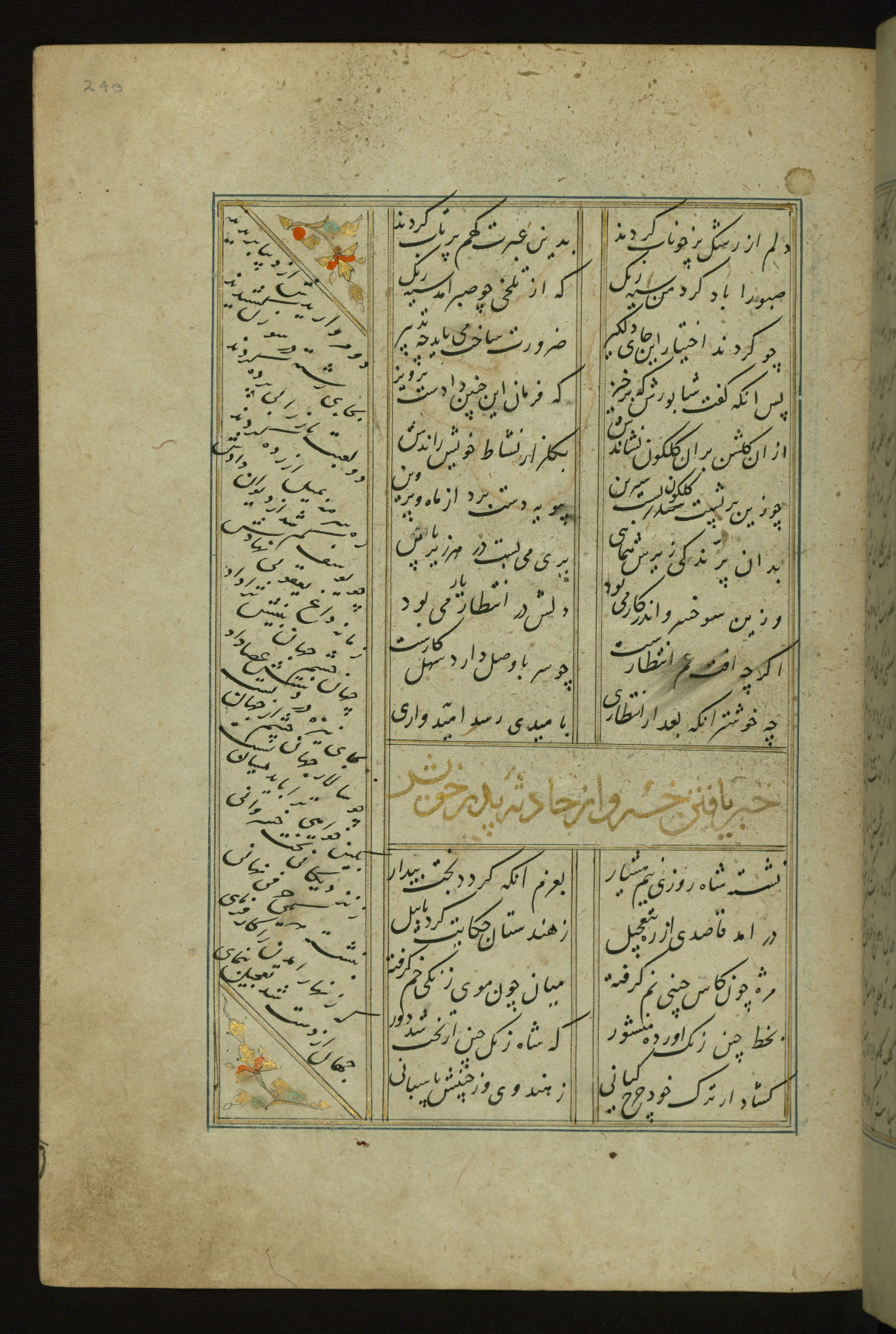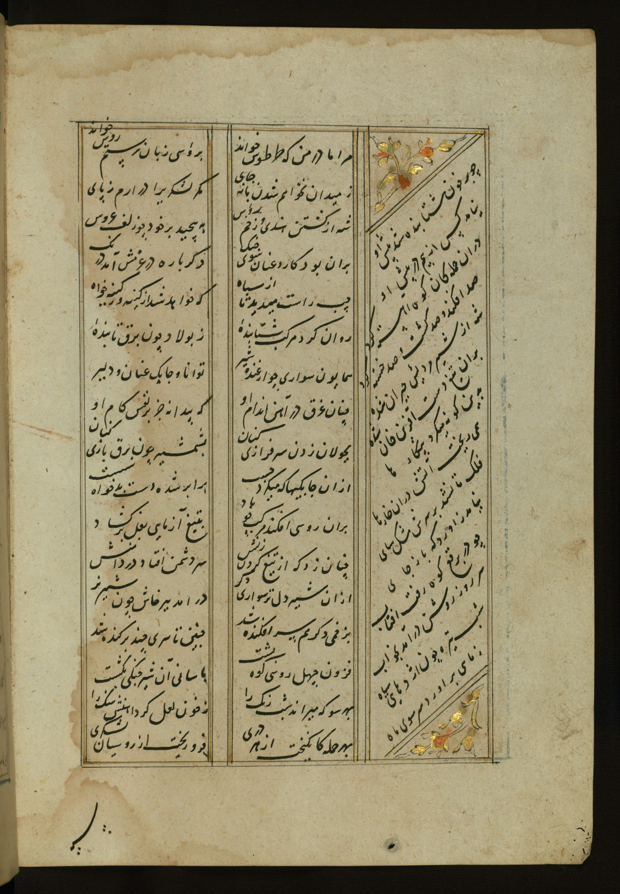 This copy of the Khamsah (quintet) of Niẓāmī Ganjavī (d. 605 AH / 1209 CE) was written by Abū Bakr Shāh ibn Ḥasan ibn ʿAlī al-Shahrastānī and illuminated by Jamāl al-Dīn ibn Muḥammad al-Ṣiddīqī al-Iṣfahānī between 892 AH / 1486 CE and 900 AH / 1494-5 CE. The manuscript opens with a double-page illuminated frontispiece with an inscription giving the title of the work and the name of the author (fols. 1b-2a). There are four illuminated titlepieces with the names of the individual poems and twenty-six repainted illustrations. According to evidence supplied by the colophons, the original binding was by the hand of Jamāl al-Dīn ibn Muḥammad al-Ṣiddīqī al-Iṣfahānī, as well. Unfortunately, it has not survived. The binding presently attached to the manuscript dates to the twelfth century AH / eighteenth CE.