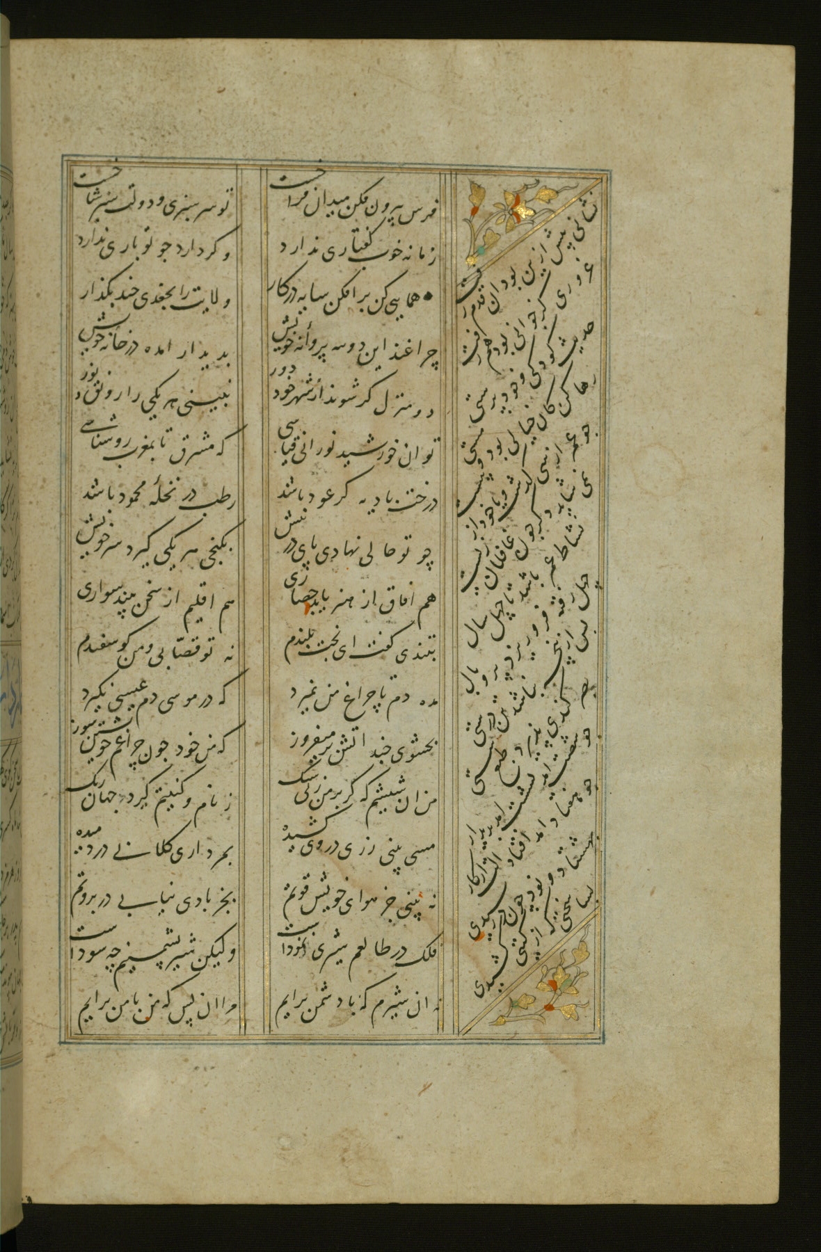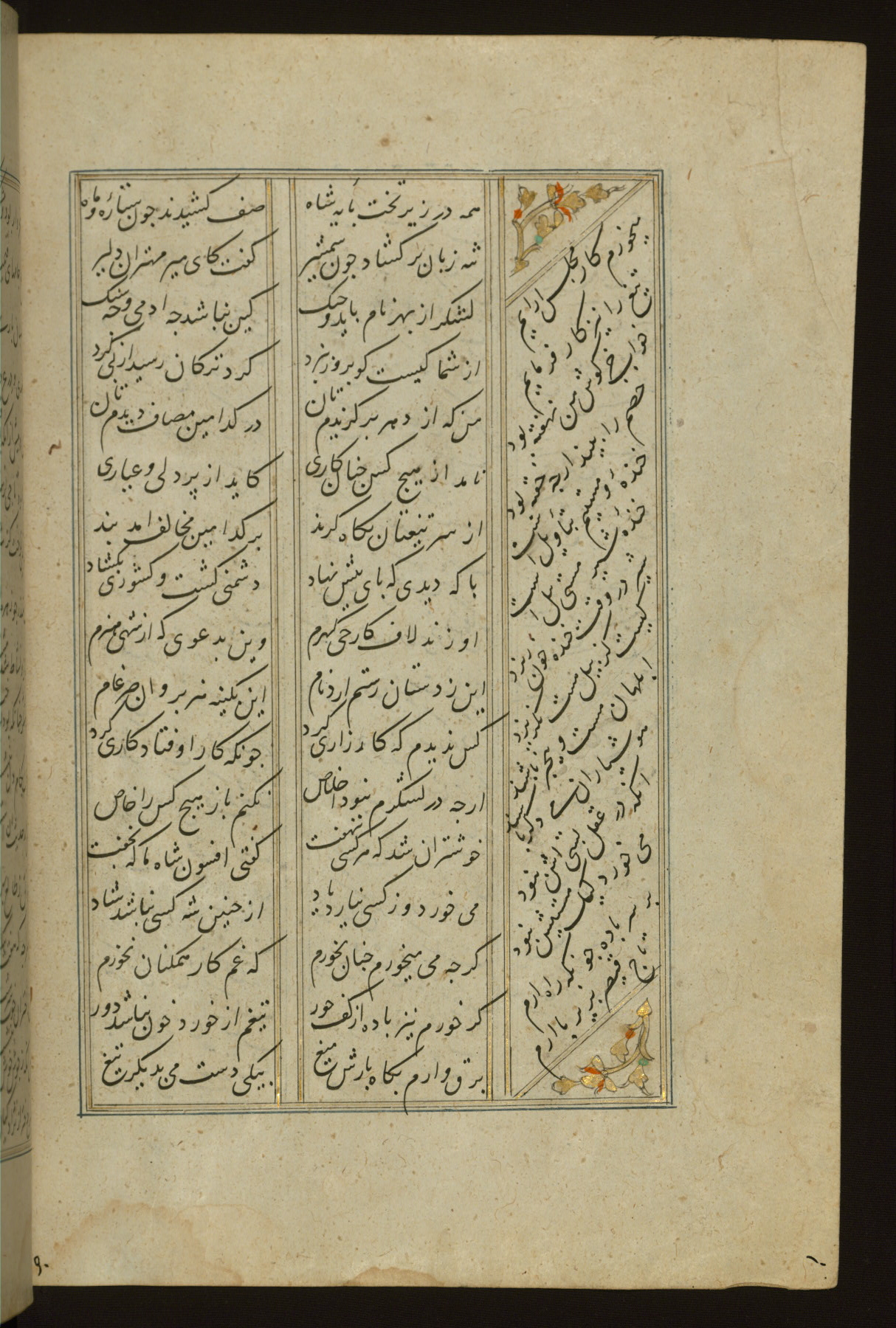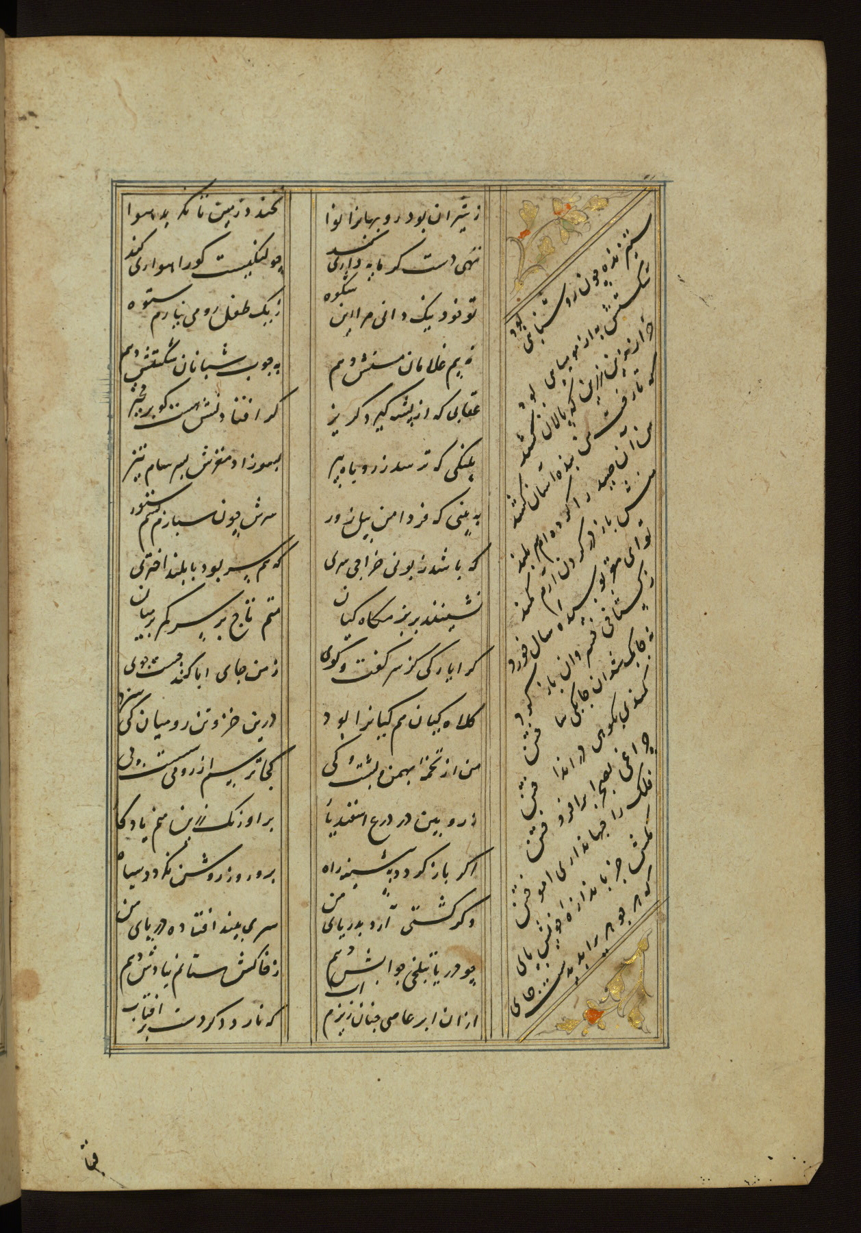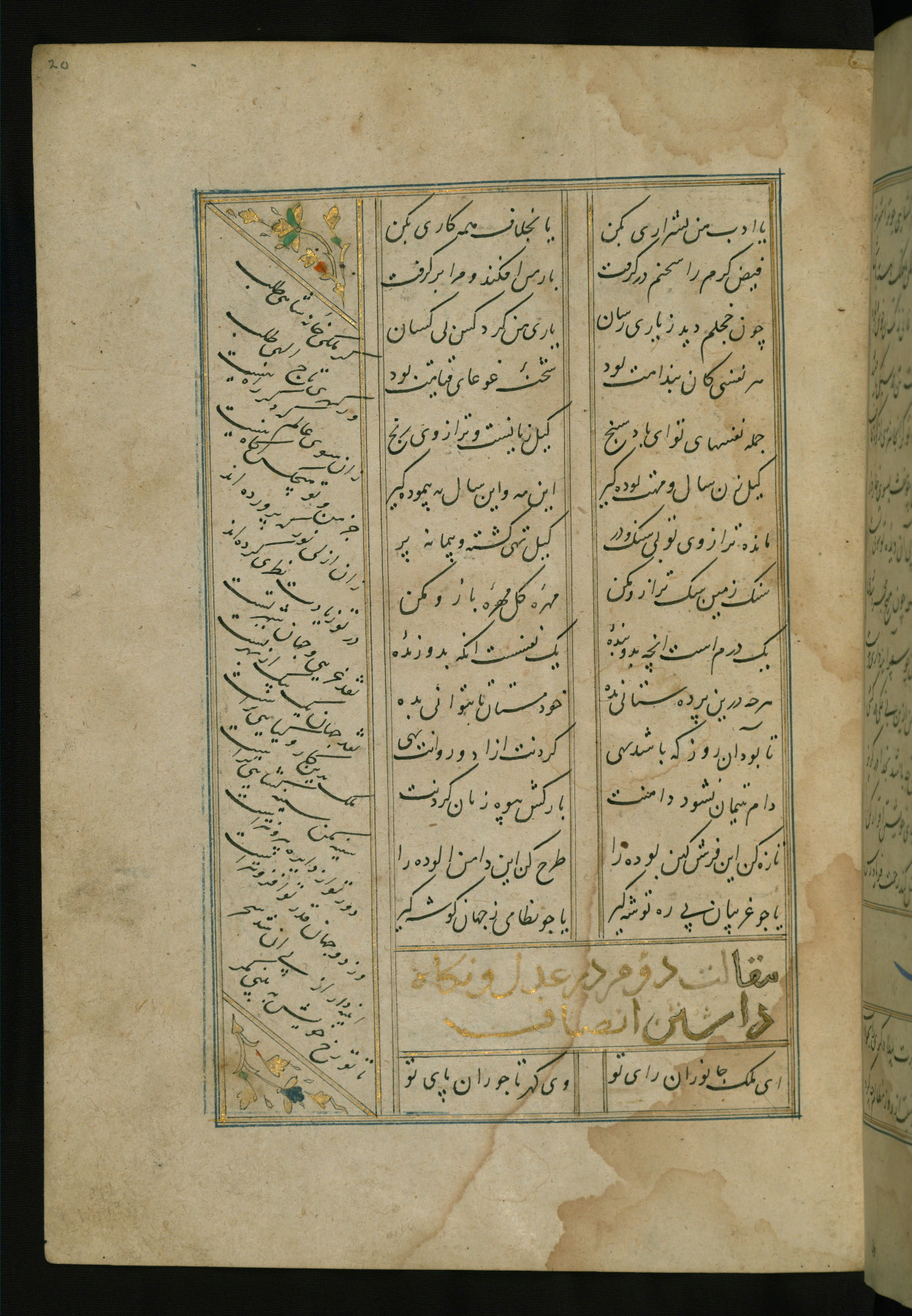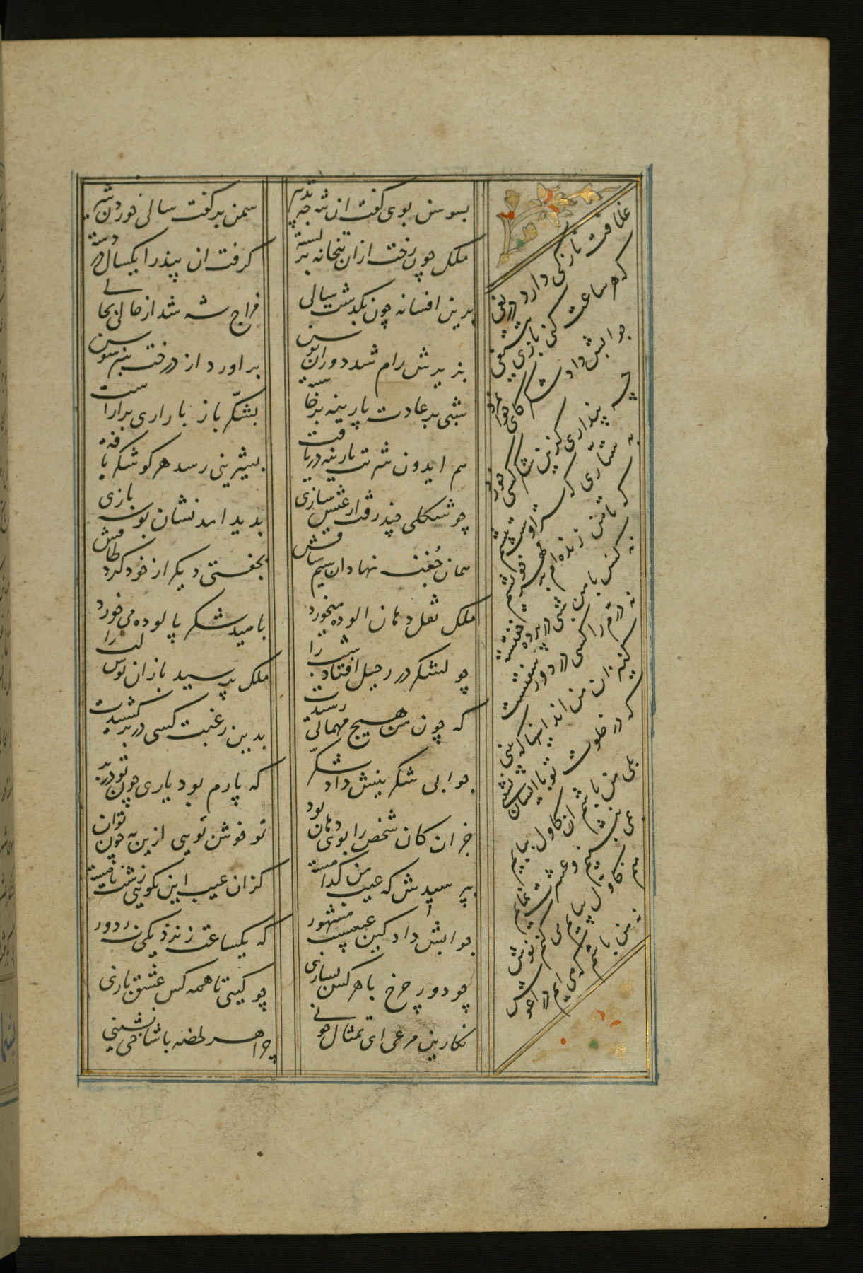 This copy of the Khamsah (quintet) of Niẓāmī Ganjavī (d. 605 AH / 1209 CE) was written by Abū Bakr Shāh ibn Ḥasan ibn ʿAlī al-Shahrastānī and illuminated by Jamāl al-Dīn ibn Muḥammad al-Ṣiddīqī al-Iṣfahānī between 892 AH / 1486 CE and 900 AH / 1494-5 CE. The manuscript opens with a double-page illuminated frontispiece with an inscription giving the title of the work and the name of the author (fols. 1b-2a). There are four illuminated titlepieces with the names of the individual poems and twenty-six repainted illustrations. According to evidence supplied by the colophons, the original binding was by the hand of Jamāl al-Dīn ibn Muḥammad al-Ṣiddīqī al-Iṣfahānī, as well. Unfortunately, it has not survived. The binding presently attached to the manuscript dates to the twelfth century AH / eighteenth CE.