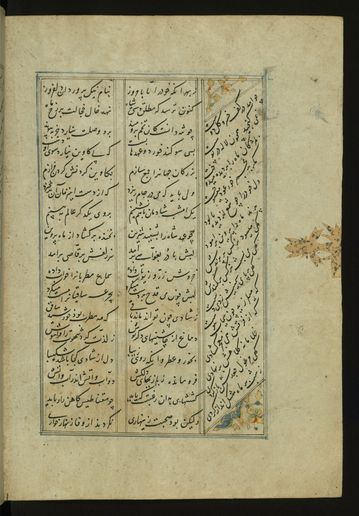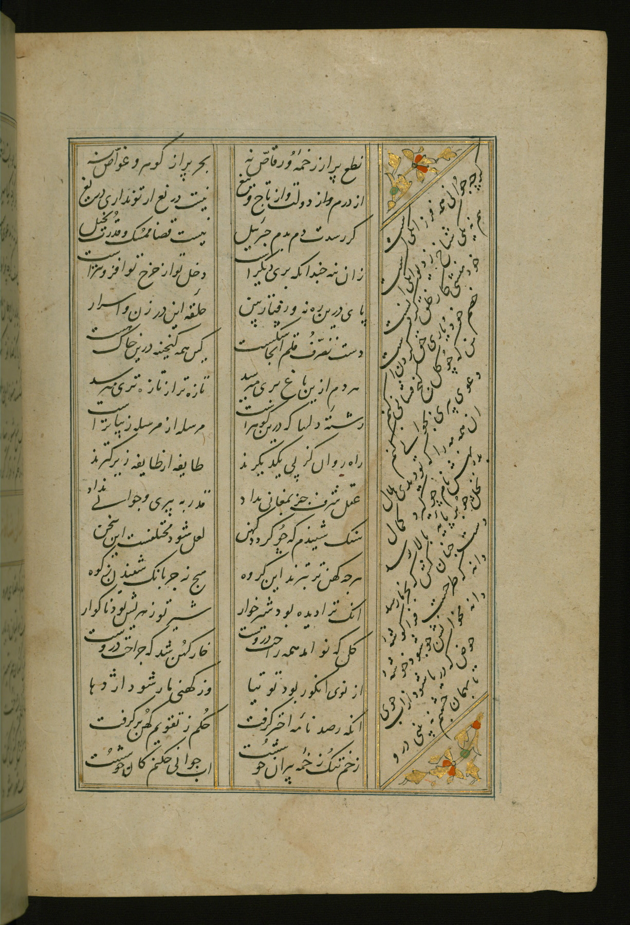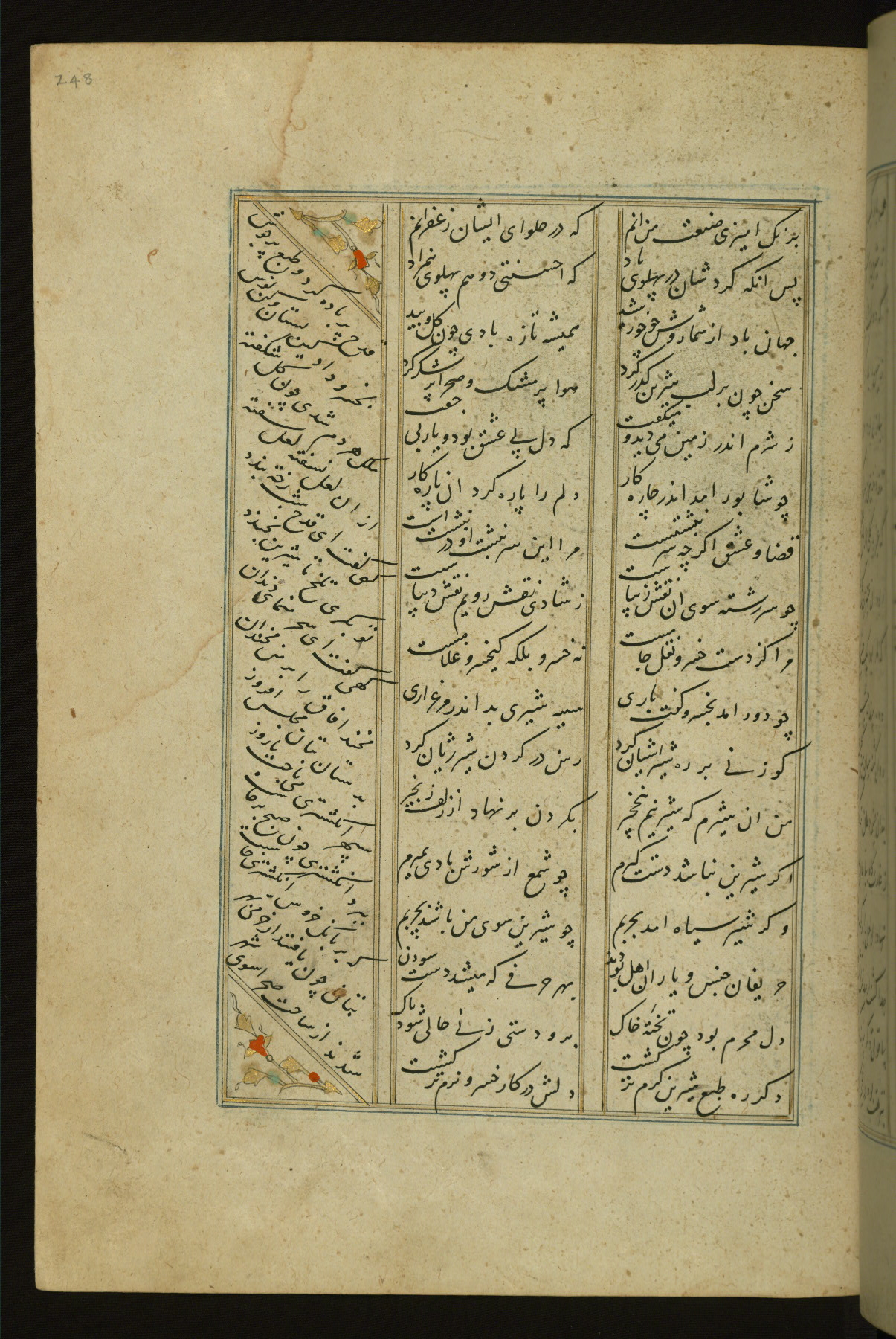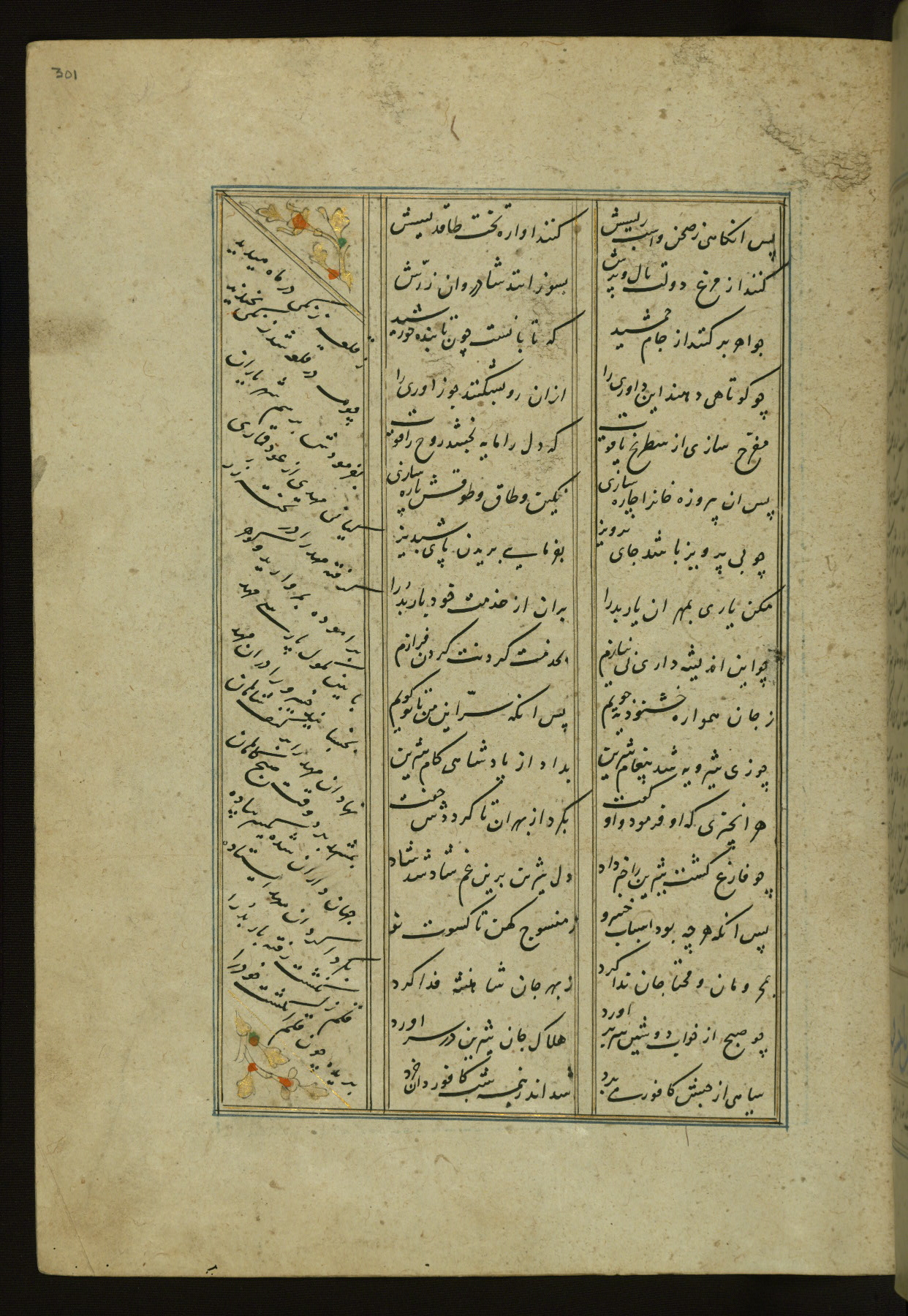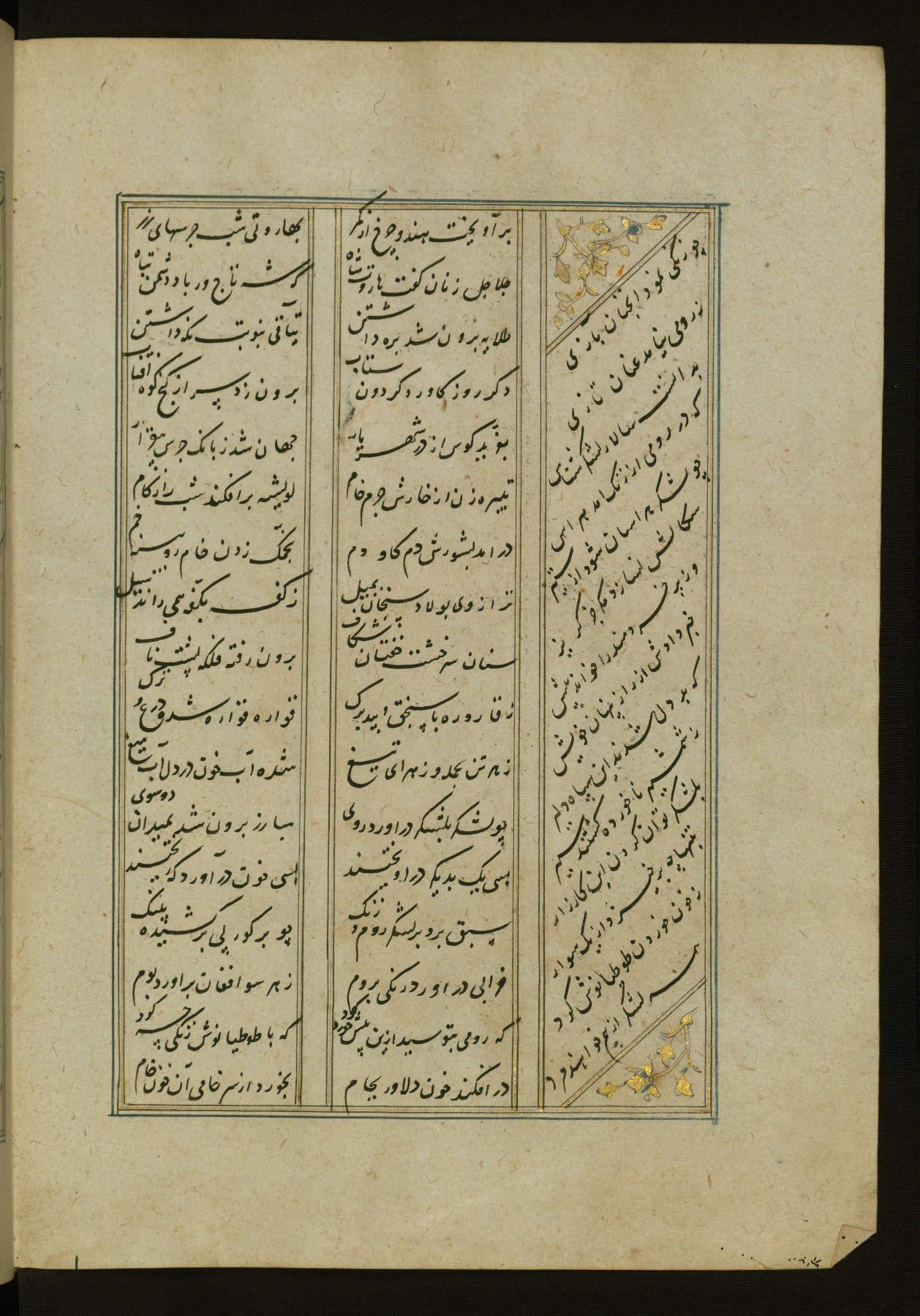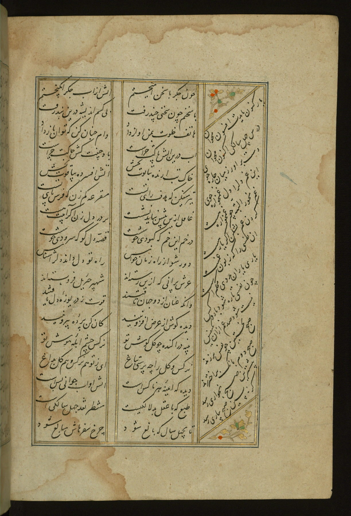 This copy of the Khamsah (quintet) of Niẓāmī Ganjavī (d. 605 AH / 1209 CE) was written by Abū Bakr Shāh ibn Ḥasan ibn ʿAlī al-Shahrastānī and illuminated by Jamāl al-Dīn ibn Muḥammad al-Ṣiddīqī al-Iṣfahānī between 892 AH / 1486 CE and 900 AH / 1494-5 CE. The manuscript opens with a double-page illuminated frontispiece with an inscription giving the title of the work and the name of the author (fols. 1b-2a). There are four illuminated titlepieces with the names of the individual poems and twenty-six repainted illustrations. According to evidence supplied by the colophons, the original binding was by the hand of Jamāl al-Dīn ibn Muḥammad al-Ṣiddīqī al-Iṣfahānī, as well. Unfortunately, it has not survived. The binding presently attached to the manuscript dates to the twelfth century AH / eighteenth CE.