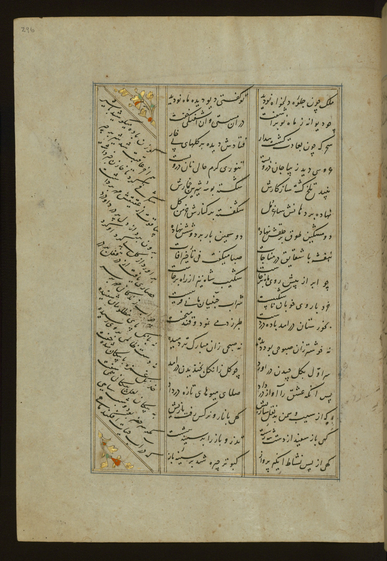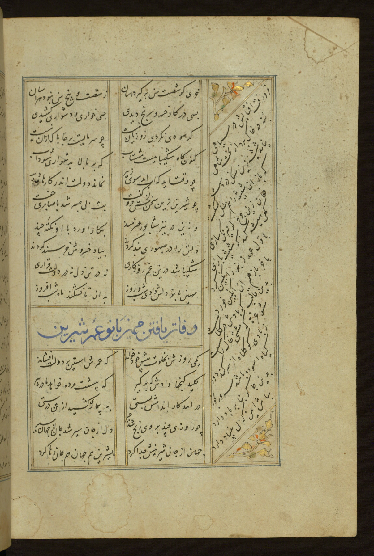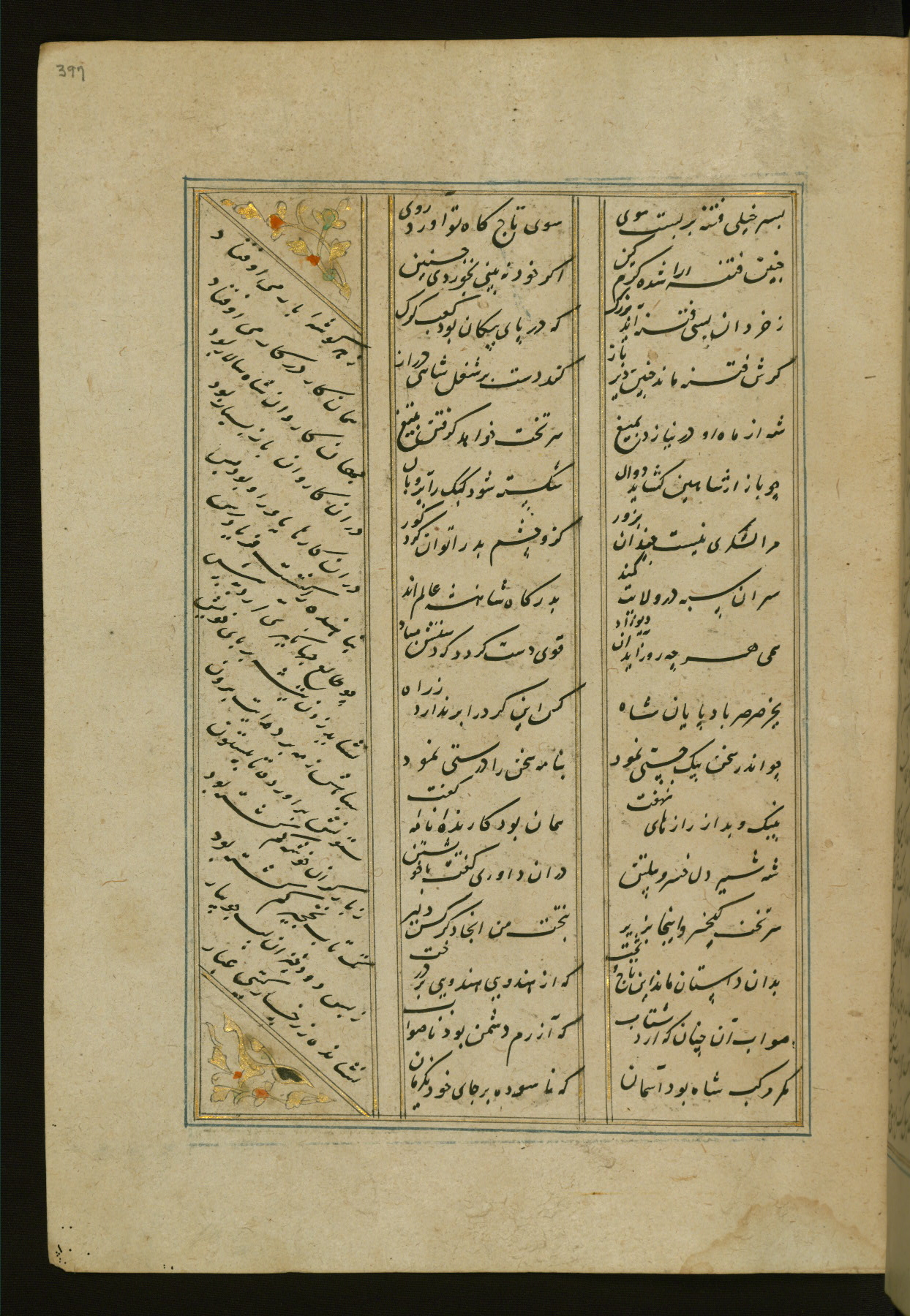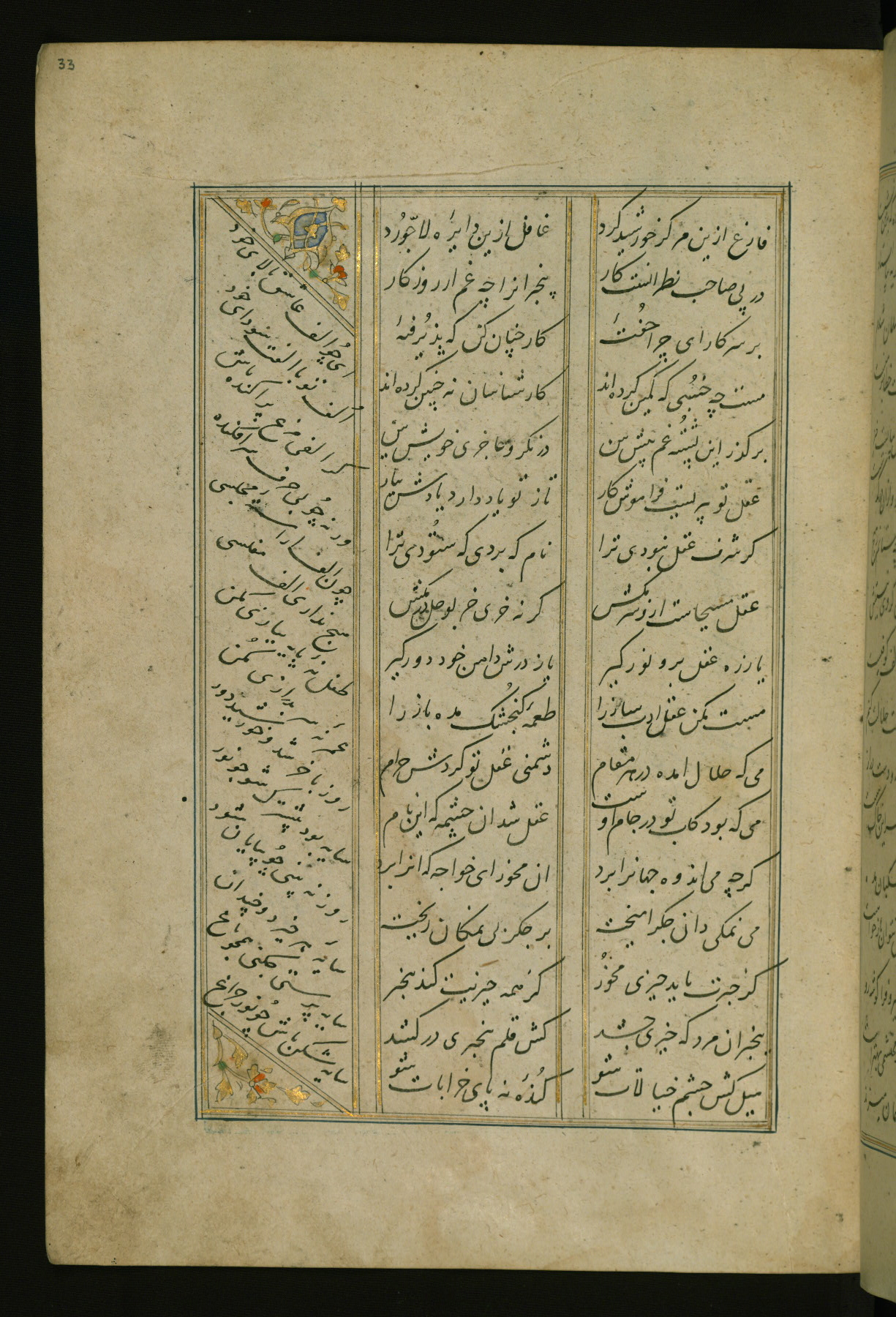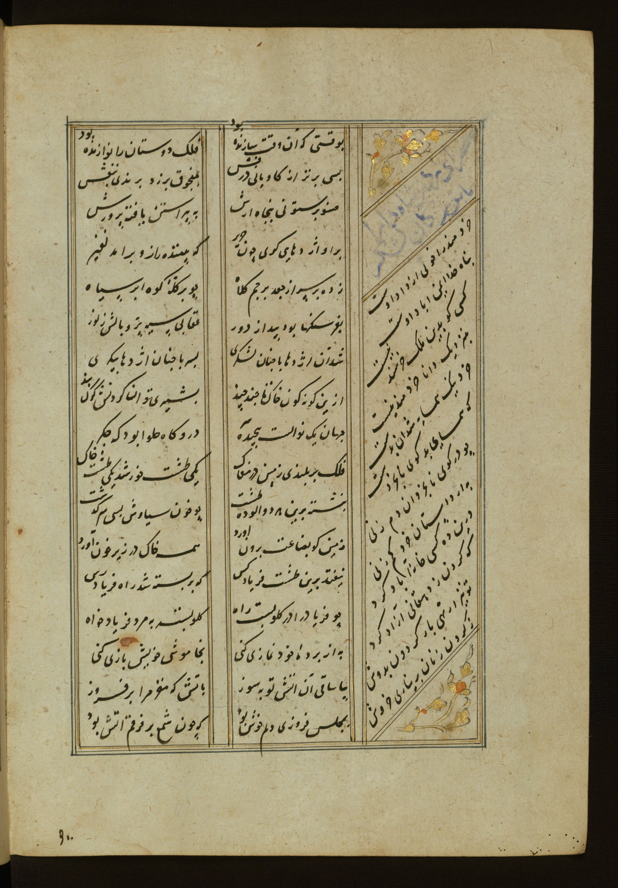 This copy of the Khamsah (quintet) of Niẓāmī Ganjavī (d. 605 AH / 1209 CE) was written by Abū Bakr Shāh ibn Ḥasan ibn ʿAlī al-Shahrastānī and illuminated by Jamāl al-Dīn ibn Muḥammad al-Ṣiddīqī al-Iṣfahānī between 892 AH / 1486 CE and 900 AH / 1494-5 CE. The manuscript opens with a double-page illuminated frontispiece with an inscription giving the title of the work and the name of the author (fols. 1b-2a). There are four illuminated titlepieces with the names of the individual poems and twenty-six repainted illustrations. According to evidence supplied by the colophons, the original binding was by the hand of Jamāl al-Dīn ibn Muḥammad al-Ṣiddīqī al-Iṣfahānī, as well. Unfortunately, it has not survived. The binding presently attached to the manuscript dates to the twelfth century AH / eighteenth CE.