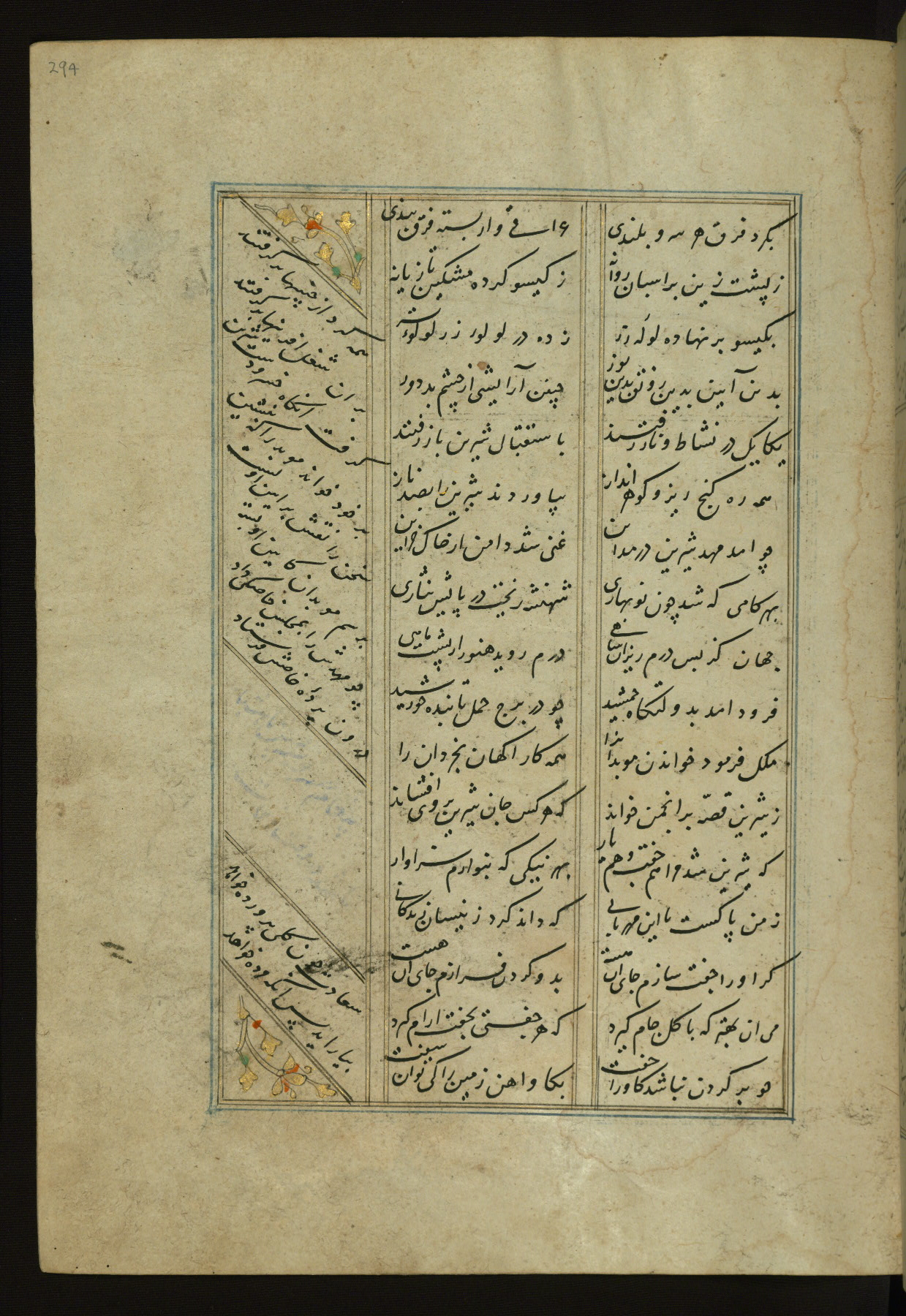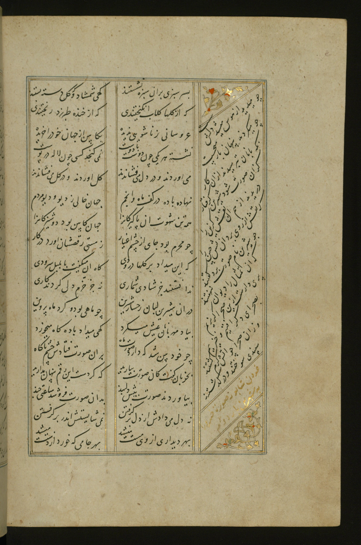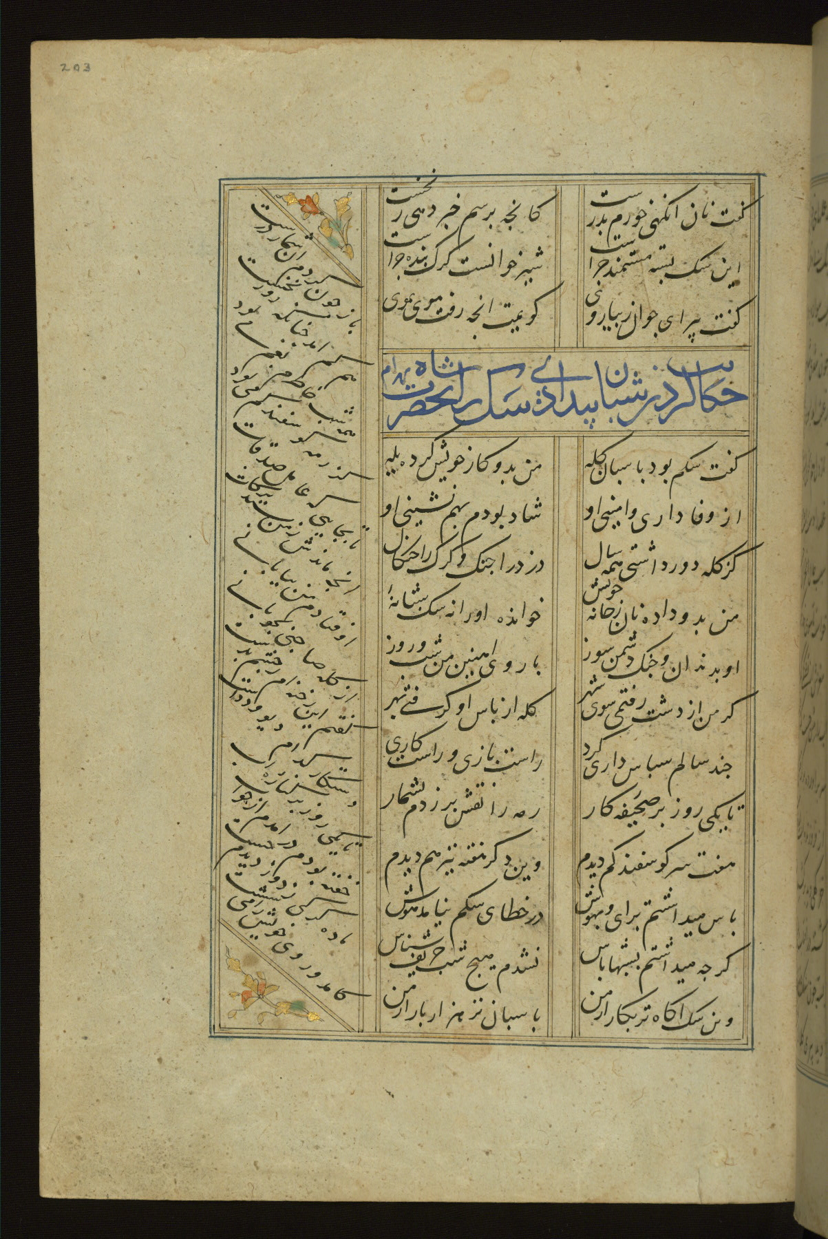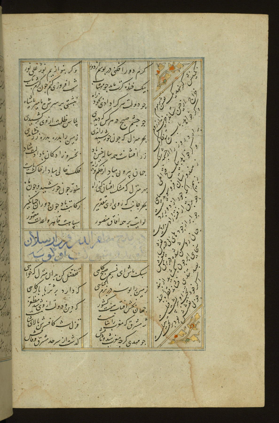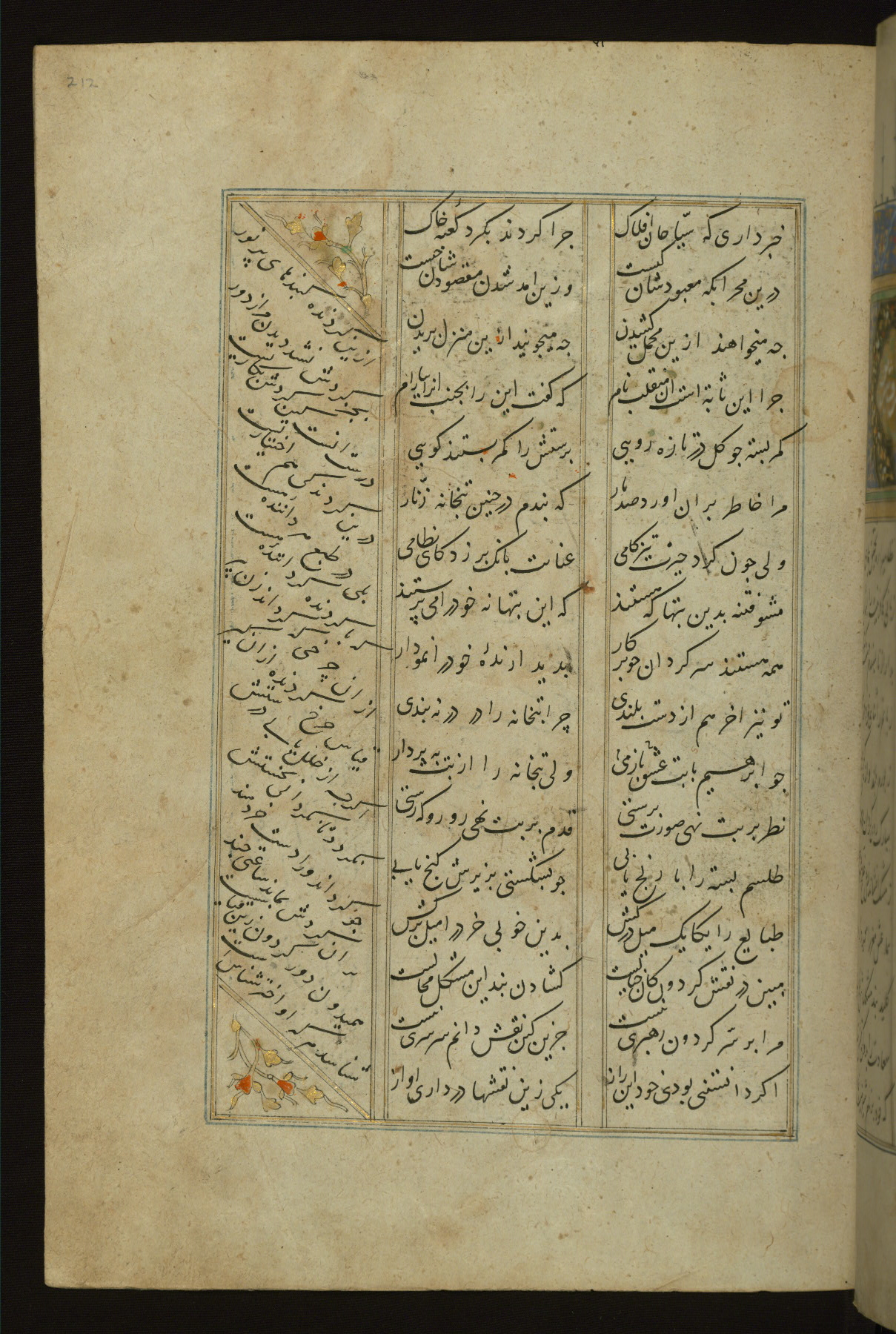 This copy of the Khamsah (quintet) of Niẓāmī Ganjavī (d. 605 AH / 1209 CE) was written by Abū Bakr Shāh ibn Ḥasan ibn ʿAlī al-Shahrastānī and illuminated by Jamāl al-Dīn ibn Muḥammad al-Ṣiddīqī al-Iṣfahānī between 892 AH / 1486 CE and 900 AH / 1494-5 CE. The manuscript opens with a double-page illuminated frontispiece with an inscription giving the title of the work and the name of the author (fols. 1b-2a). There are four illuminated titlepieces with the names of the individual poems and twenty-six repainted illustrations. According to evidence supplied by the colophons, the original binding was by the hand of Jamāl al-Dīn ibn Muḥammad al-Ṣiddīqī al-Iṣfahānī, as well. Unfortunately, it has not survived. The binding presently attached to the manuscript dates to the twelfth century AH / eighteenth CE.
