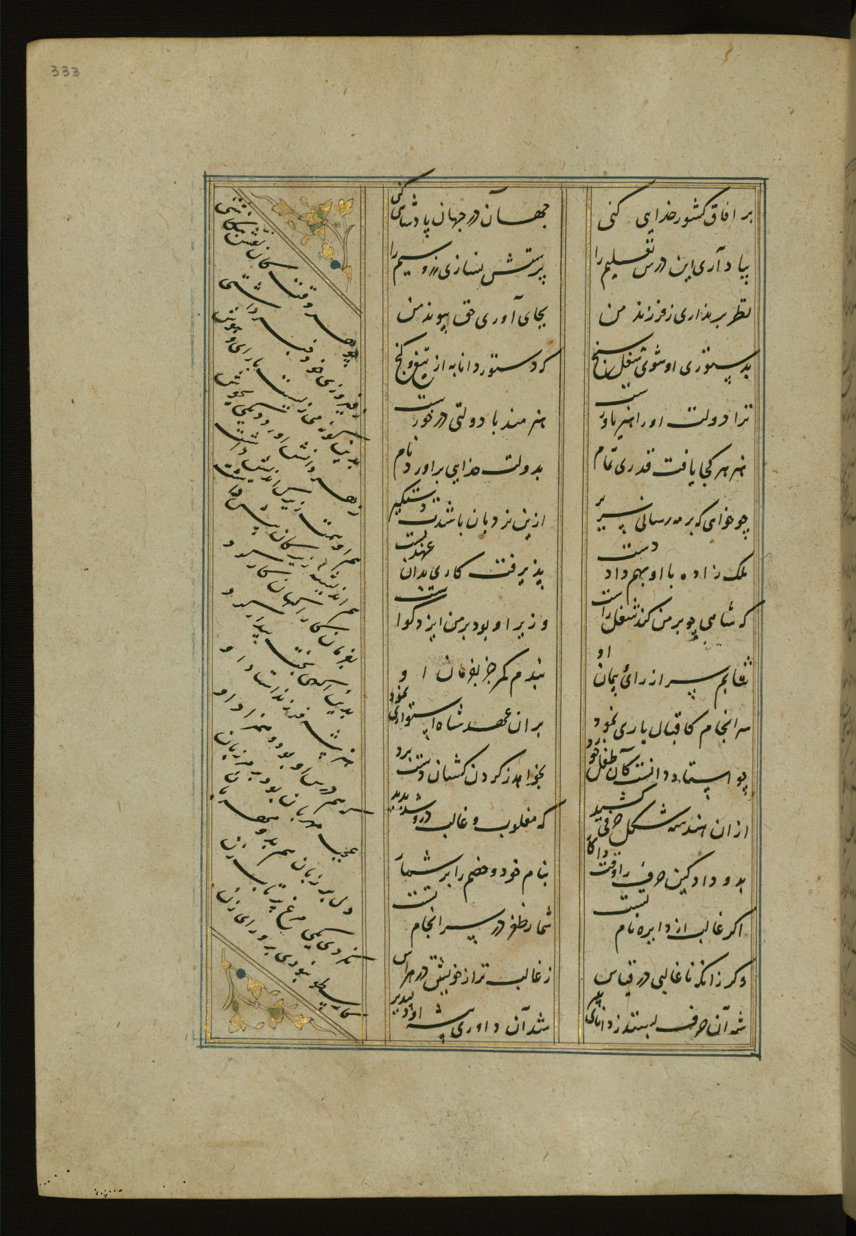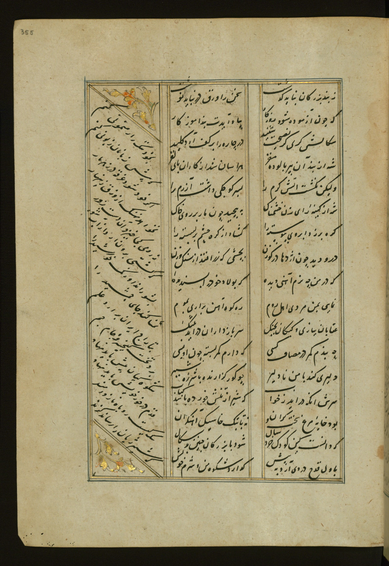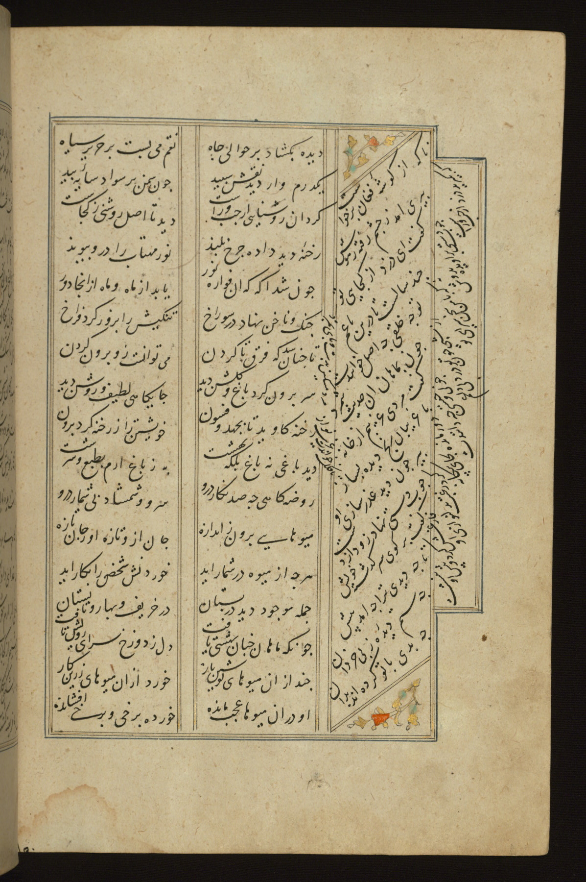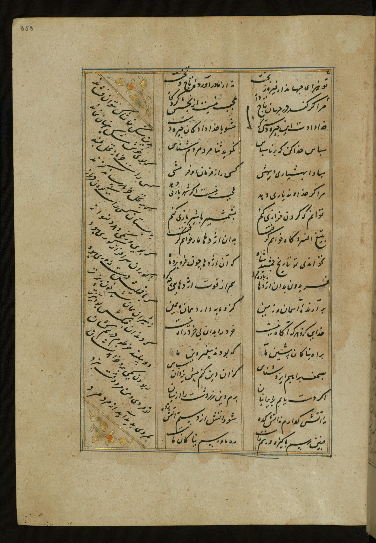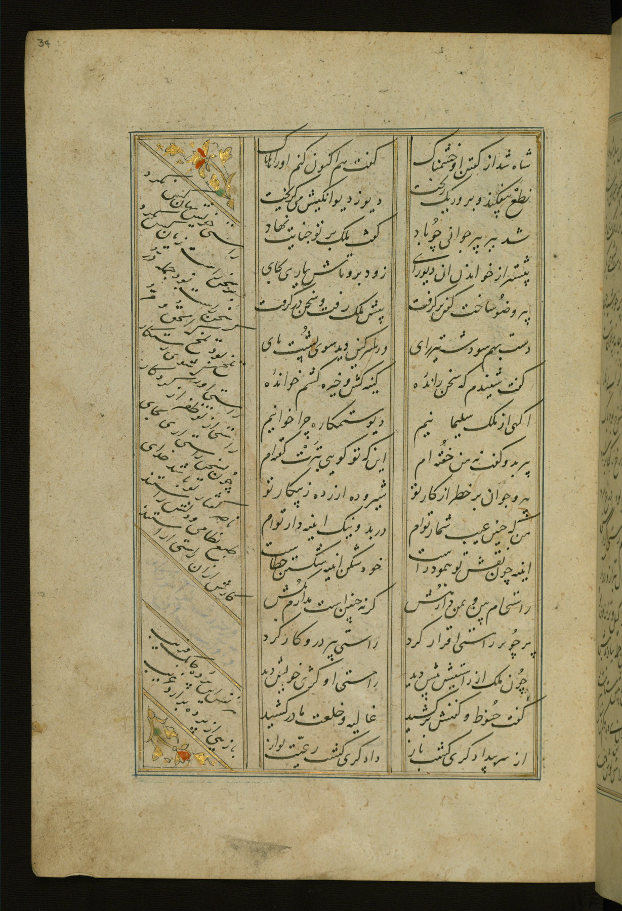 This copy of the Khamsah (quintet) of Niẓāmī Ganjavī (d. 605 AH / 1209 CE) was written by Abū Bakr Shāh ibn Ḥasan ibn ʿAlī al-Shahrastānī and illuminated by Jamāl al-Dīn ibn Muḥammad al-Ṣiddīqī al-Iṣfahānī between 892 AH / 1486 CE and 900 AH / 1494-5 CE. The manuscript opens with a double-page illuminated frontispiece with an inscription giving the title of the work and the name of the author (fols. 1b-2a). There are four illuminated titlepieces with the names of the individual poems and twenty-six repainted illustrations. According to evidence supplied by the colophons, the original binding was by the hand of Jamāl al-Dīn ibn Muḥammad al-Ṣiddīqī al-Iṣfahānī, as well. Unfortunately, it has not survived. The binding presently attached to the manuscript dates to the twelfth century AH / eighteenth CE.