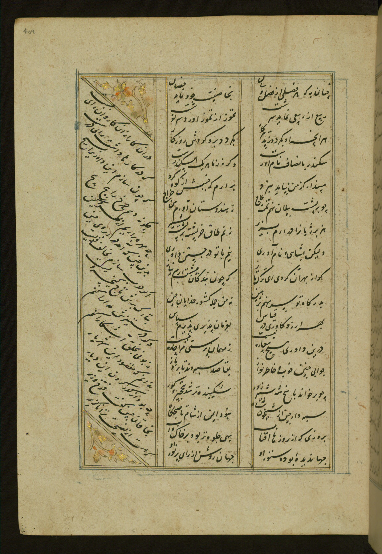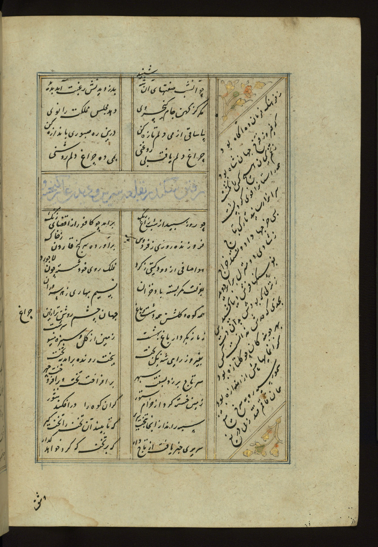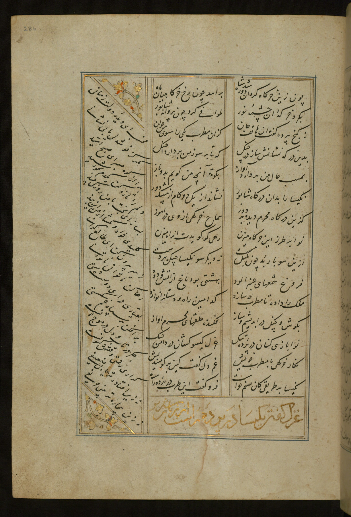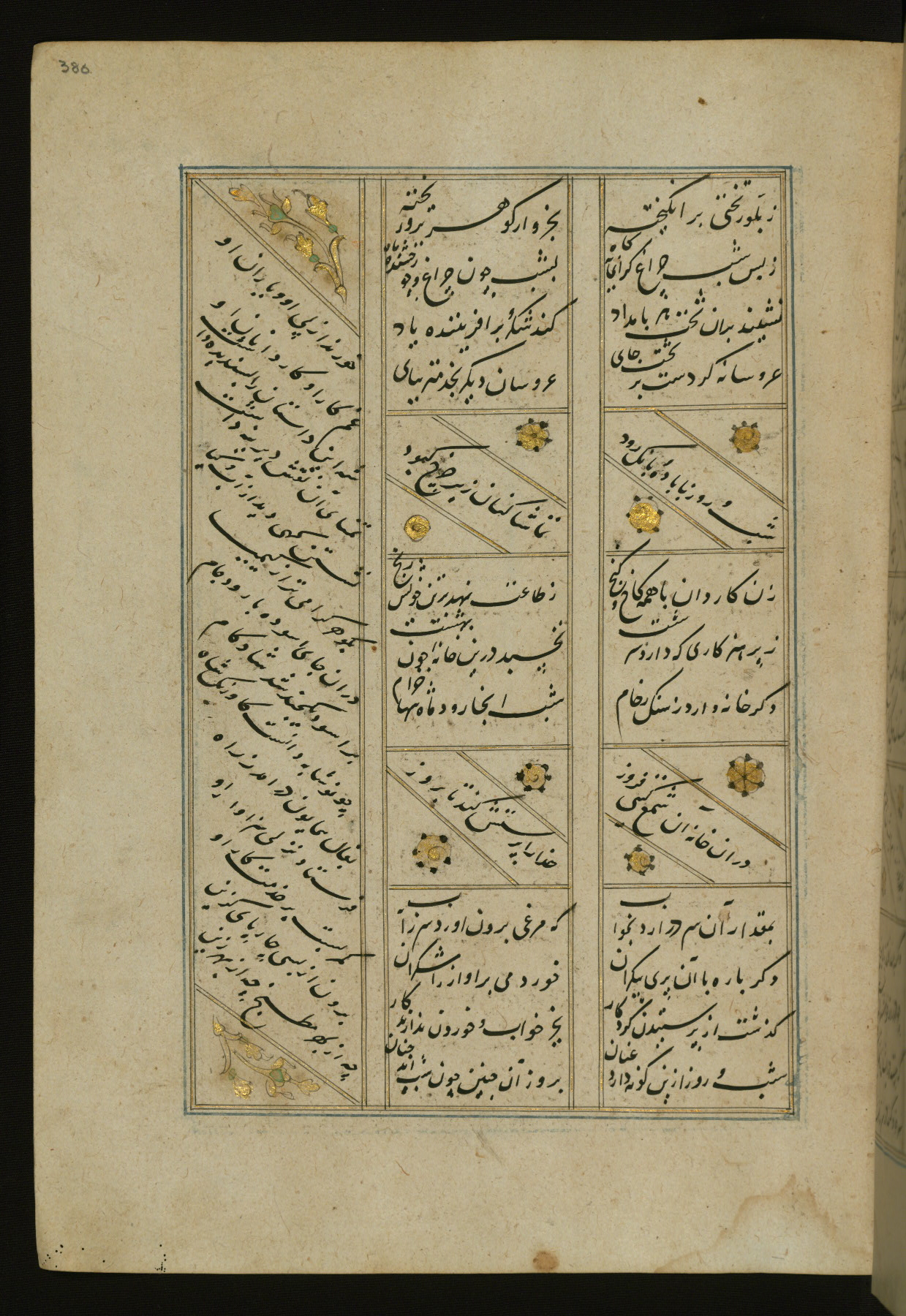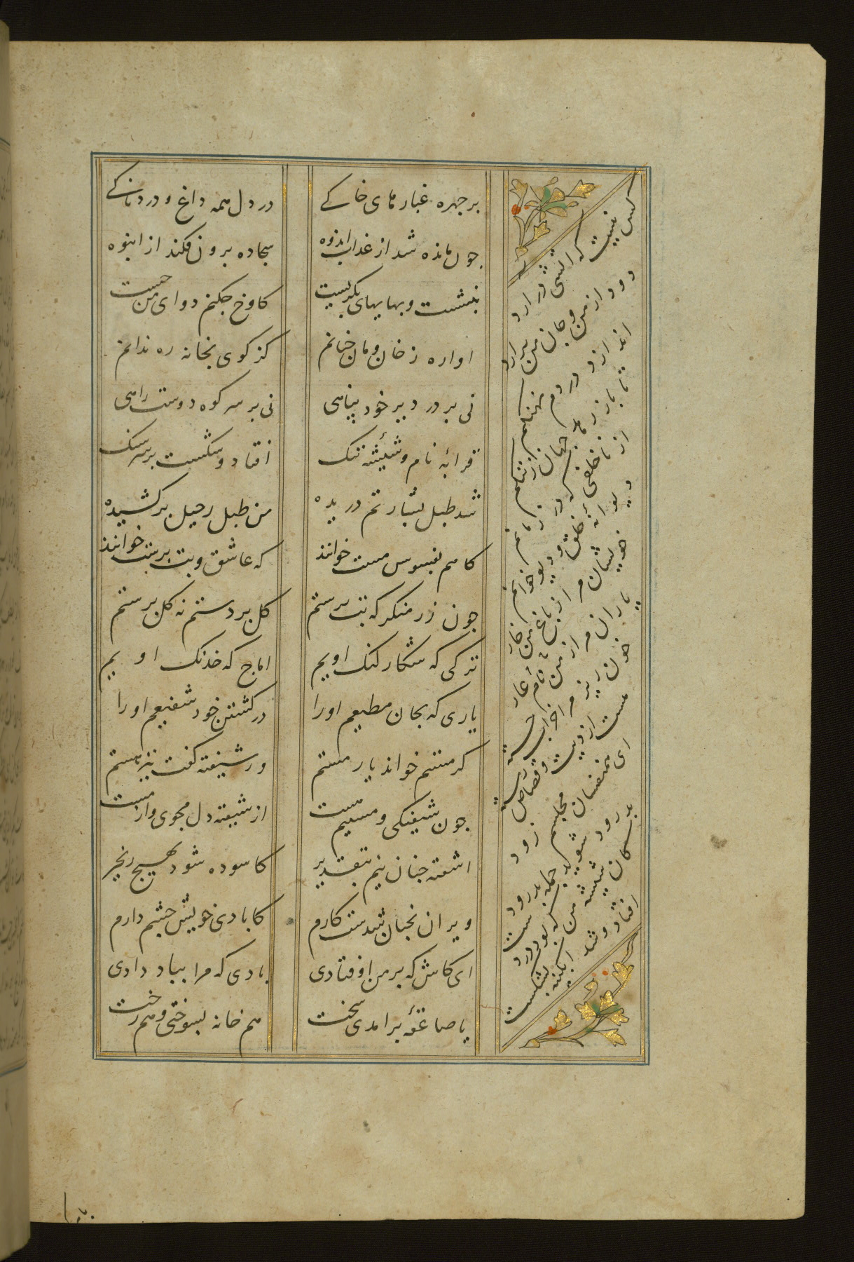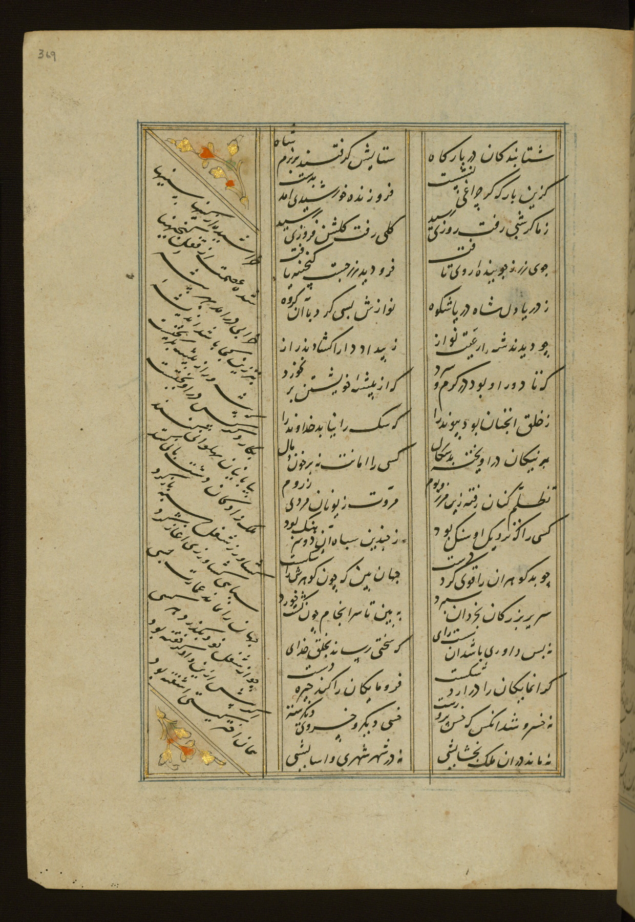 This copy of the Khamsah (quintet) of Niẓāmī Ganjavī (d. 605 AH / 1209 CE) was written by Abū Bakr Shāh ibn Ḥasan ibn ʿAlī al-Shahrastānī and illuminated by Jamāl al-Dīn ibn Muḥammad al-Ṣiddīqī al-Iṣfahānī between 892 AH / 1486 CE and 900 AH / 1494-5 CE. The manuscript opens with a double-page illuminated frontispiece with an inscription giving the title of the work and the name of the author (fols. 1b-2a). There are four illuminated titlepieces with the names of the individual poems and twenty-six repainted illustrations. According to evidence supplied by the colophons, the original binding was by the hand of Jamāl al-Dīn ibn Muḥammad al-Ṣiddīqī al-Iṣfahānī, as well. Unfortunately, it has not survived. The binding presently attached to the manuscript dates to the twelfth century AH / eighteenth CE.