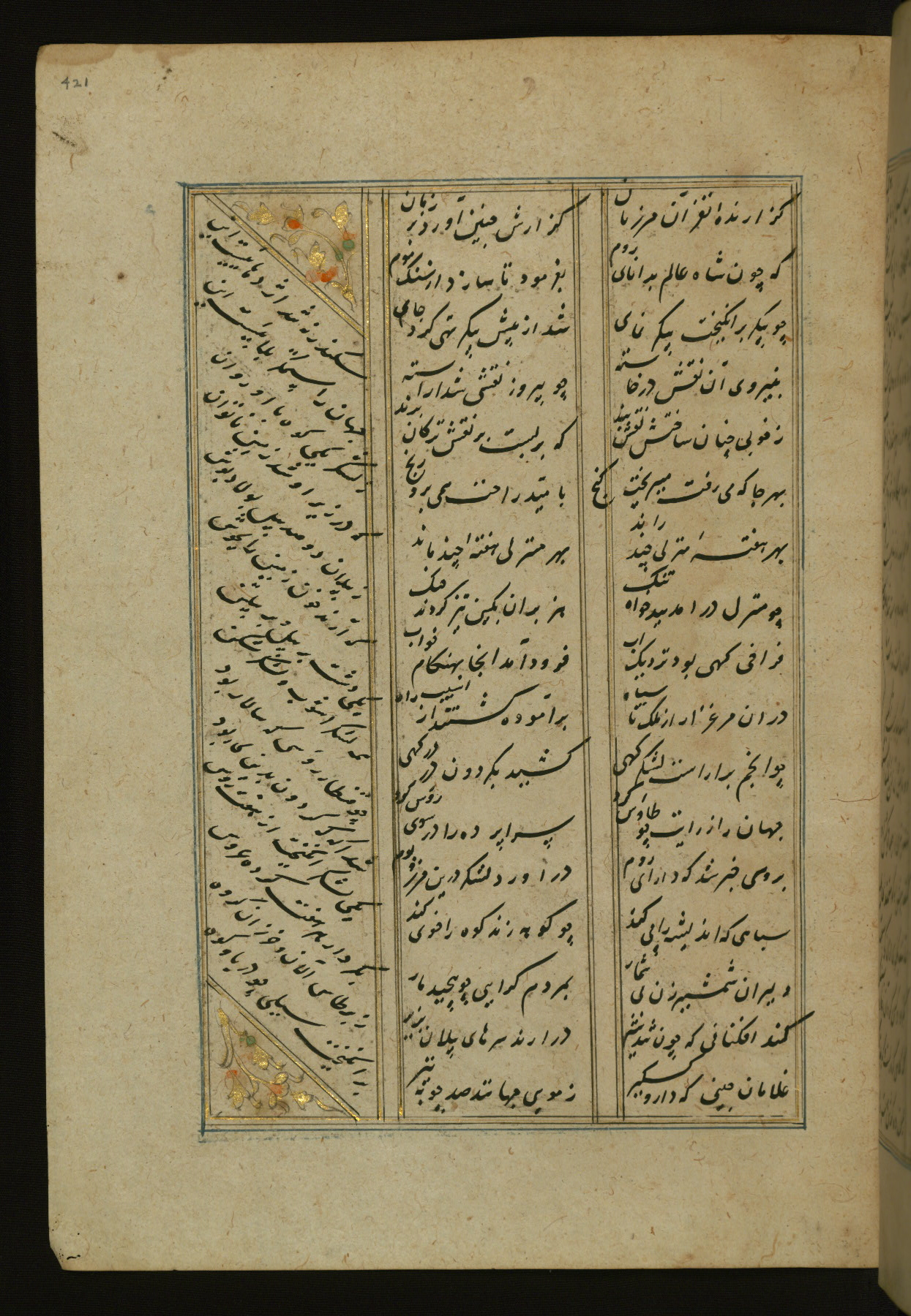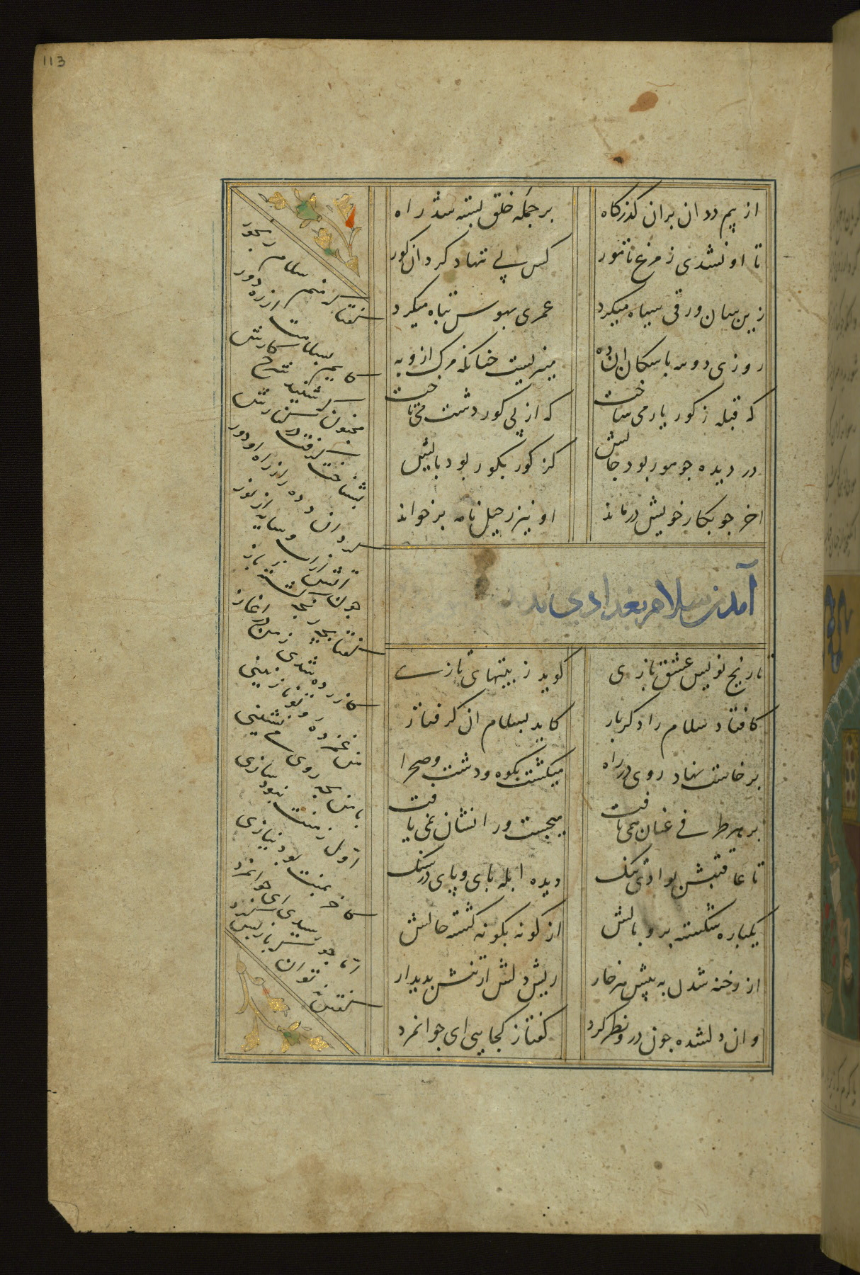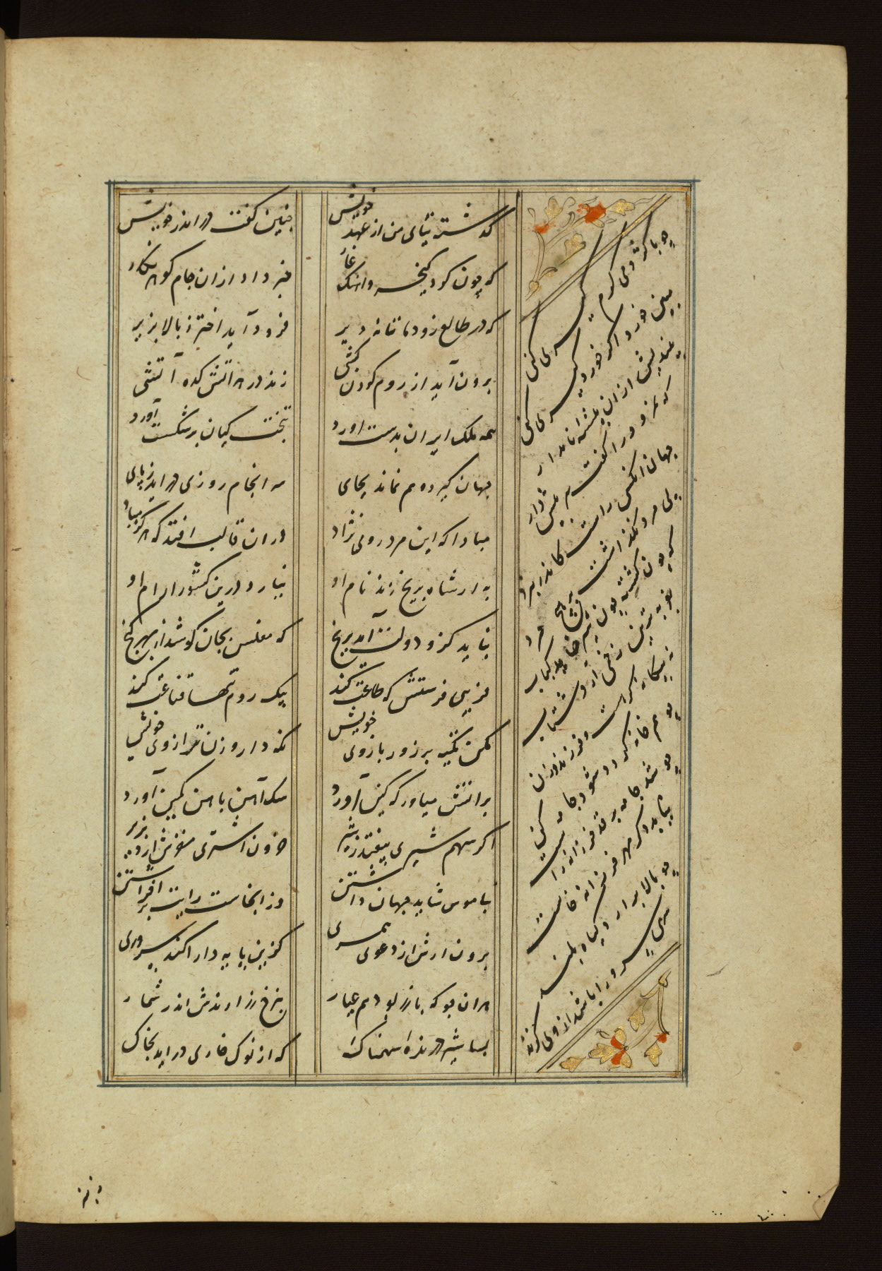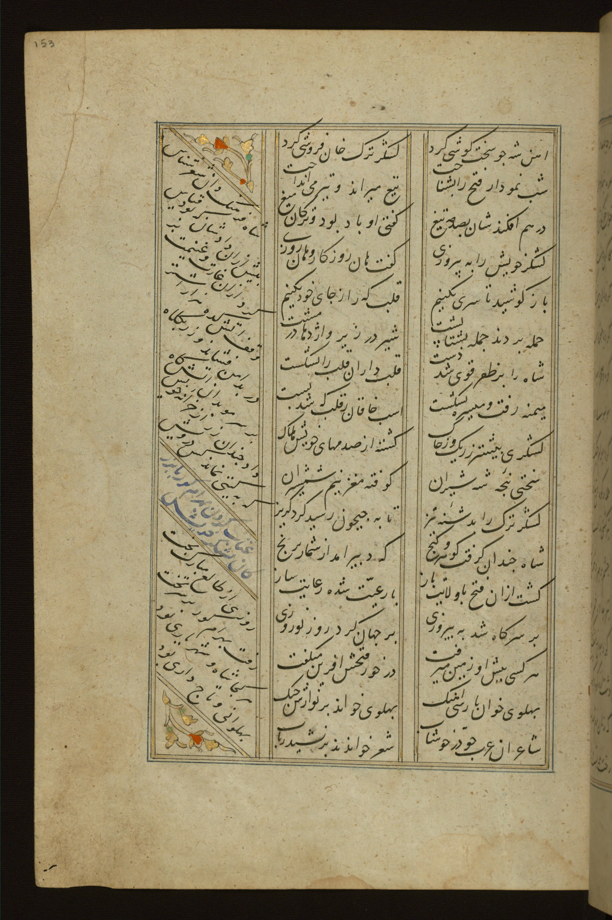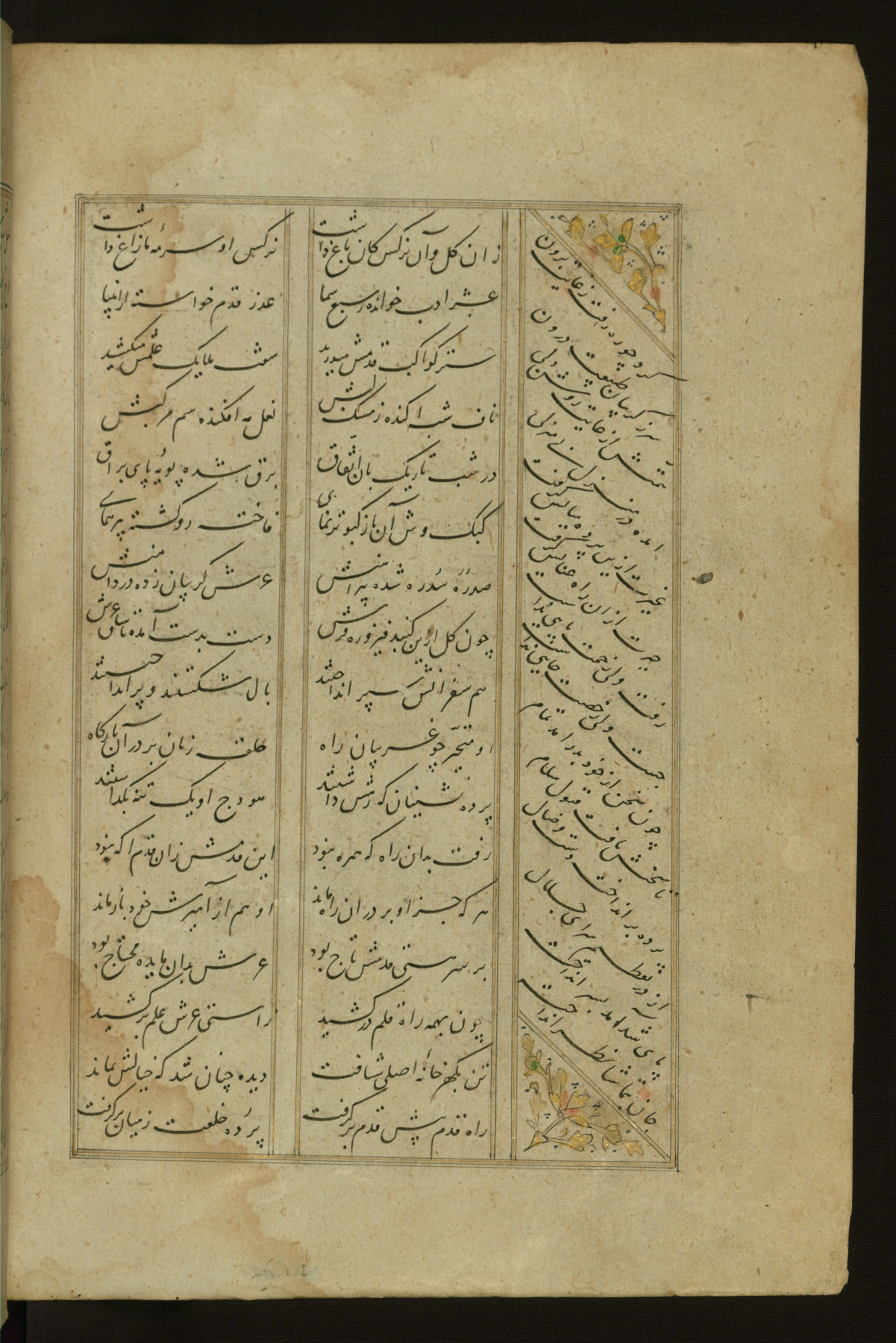 This copy of the Khamsah (quintet) of Niẓāmī Ganjavī (d. 605 AH / 1209 CE) was written by Abū Bakr Shāh ibn Ḥasan ibn ʿAlī al-Shahrastānī and illuminated by Jamāl al-Dīn ibn Muḥammad al-Ṣiddīqī al-Iṣfahānī between 892 AH / 1486 CE and 900 AH / 1494-5 CE. The manuscript opens with a double-page illuminated frontispiece with an inscription giving the title of the work and the name of the author (fols. 1b-2a). There are four illuminated titlepieces with the names of the individual poems and twenty-six repainted illustrations. According to evidence supplied by the colophons, the original binding was by the hand of Jamāl al-Dīn ibn Muḥammad al-Ṣiddīqī al-Iṣfahānī, as well. Unfortunately, it has not survived. The binding presently attached to the manuscript dates to the twelfth century AH / eighteenth CE.