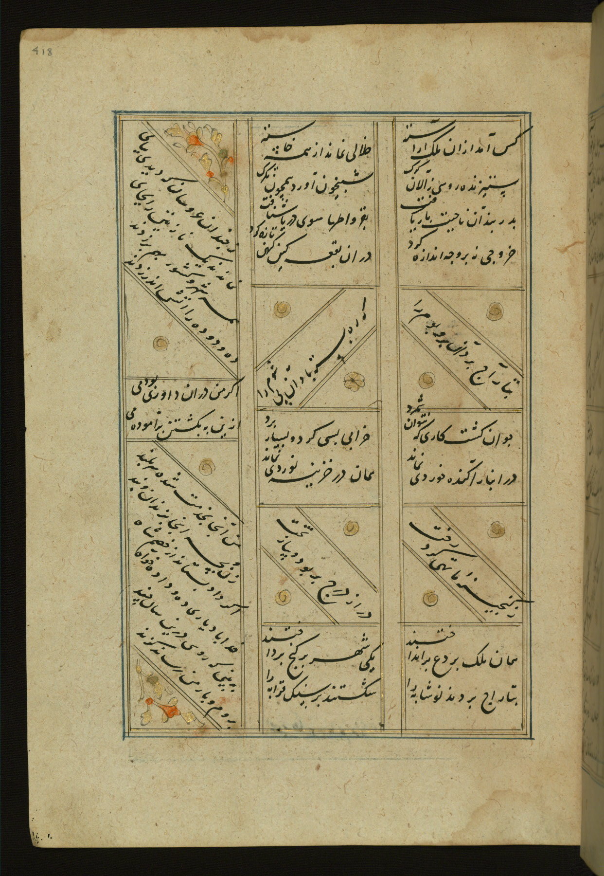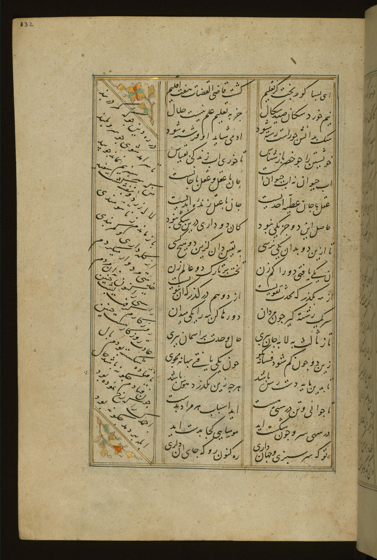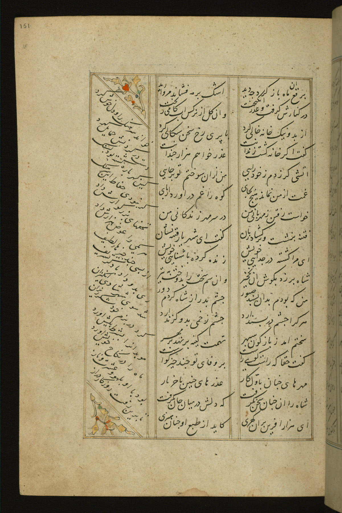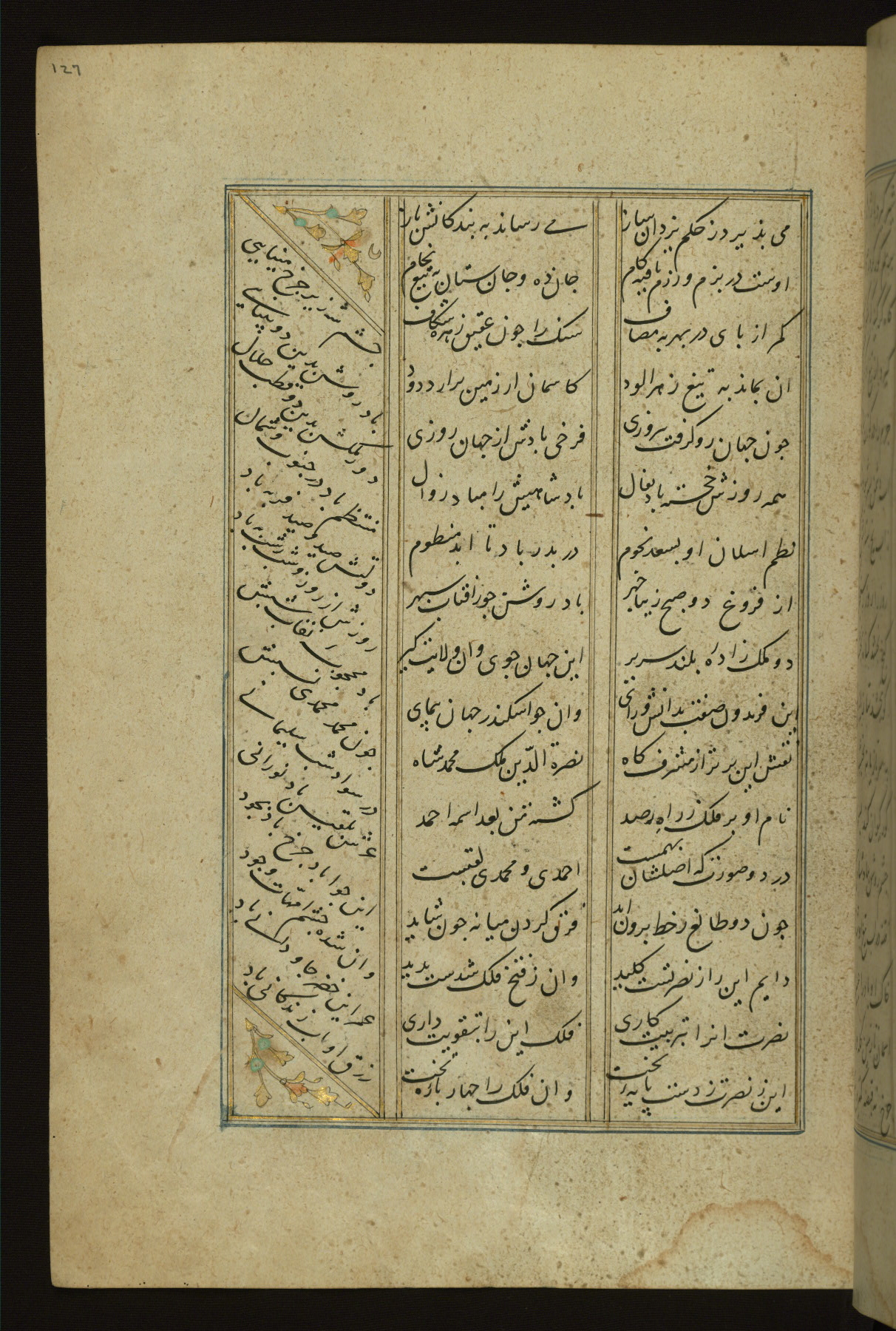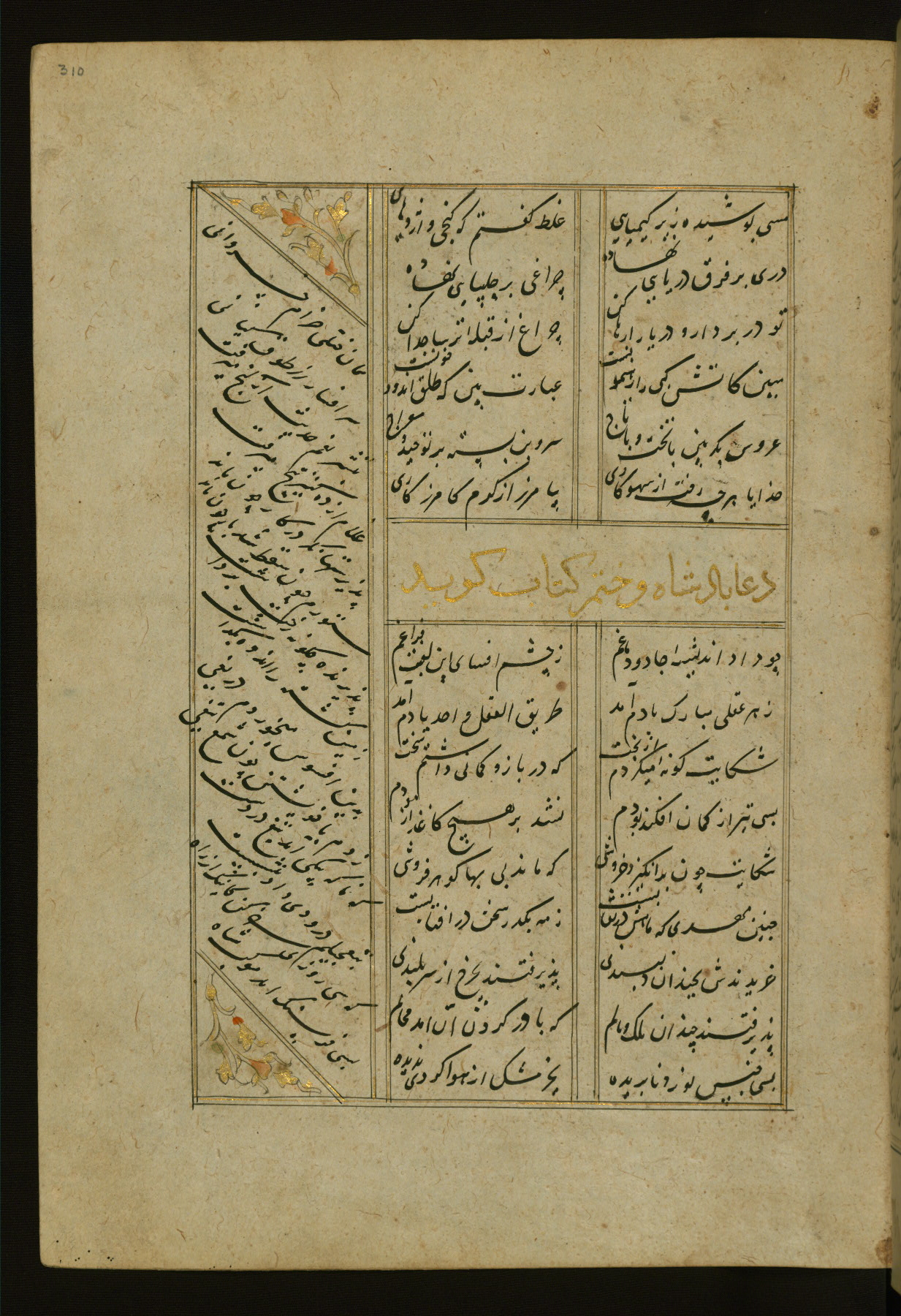 This copy of the Khamsah (quintet) of Niẓāmī Ganjavī (d. 605 AH / 1209 CE) was written by Abū Bakr Shāh ibn Ḥasan ibn ʿAlī al-Shahrastānī and illuminated by Jamāl al-Dīn ibn Muḥammad al-Ṣiddīqī al-Iṣfahānī between 892 AH / 1486 CE and 900 AH / 1494-5 CE. The manuscript opens with a double-page illuminated frontispiece with an inscription giving the title of the work and the name of the author (fols. 1b-2a). There are four illuminated titlepieces with the names of the individual poems and twenty-six repainted illustrations. According to evidence supplied by the colophons, the original binding was by the hand of Jamāl al-Dīn ibn Muḥammad al-Ṣiddīqī al-Iṣfahānī, as well. Unfortunately, it has not survived. The binding presently attached to the manuscript dates to the twelfth century AH / eighteenth CE.