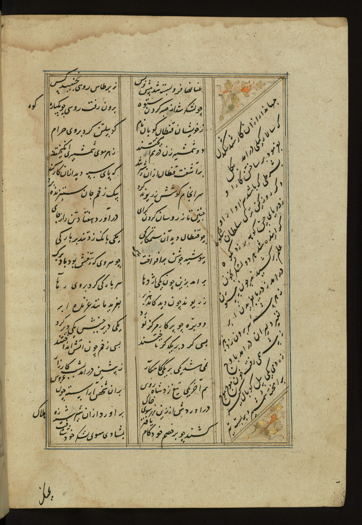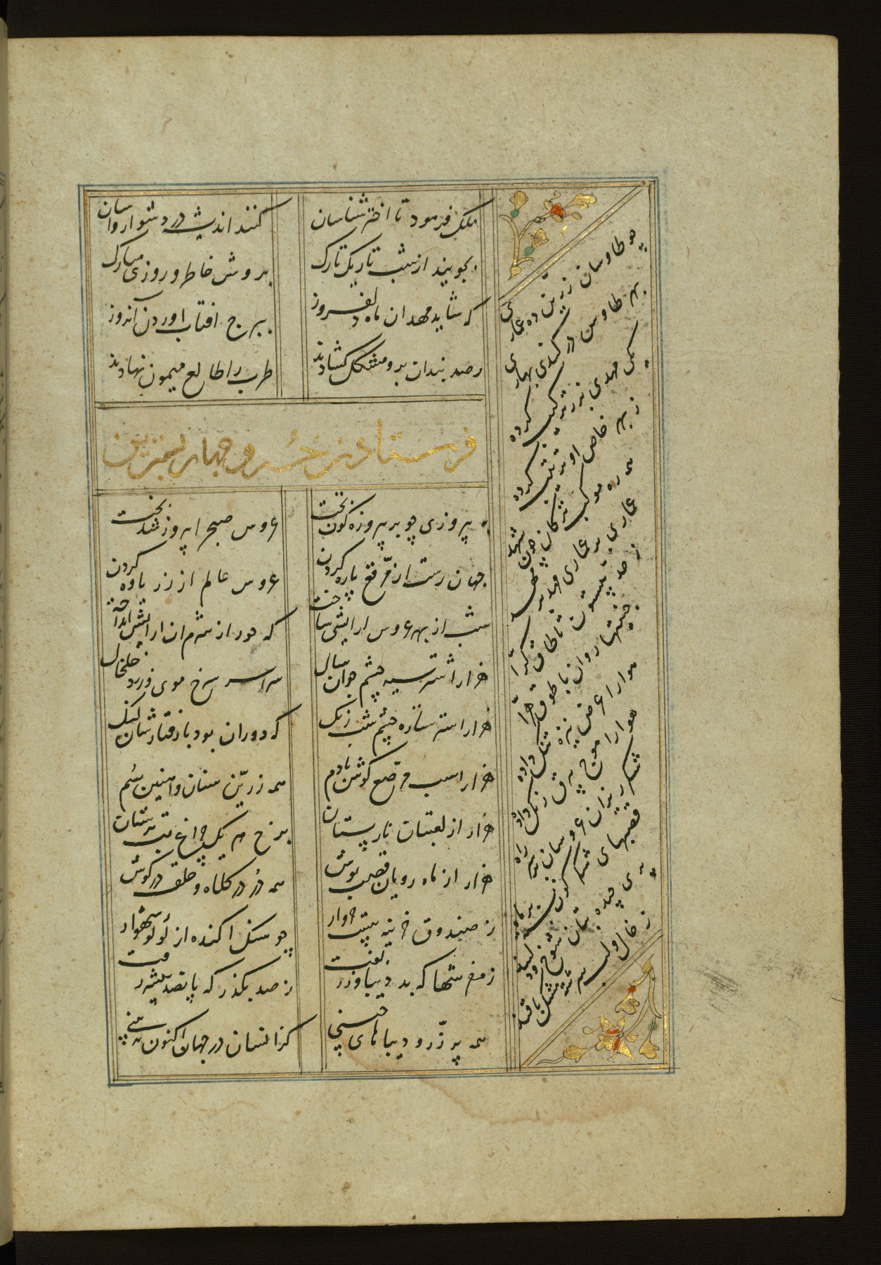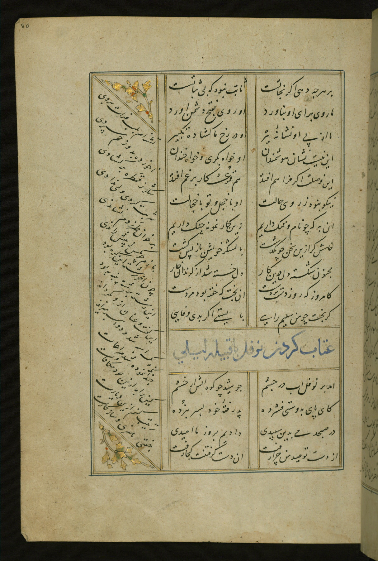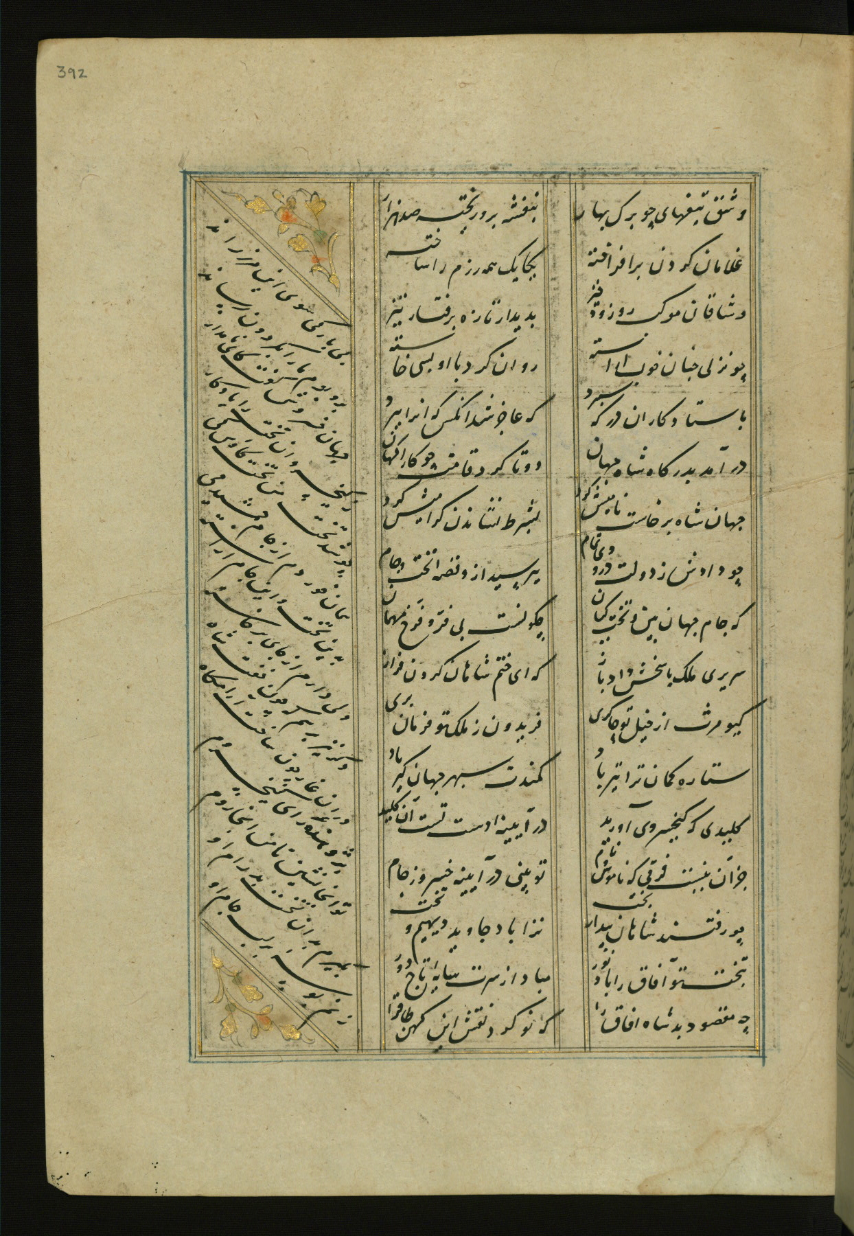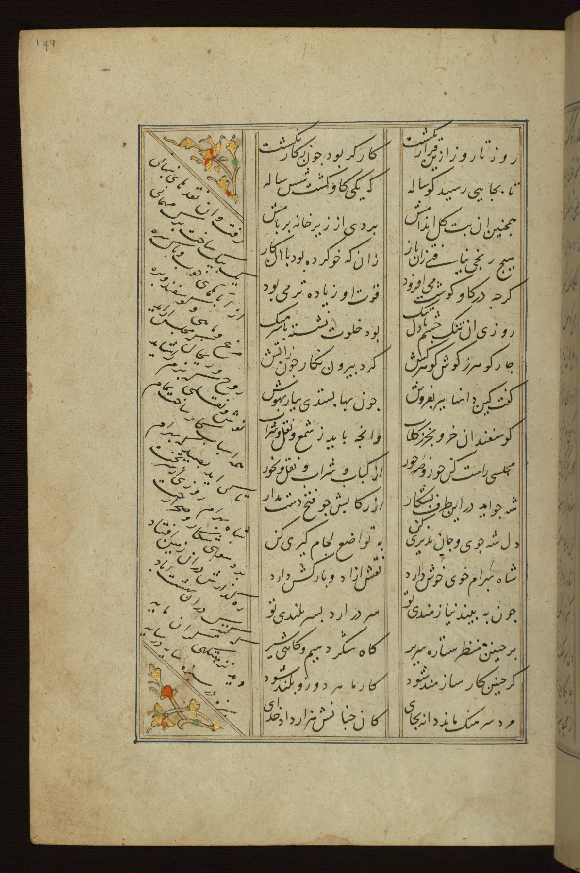 This copy of the Khamsah (quintet) of Niẓāmī Ganjavī (d. 605 AH / 1209 CE) was written by Abū Bakr Shāh ibn Ḥasan ibn ʿAlī al-Shahrastānī and illuminated by Jamāl al-Dīn ibn Muḥammad al-Ṣiddīqī al-Iṣfahānī between 892 AH / 1486 CE and 900 AH / 1494-5 CE. The manuscript opens with a double-page illuminated frontispiece with an inscription giving the title of the work and the name of the author (fols. 1b-2a). There are four illuminated titlepieces with the names of the individual poems and twenty-six repainted illustrations. According to evidence supplied by the colophons, the original binding was by the hand of Jamāl al-Dīn ibn Muḥammad al-Ṣiddīqī al-Iṣfahānī, as well. Unfortunately, it has not survived. The binding presently attached to the manuscript dates to the twelfth century AH / eighteenth CE.