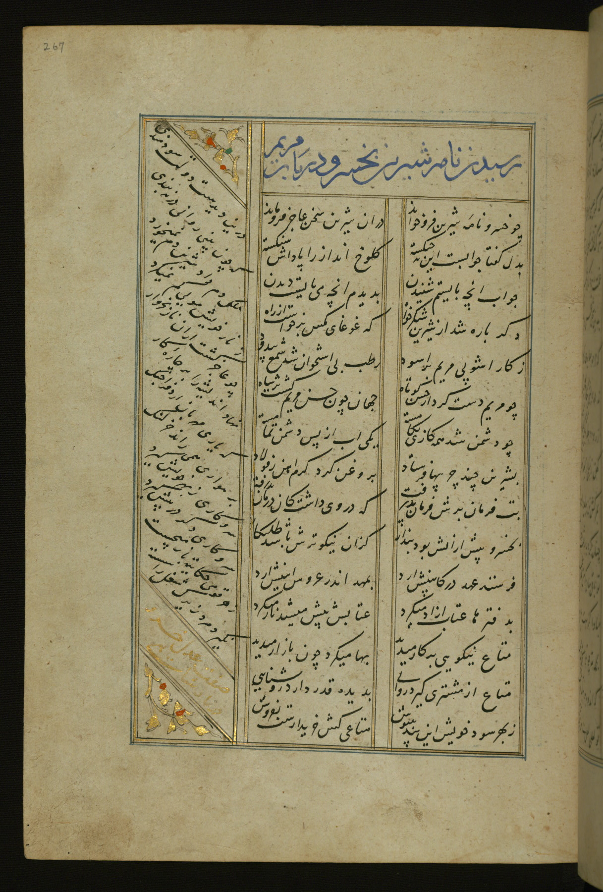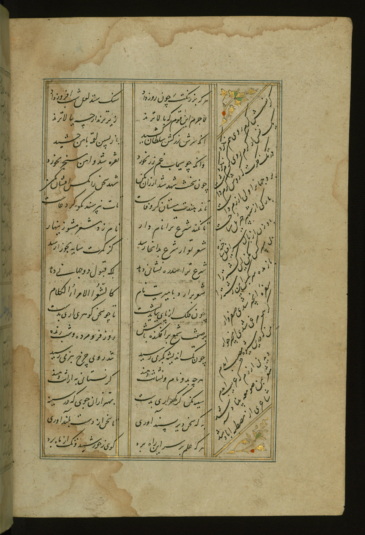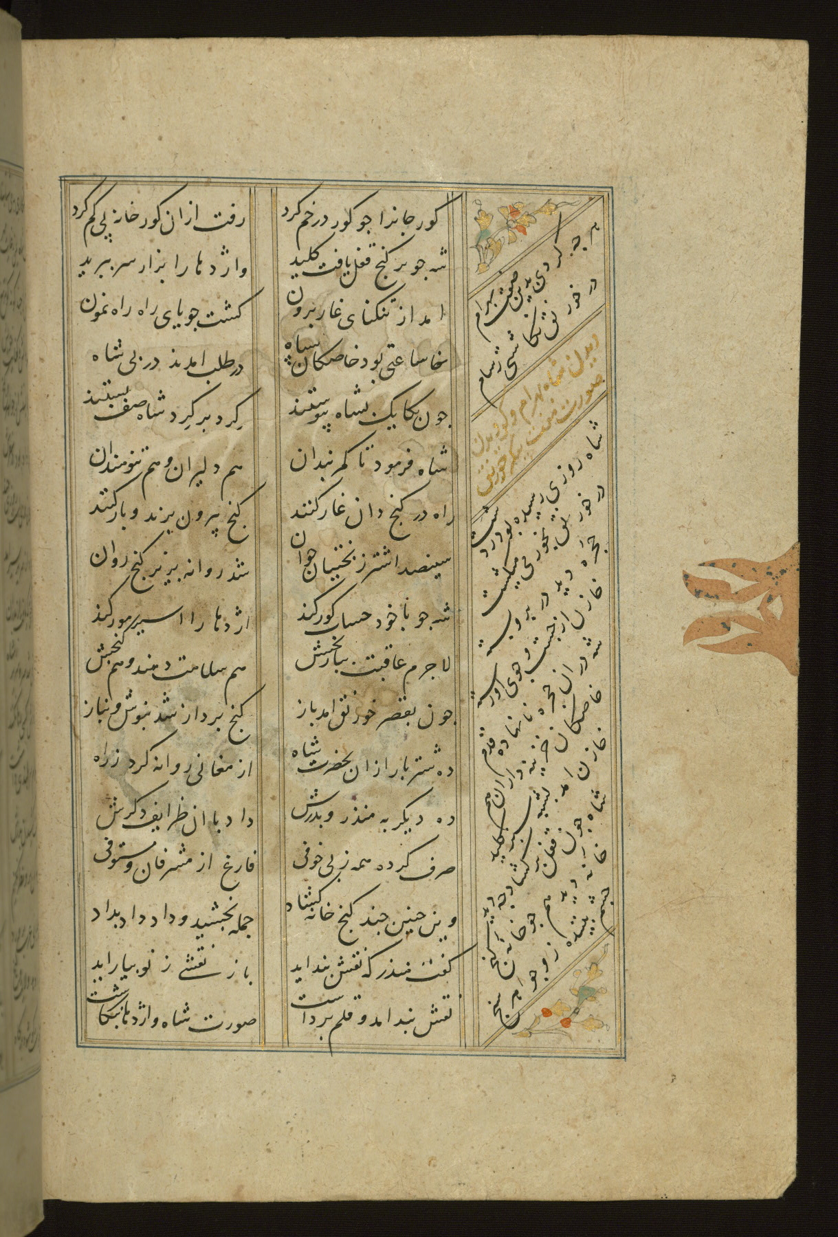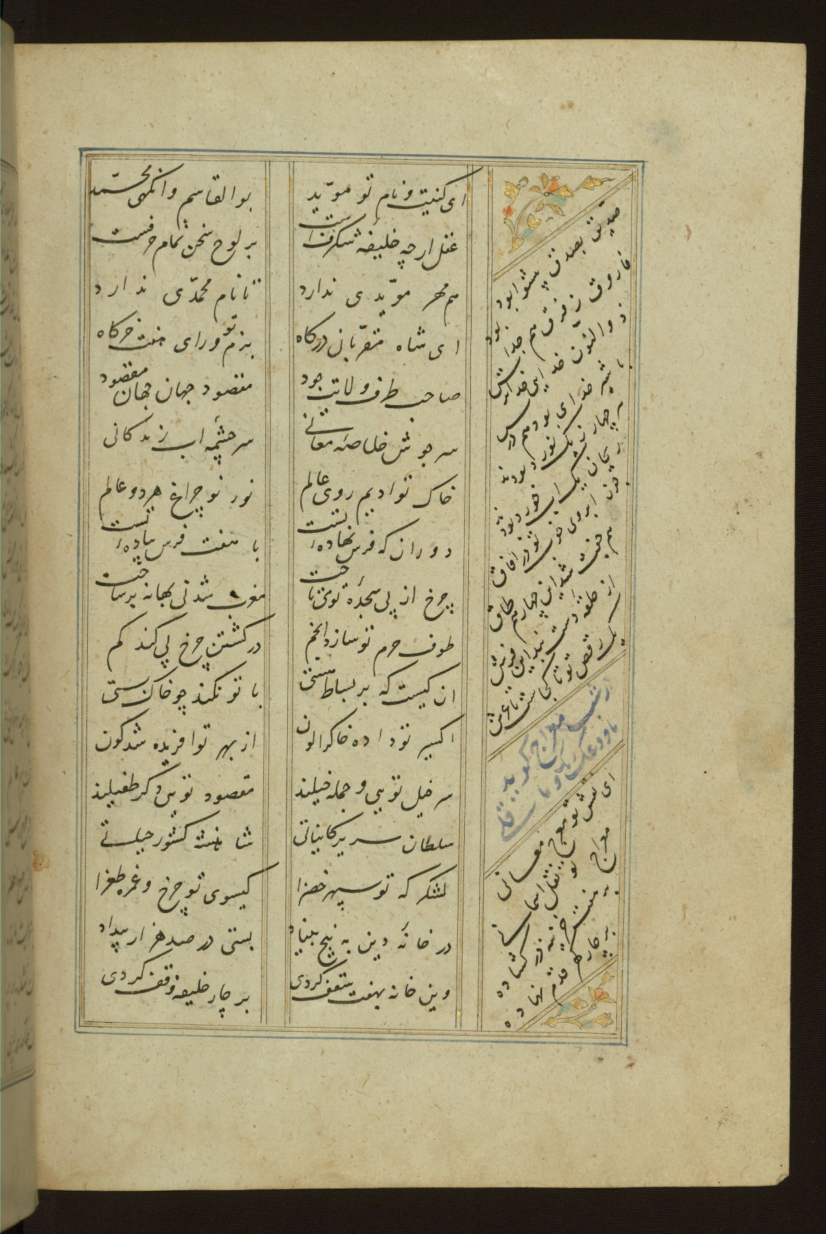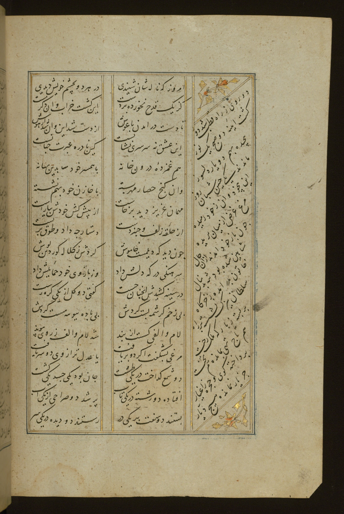 This copy of the Khamsah (quintet) of Niẓāmī Ganjavī (d. 605 AH / 1209 CE) was written by Abū Bakr Shāh ibn Ḥasan ibn ʿAlī al-Shahrastānī and illuminated by Jamāl al-Dīn ibn Muḥammad al-Ṣiddīqī al-Iṣfahānī between 892 AH / 1486 CE and 900 AH / 1494-5 CE. The manuscript opens with a double-page illuminated frontispiece with an inscription giving the title of the work and the name of the author (fols. 1b-2a). There are four illuminated titlepieces with the names of the individual poems and twenty-six repainted illustrations. According to evidence supplied by the colophons, the original binding was by the hand of Jamāl al-Dīn ibn Muḥammad al-Ṣiddīqī al-Iṣfahānī, as well. Unfortunately, it has not survived. The binding presently attached to the manuscript dates to the twelfth century AH / eighteenth CE.