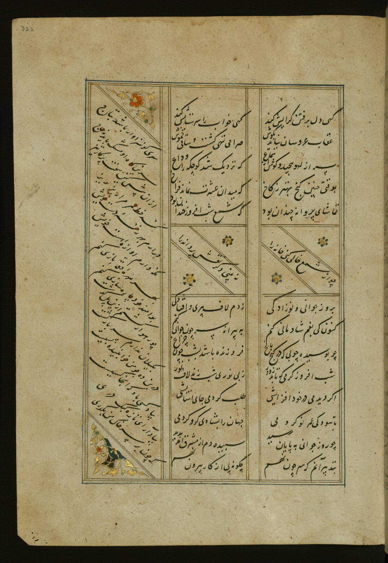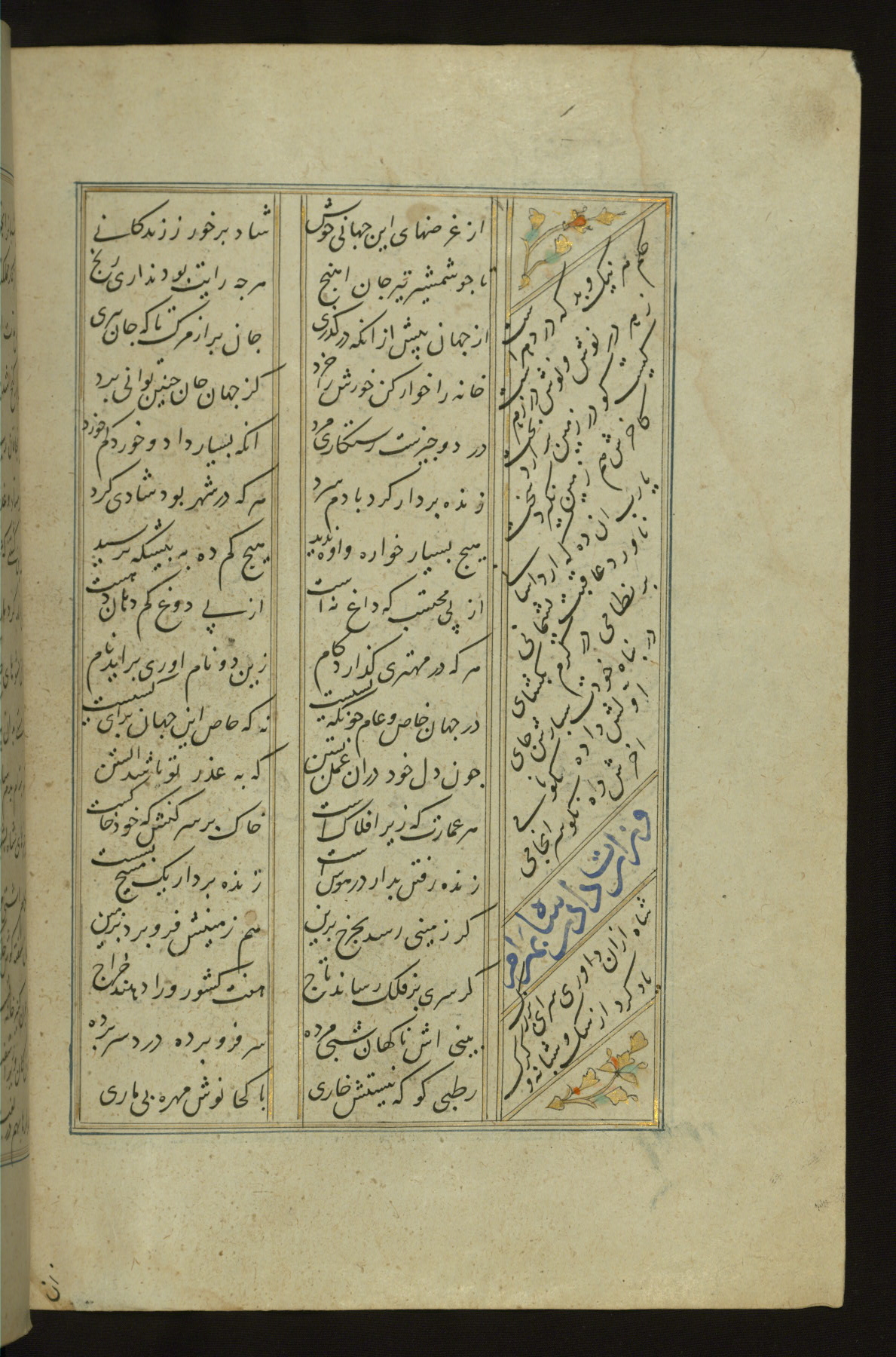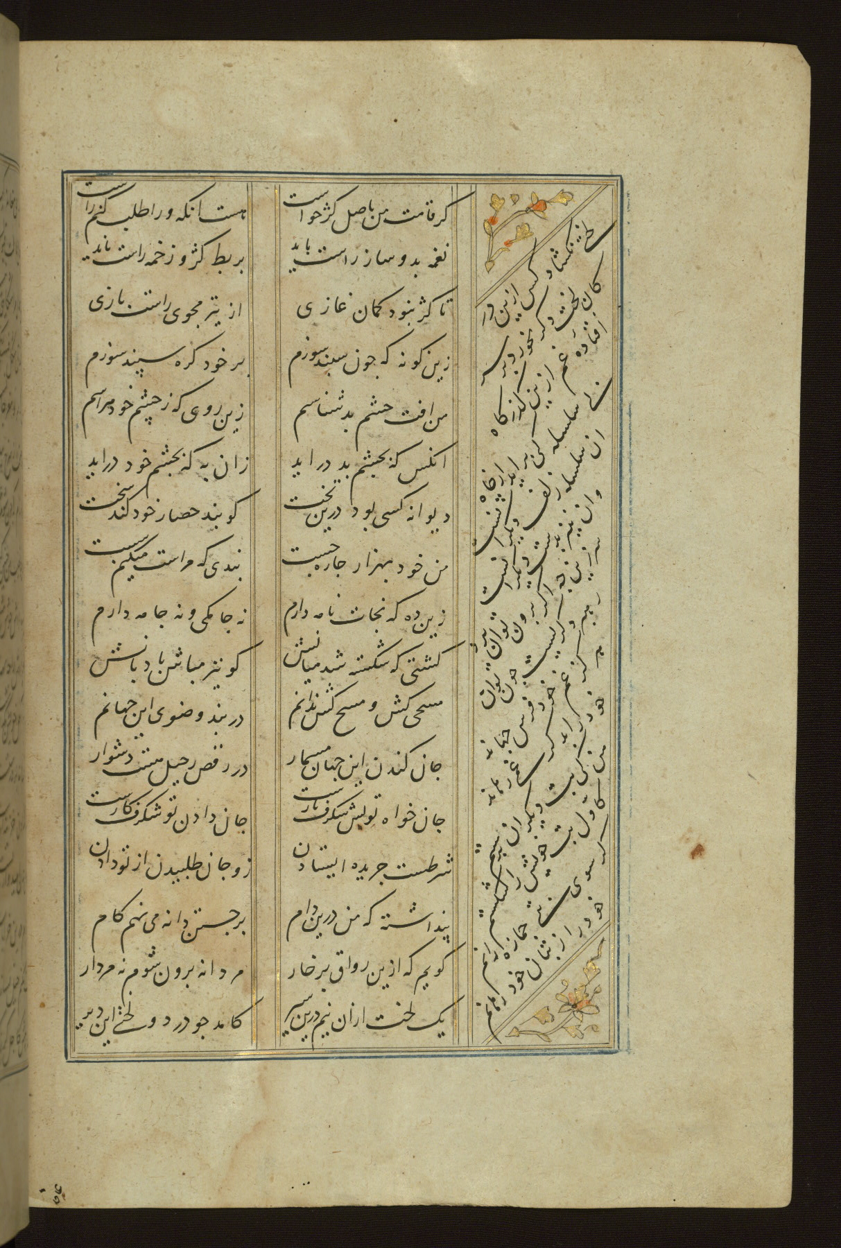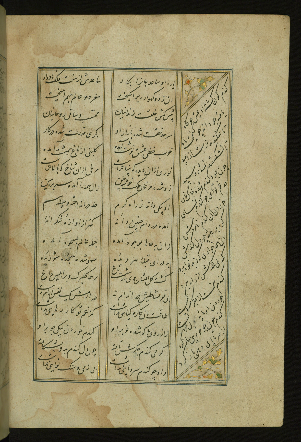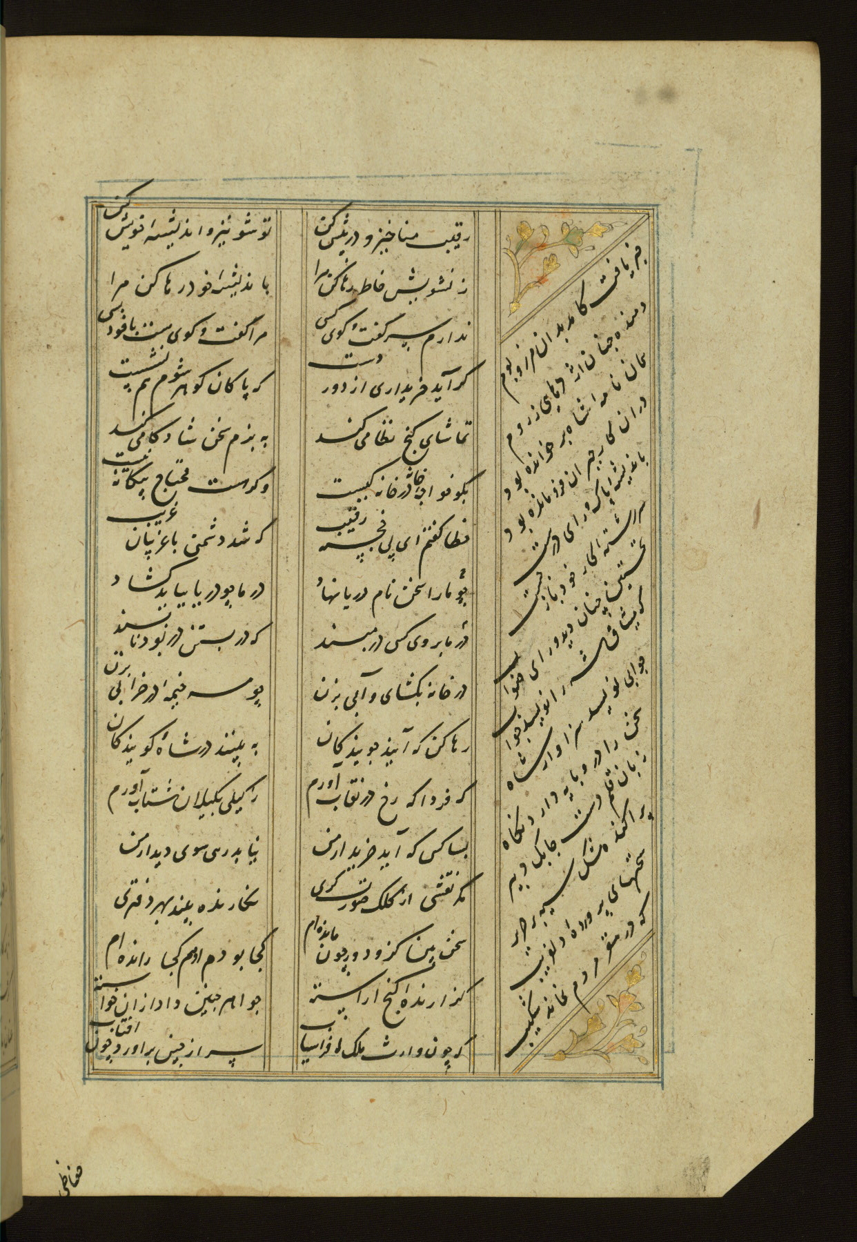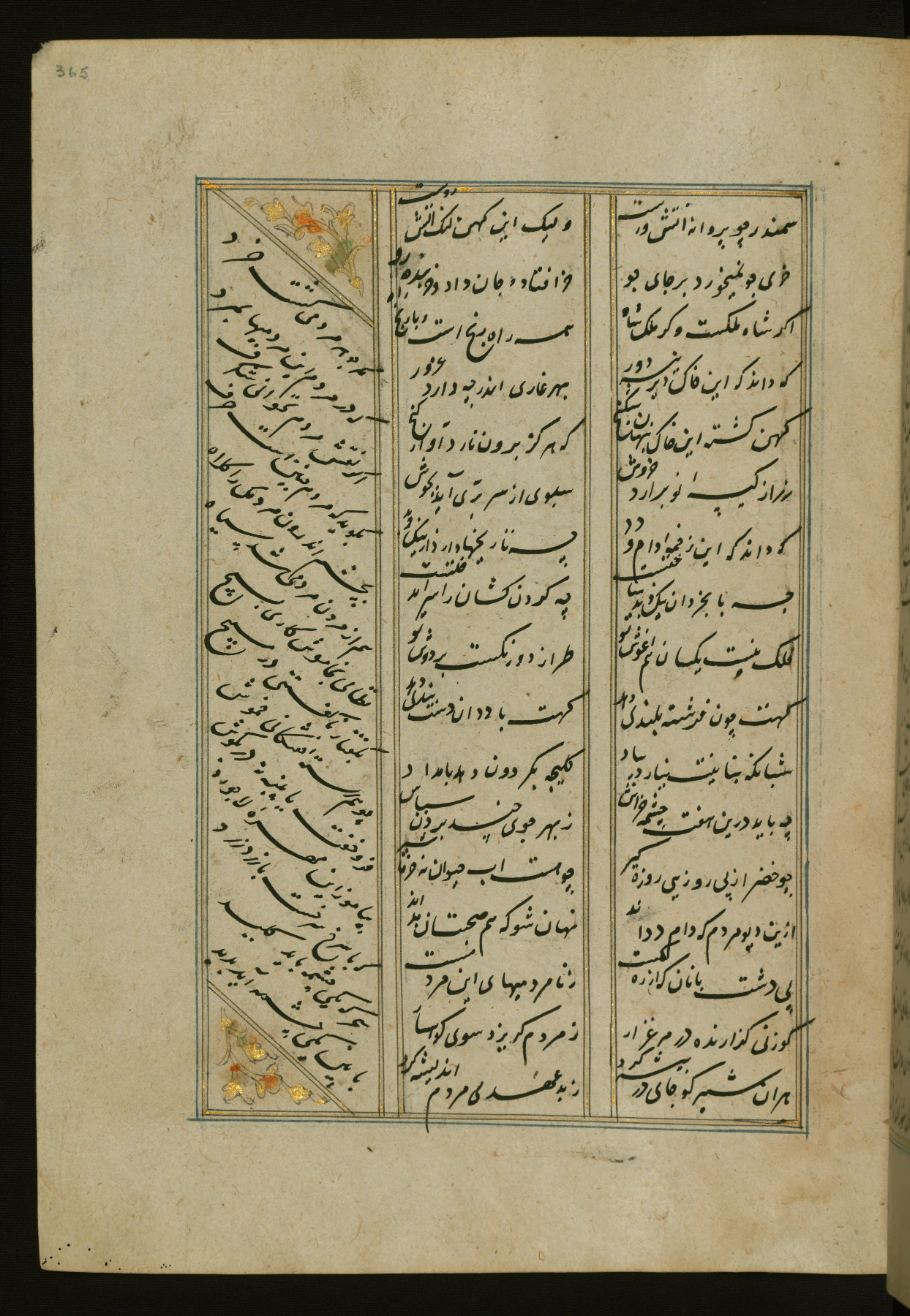 This copy of the Khamsah (quintet) of Niẓāmī Ganjavī (d. 605 AH / 1209 CE) was written by Abū Bakr Shāh ibn Ḥasan ibn ʿAlī al-Shahrastānī and illuminated by Jamāl al-Dīn ibn Muḥammad al-Ṣiddīqī al-Iṣfahānī between 892 AH / 1486 CE and 900 AH / 1494-5 CE. The manuscript opens with a double-page illuminated frontispiece with an inscription giving the title of the work and the name of the author (fols. 1b-2a). There are four illuminated titlepieces with the names of the individual poems and twenty-six repainted illustrations. According to evidence supplied by the colophons, the original binding was by the hand of Jamāl al-Dīn ibn Muḥammad al-Ṣiddīqī al-Iṣfahānī, as well. Unfortunately, it has not survived. The binding presently attached to the manuscript dates to the twelfth century AH / eighteenth CE.