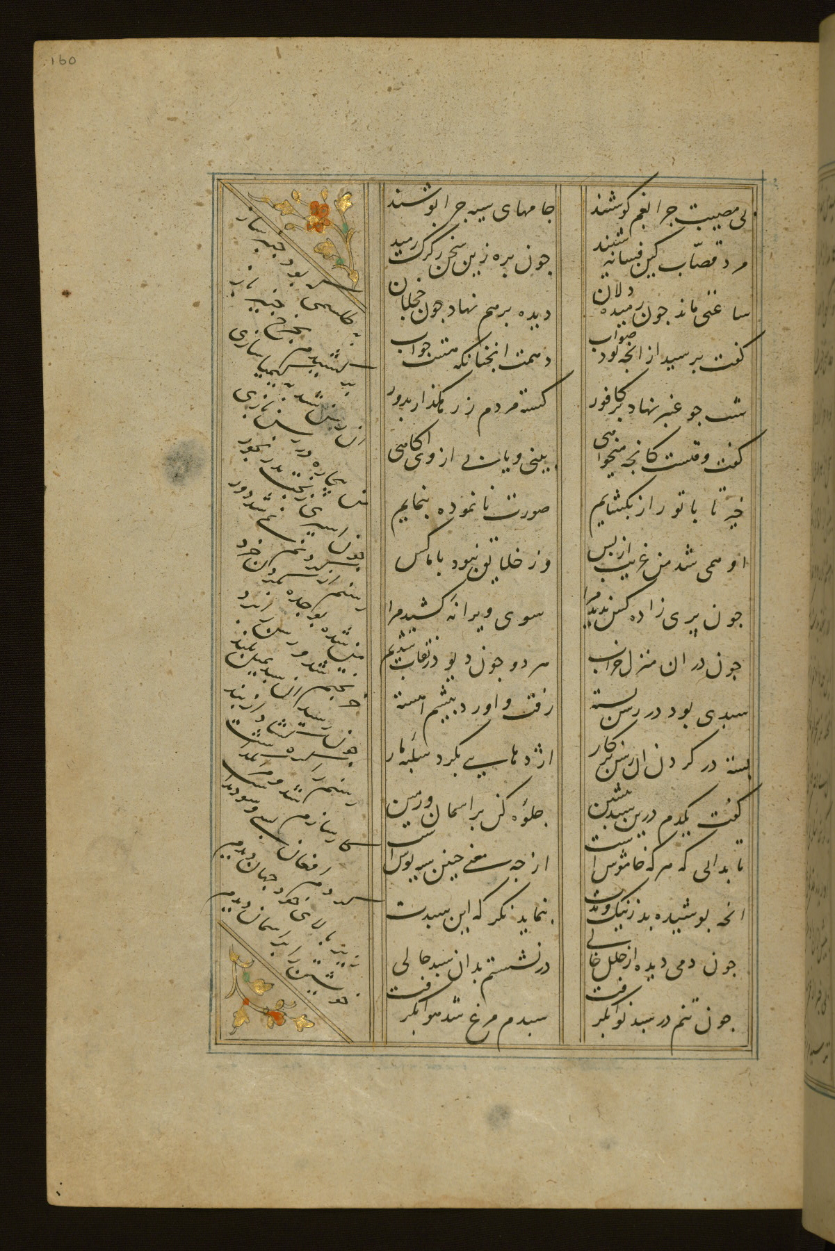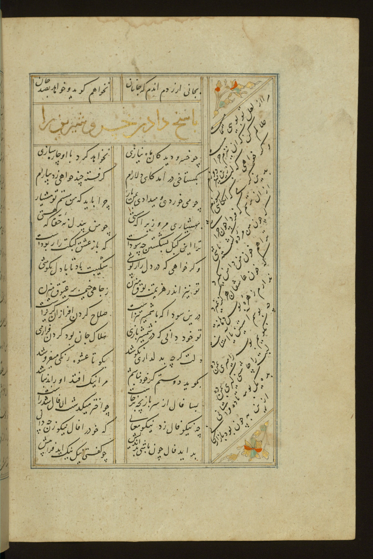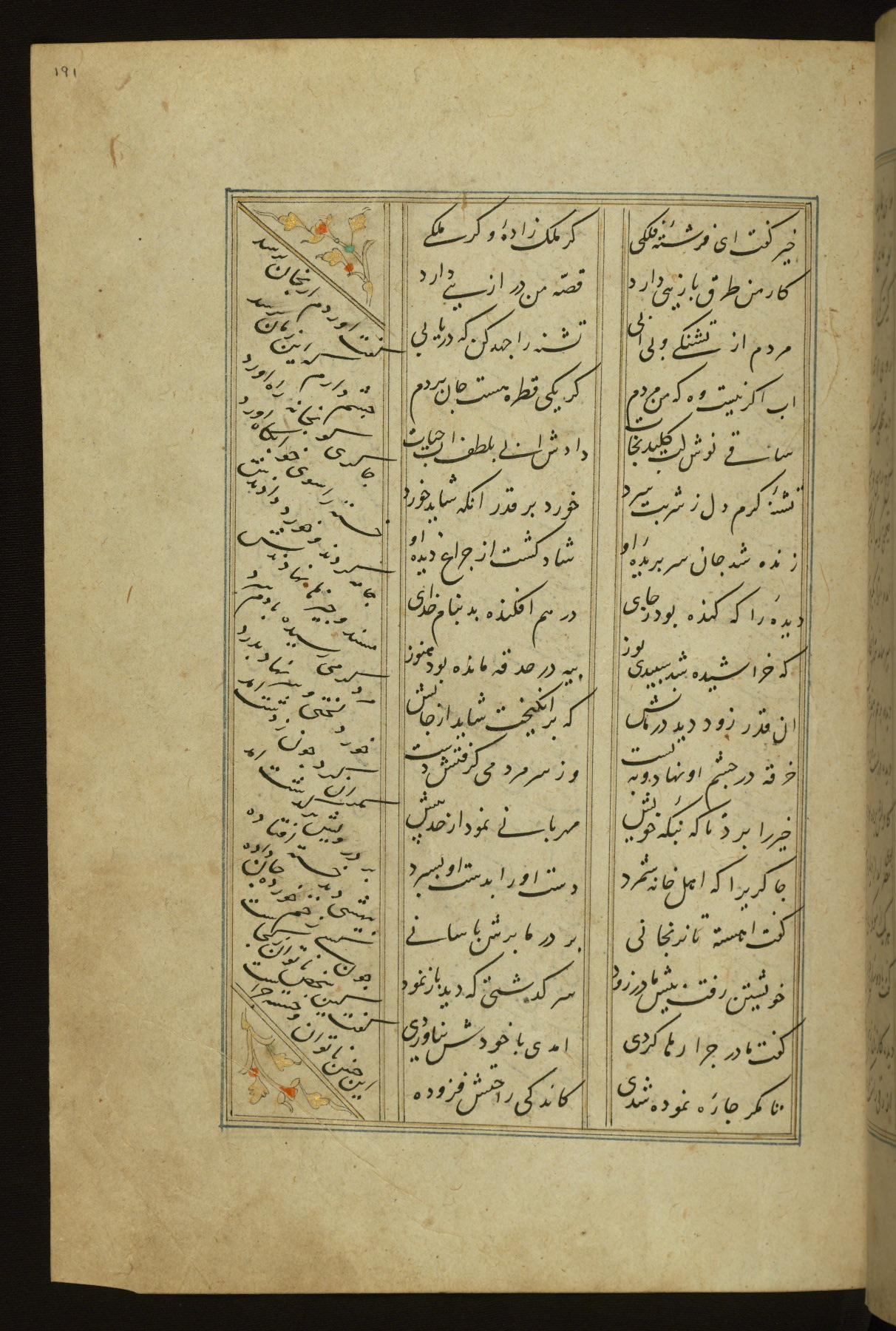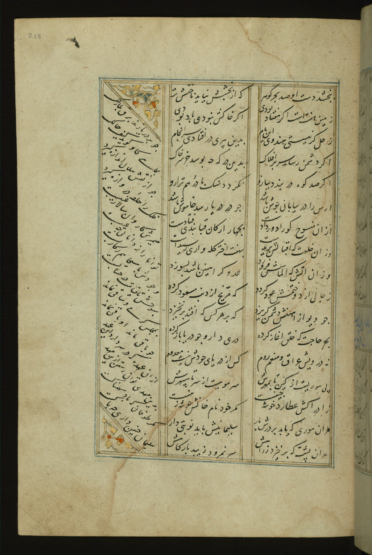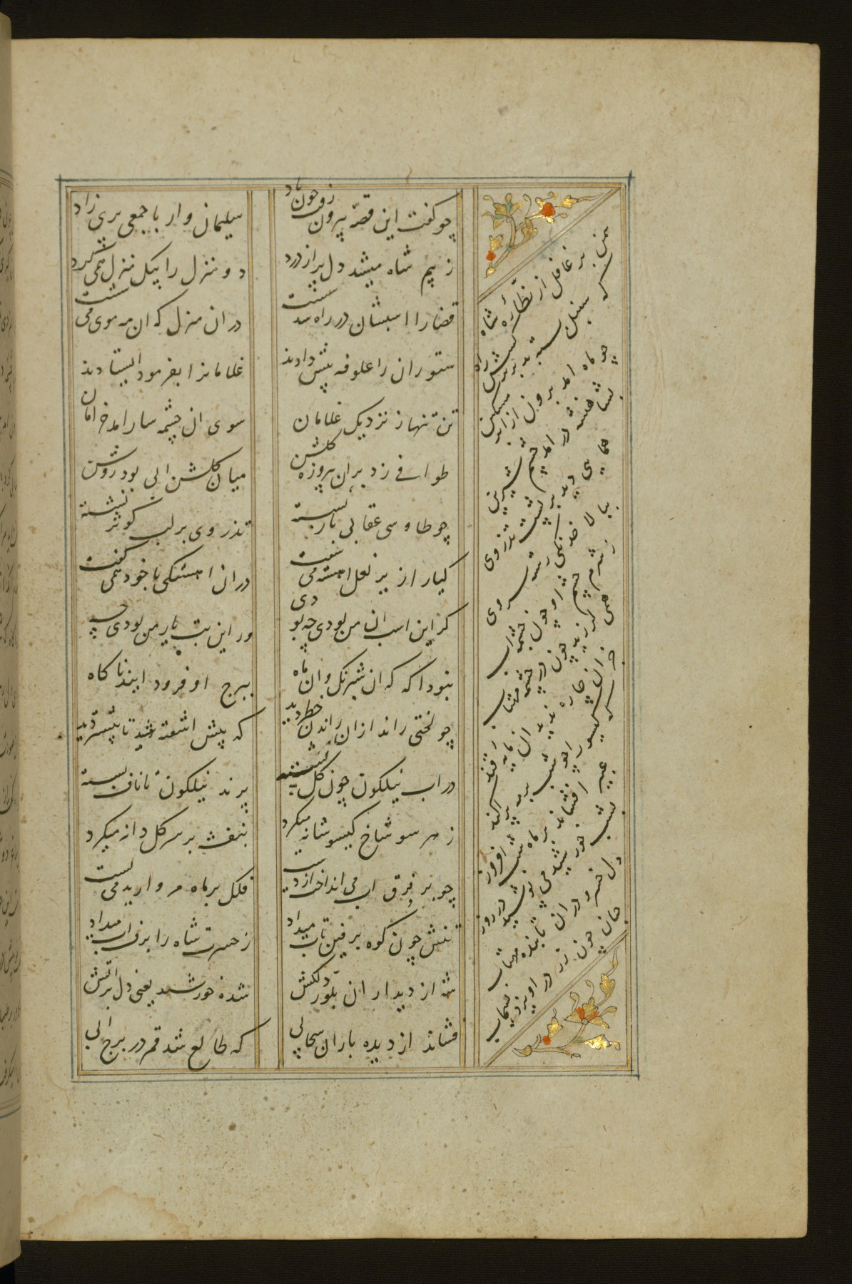 This copy of the Khamsah (quintet) of Niẓāmī Ganjavī (d. 605 AH / 1209 CE) was written by Abū Bakr Shāh ibn Ḥasan ibn ʿAlī al-Shahrastānī and illuminated by Jamāl al-Dīn ibn Muḥammad al-Ṣiddīqī al-Iṣfahānī between 892 AH / 1486 CE and 900 AH / 1494-5 CE. The manuscript opens with a double-page illuminated frontispiece with an inscription giving the title of the work and the name of the author (fols. 1b-2a). There are four illuminated titlepieces with the names of the individual poems and twenty-six repainted illustrations. According to evidence supplied by the colophons, the original binding was by the hand of Jamāl al-Dīn ibn Muḥammad al-Ṣiddīqī al-Iṣfahānī, as well. Unfortunately, it has not survived. The binding presently attached to the manuscript dates to the twelfth century AH / eighteenth CE.