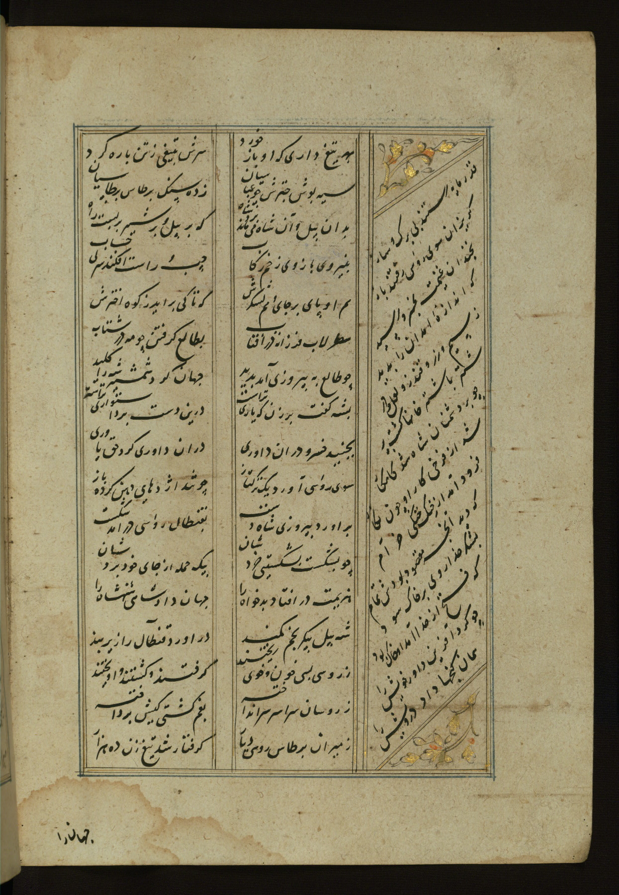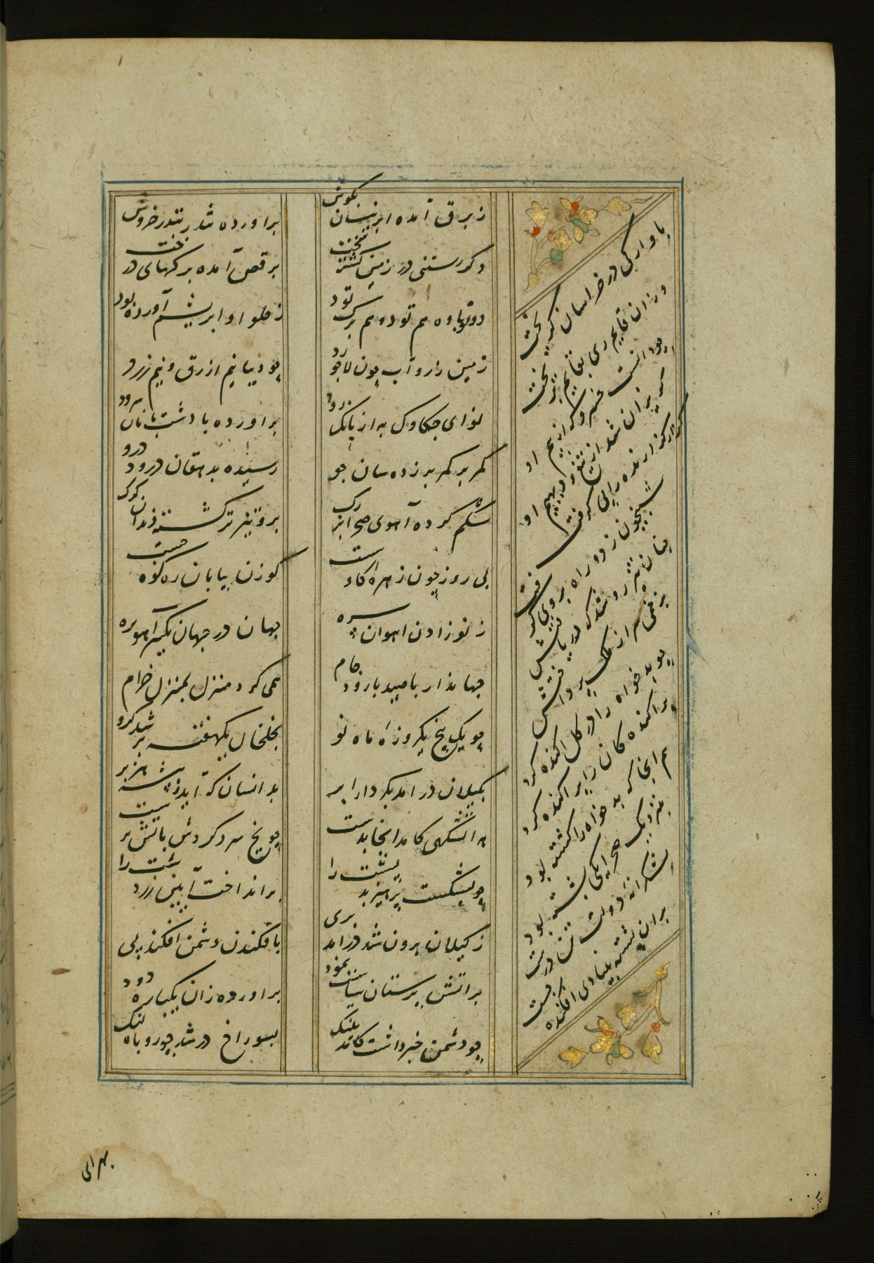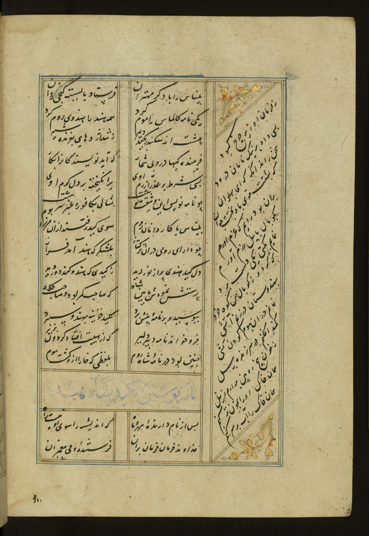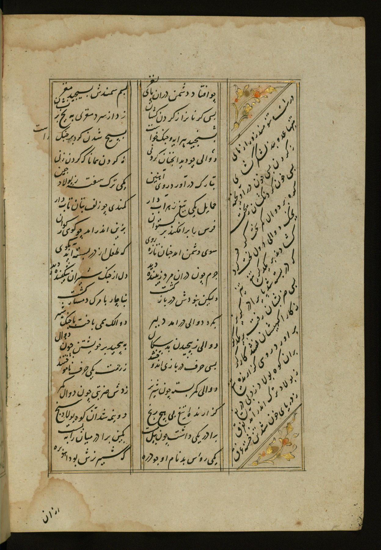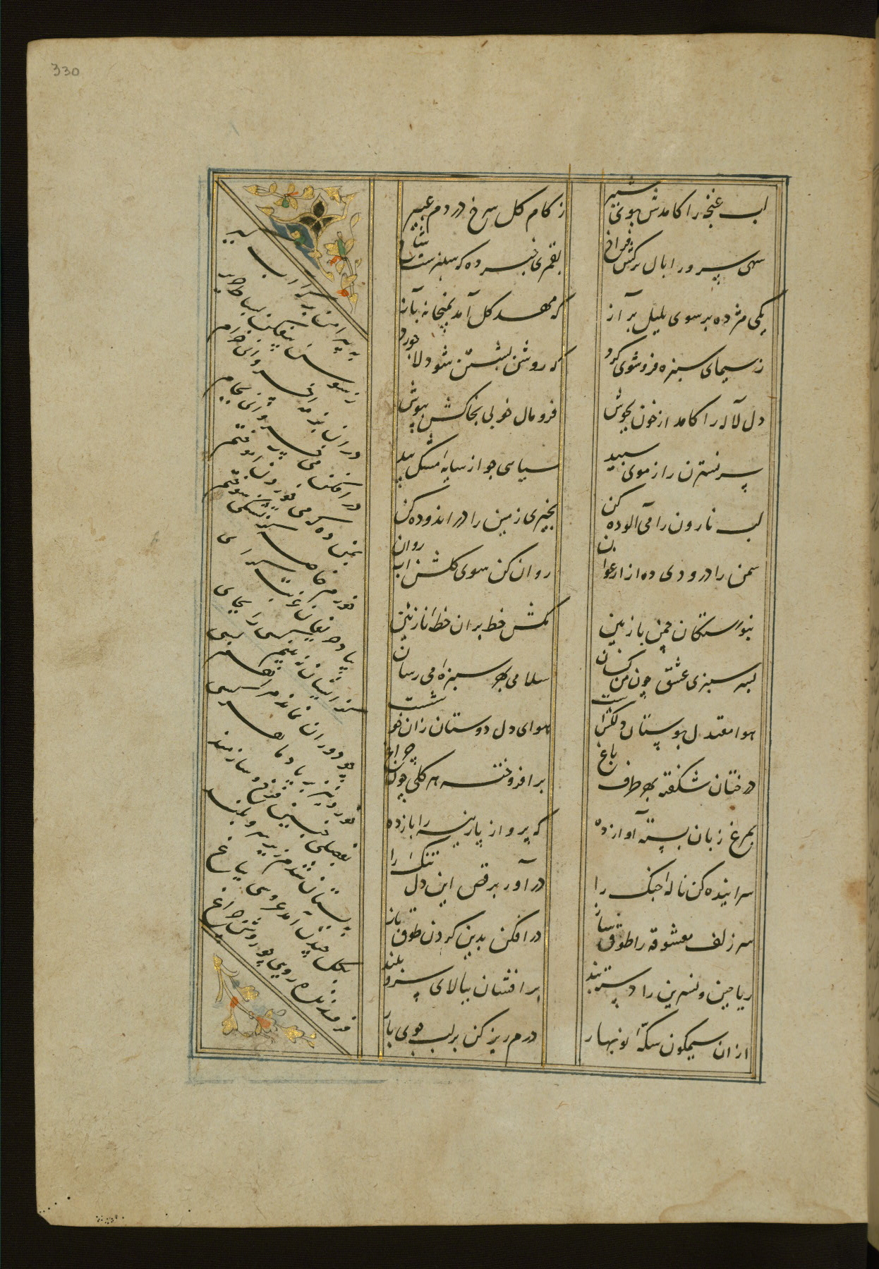This copy of the Khamsah (quintet) of Niẓāmī Ganjavī (d. 605 AH / 1209 CE) was written by Abū Bakr Shāh ibn Ḥasan ibn ʿAlī al-Shahrastānī and illuminated by Jamāl al-Dīn ibn Muḥammad al-Ṣiddīqī al-Iṣfahānī between 892 AH / 1486 CE and 900 AH / 1494-5 CE. The manuscript opens with a double-page illuminated frontispiece with an inscription giving the title of the work and the name of the author (fols. 1b-2a). There are four illuminated titlepieces with the names of the individual poems and twenty-six repainted illustrations. According to evidence supplied by the colophons, the original binding was by the hand of Jamāl al-Dīn ibn Muḥammad al-Ṣiddīqī al-Iṣfahānī, as well. Unfortunately, it has not survived. The binding presently attached to the manuscript dates to the twelfth century AH / eighteenth CE.