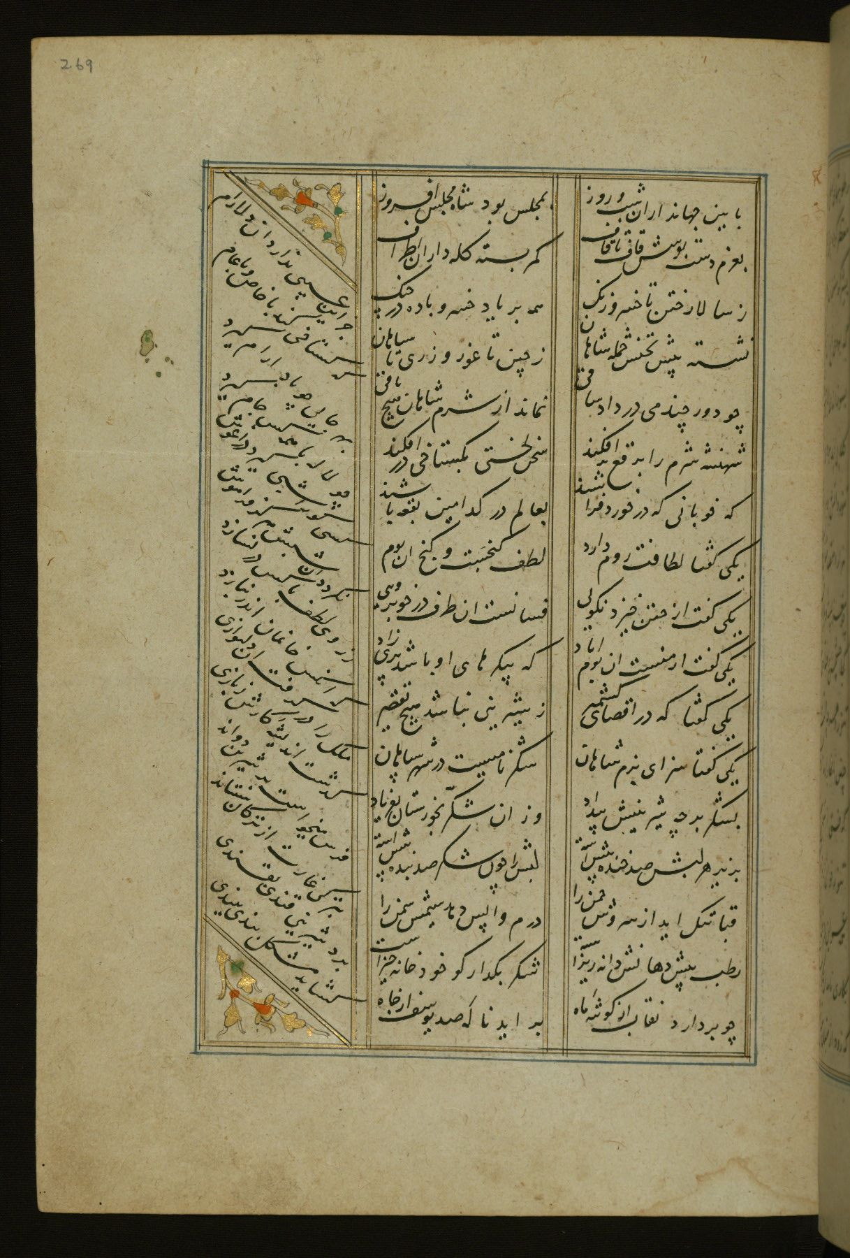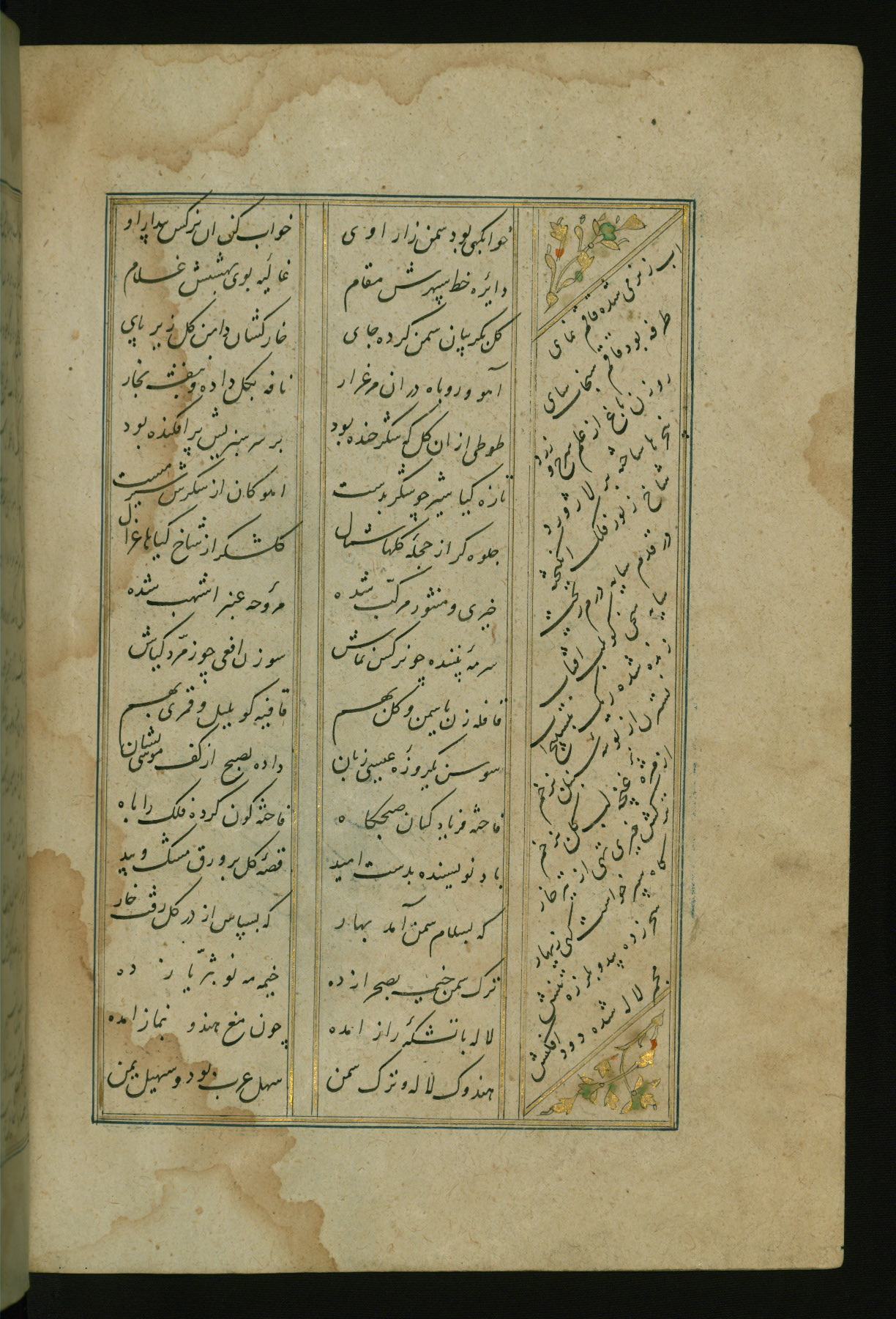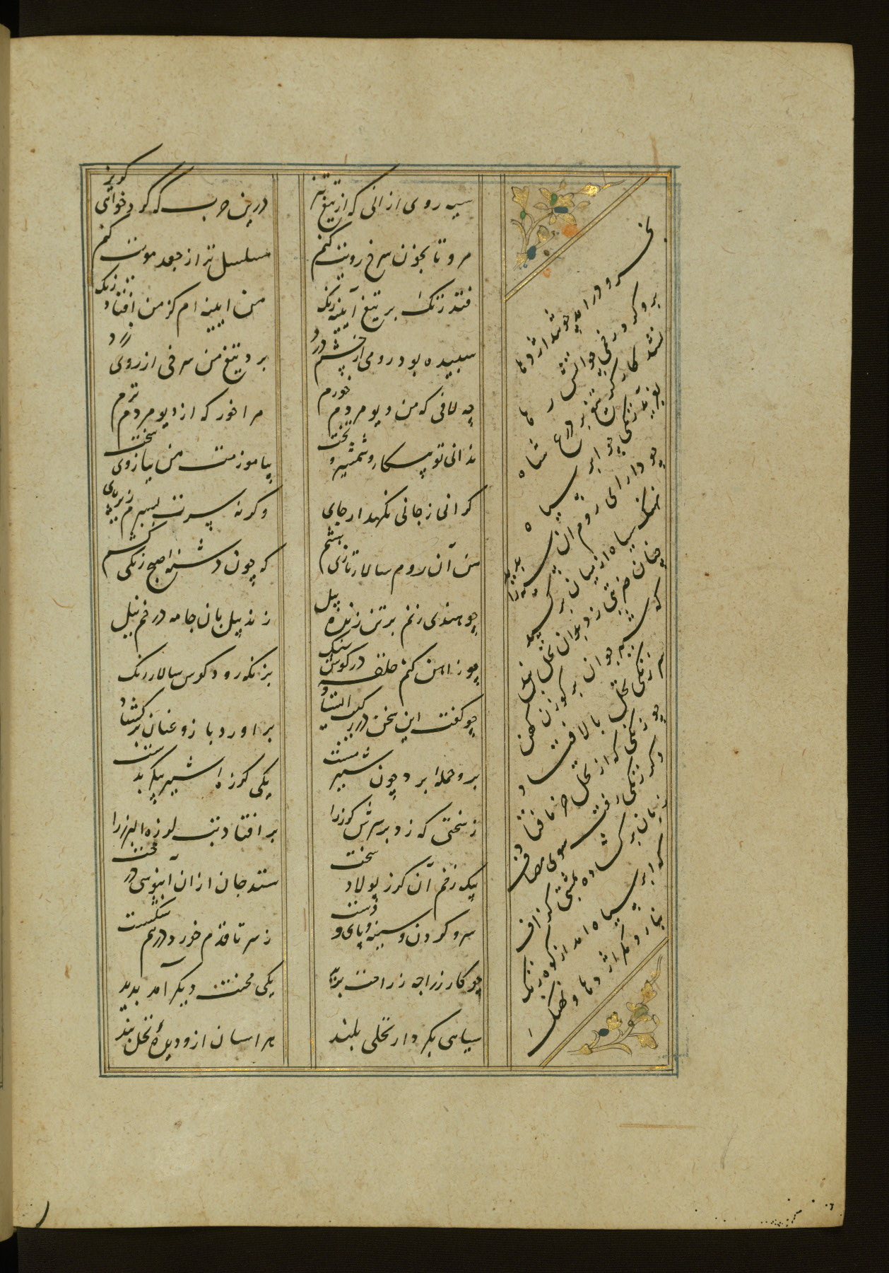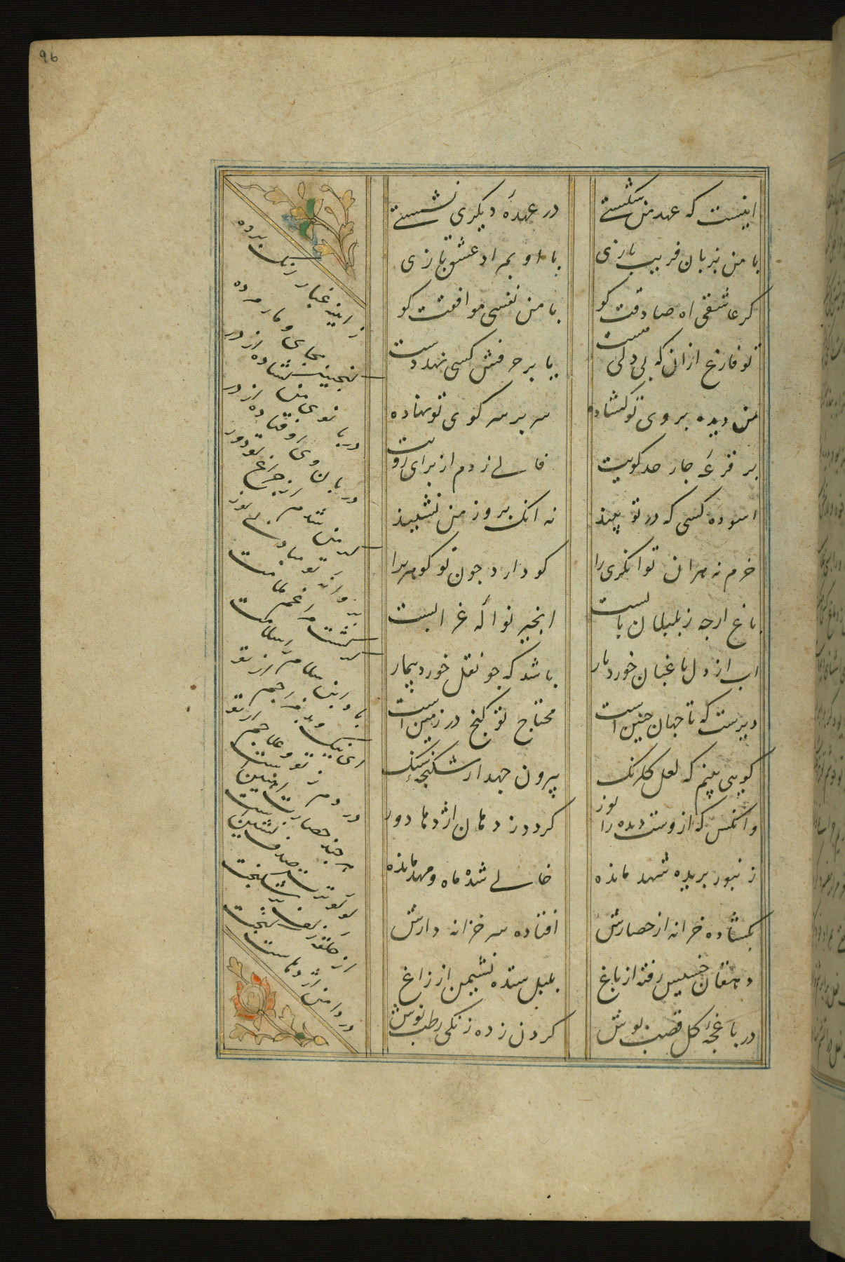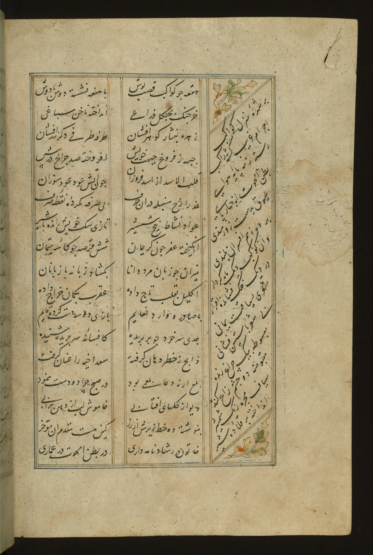 This copy of the Khamsah (quintet) of Niẓāmī Ganjavī (d. 605 AH / 1209 CE) was written by Abū Bakr Shāh ibn Ḥasan ibn ʿAlī al-Shahrastānī and illuminated by Jamāl al-Dīn ibn Muḥammad al-Ṣiddīqī al-Iṣfahānī between 892 AH / 1486 CE and 900 AH / 1494-5 CE. The manuscript opens with a double-page illuminated frontispiece with an inscription giving the title of the work and the name of the author (fols. 1b-2a). There are four illuminated titlepieces with the names of the individual poems and twenty-six repainted illustrations. According to evidence supplied by the colophons, the original binding was by the hand of Jamāl al-Dīn ibn Muḥammad al-Ṣiddīqī al-Iṣfahānī, as well. Unfortunately, it has not survived. The binding presently attached to the manuscript dates to the twelfth century AH / eighteenth CE.