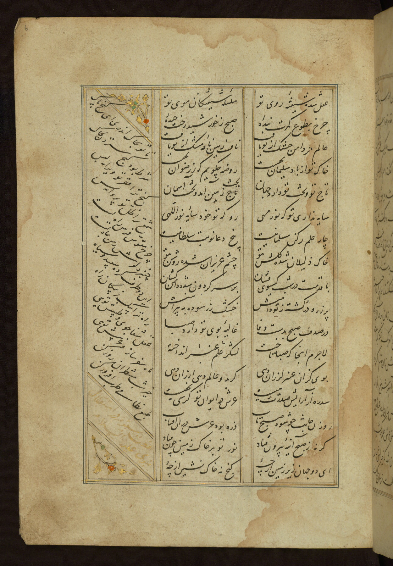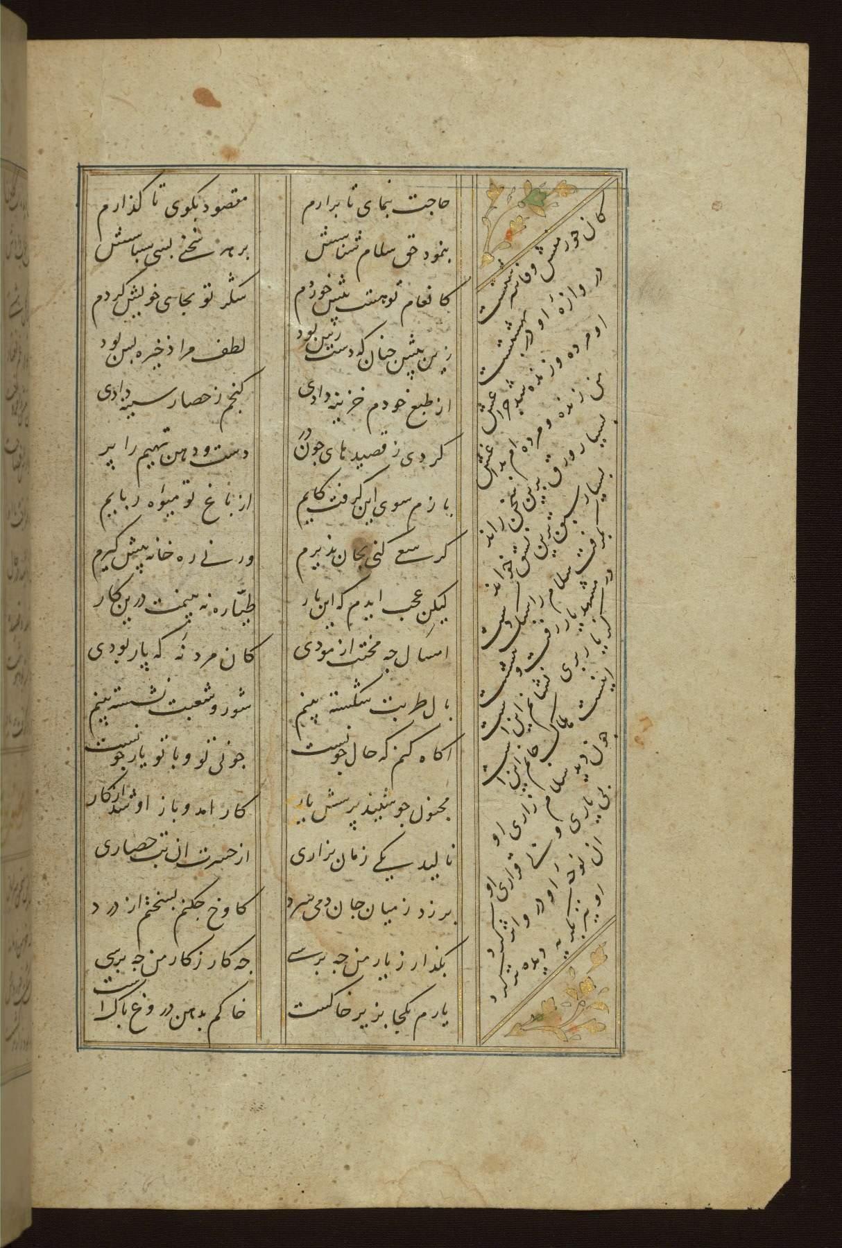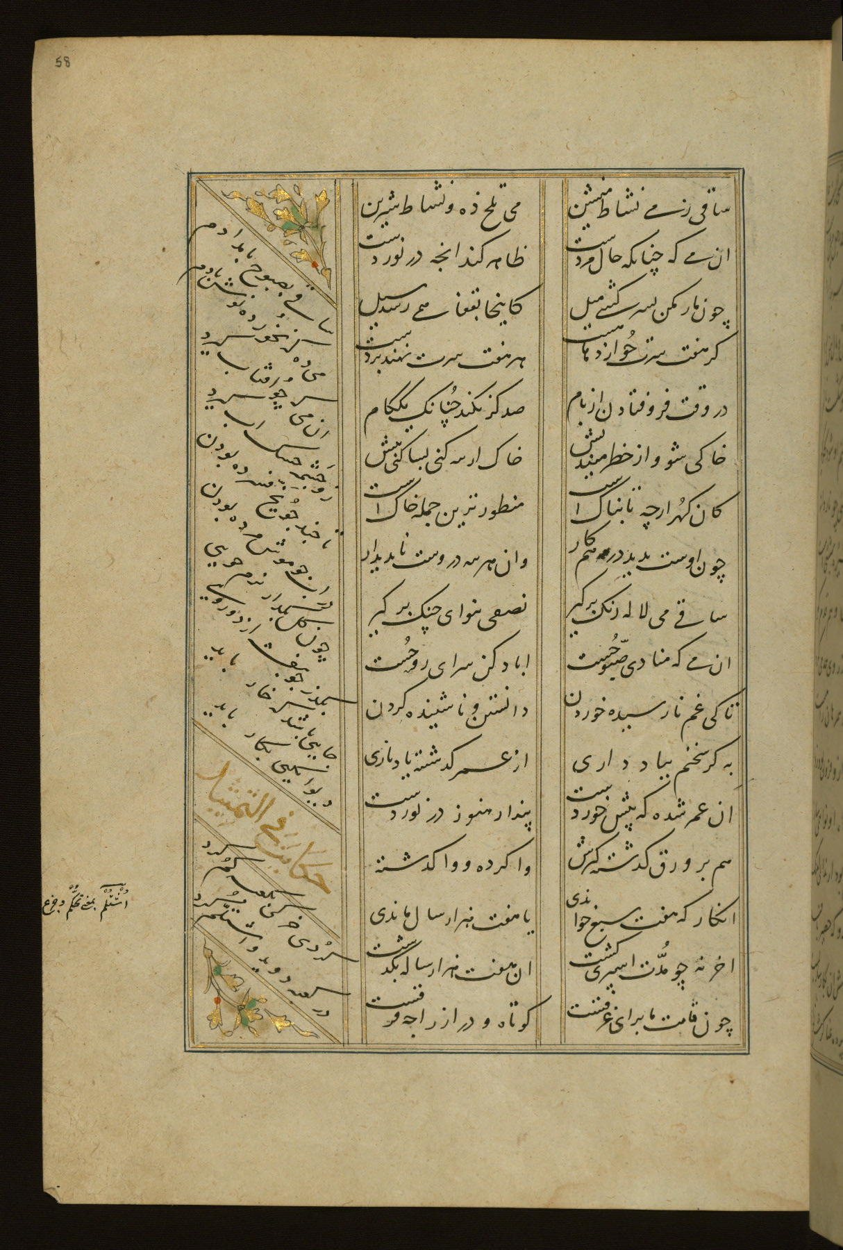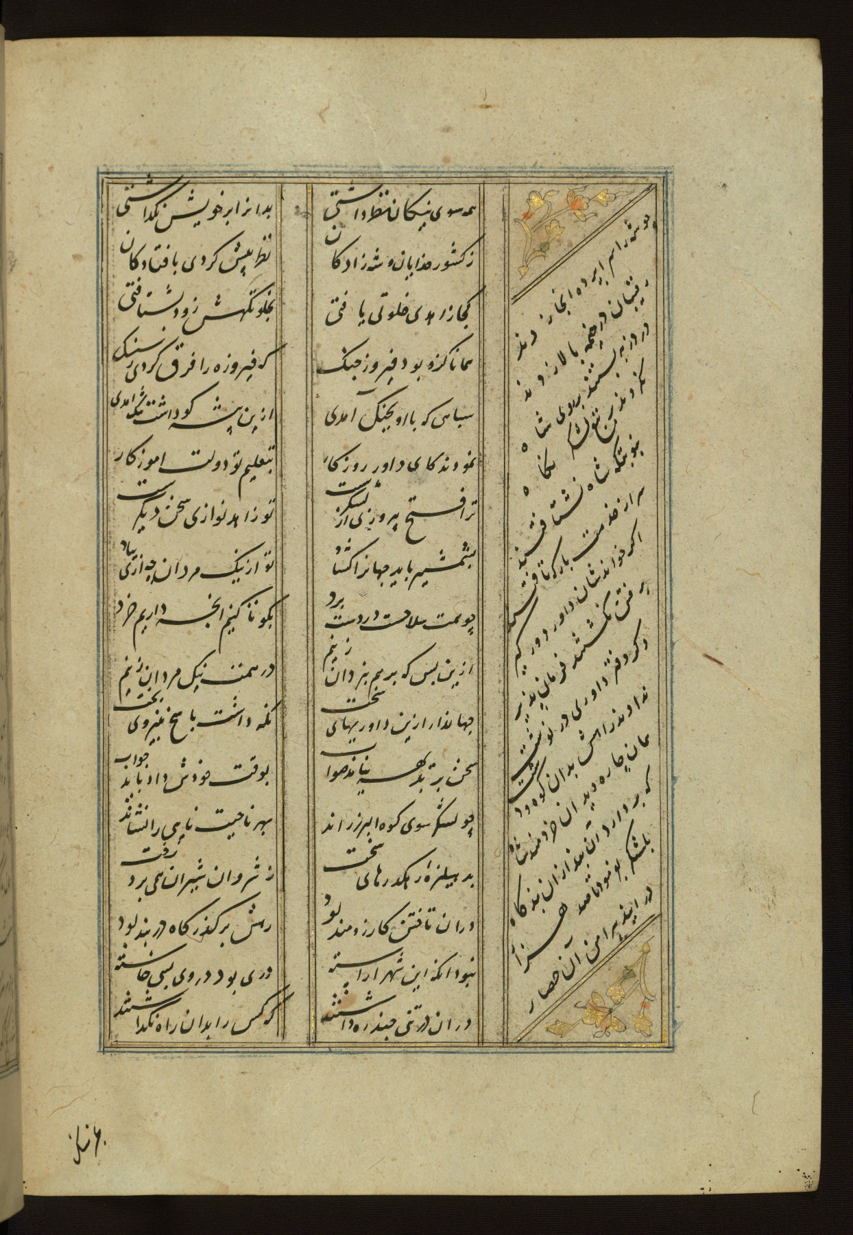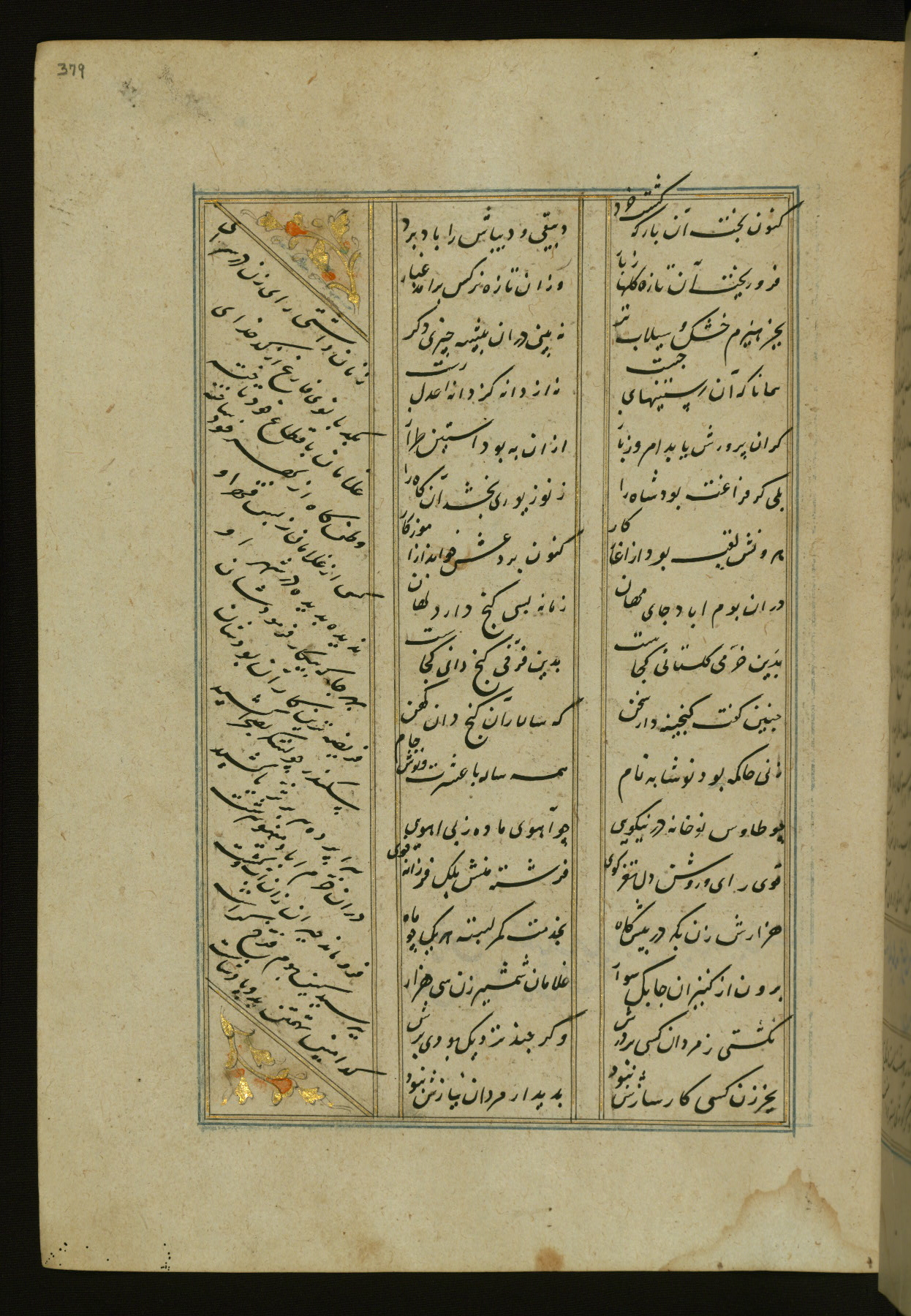 This copy of the Khamsah (quintet) of Niẓāmī Ganjavī (d. 605 AH / 1209 CE) was written by Abū Bakr Shāh ibn Ḥasan ibn ʿAlī al-Shahrastānī and illuminated by Jamāl al-Dīn ibn Muḥammad al-Ṣiddīqī al-Iṣfahānī between 892 AH / 1486 CE and 900 AH / 1494-5 CE. The manuscript opens with a double-page illuminated frontispiece with an inscription giving the title of the work and the name of the author (fols. 1b-2a). There are four illuminated titlepieces with the names of the individual poems and twenty-six repainted illustrations. According to evidence supplied by the colophons, the original binding was by the hand of Jamāl al-Dīn ibn Muḥammad al-Ṣiddīqī al-Iṣfahānī, as well. Unfortunately, it has not survived. The binding presently attached to the manuscript dates to the twelfth century AH / eighteenth CE.