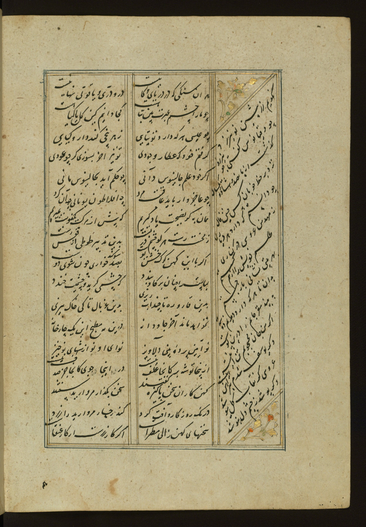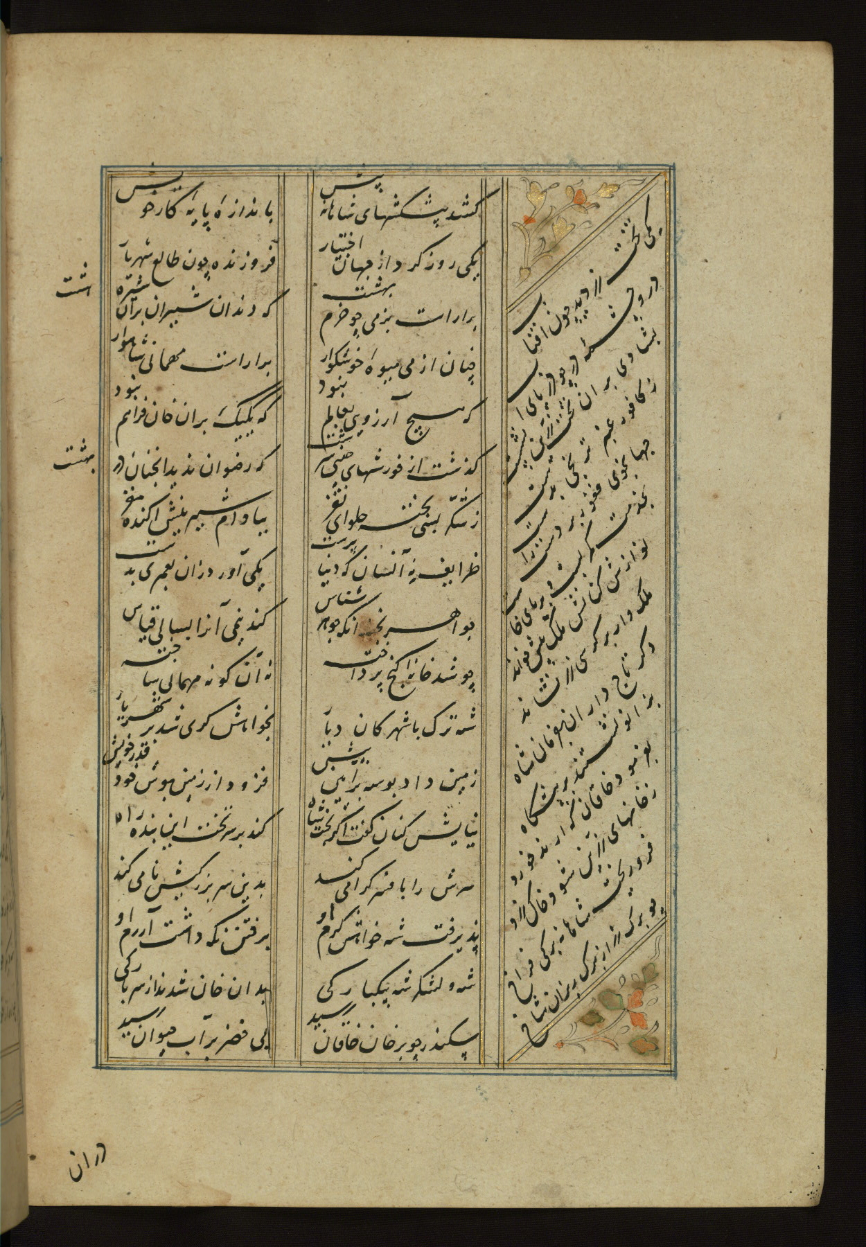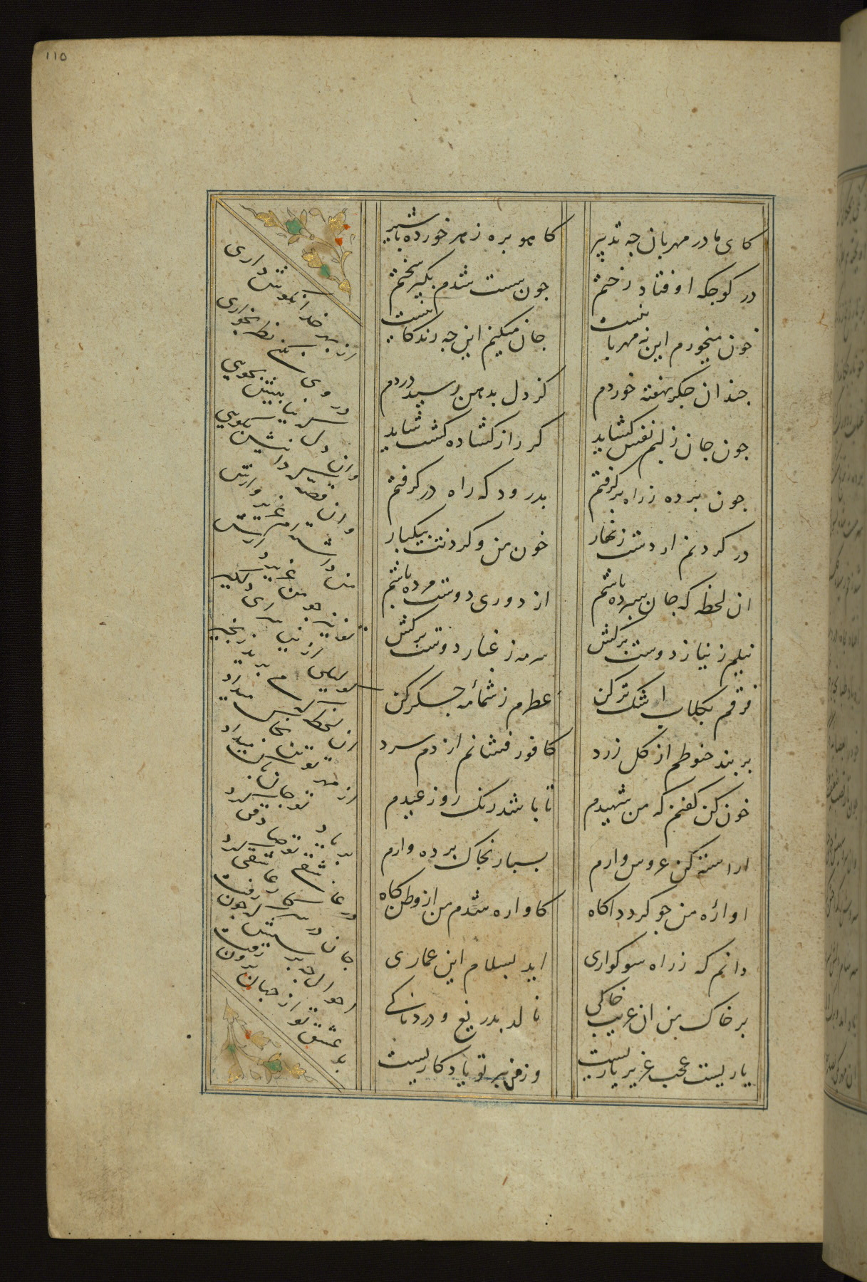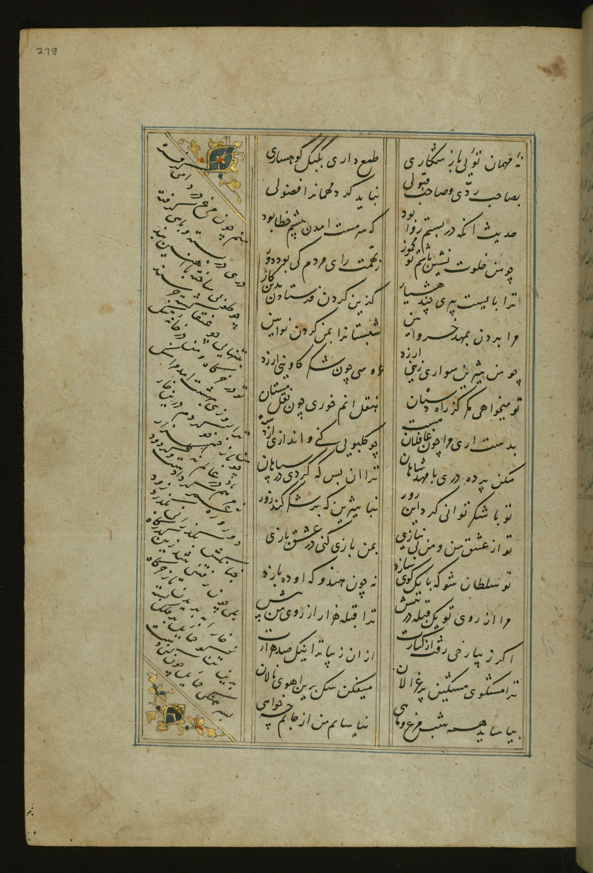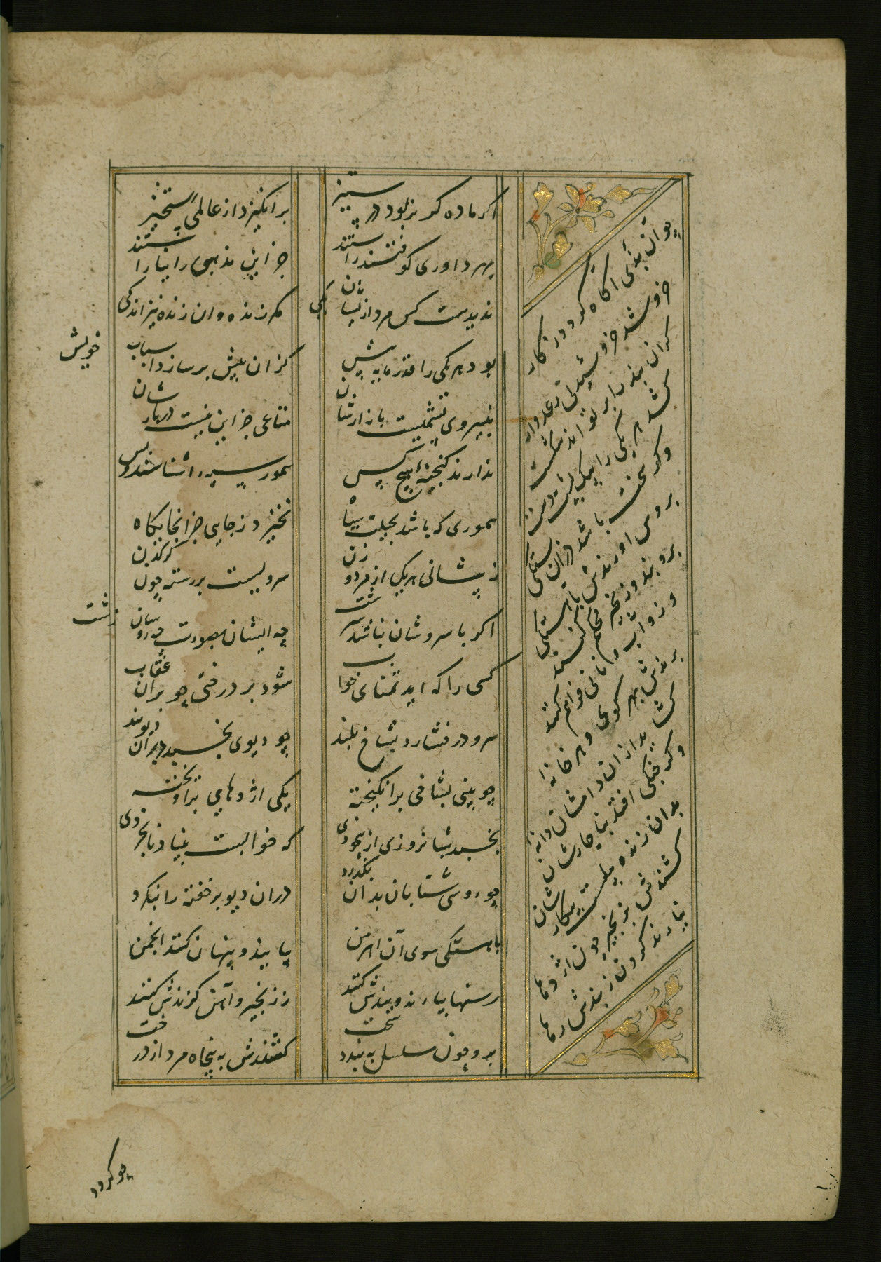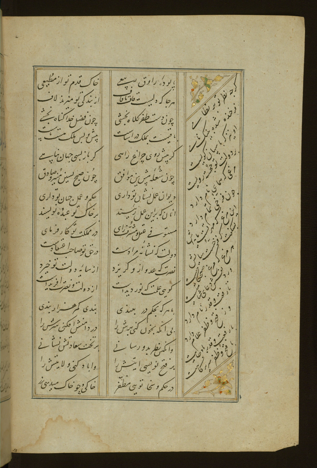 This copy of the Khamsah (quintet) of Niẓāmī Ganjavī (d. 605 AH / 1209 CE) was written by Abū Bakr Shāh ibn Ḥasan ibn ʿAlī al-Shahrastānī and illuminated by Jamāl al-Dīn ibn Muḥammad al-Ṣiddīqī al-Iṣfahānī between 892 AH / 1486 CE and 900 AH / 1494-5 CE. The manuscript opens with a double-page illuminated frontispiece with an inscription giving the title of the work and the name of the author (fols. 1b-2a). There are four illuminated titlepieces with the names of the individual poems and twenty-six repainted illustrations. According to evidence supplied by the colophons, the original binding was by the hand of Jamāl al-Dīn ibn Muḥammad al-Ṣiddīqī al-Iṣfahānī, as well. Unfortunately, it has not survived. The binding presently attached to the manuscript dates to the twelfth century AH / eighteenth CE.
