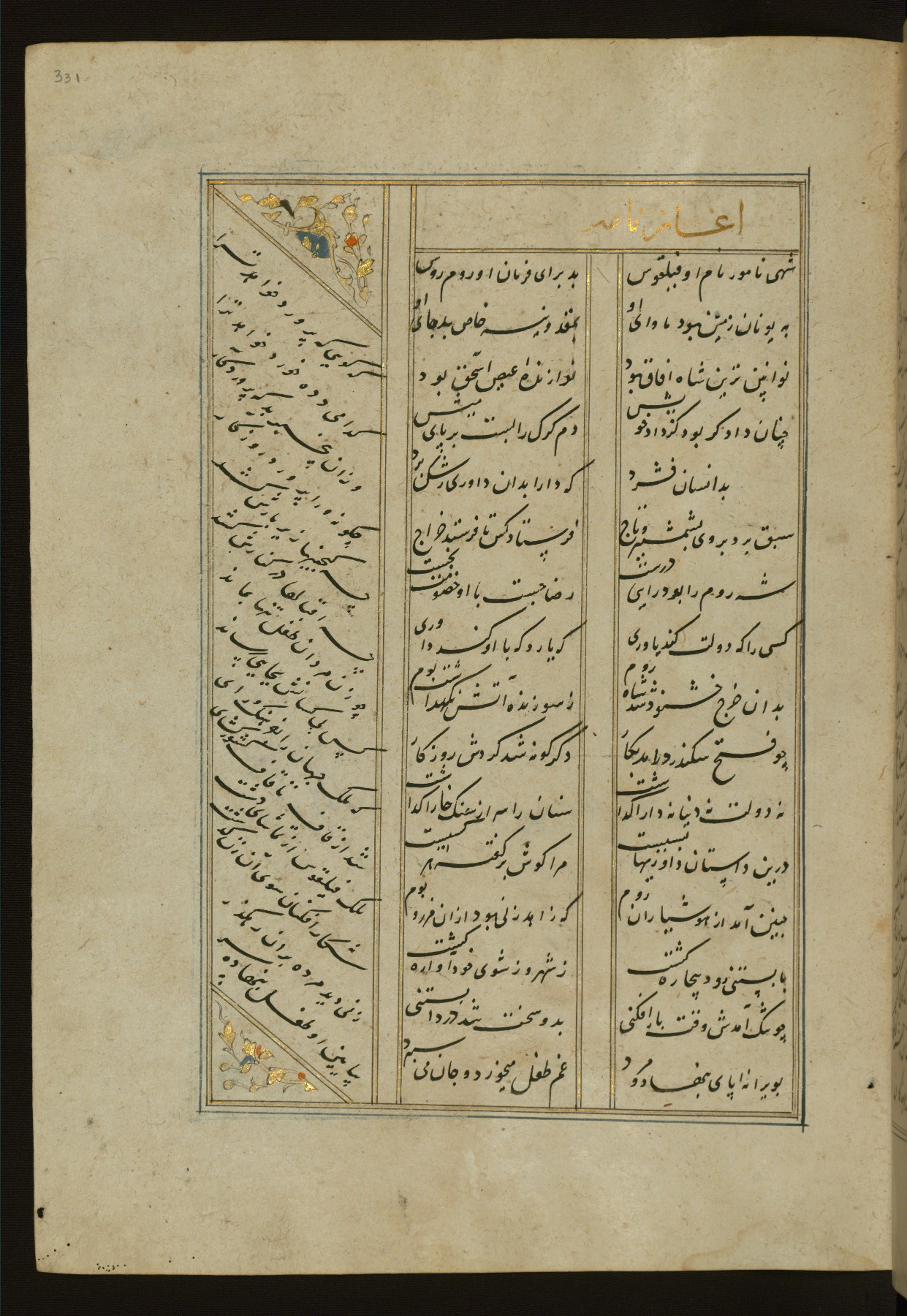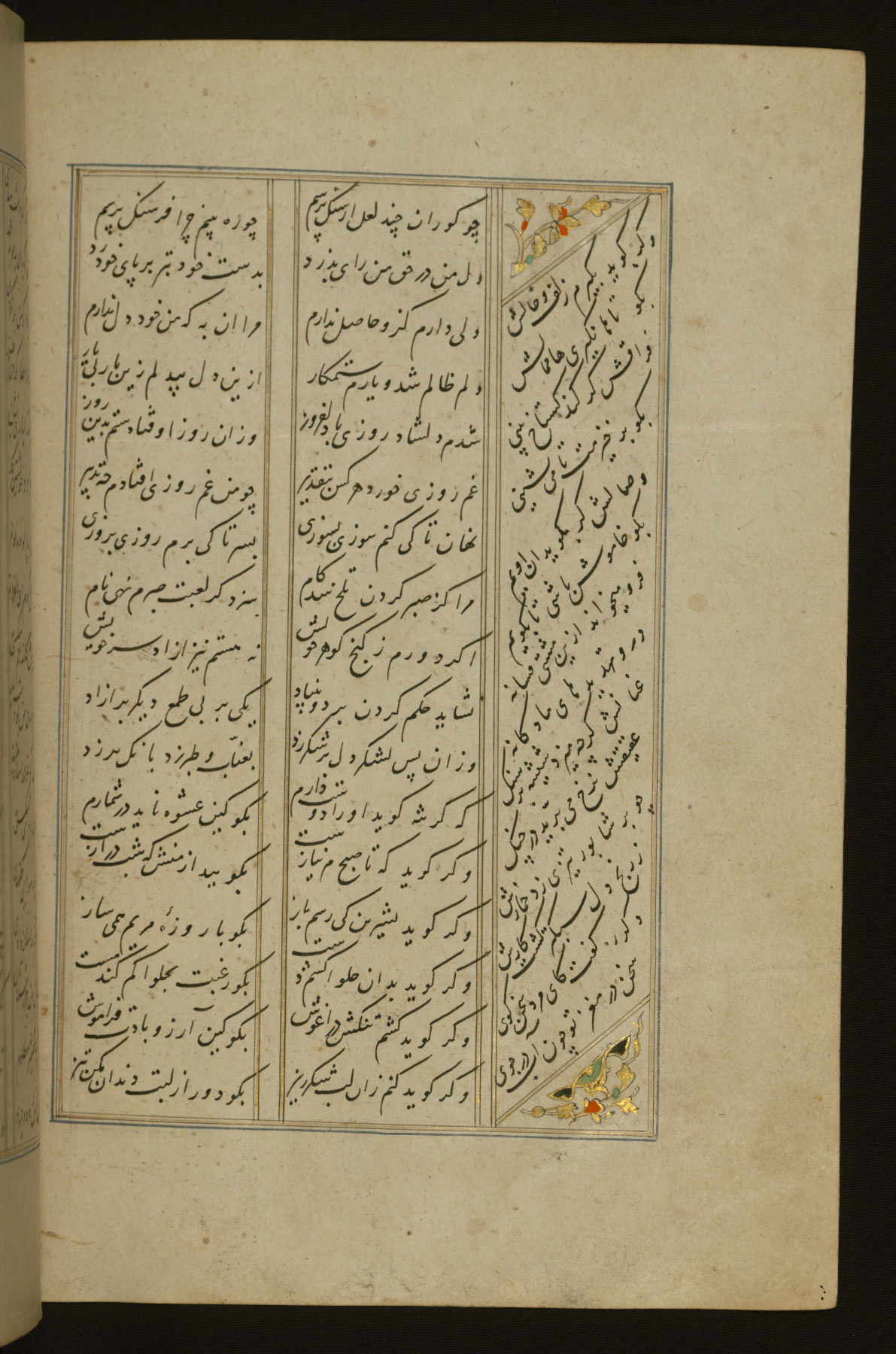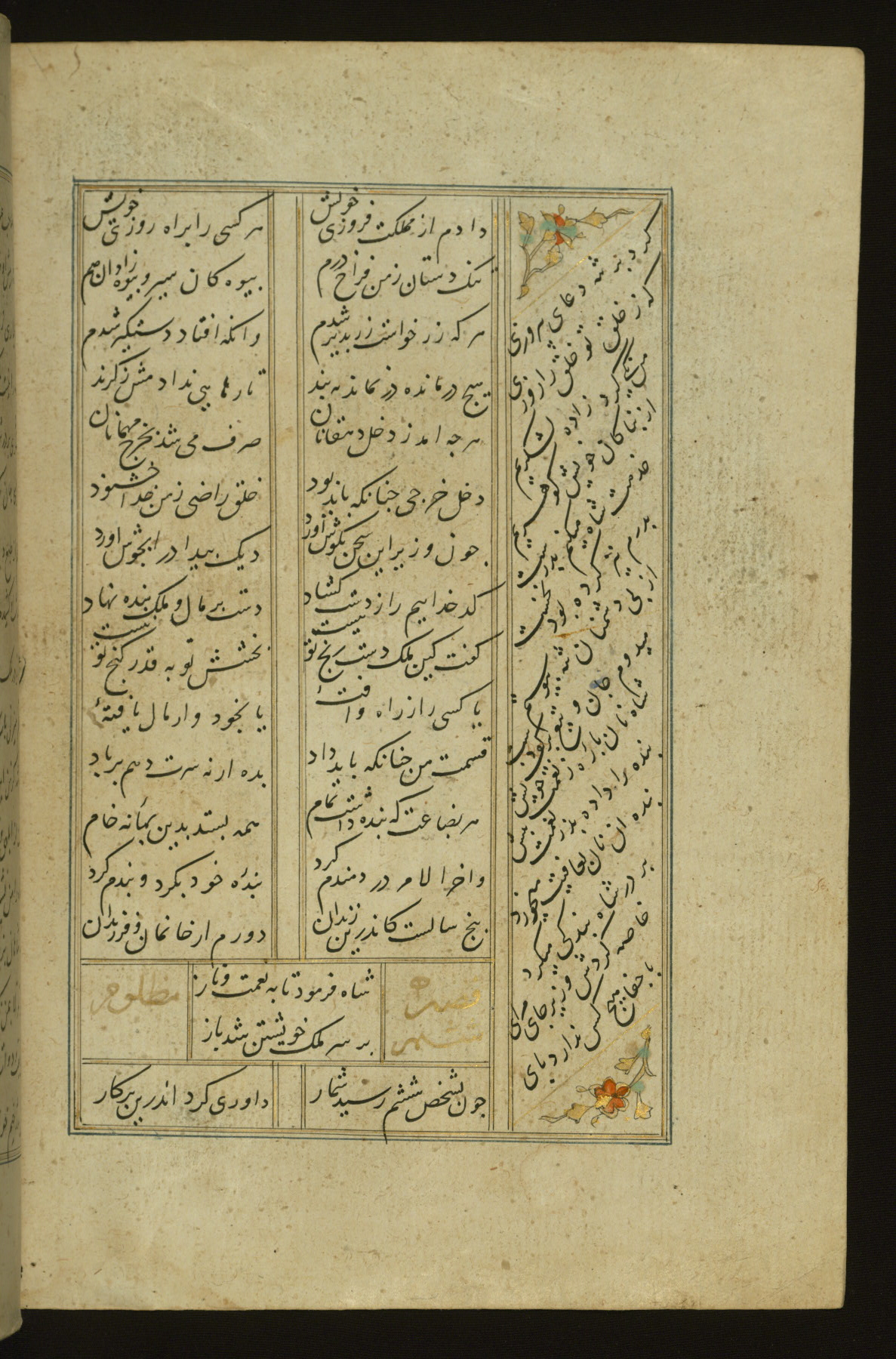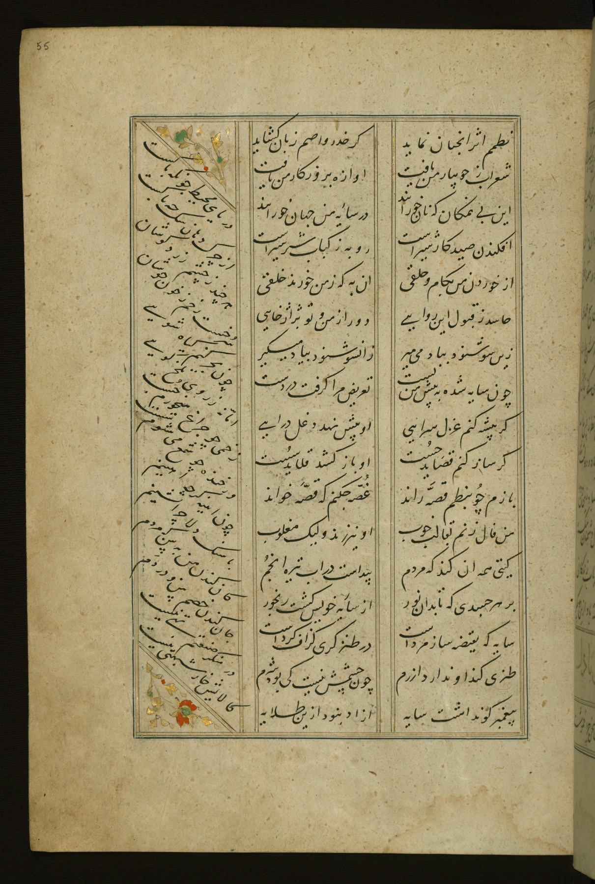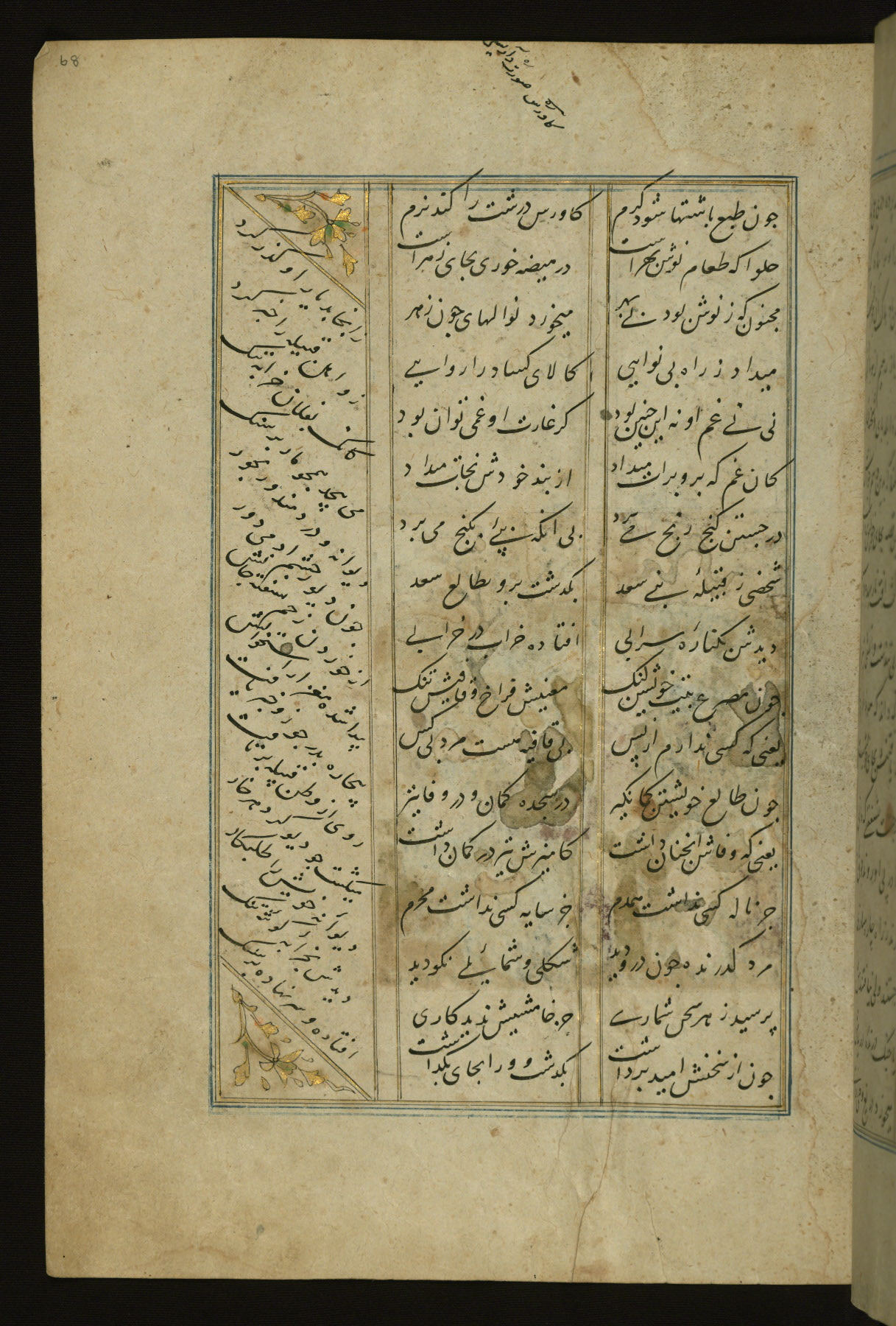 This copy of the Khamsah (quintet) of Niẓāmī Ganjavī (d. 605 AH / 1209 CE) was written by Abū Bakr Shāh ibn Ḥasan ibn ʿAlī al-Shahrastānī and illuminated by Jamāl al-Dīn ibn Muḥammad al-Ṣiddīqī al-Iṣfahānī between 892 AH / 1486 CE and 900 AH / 1494-5 CE. The manuscript opens with a double-page illuminated frontispiece with an inscription giving the title of the work and the name of the author (fols. 1b-2a). There are four illuminated titlepieces with the names of the individual poems and twenty-six repainted illustrations. According to evidence supplied by the colophons, the original binding was by the hand of Jamāl al-Dīn ibn Muḥammad al-Ṣiddīqī al-Iṣfahānī, as well. Unfortunately, it has not survived. The binding presently attached to the manuscript dates to the twelfth century AH / eighteenth CE.