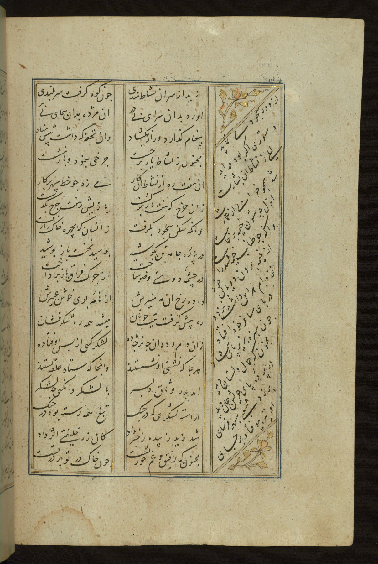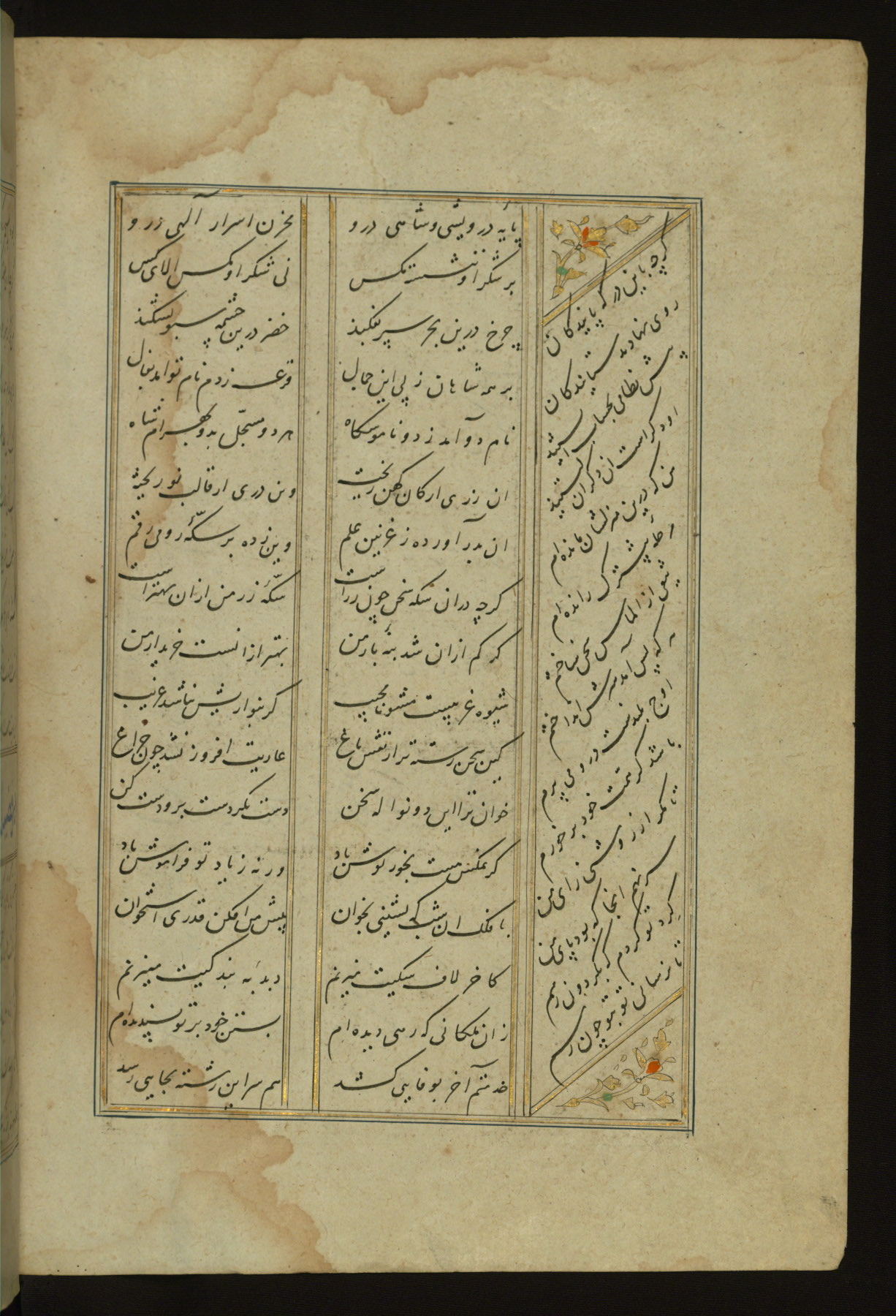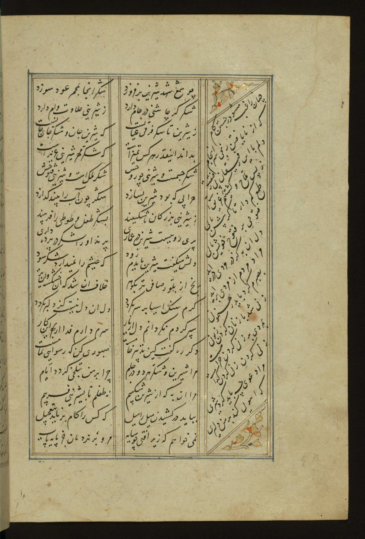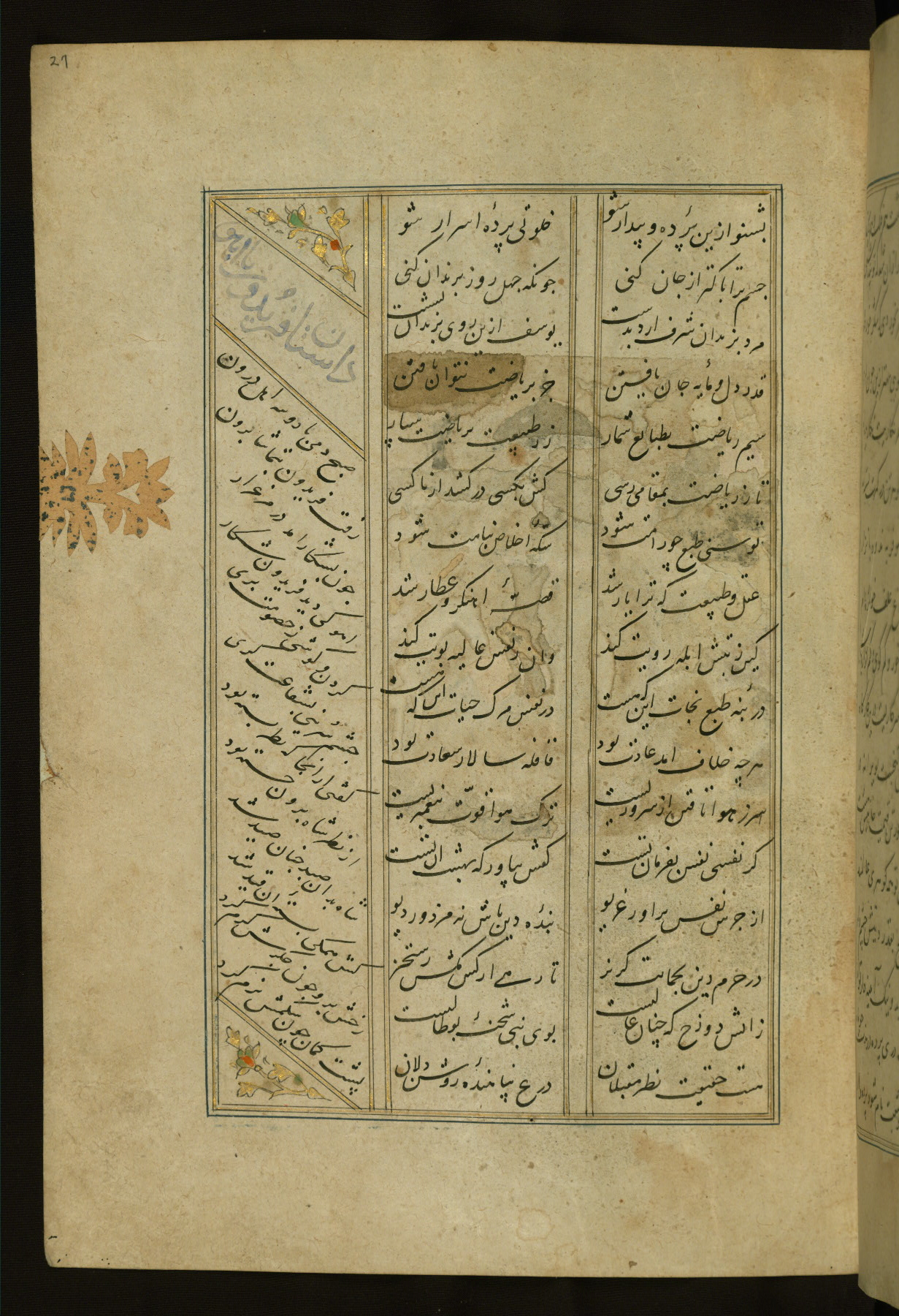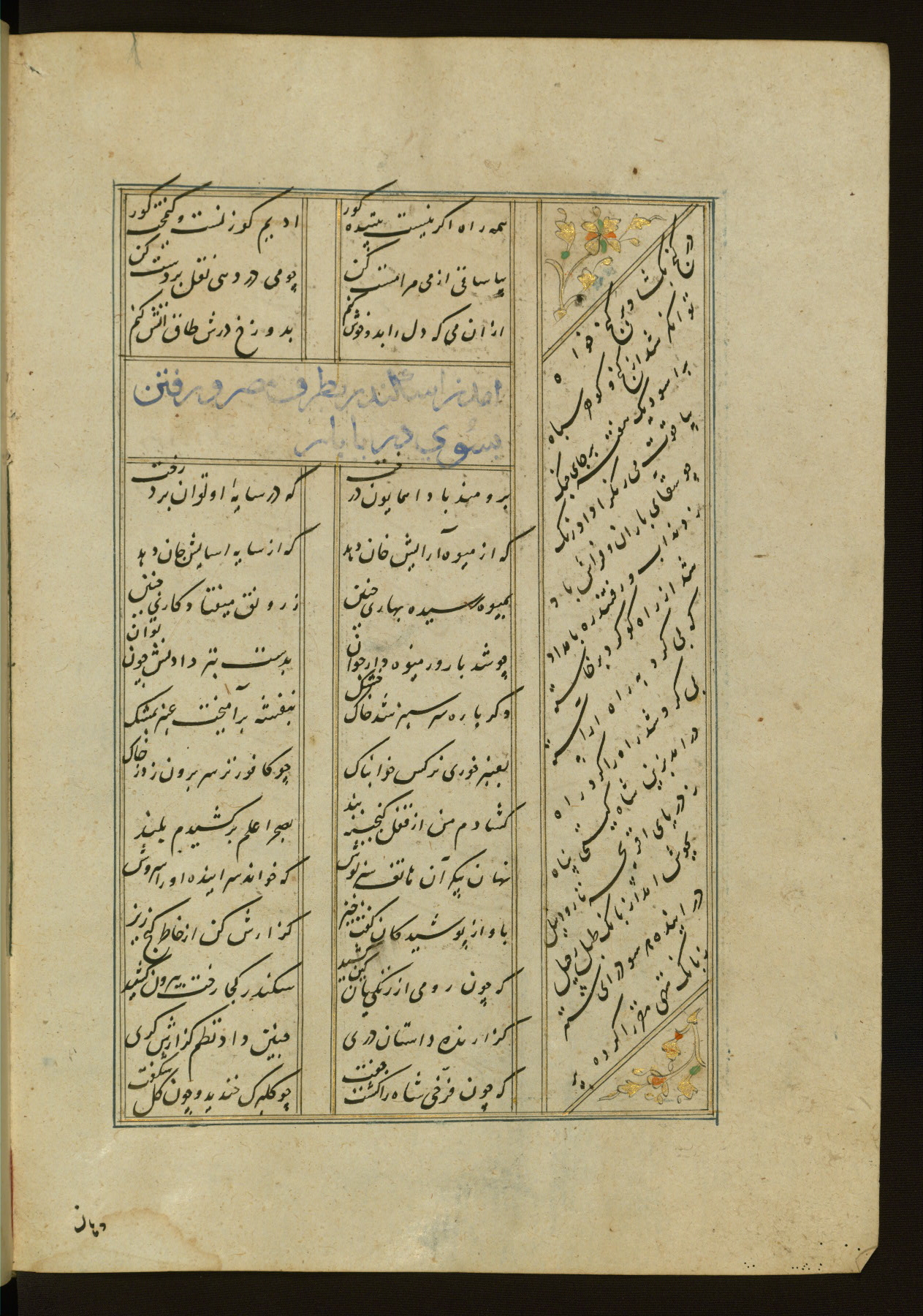 This copy of the Khamsah (quintet) of Niẓāmī Ganjavī (d. 605 AH / 1209 CE) was written by Abū Bakr Shāh ibn Ḥasan ibn ʿAlī al-Shahrastānī and illuminated by Jamāl al-Dīn ibn Muḥammad al-Ṣiddīqī al-Iṣfahānī between 892 AH / 1486 CE and 900 AH / 1494-5 CE. The manuscript opens with a double-page illuminated frontispiece with an inscription giving the title of the work and the name of the author (fols. 1b-2a). There are four illuminated titlepieces with the names of the individual poems and twenty-six repainted illustrations. According to evidence supplied by the colophons, the original binding was by the hand of Jamāl al-Dīn ibn Muḥammad al-Ṣiddīqī al-Iṣfahānī, as well. Unfortunately, it has not survived. The binding presently attached to the manuscript dates to the twelfth century AH / eighteenth CE.