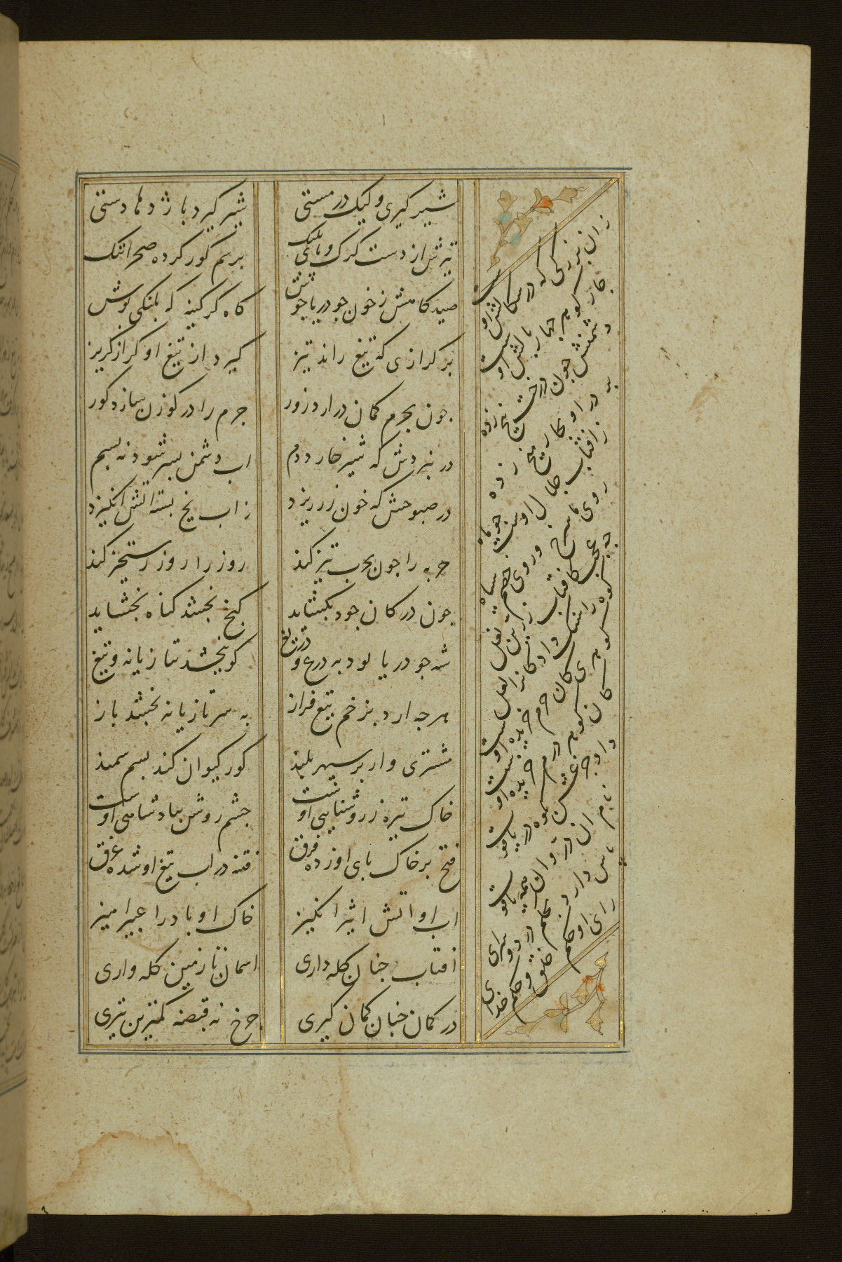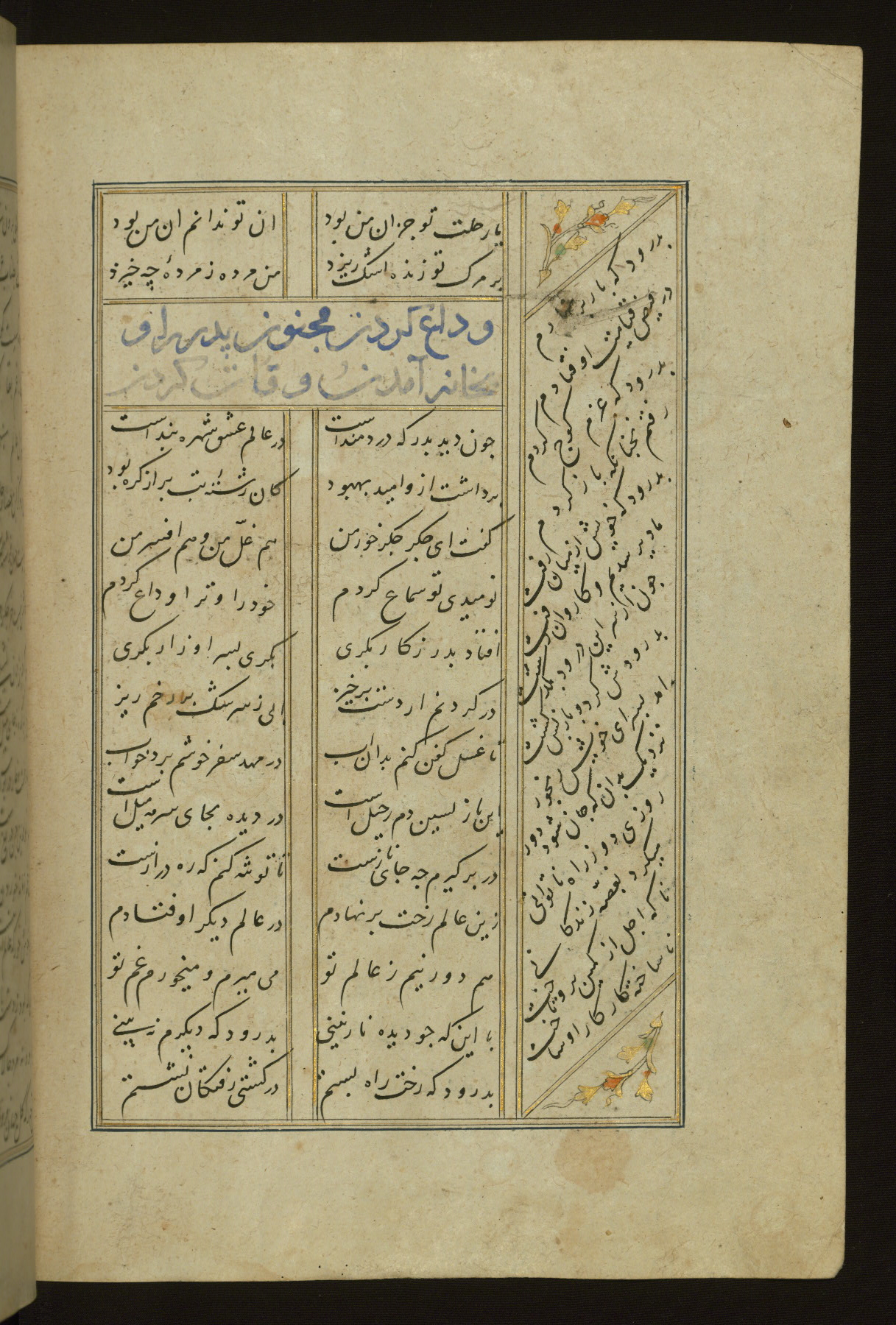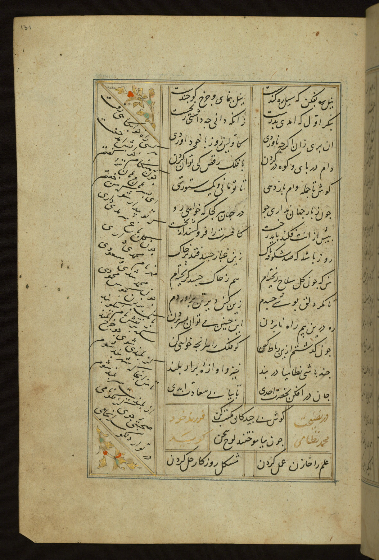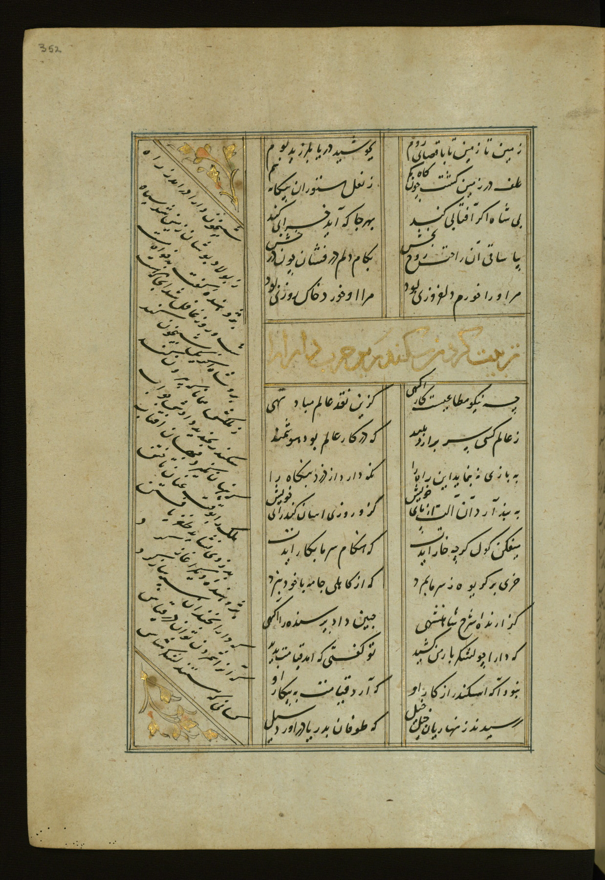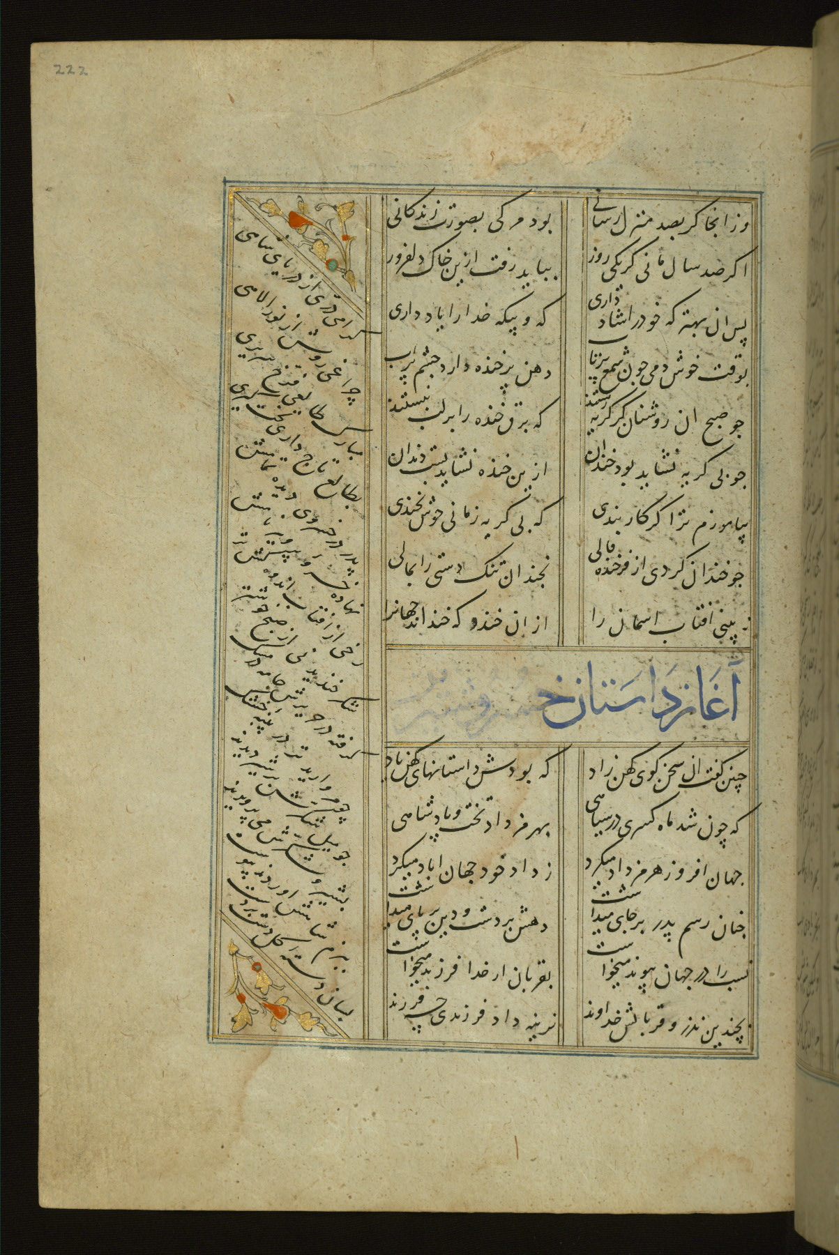 This copy of the Khamsah (quintet) of Niẓāmī Ganjavī (d. 605 AH / 1209 CE) was written by Abū Bakr Shāh ibn Ḥasan ibn ʿAlī al-Shahrastānī and illuminated by Jamāl al-Dīn ibn Muḥammad al-Ṣiddīqī al-Iṣfahānī between 892 AH / 1486 CE and 900 AH / 1494-5 CE. The manuscript opens with a double-page illuminated frontispiece with an inscription giving the title of the work and the name of the author (fols. 1b-2a). There are four illuminated titlepieces with the names of the individual poems and twenty-six repainted illustrations. According to evidence supplied by the colophons, the original binding was by the hand of Jamāl al-Dīn ibn Muḥammad al-Ṣiddīqī al-Iṣfahānī, as well. Unfortunately, it has not survived. The binding presently attached to the manuscript dates to the twelfth century AH / eighteenth CE.