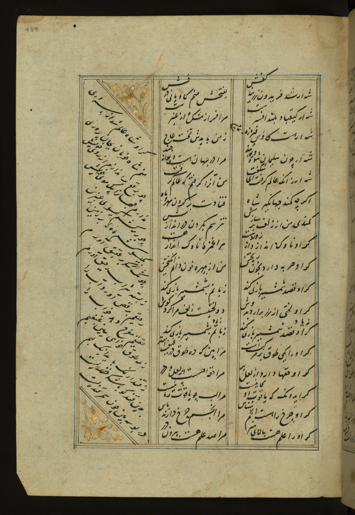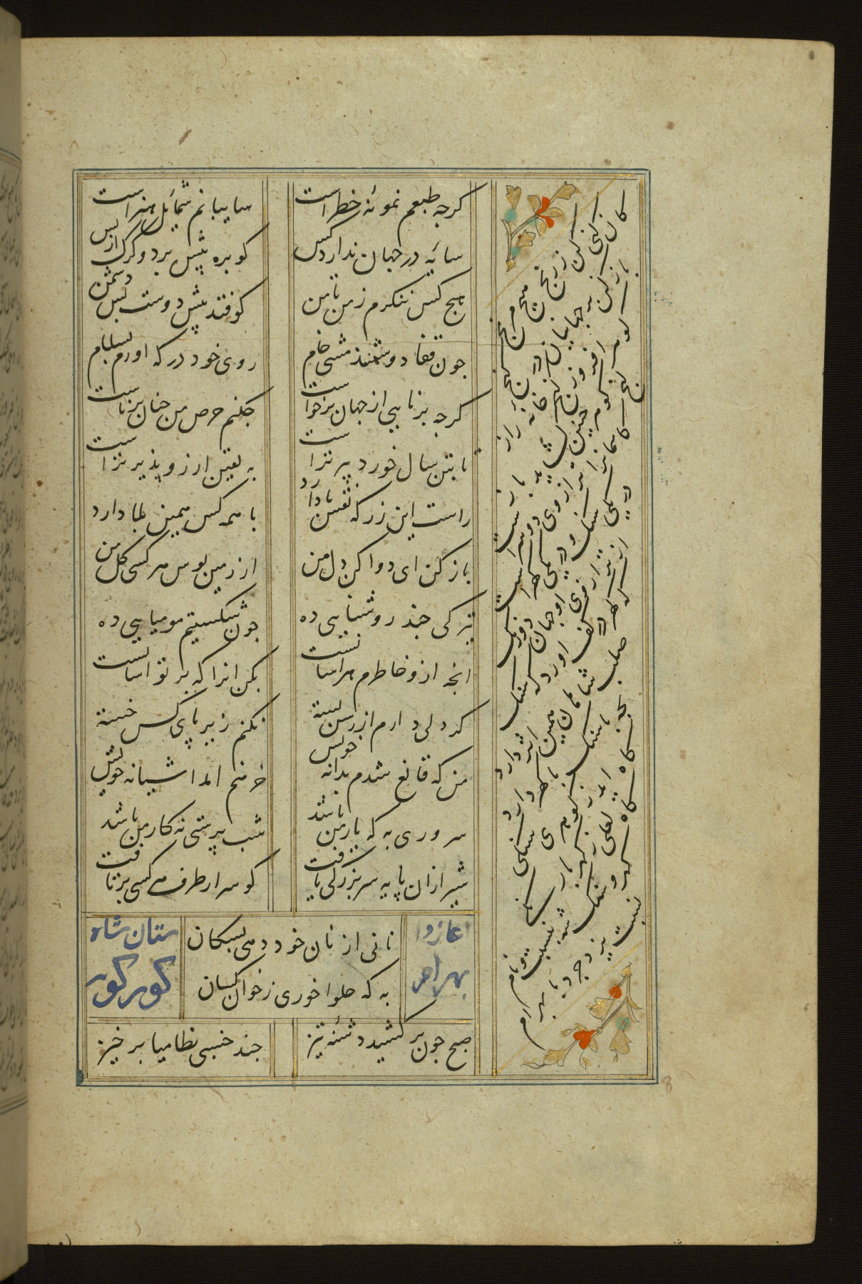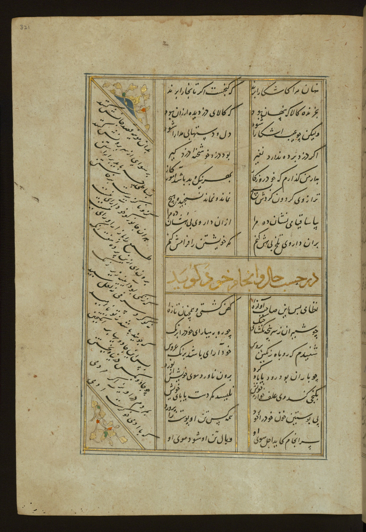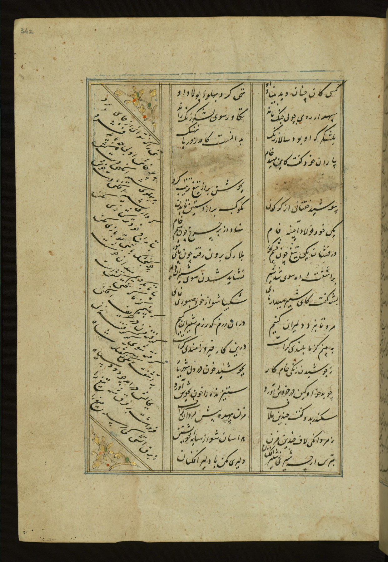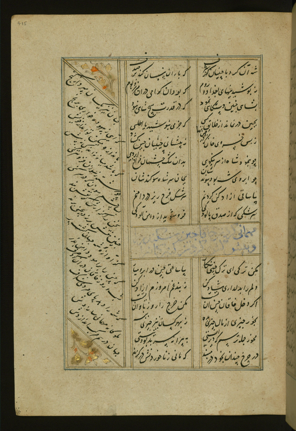 This copy of the Khamsah (quintet) of Niẓāmī Ganjavī (d. 605 AH / 1209 CE) was written by Abū Bakr Shāh ibn Ḥasan ibn ʿAlī al-Shahrastānī and illuminated by Jamāl al-Dīn ibn Muḥammad al-Ṣiddīqī al-Iṣfahānī between 892 AH / 1486 CE and 900 AH / 1494-5 CE. The manuscript opens with a double-page illuminated frontispiece with an inscription giving the title of the work and the name of the author (fols. 1b-2a). There are four illuminated titlepieces with the names of the individual poems and twenty-six repainted illustrations. According to evidence supplied by the colophons, the original binding was by the hand of Jamāl al-Dīn ibn Muḥammad al-Ṣiddīqī al-Iṣfahānī, as well. Unfortunately, it has not survived. The binding presently attached to the manuscript dates to the twelfth century AH / eighteenth CE.